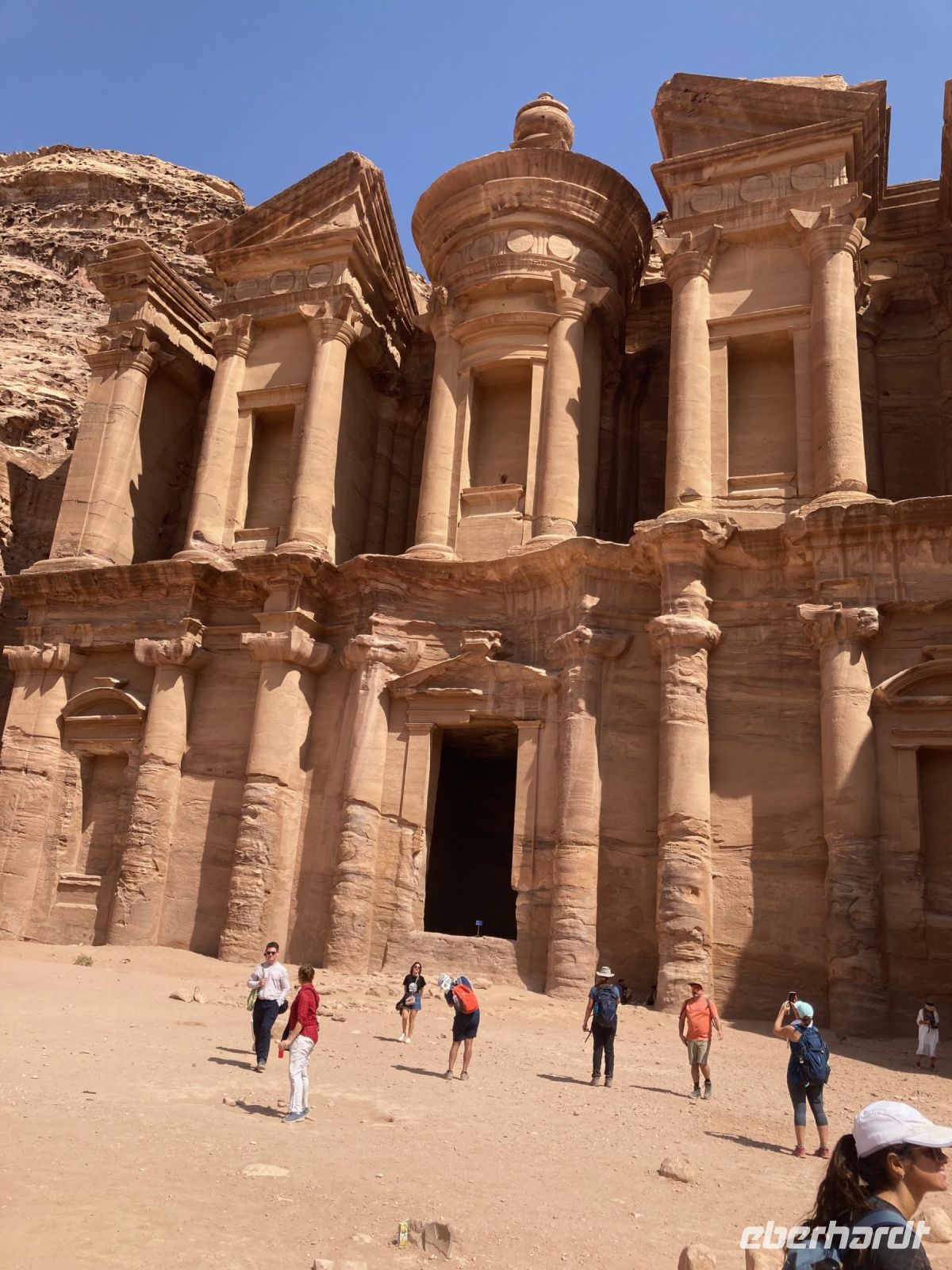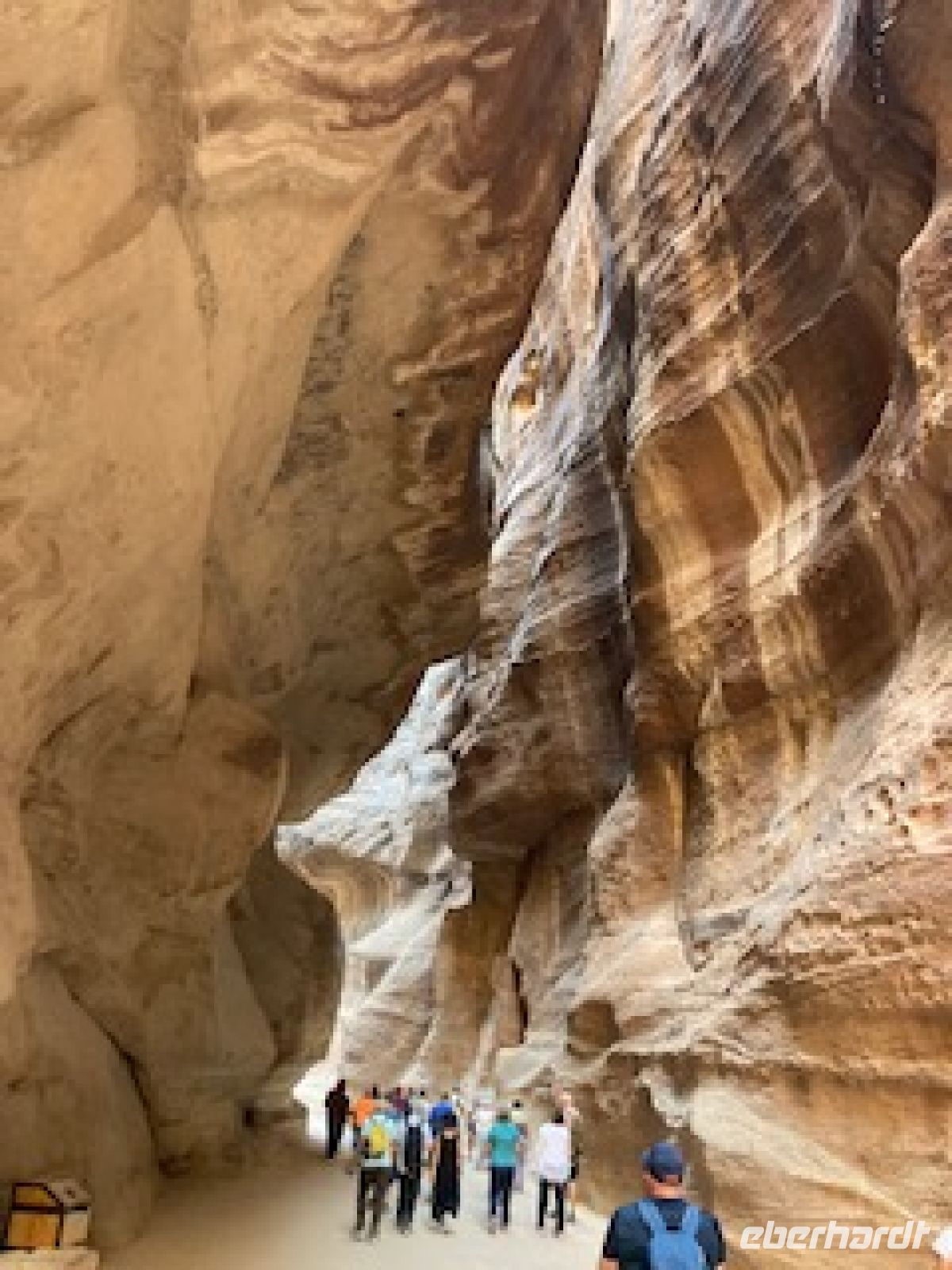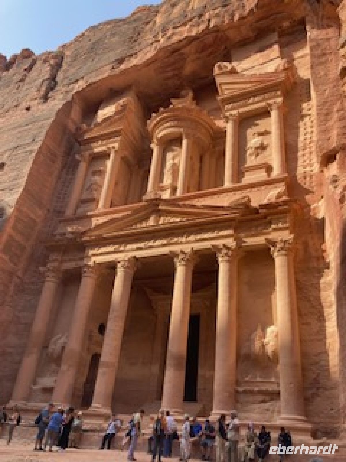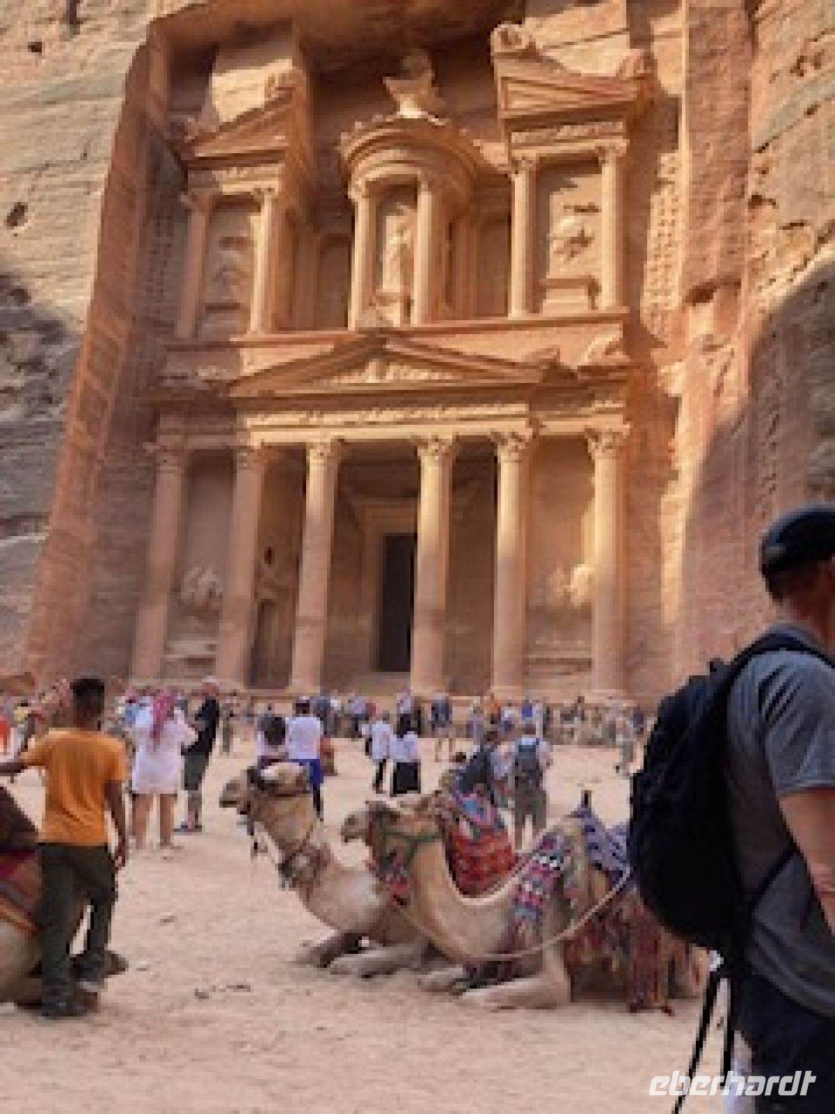 Früh am Tag fahren wir los, um einem der sieben neuen Weltwunder zeitig unsere Aufwartung zu machen. Schon kurz nach 8 Uhr passieren wir den Eingang der lange versteckten Felsenstadt der Nabtäer, dem absoluten Höhepunkt unserer Reise. Adel führt uns vorbei an den Dschinn-Häusern, in denen alle bösen Geister gefangen und von der Stadt ferngehalten wurden, tief in den Siq, einer bisweilen nur zwei bis drei Meter breiten turmhohen Schlucht, zeigt uns das ausgeklügelte Wassersystem, verblichene Opferstätten (ein halbes Ei als Ort derFürbitten, um schwanger zu werden ) und die kaum mehr entzifferbaren Kamelwegweiser (die Nabatäer waren die großte Händlernation ihrer Zeit). Nach mehr als einem Kilometer weitet sich dieser Schlauch zu einem ansehnlich großen Platz und wir stehen urplötzlich vor dem schönsten Bauwerk Petras, dem Schatzhaus, das pünktlich zu unserm Eintreffen von den einfallenden Sonnenstrahlen majestätisch beleuchtet wird. Zwar tummeln sich schon einige Touristen und besteigen für ein Foto auch die reichlich vorhandenen Dromedare, doch wir haben ausreichend Zeit, dieses aus dem rosafarbenen Stein herausgeschlagenen Wunderwerk von allen Seiten zu bestaunen. Dann gelangen wir auf immer breiter werdenden Wegen zum Theater, dem großen Römer-Tempel und dem lieblichen Mädchenschloss. Hier konnen wir dann entscheiden, welches Besichtigungspensum wir uns zumuten wollen. Während sich die einen gemütlich auf den Heimweg machen und höchstens noch bei den Königsgräbern vorbeischauen, nehmen sich andere die 400 Stufen zum mytischen Opferplatz vor. Die meisten aber kämpfen sich die 850 Stufen ganz nach oben zum fulminanten Kloster Er-Deir. Wer sich diesem schweißtreibenden Aufstieg unterzogen hat, hat dann nach der Rückkehr zum Bus stolze 18 km Wegstrecke hinter sich gebracht. Chapeau!