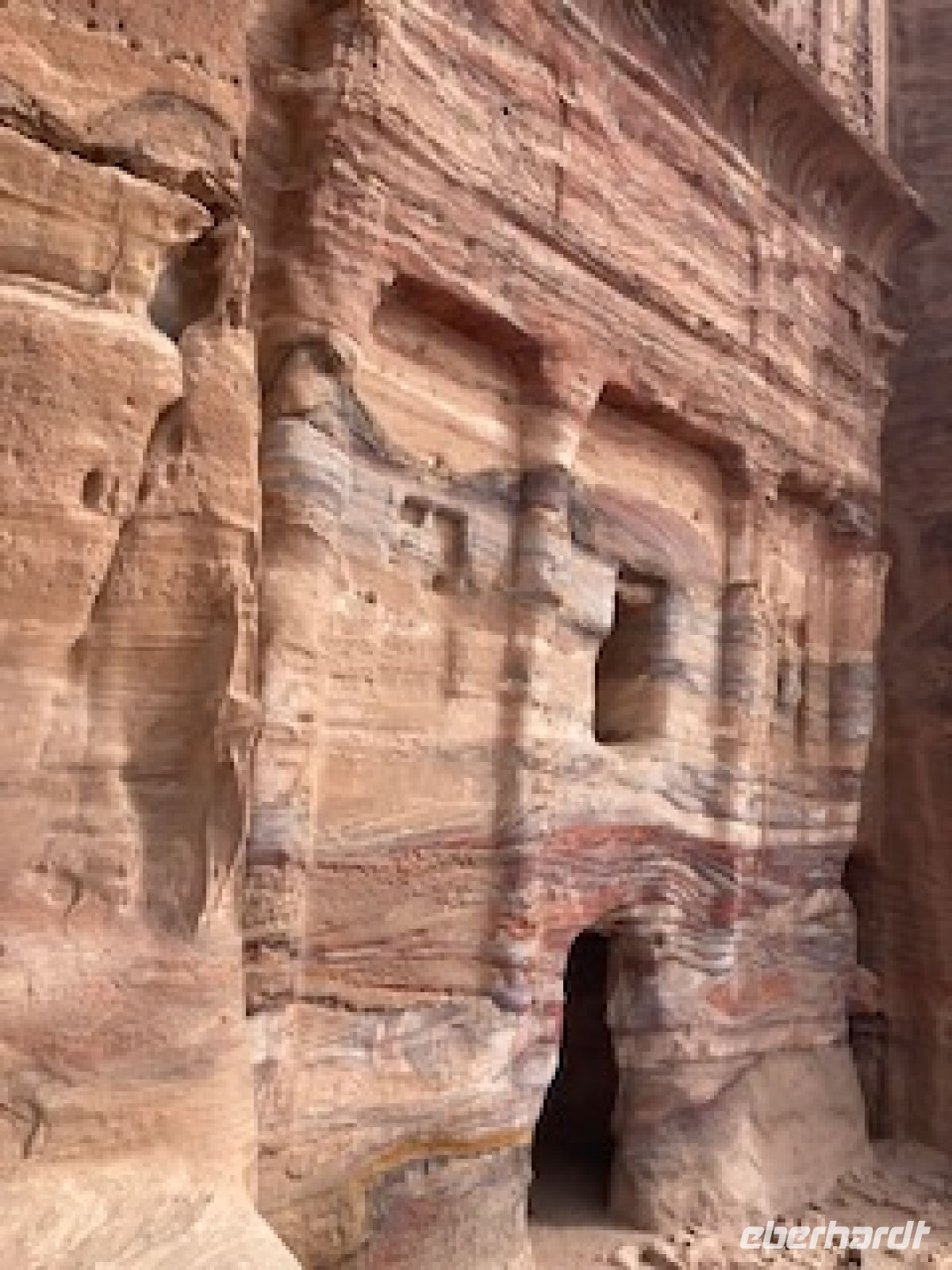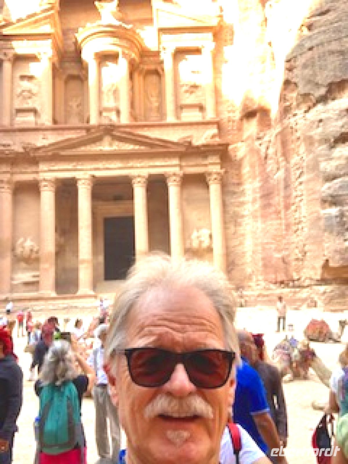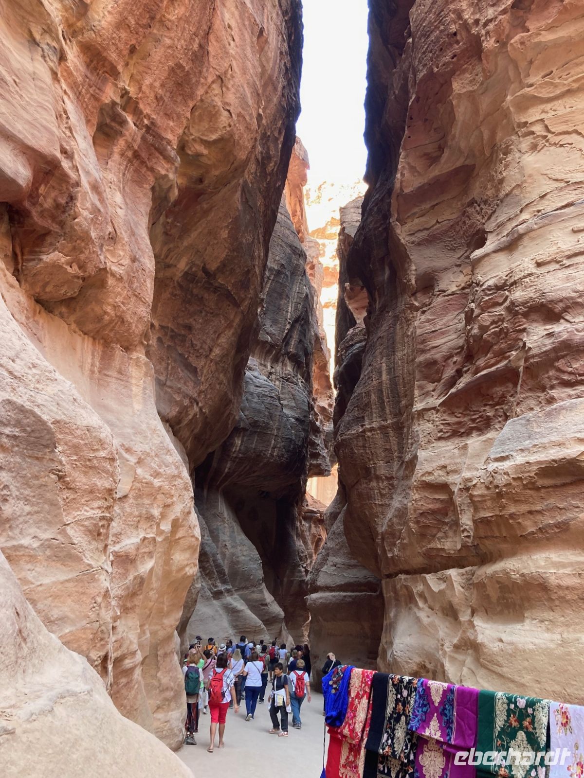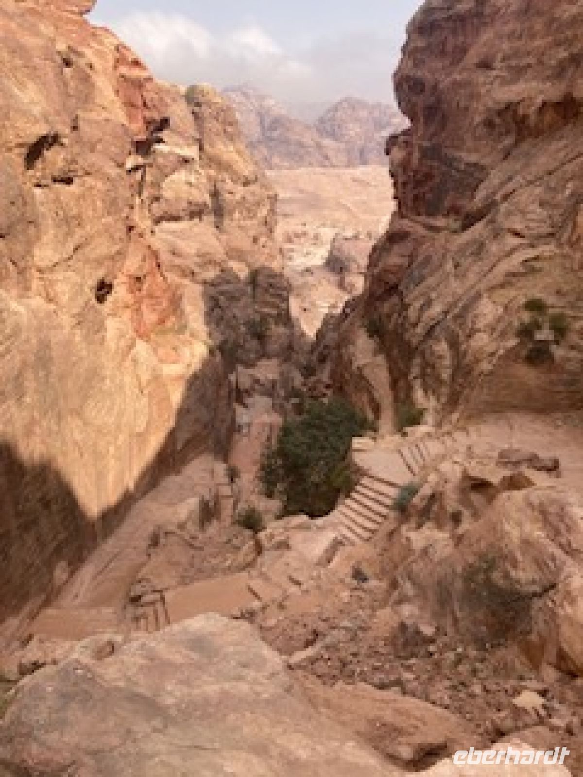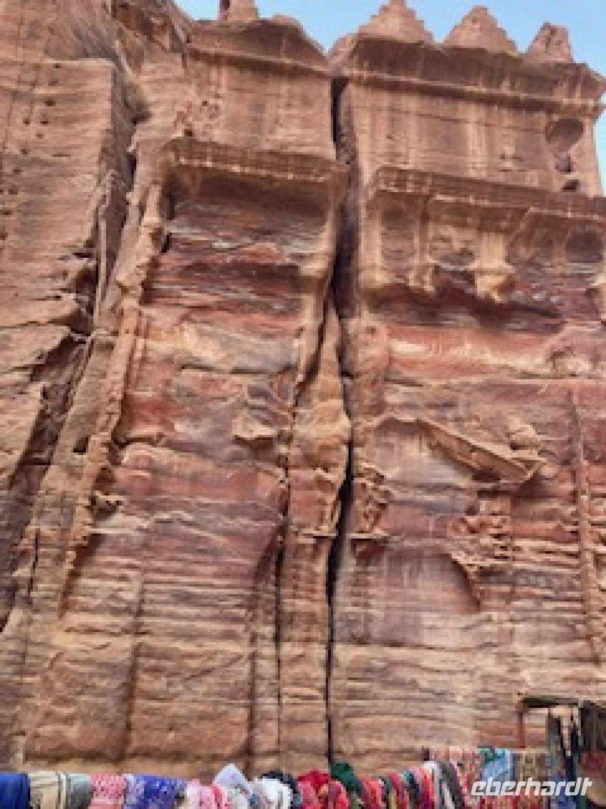 Früh am Tag fahren wir los, um einem der sieben neuen Weltwunder zeitig unsere Aufwartung zu machen. Schon kurz nach 8 Uhr passieren wir den Eingang der lange versteckten Felsenstadt der Nabtäer, dem absoluten Höhepunkt unserer Reise. Adel führt uns vorbei an den Dschinn-Häusern, in denen alle bösen Geister gefangen und von der Stadt ferngehalten wurden, tief in den Siq, einer bisweilen nur zwei bis drei Meter breiten turmhohen Schlucht, zeigt uns das ausgeklügelte Wassersystem, verblichene Opferstätten (ein halbes Ei als Ort derFürbitten, um schwanger zu werden ) und die kaum mehr entzifferbaren Kamelwegweiser (die Nabatäer waren die großte Händlernation ihrer Zeit). Nach mehr als einem Kilometer weitet sich dieser Schlauch zu einem ansehnlich großen Platz und wir stehen urplötzlich vor dem schönsten Bauwerk Petras, dem Schatzhaus, das pünktlich zu unserm Eintreffen von den einfallenden Sonnenstrahlen majestätisch beleuchtet wird. Zwar tummeln sich schon einige Touristen und besteigen für ein Foto auch die reichlich vorhandenen Dromedare, doch wir haben ausreichend Zeit, dieses aus dem rosafarbenen Stein herausgeschlagenen Wunderwerk von allen Seiten zu bestaunen. Dann gelangen wir auf immer breiter werdenden Wegen zum Theater, dem großen Römer-Tempel und dem lieblichen Mädchenschloss. Hier konnen wir dann entscheiden, welches Besichtigungspensum wir uns zumuten wollen. Während sich die einen gemütlich auf den Heimweg machen und höchstens noch bei den Königsgräbern vorbeischauen, nehmen sich andere die 400 Stufen zum mytischen Opferplatz vor. Die meisten aber kämpfen sich die 850 Stufen ganz nach oben zum fulminanten Kloster Er-Deir. Wer sich diesem schweißtreibenden Aufstieg unterzogen hat, hat dann nach der Rückkehr zum Bus stolze 18 km Wegstrecke hinter sich gebracht. Chapeau!