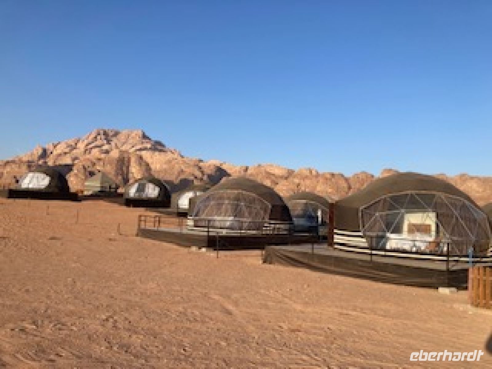 Ziemlich spät erreichen wir dann unser Ziel, das Yasmina Luxury Camp in der Wüste des Wadi Rum. Nach einem genießbaren Abendessen werden wir in der stockdunklen Nacht auf die einzelnen Rundzelte verteilt.