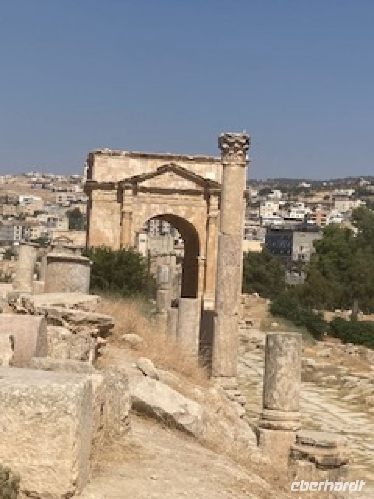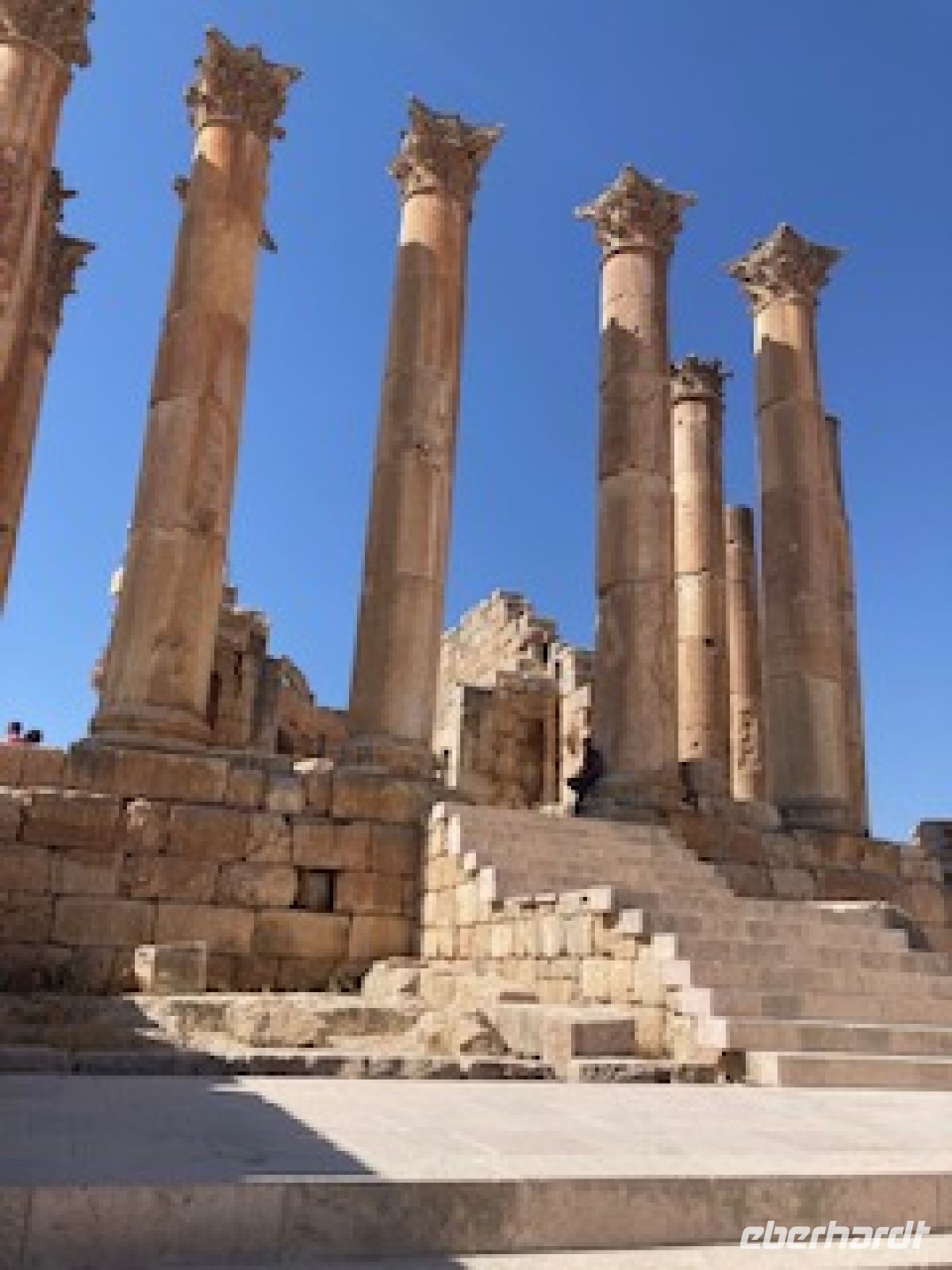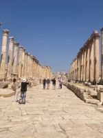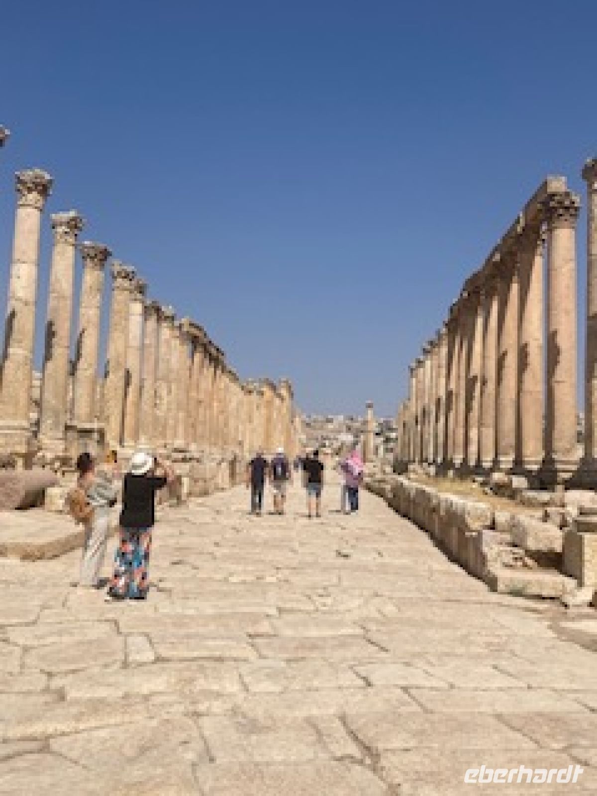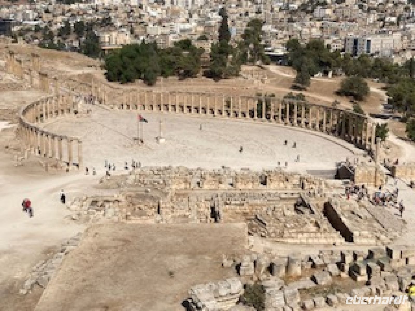 Wieder steuert Razzan unseren Bus gekonnt und wendig durch den morgendlichen Berufsverkehr von Amman, um uns zur 40 km entfernten, sehr eindrucksvollen Römerstadt Gerasa zu bringen. Der berühmte Feldherr Pompeius hatte sie bereits im 1. Jahrhundert vor Christus annektiert und sie zu einer der wichtigsten Städte in seiner Dekapolis (10-Städte-Bund) gemacht und dementsprechend ausgebaut.Für einen Besuch des sehr reisefreudigen Kaisers Hadrian im 2.Jahrhundert wurden die zahlreichen Gebäude und Straßen nochmals vorbildlich restauriert und dem Kaiser auch ein Triumphbogen errichtet. In dieser Stadt gab es einfach alles: Eine riesige Rennbahn, zwei Theater eine monströse Tempelanlage (der Göttin Artemis geweiht), ein ovaler Versammlungsplatz und eine großartige, mit Säulen gesäumte Hauptstrasse, dem Cardo. Wie überall, als die Römer spätestens im 5.Jahrhundert das Feld räumen mussten, übernahmen die Byzantiner und danach die Araber die Stadt. und als dann im 19.Jahrhundert geflüchtete muslimische Tscherkessen das antike Stadtgebiet besiedelten und die Gebäude als Steinbruch für ihre Häuser benutzten, hatte dies folgenschwere Auswirkungen für die Ausgrabung der antiken Schätze.. Gut ein Drittel der Römerstadt sind nach wie vor von Tscherkessen-Häusern überbaut.