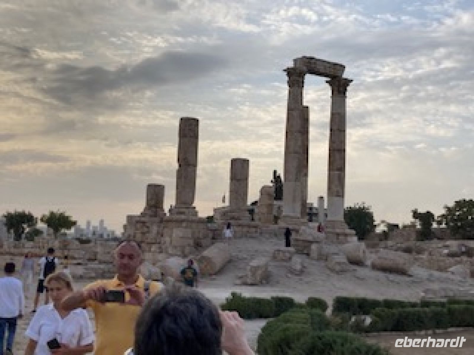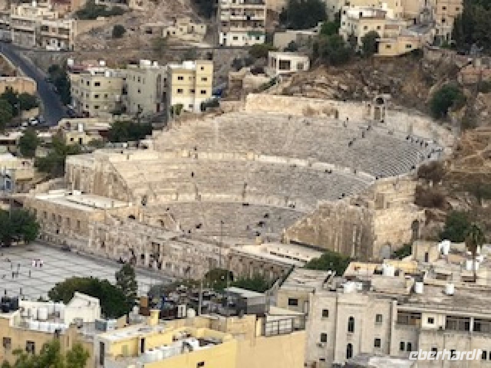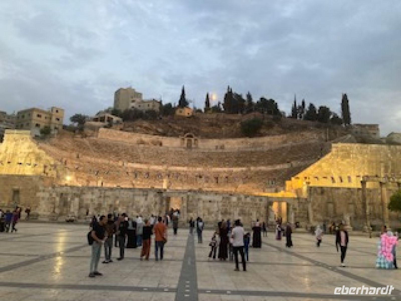 Zurück in der Hauptstadt bleibt uns genügend Zeit, die Keimzelle der Stadt, die Zitadelle, zu besuchen. Hier haben schon die ammonitischen Herrscher ihren Palast errichten lassen, hier stand der römische Herkules-Tempel, die byzantinische Basilika und die ommayadische Moschee. Und von hier oben hat man natürlich einen überragenden Blick auf die weiße Stadt und vor allem auf das weit unten liegende, 6000 Besucher fassende römische Theater, in das wir uns als krönenden Tagesabschluss aufmachen. Dort führt der Reiseleiter den sich im weiten Rund verteilten Gästen die ausgezeichnete Akkustik vor, indem er ihnen ein berühmtes Hölderlin-Gedicht rezitiert.