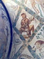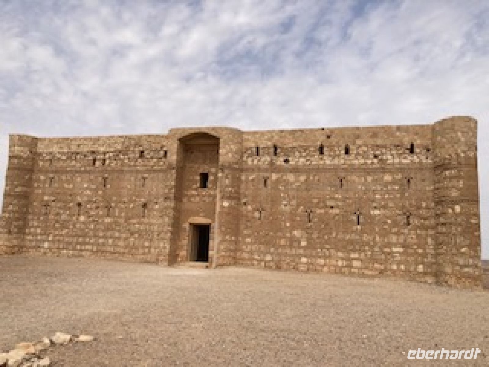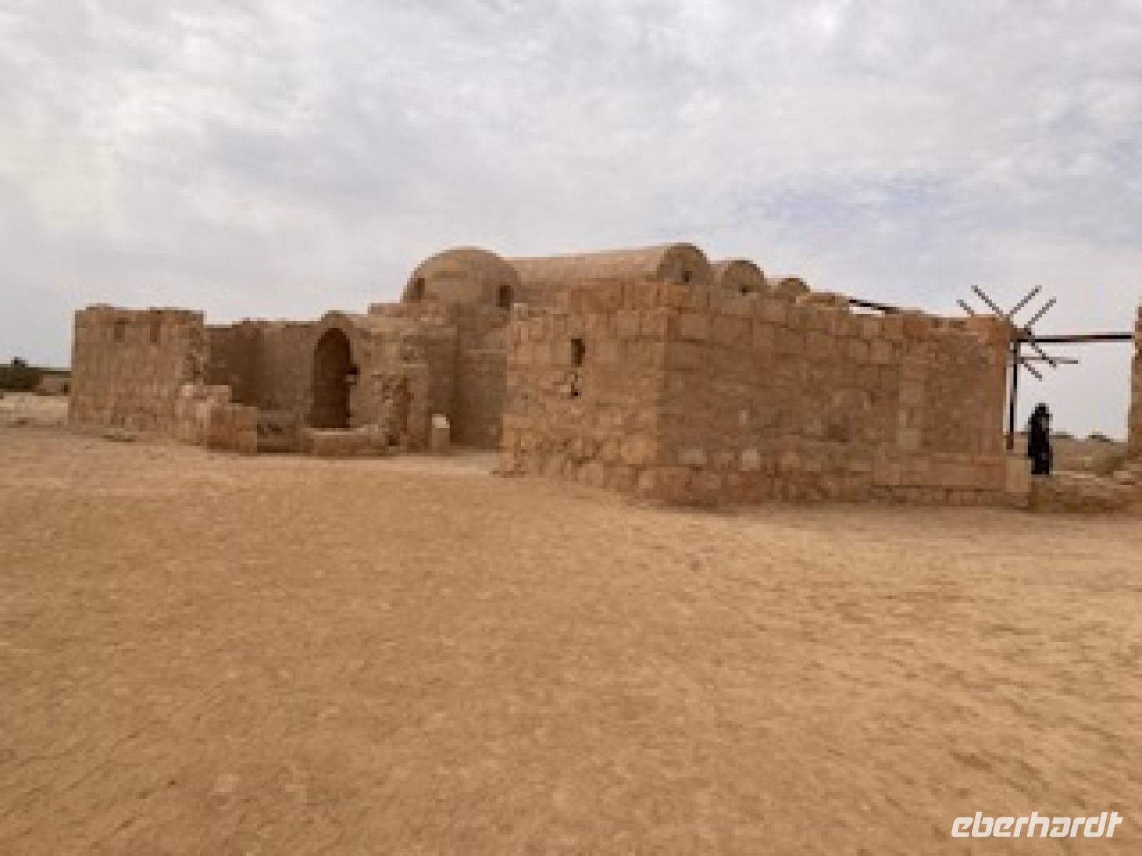 Anschließend fahren wir in unserem Bus nach Osten, um uns drei ommayadischen Wüstenschlösser anzuschauen. Zuerst halten wir in Qasr al Kharana, das eher einer gediegenen Karawnserei gleicht, schauen uns auch die gehobeneren Übernachtungsmöglichkeiten im 1.Stock an und klettern sogar verbotenerweise auf das wacklige, löchriche Dach, um die unendliche Weite der Wüste zu genießen. Dann gelangen wir zum schönsten der Schlösser, das seinen Namen auch wirklich verdient. das Qasr al Amra. Hier besichtigen wir zuerst die kunstvolle Badeanstalt (mitten in der Wüste), ehe wir im Haupttrakt die vielfältigen Fresken bestaunen. Hier fällt einmal die recht freizügige Darstellung schöner Damen auf, aber auch die pittoresken, karikaturhaften Bilder von Gitarre spielenden Bären und applaudierenden Affen fallen ins Auge.
