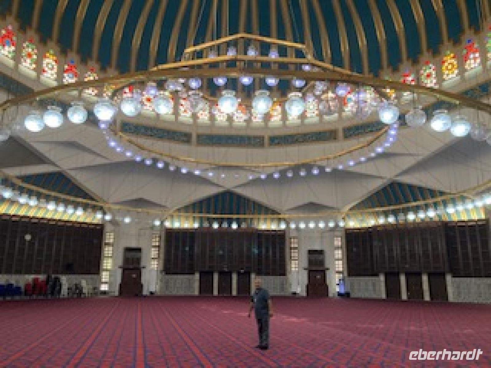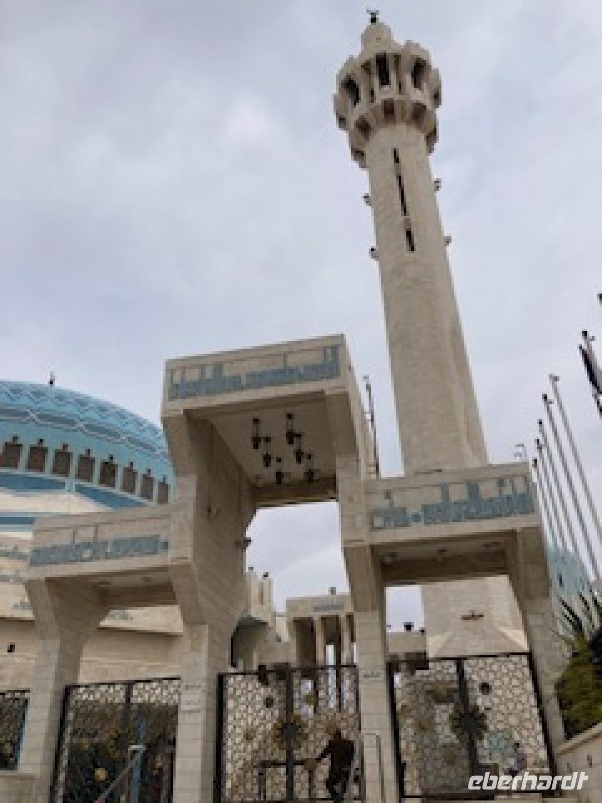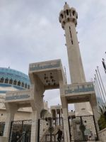 Nach einem guten Frühstück mit allerlei orientalischen Spezialitäten machen wir uns unter Adels Führung auf, um den frühmorgendlichen Gesängen der Muezzine auf den Grund zu gehen. Dazu begeben wir uns zur Blauen Moschee, die als größte und schönste in Amman gilt. Schon am Eingang müssen unsere weiblichen Gäste in ein bodenlanges dunkles Gewand schlüpfen.Dann müssen wir alle unsere Schuhe ausziehen und dürfen ausnahmsweise alle in den eigentlich nur den Männern vorenthaltenen riesigen Gebetsraum. Adel erklärt uns anhand der fünf Säulen des Islams das religiöse Leben der Muslime und weist uns auf die nach Süden (Mekka) ausgerichtete Gebetsnische hin. Alles etwas fremd, aber sehr interessant.