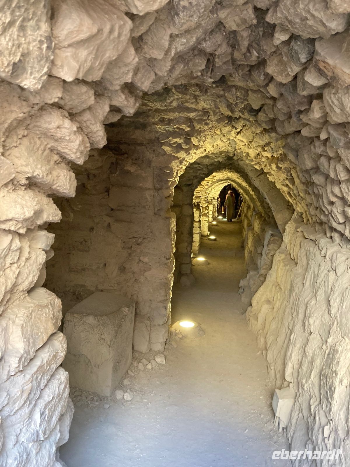 Weiter geht unsere Fahrt nach Kerak, um dort die trutzige Kreuzritterburg zu besuchen. Doch zuvor wollen wir uns - wie in den Tagen zuvor - mit einem schmackhaften Mittagessen stärken. Doch daraus wird nichts, weil das auserkorene Restaurant unseren Ansprüchen nicht genügt. Das Büffet ist leer und erkaltet, es fehlt an Besteck und Getränke werden nur sporadisch serviert. Etwas verstimmt entern wir die durch viele Tunnelgänge auffällige Burg, die einen der blutrünstigsten Kreuzritter beherberte, den Herren von Chatillon, der sich auch von den belagernden Truppen Saladins nicht aus der Ruhe bringen und ihnen dampfende Schüsseln eines Hochzeitsmahls überstellen ließ. Dies bewog den genialen Heerführer Saladin dazu, nach der Erstürmung der Burg die 11-jährige Braut zu verschonen, den gewalttätigen Vater aber eigenhändig zu köpfen.