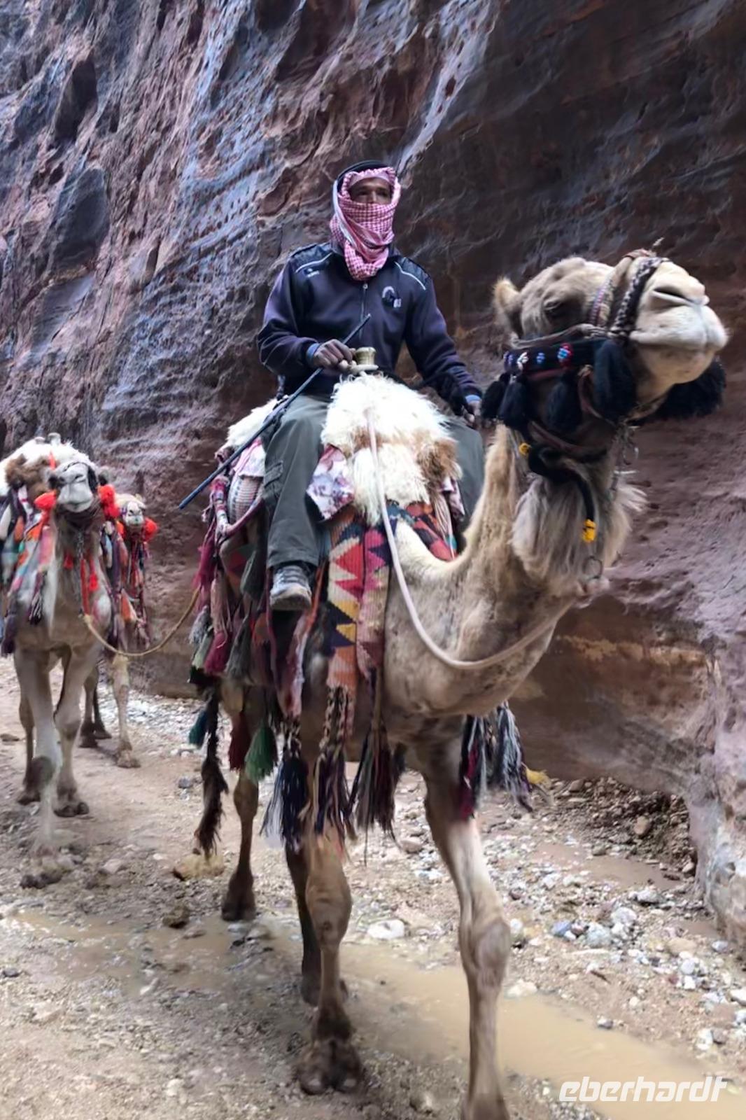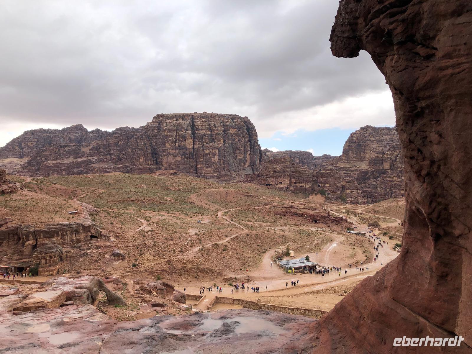Bereits in der Nacht kam zum Weckruf des Muezzins noch das donnernde Grollen und die Blitze eines nahen Gewitters hinzu. Wohl wissend, dass Wasser in jedweder Form ein Segen für das sehr trockene Land ist, ahnten wir gleichzeitig, dass uns ein paar Stunden später ein wettertechnisch wenig angenehmer Besichtigungstag bevorstand. Ein Blick aus dem Fenster nach dem Aufstehen ließ uns alle hektisch nach den passenden Kleidungsstücken suchen; nur welche waren das? An diesem Tag hätten wir von regenfester und warmer Kleidung, Gummistiefeln, Mütze, Schal und Handschuhen beinahe einen gesamten Querschnitt des häuslichen Kleiderschrankes gebrauchen können. Außer vielleicht die richtig sommerlichen Sachen, denn die waren bei 5 Grad und immer wieder einsetzendem Regen sowie einem recht kalten Wind nicht von Nöten. Aber der hartgesottene Tourist lässt sich von widrigen äußerlichen Umständen nicht von seinem eigentlichen Ziel abbringen. So geschah es, dass wir mit einer Vielzahl Besuchern aus allen Regionen und Religionen einer der faszinierendsten archäologischen Stätten des Nahen Ostens unsere Aufwartung machten. Petra, die antike Stadt im Felsen, erreichbar über den Siq, einer 70 Meter tiefen und an der schmalsten Stelle zwei Meter breiten Schlucht. Begleitet vom Hufgetrappel und den antreibenden Stimmen der Reiter und Wagenlenker, welche uns ein ums andere Mal nach einer Ausweichstelle in dem engen Felseinschnitt schauen ließen, gelangten wir nach anderthalb kalten und feuchten Kilometern zum Khazne al-Firaun, dem sogenannten Schatzhaus am Ausgang des Siq. Dieser in den Felsen geschlagene Grabtempel beeindruckte durch seine Größe und seine architektonische Schönheit, welche in den Strahlen der Morgensonne noch besser zur Geltung kam. Der heute bekannteste Tempel des antiken Reiches der Nabatäer zog jeden Besucher in seinen Bann. Der rötliche Sandstein leuchtete je nach Sonneneinstrahlung in mehr oder minder intensiven Farbtönen. Es war ein wahrhaft erhebender Anblick. Nach einem Augenblick des Verweilens gingen wir weiter durch die Überbleibsel der einst am Schnittpunkt mehrerer Karawanenwege gelegen Stadt. Es war faszinierend anzuschauen, mit welch technischem Geschick vor über zweitausend Jahren Gräber, Theater, Tempel und Straßen aus dem Gestein gehauen wurden. Erst im 19. Jahrhundert wurde die einstige nabatäische Hauptstadt für Außenstehende wiederentdeckt. Seitdem bemühten sich viele Forscher und Archäologen an der Restaurierung und Deutung des riesigen Komplexes. Sehr zu unserer Freude, konnten wir dadurch doch viele Sehenswürdigkeiten für uns entdecken. Das römische Theater, die verschiedenen Gräber in der sogenannten Königswand, die Säulenstraße mit dem Haupttempel Qasr al-Bint sowie das Obeliskengrab am Eingang des Siq, um nur einige zu nennen. Leider hatte das wechselhafte Wetter keine wirklich planbare Erkundung der gesamten Anlage zugelassen. Zu unstet war die Aussicht, so dass wir immer nur von Tempel zu Tempel planten. Nach einer Mittagspause machten sich die ganz Unverdrossenen noch an den Aufstieg zu einem der Opferplätze, die auf den umliegenden Felsgipfeln zu finden waren, während der Rest der Gruppe den Rückweg durch den Siq antrat. Da sich das Wetter langsam stabilisierte, flossen uns beinahe unentwegt weitere Touristenströme entgegen, die sich genau wie wir den permanenten Offerten für einen Ritt zu Ross oder in einer Kutsche gegenübersahen. Nach knapp vierzehn zu Fuß erlebten Kilometern in einer der beeindruckendsten derartigen Anlagen auf der Welt erreichten wir am Nachmittag wieder unser Hotel. Unzählige Bilder und unvergessliche Momente waren das Ergebnis des heutigen Tages. Leider fand aufgrund der Wetterlage die abendliche Show „Petra by night" nicht statt, so dass wir bei einem schmackhaften Abendessen und einem anschließenden Schlummertrunk die Eindrücke des Tages Revue passieren ließen.