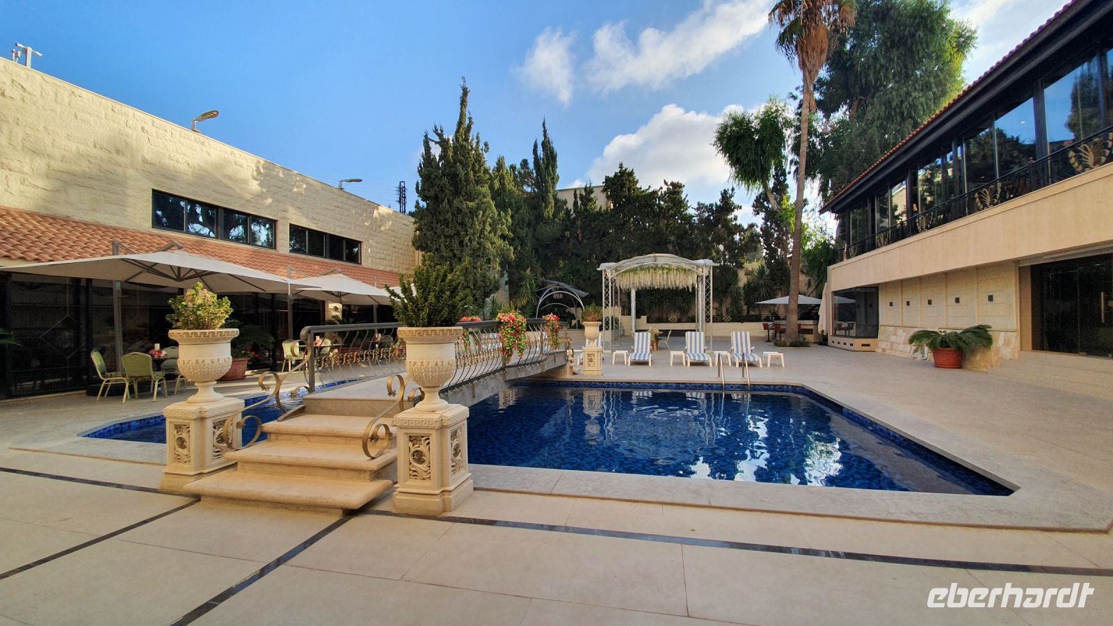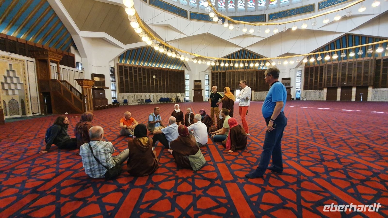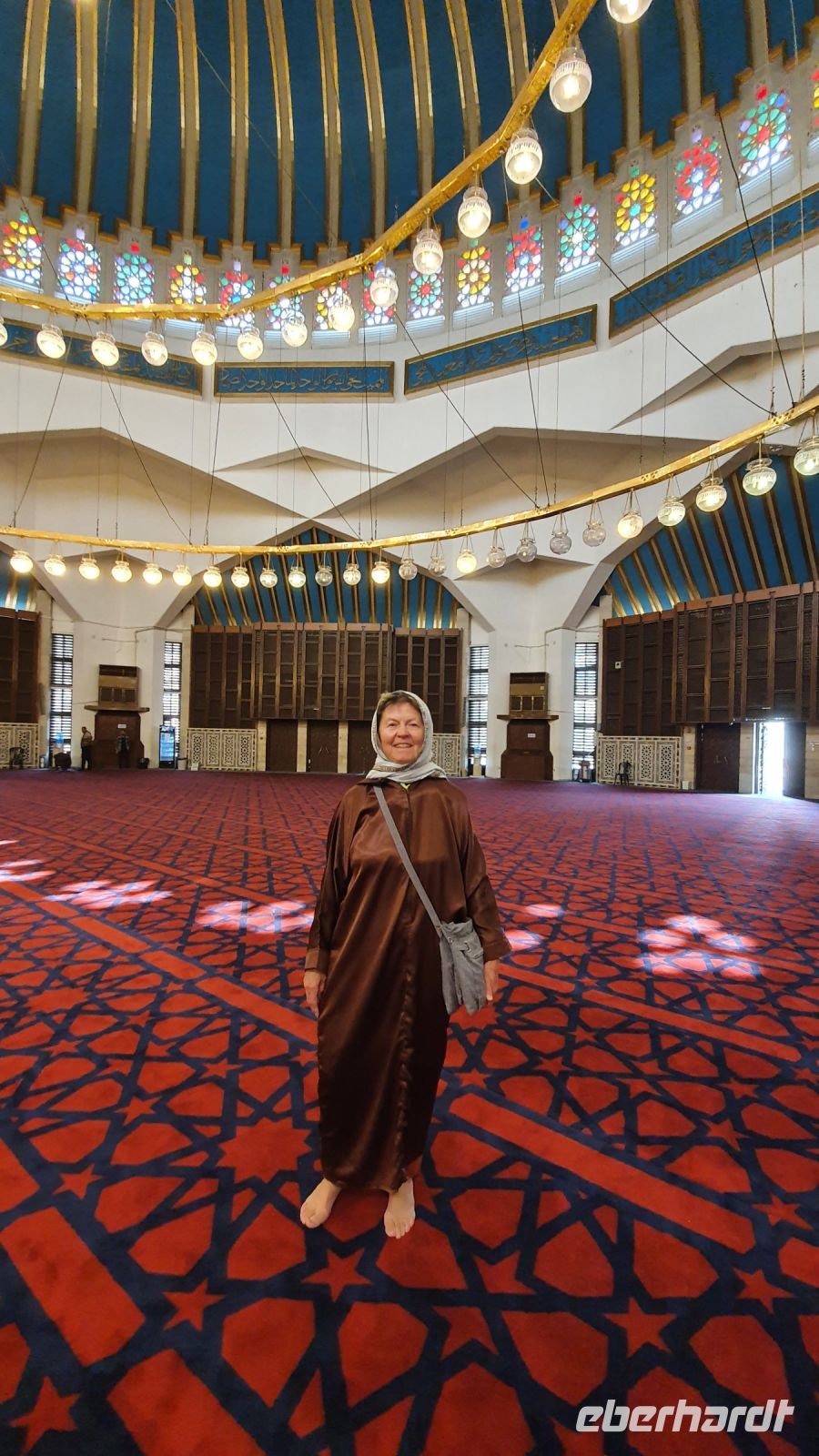 Nach dem Frühstück starteten wir zur Fahrt in die jordanische Hauptstadt Amman. Zuerst besuchten wir die große Moschee. Dafür bekamen alle Frauen der Gruppe eine Abaya und ein Kopftuch und vor Betreten der Moschee mussten alle ihre Schuhe ausziehen. Hussein hatte uns auf der Reise durch Jordanien schon sehr viel von seiner Religion erzählt und das wurde in der Moschee noch einmal vertieft. Wir sassen im Kreis auf dem Fussboden um Hussein herum und bekamen die 5 Säulen des Islam noch einmal sehr anschaulich erläutert. Erstaunlicherweise gehörte zur Moschee auch ein Laden, wo man uns Tee anbot und zum Kaufen animierte. Es folgte die Fahrt mit dem Bus hinauf auf den Zitadellenhügel Ammans. Von dort hatten wir einen fantastischen Blick auf die Stadt und die Reste des Herkules Tempels ganz oben. Im Museum waren interessante Funde zu bewundern. Mit viel Mühe und Geschick unseres Fahrers verliessen wir den Parkplatz auf dem Hügel und fuhren hinunter zum römischen Theater. Das Theater ist noch sehr gut erhalten und so konnten wir die 100 steilen Stufen erklimmen und ganz hinauf gehen, oder die beiden Museen am Theater besuchen. Vom römischen Theater gingen wir zum Souk, um letzte Einkäufe zu tätigen und unterwegs nahm der Bus uns wieder auf und brachte uns durch den staureichen Verkehr zum Mittagessen in der "Windmühle". Dort gab es ein traditionelles arabisches Mittagessen, welches sehr reichlich und schmackhaft war. Gegen 16 Uhr verabschiedeten wir uns von Hussein, denn seine nächste Gruppe reiste bereits am Abend an. Auch von Fahrer Hamad nahmen wir Abschied, da unklar war, ob er uns am nächsten Morgen zum Flughafen bringen würde. Wir bedankten uns sehr herzlich bei Beiden und wünschten alles erdenklich Gute. Auf der Rückfahrt zum Hotel war immer noch sehr viel Verkehr und so blieb nur noch wenig Zeit für ein kurzes Bad im Toten Meer.