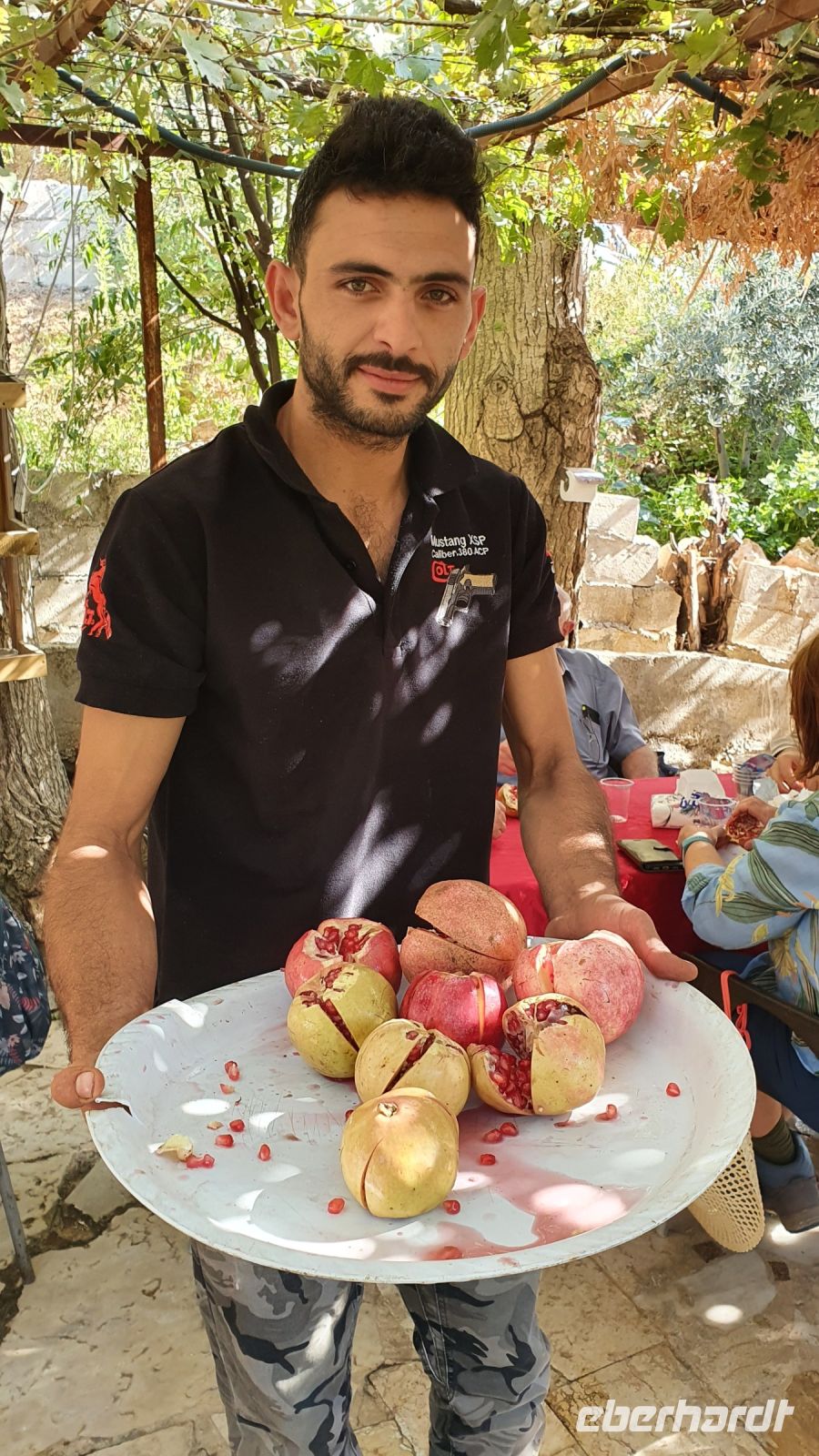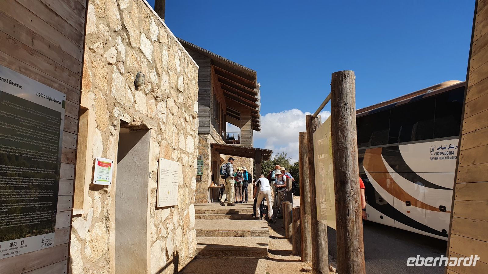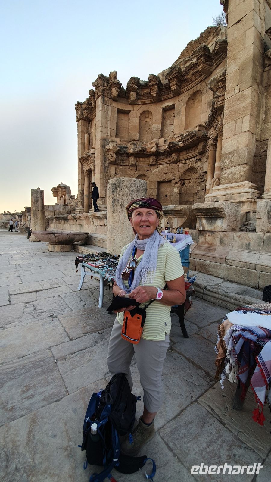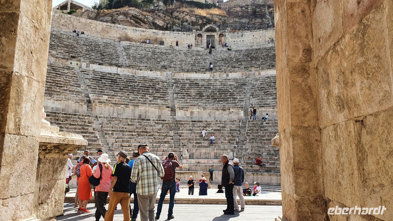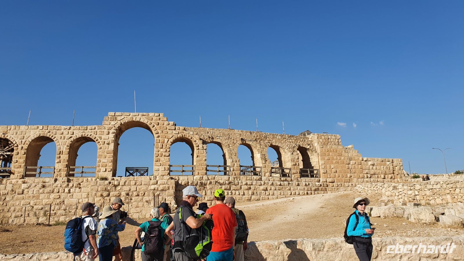 Nach einer kurzen Nacht und einem sehr guten Frühstück im Hotel starteten wir zur Fahrt in den grünen Norden Jordaniens. Auf der Fahrt durch die Hauptstadt Amman gab uns Hussein die ersten Informationen zum Land und zu Amman. Nach 2 Stunden Fahrt erreichten wir das Besucherzentrum im Naturreservat Ajloun und zusammen mit einem Ranger wanderten wir auf markierten Wegen immer bergauf und bergab und mit guten Aussichten bis hin zum Jordangraben und hinüber nach Isreal. Unterwegs gab es viele Informationen zu den Pflanzen im Naturreservat. Schliesslich erreichten wir das Dorf Orjan und ganz am Ende in einer Schlucht gab es Mittagessen im Garten bei einer jordanischen Familie. Das war sehr schmackhaft und zum Abschluss bekam jeder einen sehr reifen Granatapfel als Nachtisch. Gut gestärkt fuhren wir weiter nach Jerash und begannen unsere Besichtigung im "Pompej des Nahen Ostens" beim Hadriansbogen. Dieses prächtige Eingangstor liegt weit vor der antiken Stadt und wurde für Kaiser Hadrian anlässlich seines Besuches in Jerash errichtet. Durch das Hadrianstor gelangten wir vorbei am Hippodrom zum Südtor und weiter zum ovalen Forum und dort gab uns Hussein viele wichtige Informationen zum einstigen Leben in der antiken Stadt. Von da stiegen wir hinauf zum Südtheater und wurden dort mit Dudelsackmusik begrüßt. Etwa 4000 Besucher finden auf 32 Reihen Platz und das Theater ist nach Norden ausgerichtet, damit die Besucher nicht von der Sonne geblendet werden. Unser Spaziergang in der Abendsonne durch Jerash führte vorbei am südlichen Decumanus zum Artemistempel und über viele Stufen hinunter zum Cardo Maximus und auf dieser römischen Hauptstrasse liefen wir dem Ausgang durch das Südtor entgegen. Pünktlich zum Abendessen waren wir wieder in unserem Hotel in Amman.