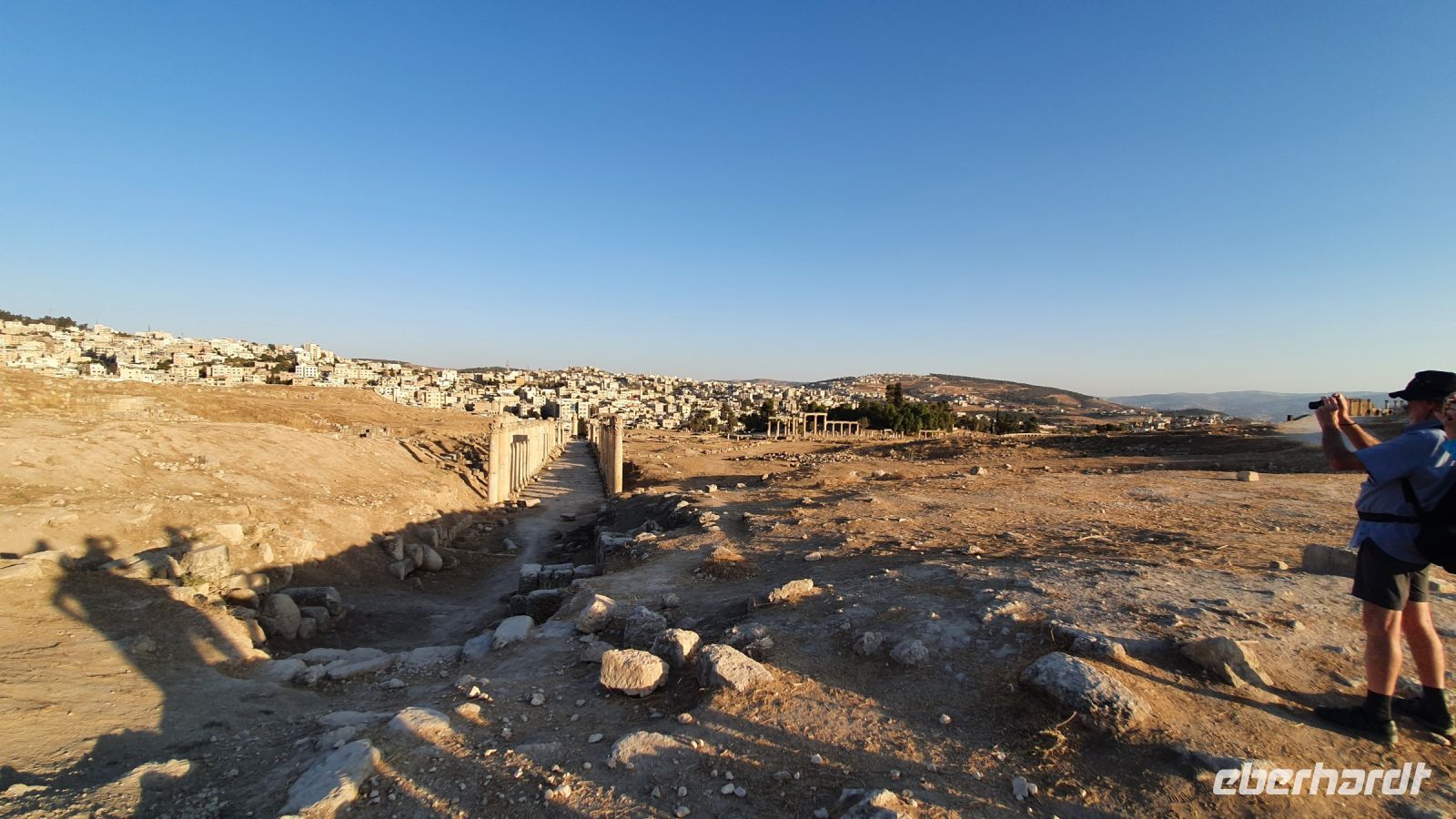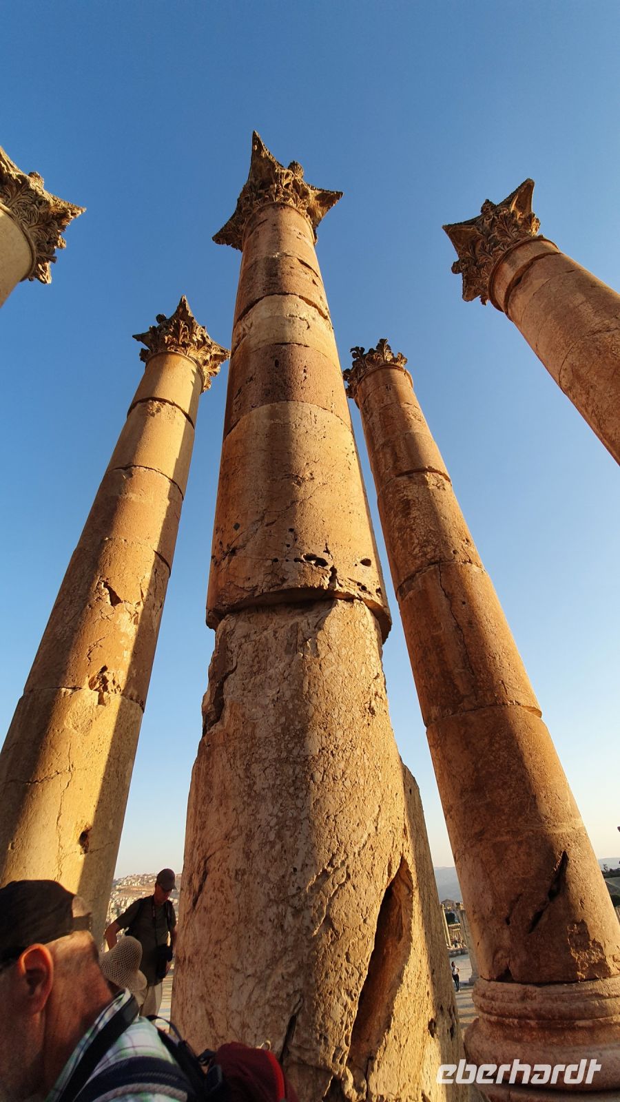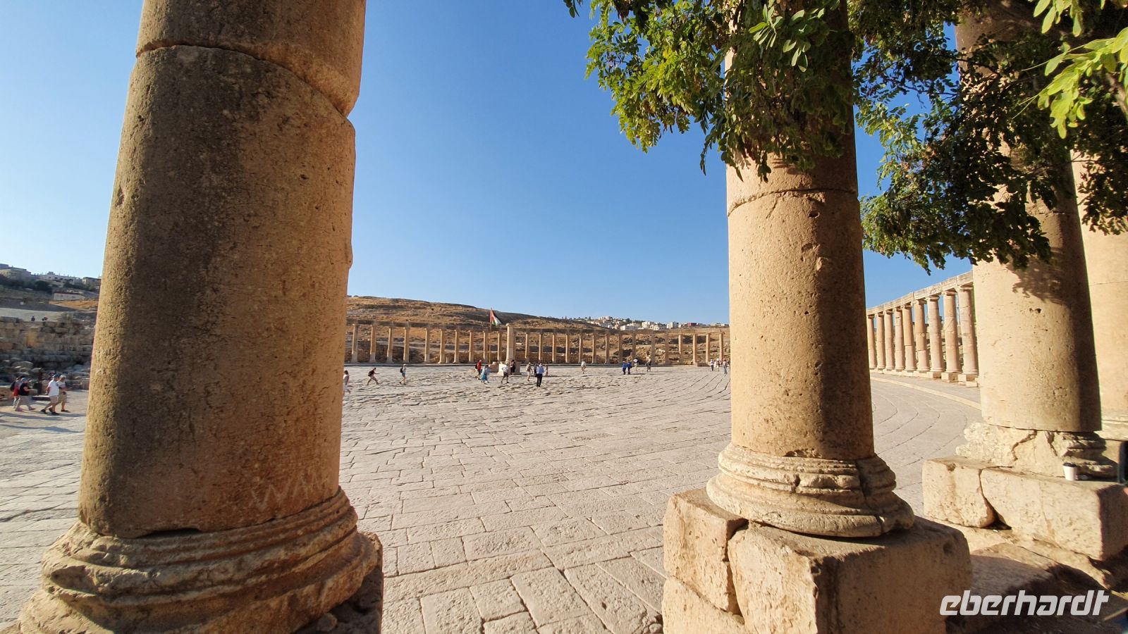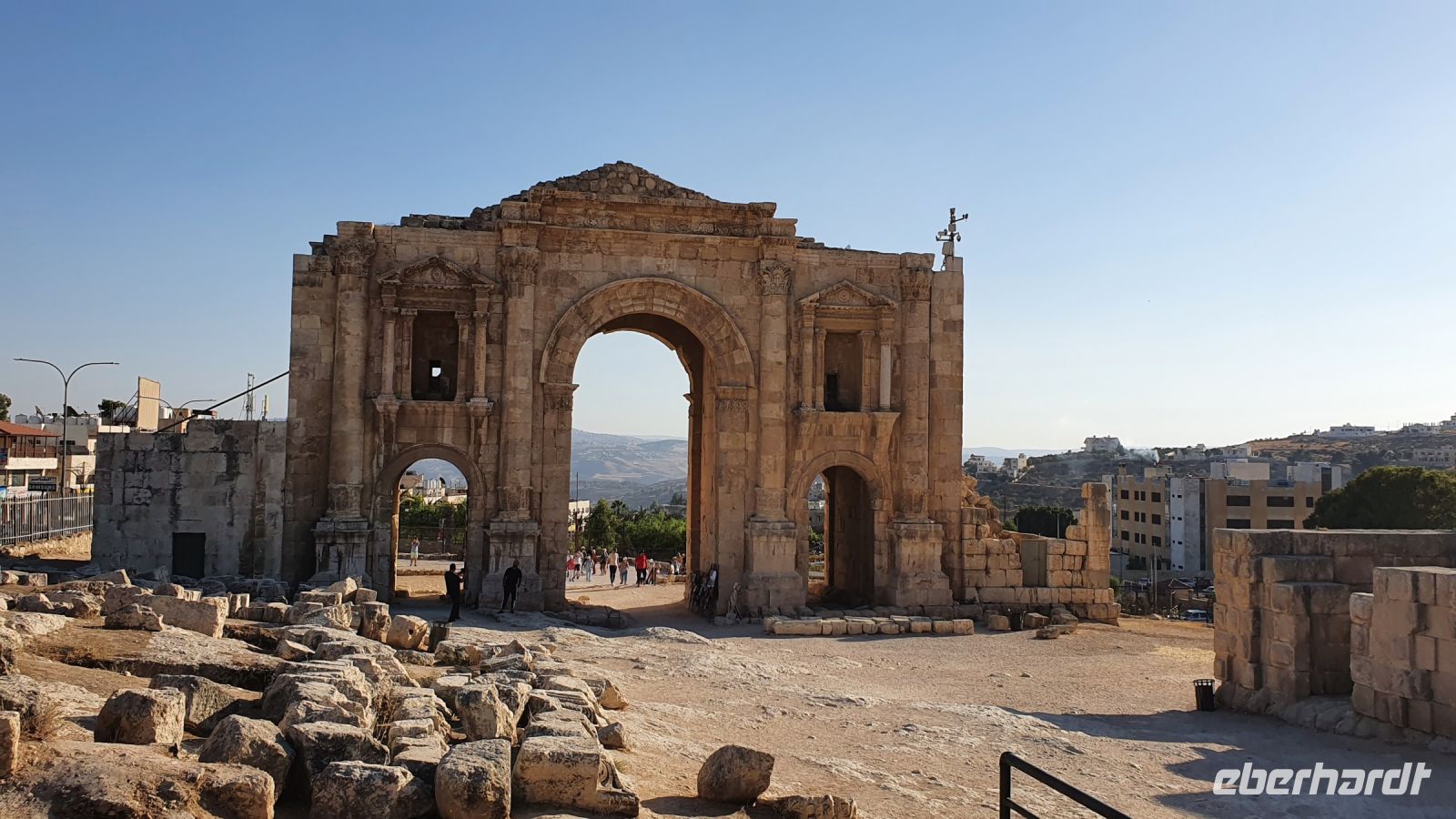 Nach einer kurzen Nacht und einem sehr guten Frühstück im Hotel starteten wir zur Fahrt in den grünen Norden Jordaniens. Auf der Fahrt durch die Hauptstadt Amman gab uns Hussein die ersten Informationen zum Land und zu Amman. Nach 2 Stunden Fahrt erreichten wir das Besucherzentrum im Naturreservat Ajloun und zusammen mit einem Ranger wanderten wir auf markierten Wegen immer bergauf und bergab und mit guten Aussichten bis hin zum Jordangraben und hinüber nach Isreal. Unterwegs gab es viele Informationen zu den Pflanzen im Naturreservat. Schliesslich erreichten wir das Dorf Orjan und ganz am Ende in einer Schlucht gab es Mittagessen im Garten bei einer jordanischen Familie. Das war sehr schmackhaft und zum Abschluss bekam jeder einen sehr reifen Granatapfel als Nachtisch. Gut gestärkt fuhren wir weiter nach Jerash und begannen unsere Besichtigung im "Pompej des Nahen Ostens" beim Hadriansbogen. Dieses prächtige Eingangstor liegt weit vor der antiken Stadt und wurde für Kaiser Hadrian anlässlich seines Besuches in Jerash errichtet. Durch das Hadrianstor gelangten wir vorbei am Hippodrom zum Südtor und weiter zum ovalen Forum und dort gab uns Hussein viele wichtige Informationen zum einstigen Leben in der antiken Stadt. Von da stiegen wir hinauf zum Südtheater und wurden dort mit Dudelsackmusik begrüßt. Etwa 4000 Besucher finden auf 32 Reihen Platz und das Theater ist nach Norden ausgerichtet, damit die Besucher nicht von der Sonne geblendet werden. Unser Spaziergang in der Abendsonne durch Jerash führte vorbei am südlichen Decumanus zum Artemistempel und über viele Stufen hinunter zum Cardo Maximus und auf dieser römischen Hauptstrasse liefen wir dem Ausgang durch das Südtor entgegen. Pünktlich zum Abendessen waren wir wieder in unserem Hotel in Amman.
