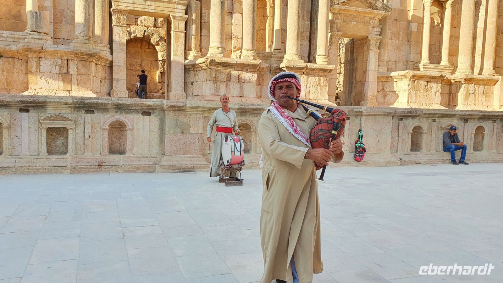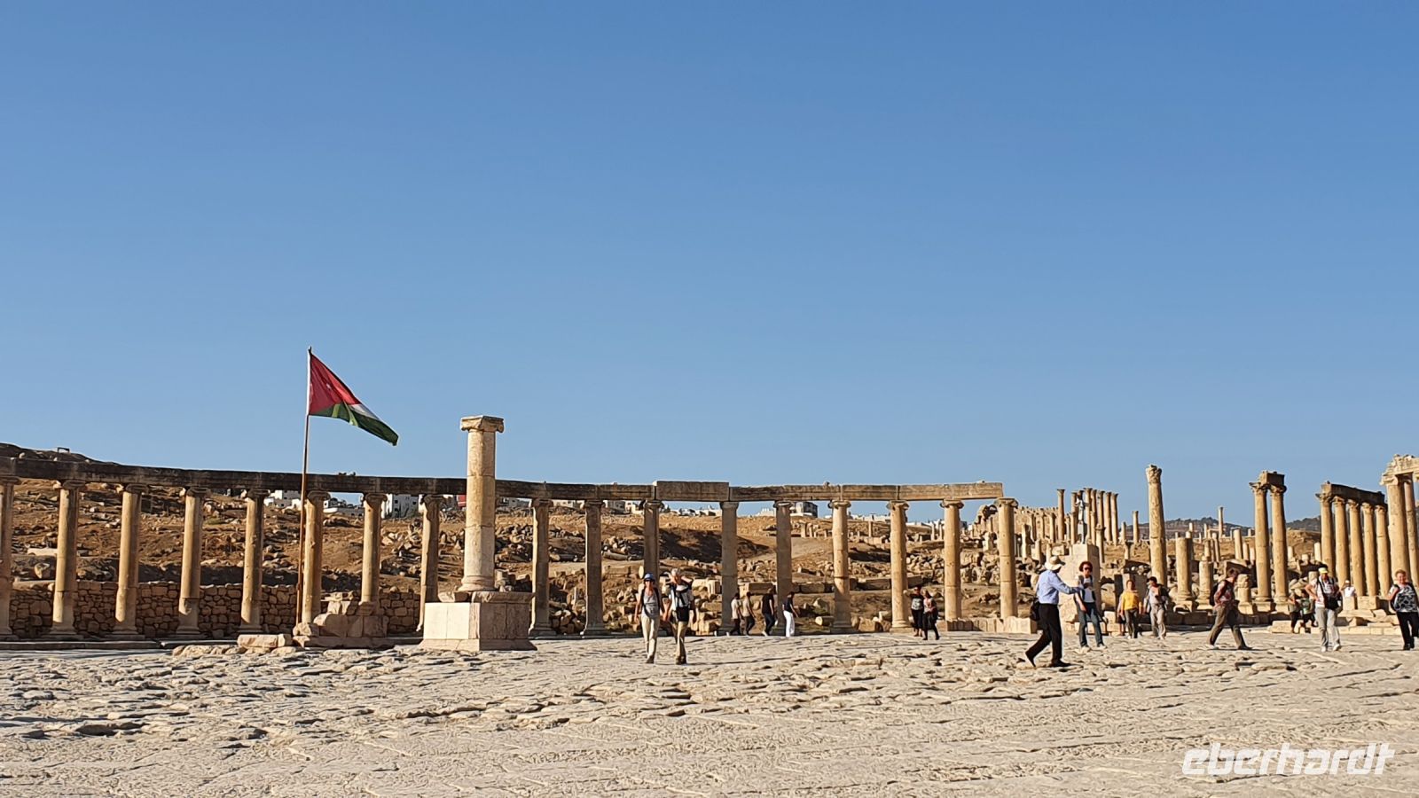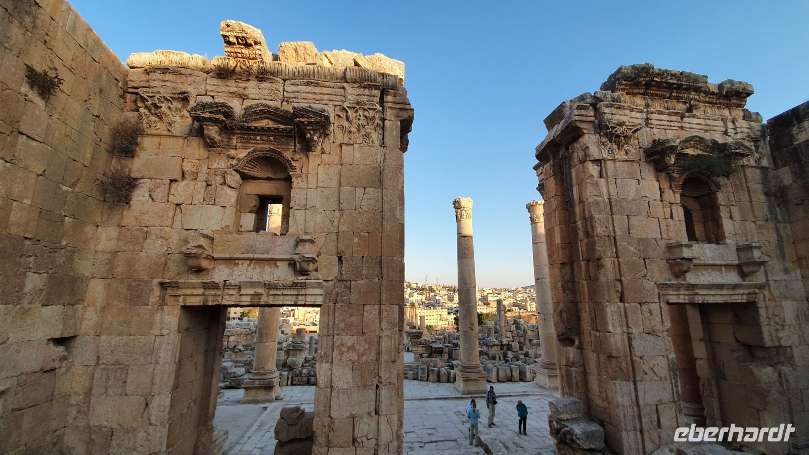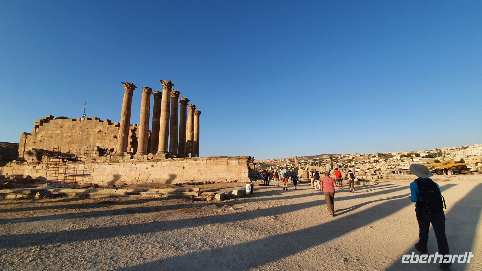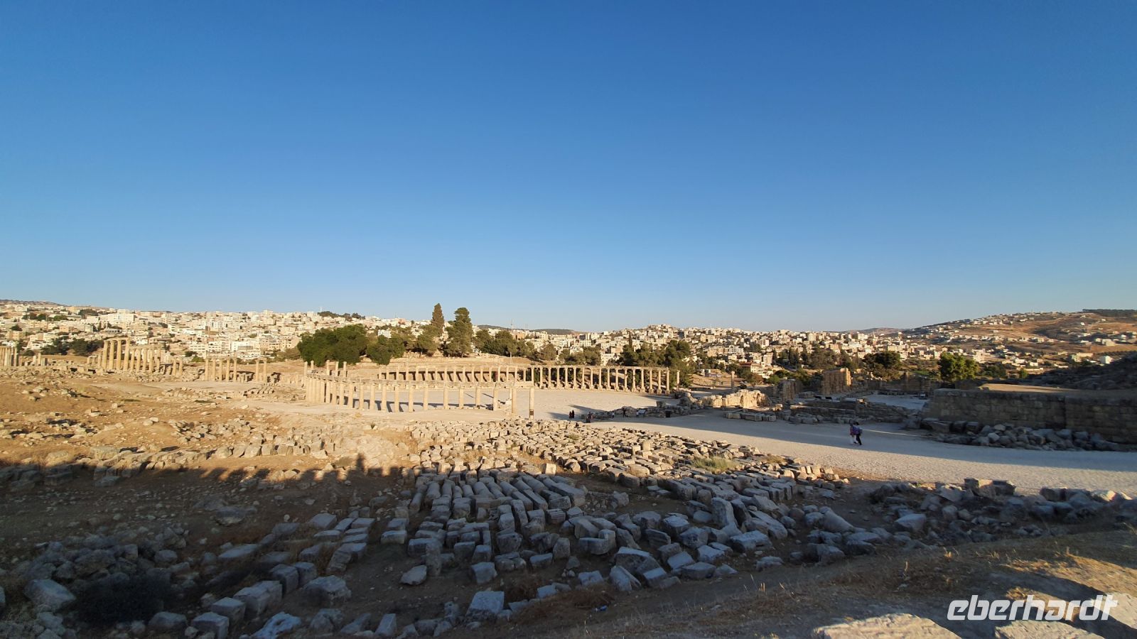Nach einer kurzen Nacht und einem sehr guten Frühstück im Hotel starteten wir zur Fahrt in den grünen Norden Jordaniens. Auf der Fahrt durch die Hauptstadt Amman gab uns Hussein die ersten Informationen zum Land und zu Amman. Nach 2 Stunden Fahrt erreichten wir das Besucherzentrum im Naturreservat Ajloun und zusammen mit einem Ranger wanderten wir auf markierten Wegen immer bergauf und bergab und mit guten Aussichten bis hin zum Jordangraben und hinüber nach Isreal. Unterwegs gab es viele Informationen zu den Pflanzen im Naturreservat. Schliesslich erreichten wir das Dorf Orjan und ganz am Ende in einer Schlucht gab es Mittagessen im Garten bei einer jordanischen Familie. Das war sehr schmackhaft und zum Abschluss bekam jeder einen sehr reifen Granatapfel als Nachtisch. Gut gestärkt fuhren wir weiter nach Jerash und begannen unsere Besichtigung im "Pompej des Nahen Ostens" beim Hadriansbogen. Dieses prächtige Eingangstor liegt weit vor der antiken Stadt und wurde für Kaiser Hadrian anlässlich seines Besuches in Jerash errichtet. Durch das Hadrianstor gelangten wir vorbei am Hippodrom zum Südtor und weiter zum ovalen Forum und dort gab uns Hussein viele wichtige Informationen zum einstigen Leben in der antiken Stadt. Von da stiegen wir hinauf zum Südtheater und wurden dort mit Dudelsackmusik begrüßt. Etwa 4000 Besucher finden auf 32 Reihen Platz und das Theater ist nach Norden ausgerichtet, damit die Besucher nicht von der Sonne geblendet werden. Unser Spaziergang in der Abendsonne durch Jerash führte vorbei am südlichen Decumanus zum Artemistempel und über viele Stufen hinunter zum Cardo Maximus und auf dieser römischen Hauptstrasse liefen wir dem Ausgang durch das Südtor entgegen. Pünktlich zum Abendessen waren wir wieder in unserem Hotel in Amman.