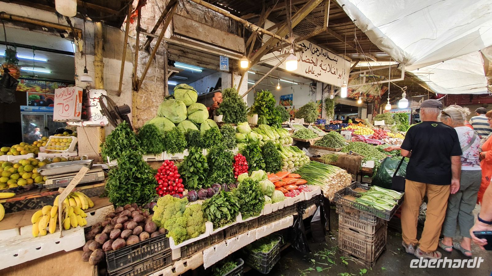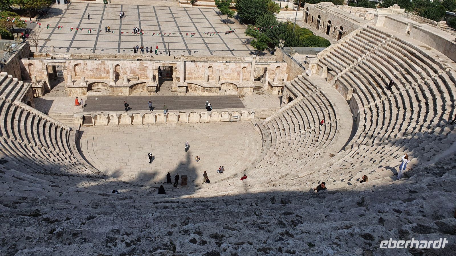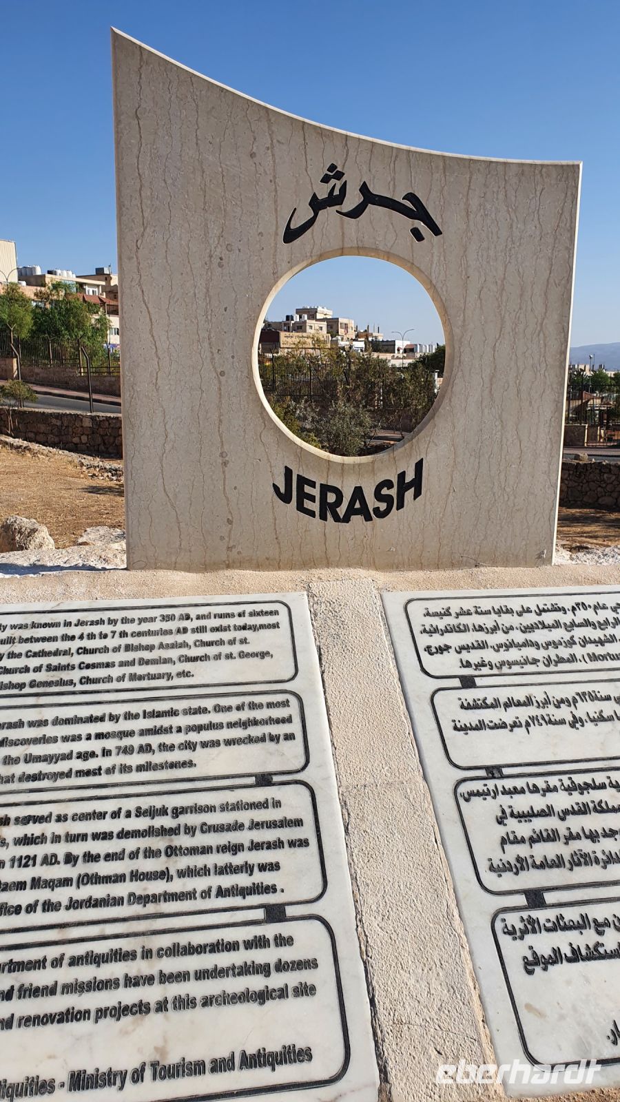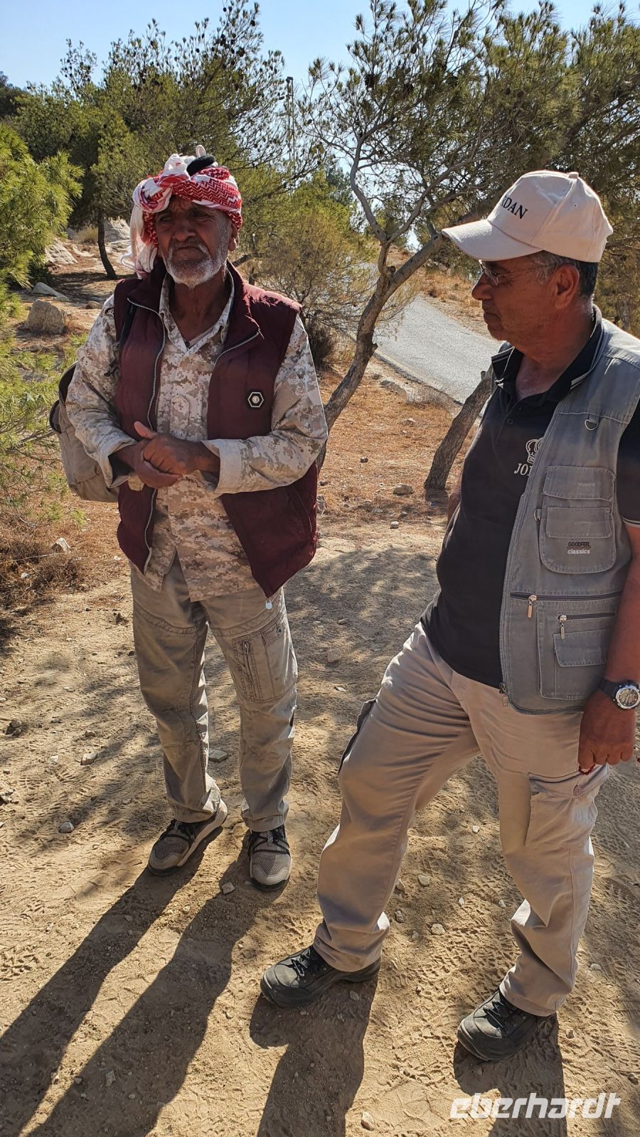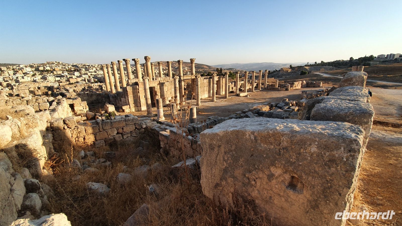 Nach einer kurzen Nacht und einem sehr guten Frühstück im Hotel starteten wir zur Fahrt in den grünen Norden Jordaniens. Auf der Fahrt durch die Hauptstadt Amman gab uns Hussein die ersten Informationen zum Land und zu Amman. Nach 2 Stunden Fahrt erreichten wir das Besucherzentrum im Naturreservat Ajloun und zusammen mit einem Ranger wanderten wir auf markierten Wegen immer bergauf und bergab und mit guten Aussichten bis hin zum Jordangraben und hinüber nach Isreal. Unterwegs gab es viele Informationen zu den Pflanzen im Naturreservat. Schliesslich erreichten wir das Dorf Orjan und ganz am Ende in einer Schlucht gab es Mittagessen im Garten bei einer jordanischen Familie. Das war sehr schmackhaft und zum Abschluss bekam jeder einen sehr reifen Granatapfel als Nachtisch. Gut gestärkt fuhren wir weiter nach Jerash und begannen unsere Besichtigung im "Pompej des Nahen Ostens" beim Hadriansbogen. Dieses prächtige Eingangstor liegt weit vor der antiken Stadt und wurde für Kaiser Hadrian anlässlich seines Besuches in Jerash errichtet. Durch das Hadrianstor gelangten wir vorbei am Hippodrom zum Südtor und weiter zum ovalen Forum und dort gab uns Hussein viele wichtige Informationen zum einstigen Leben in der antiken Stadt. Von da stiegen wir hinauf zum Südtheater und wurden dort mit Dudelsackmusik begrüßt. Etwa 4000 Besucher finden auf 32 Reihen Platz und das Theater ist nach Norden ausgerichtet, damit die Besucher nicht von der Sonne geblendet werden. Unser Spaziergang in der Abendsonne durch Jerash führte vorbei am südlichen Decumanus zum Artemistempel und über viele Stufen hinunter zum Cardo Maximus und auf dieser römischen Hauptstrasse liefen wir dem Ausgang durch das Südtor entgegen. Pünktlich zum Abendessen waren wir wieder in unserem Hotel in Amman.