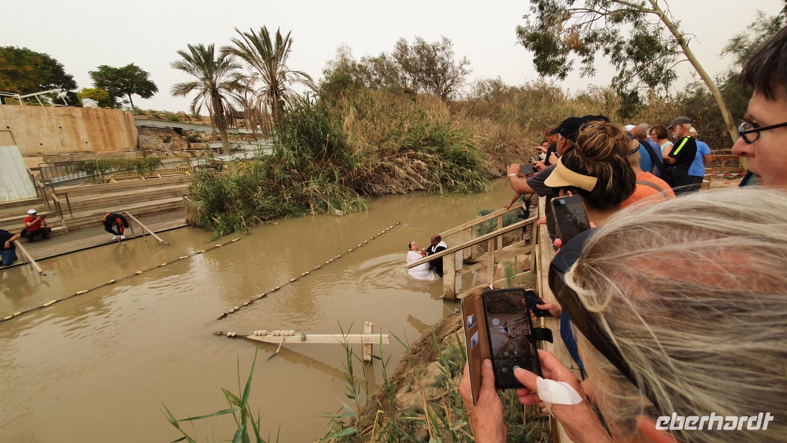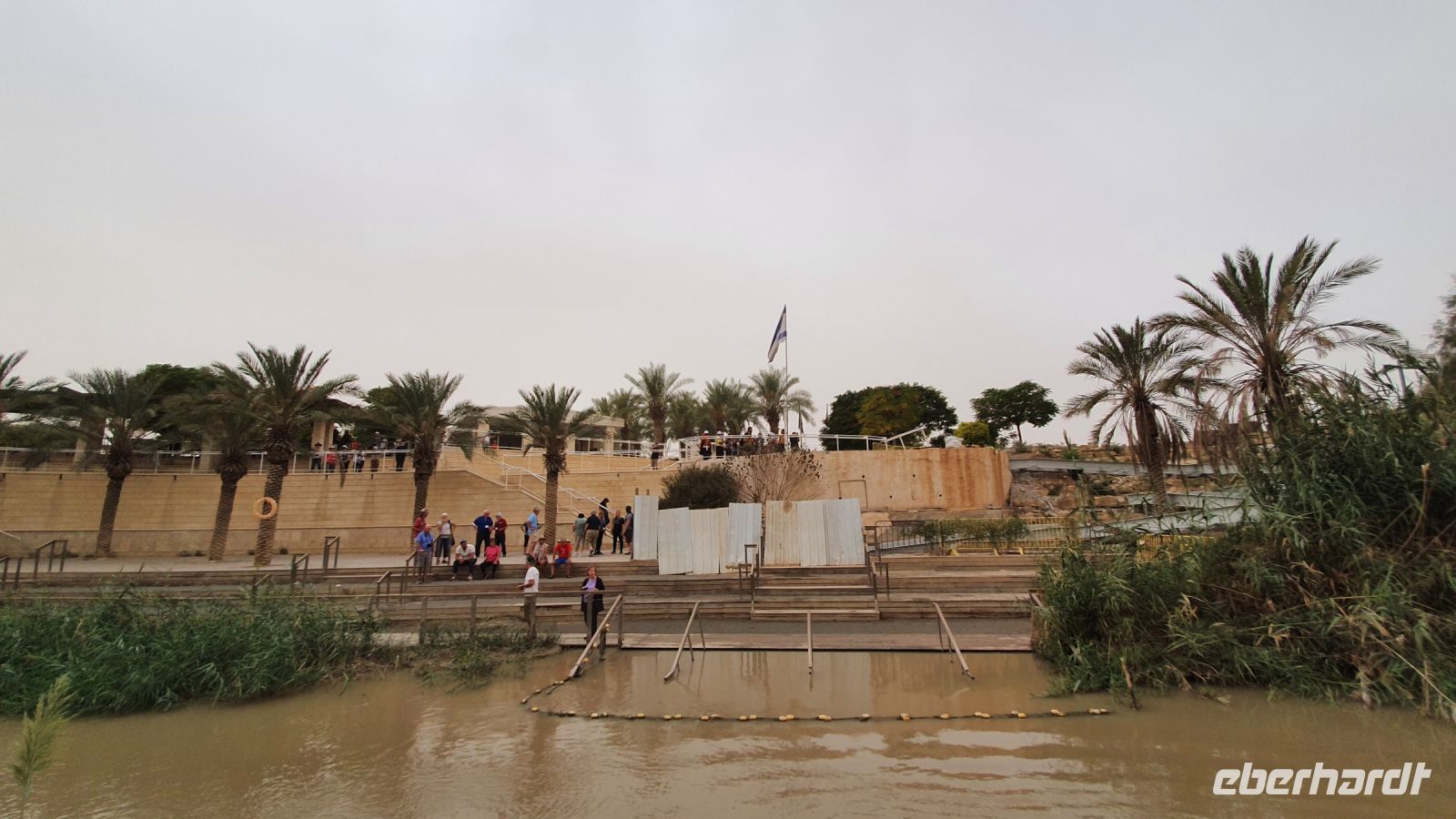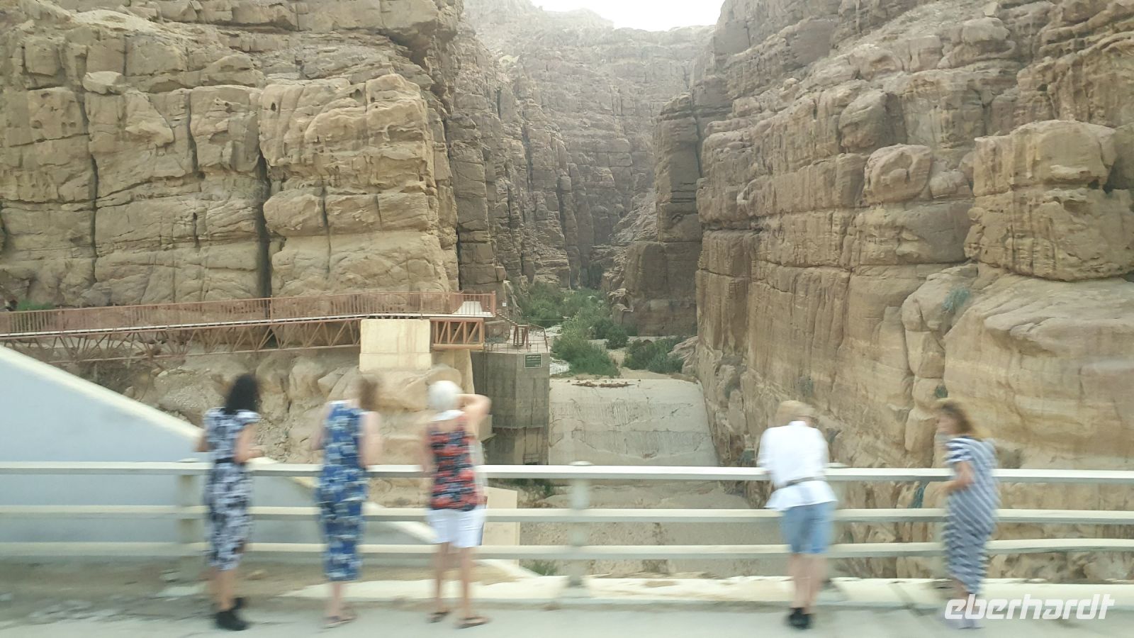 Endlich einmal ausschlafen und wieder ein tolles Frühstück geniessen. Dann kamen unser Reiseleiter Hussein und Fahrer Hamad zum Hotel und gemeinsam fuhren wir am Ufer des Toten Meeres entlang gen Süden. Es war geplant, einen Wassertrail im Wadi Al Mujib zu machen. Aber durch den Regen der vergangenen Tage war das wegen zuviel Wasser nicht möglich. So wanderten wir durch das Wadi Numeira mit deutlich weniger Wasser. Dennoch führten viele Passagen unserer Wanderung durch das Wasser und so wurden unsere Wanderschuhe ordentlich "gereinigt". Die Wanderstrecke verlief durch schmale Felsschluchten und eine herrlich farbenfrohe Felslandschaft bis zu einem kleinen Wasserfall und von da auf gleicher Strecke wieder zurück. Es war eine schöne, erlebnisreiche "Ersatz"wanderung. Auf der Rückfahrt spendierte uns Hussein frisches Fladenbrot und dazu Falafel und von mir gab es Bananen als Nachtisch. So sparten wir Zeit und waren bereits halb Zwei an der Taufstelle Bethanien. Zu Fuss liefen wir zum Jordan und wir durften einer Taufzeremonie beiwohnen. Eine Gruppe brasilianischer Pilger mit ihrem Pater liessen sich im Jordan taufen auf der jordanischen Seite. Und auch in Isreal am gegenüber liegenden Ufer gab es viele Zuschauer. Auf dem Rückweg verdunkelte sich der Himmel ganz merkwürdig und wir konnten eine partielle Sonnenfinsternis beobachten. Danach brachte der Bus uns zurück zum Hotel und so konnten wir am Nachmittag noch ein Bad im Toten Meer nehmen. Das allerdings war nicht ganz einfach, denn der Wind frischte stark auf, machte Wellen im Wasser und man wurde abgetrieben. Auch das gibt es nicht alle Tage. So fiel die Badezeit im Toten Meer etwas kürzer aus und stattdessen wurden die Pools genutzt in der Hotelanlage.