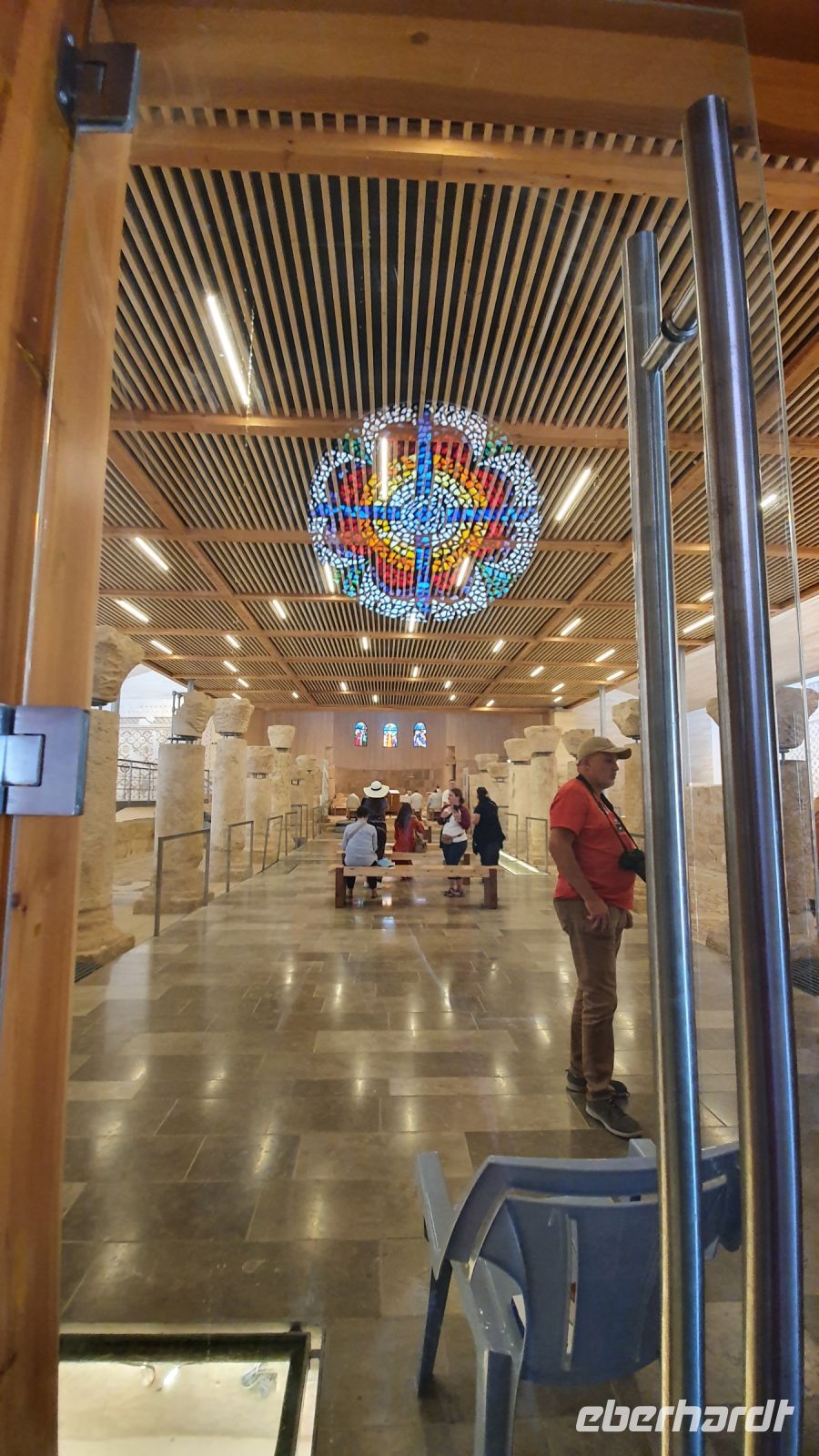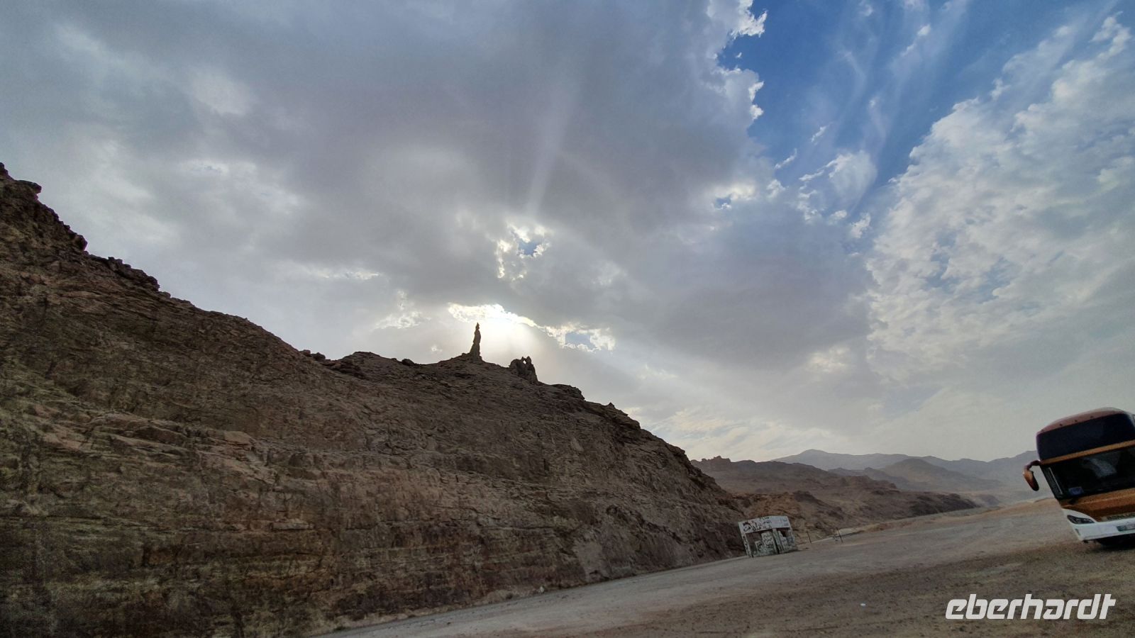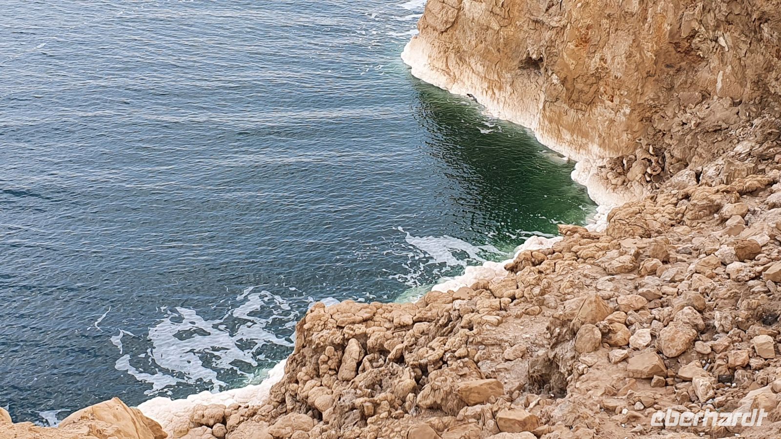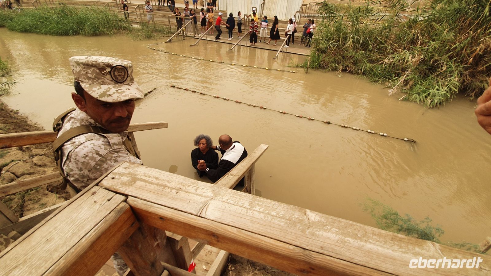Endlich einmal ausschlafen und wieder ein tolles Frühstück geniessen. Dann kamen unser Reiseleiter Hussein und Fahrer Hamad zum Hotel und gemeinsam fuhren wir am Ufer des Toten Meeres entlang gen Süden. Es war geplant, einen Wassertrail im Wadi Al Mujib zu machen. Aber durch den Regen der vergangenen Tage war das wegen zuviel Wasser nicht möglich. So wanderten wir durch das Wadi Numeira mit deutlich weniger Wasser. Dennoch führten viele Passagen unserer Wanderung durch das Wasser und so wurden unsere Wanderschuhe ordentlich "gereinigt". Die Wanderstrecke verlief durch schmale Felsschluchten und eine herrlich farbenfrohe Felslandschaft bis zu einem kleinen Wasserfall und von da auf gleicher Strecke wieder zurück. Es war eine schöne, erlebnisreiche "Ersatz"wanderung. Auf der Rückfahrt spendierte uns Hussein frisches Fladenbrot und dazu Falafel und von mir gab es Bananen als Nachtisch. So sparten wir Zeit und waren bereits halb Zwei an der Taufstelle Bethanien. Zu Fuss liefen wir zum Jordan und wir durften einer Taufzeremonie beiwohnen. Eine Gruppe brasilianischer Pilger mit ihrem Pater liessen sich im Jordan taufen auf der jordanischen Seite. Und auch in Isreal am gegenüber liegenden Ufer gab es viele Zuschauer. Auf dem Rückweg verdunkelte sich der Himmel ganz merkwürdig und wir konnten eine partielle Sonnenfinsternis beobachten. Danach brachte der Bus uns zurück zum Hotel und so konnten wir am Nachmittag noch ein Bad im Toten Meer nehmen. Das allerdings war nicht ganz einfach, denn der Wind frischte stark auf, machte Wellen im Wasser und man wurde abgetrieben. Auch das gibt es nicht alle Tage. So fiel die Badezeit im Toten Meer etwas kürzer aus und stattdessen wurden die Pools genutzt in der Hotelanlage.