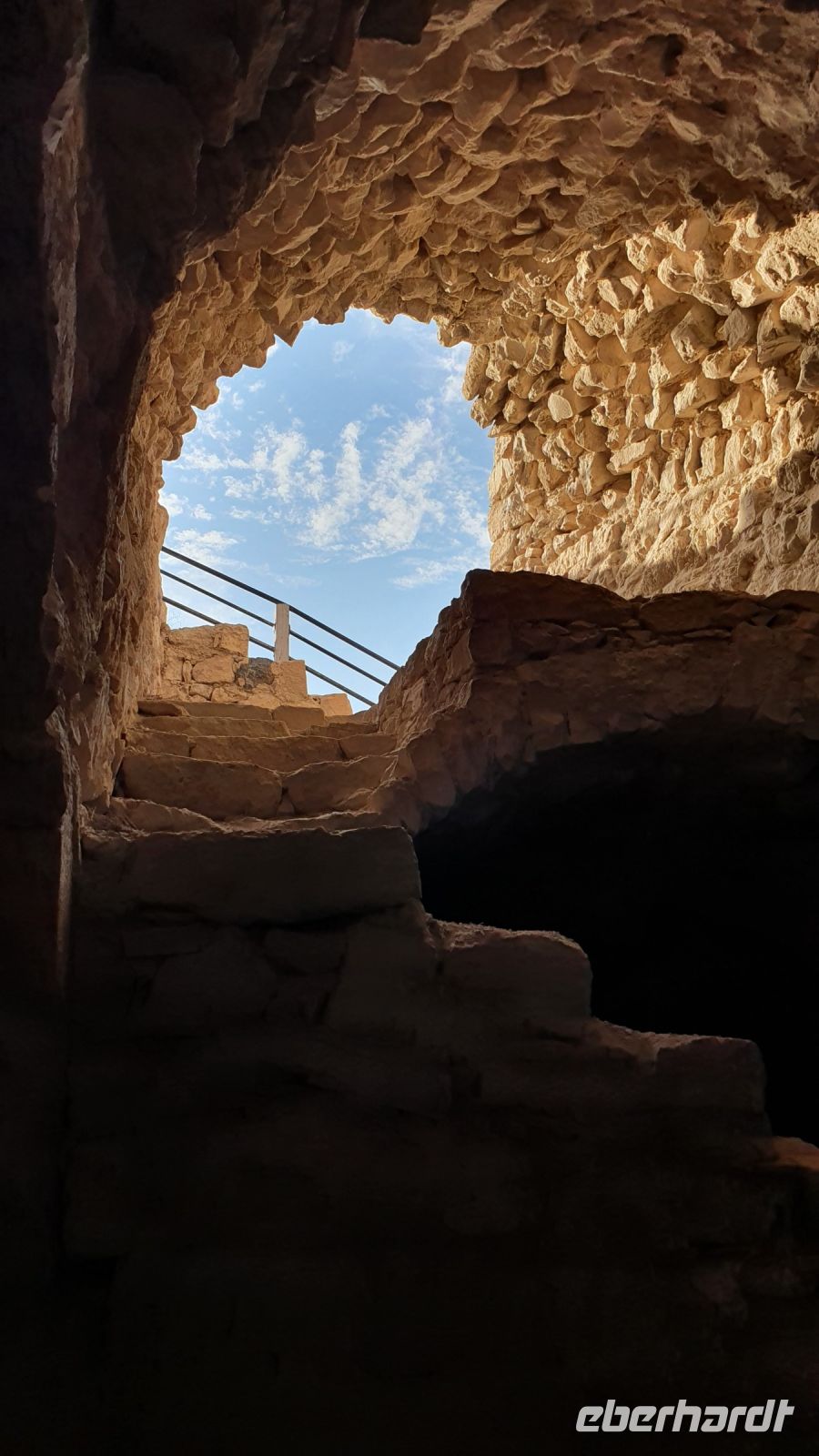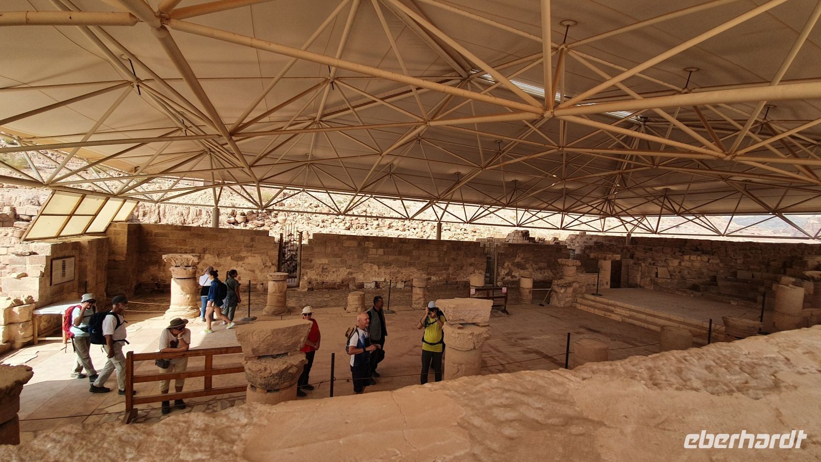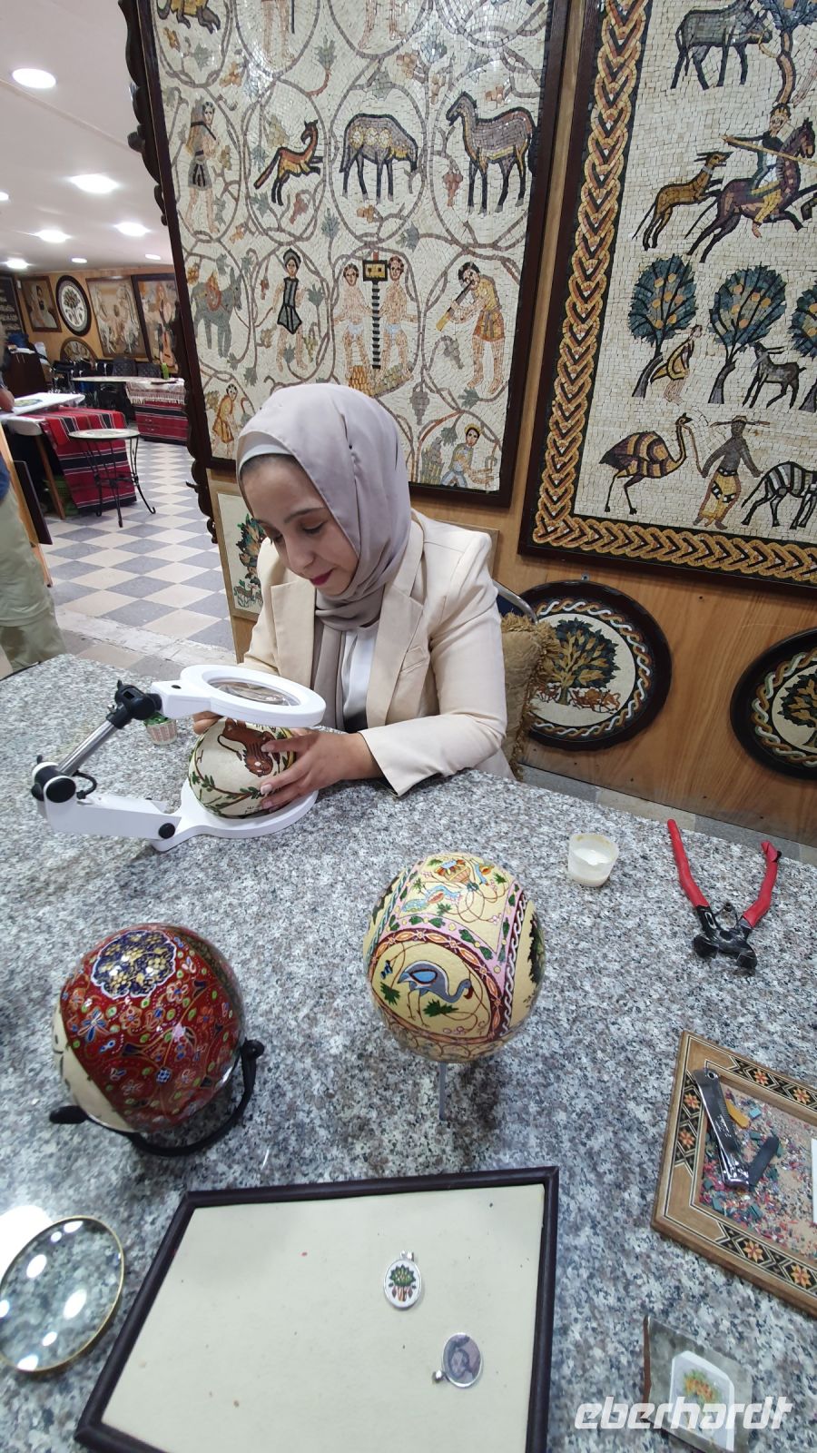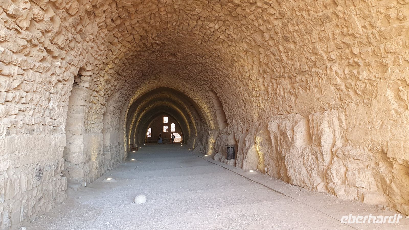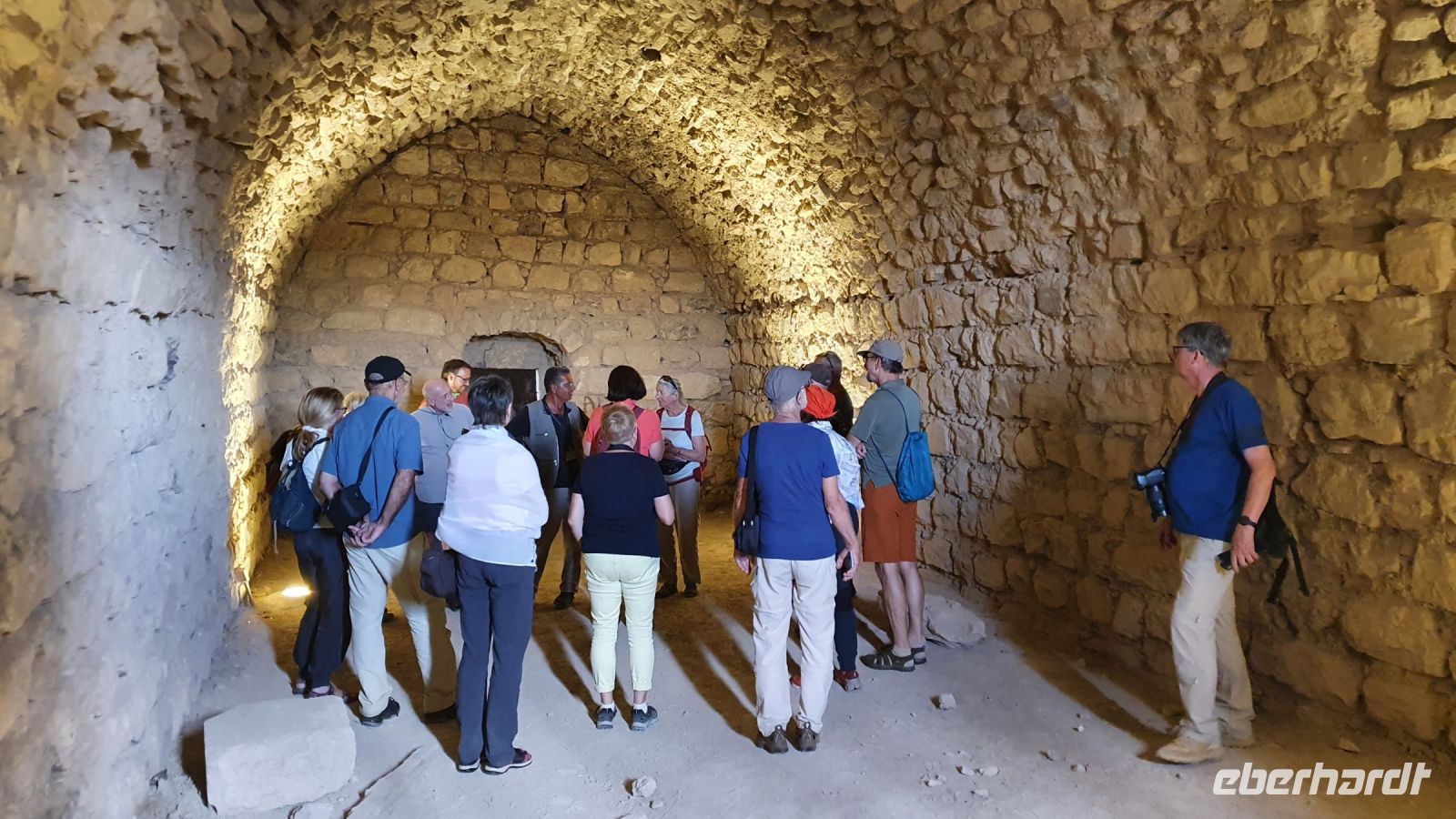 Mit gepackten Koffern verliessen wir unser ruhig gelegenes Hotel in Amman und fuhren gen Süden nach Madaba und weiter zum Berg Nebo. Dort trafen wir auf viele Touristen, die so wie wir den Heiligen Berg besuchen wollten. In der biblischen Geschichte soll Moses von hier aus 800 Metern Höhe in das gelobte Land geblickt haben und er soll hier auch gestorben sein. Sein Grab wurde bislang noch nicht gefunden. Auf dem Berg wurden immer wieder Kirchen errichtet und in der heutigen sind die alten Mosaike zu sehen und als wir da waren, feierten polnische Pilger einen Gottesdienst. Auf dem Rückweg nach Madaba machten wir Halt in einer Mosaikwerkstatt und konnten bei der mühevollen und viel Geduld fordernden Arbeit zuschauen und natürlich auch Mosaike kaufen. In Madaba begaben wir uns zur St. Georgskirche, um das wohl berühmteste Mosaik im Fussboden der Kirche zu betrachten. In einem Besucherraum wird ein Modell ausgestellt und daran erläuterte uns Hussein die Details des Mosaiks. Danach durften wir in der Kirche das Original der sog. Palästinakarte betrachten. In Madaba erledigten wir danach den Geldtausch und im Frankfurter Supermarkt konnten wir leckere Produkte aus Jordanien probieren und kaufen. Unsere weitere Fahrtstrecke nach Süden verlief auf der Königsstrasse durch das Wadi Mujib, den jordanischen Canyon. Unser nächstes Ziel war Kerak und der Besuch der Kreuzritterburg hoch oben auf einem Felsen. Hussein zeigte uns die wichtigsten Räume und gab uns viele Informationen. Im Licht der tief stehenden Nachmittagssonne konnten wir fantastische Fotos machen und die Aussicht geniessen. Danach stand noch eine weite Fahrt bis zu unserer nächsten Unterkunft im Dana Biosphärenreservat an. Unser Fahrer Hamad vollbrachte eine grandiose Leistung, als er den großen Bus über eine äußerst schmale und kurvenreiche Strasse steuern musste. An der Rezeption des Rumana Camps stiegen wir um in ein Shuttle Fahrzeug und das brachte uns hinunter auf ein Felsplateau, wo die Zelte für unsere nächste Nacht standen. Wir hatten nur ein kleines Gepäck für diese eine Nacht dabei und gingen nach Ankunft gleich zum Abendessen. Erst danach bezogen wir unsere Zelte und richteten uns ein. In jedem Zelt gab es 3 dicke Matratzen, auf denen Kopfkissen und Decken lagen, die wir mit weisser Bettwäsche beziehen konnten. Die Zelte waren recht geräumig und in der Mitte konnte man sogar aufrecht stehen. In einem großen, nach Osten und Süden offenen Zelt trafen wir uns anschliessend, um Tee zu trinken und die Stille zu geniessen.