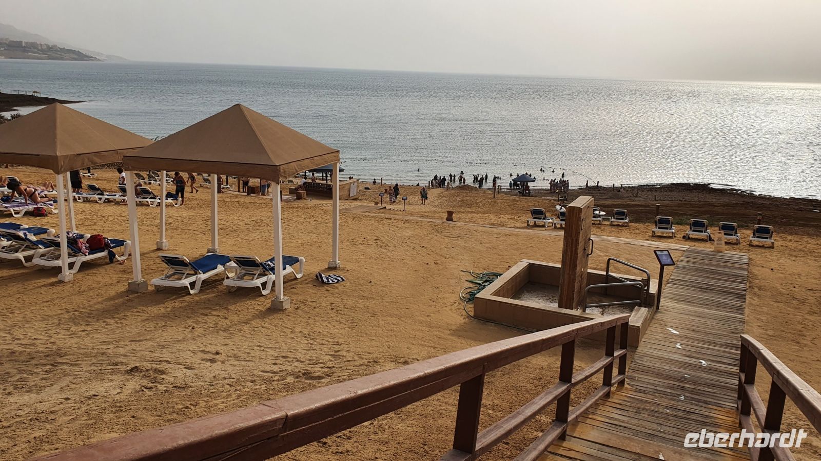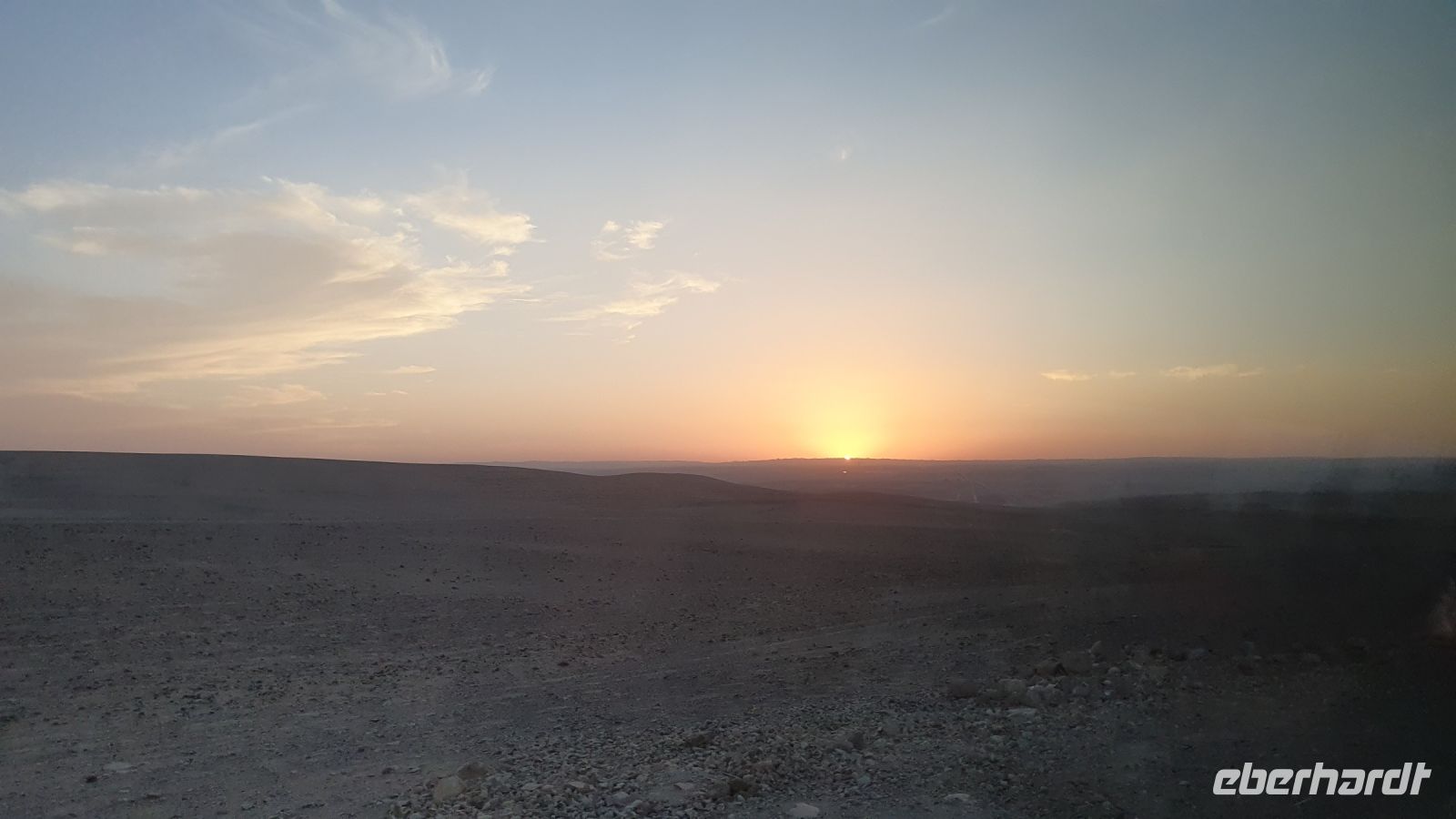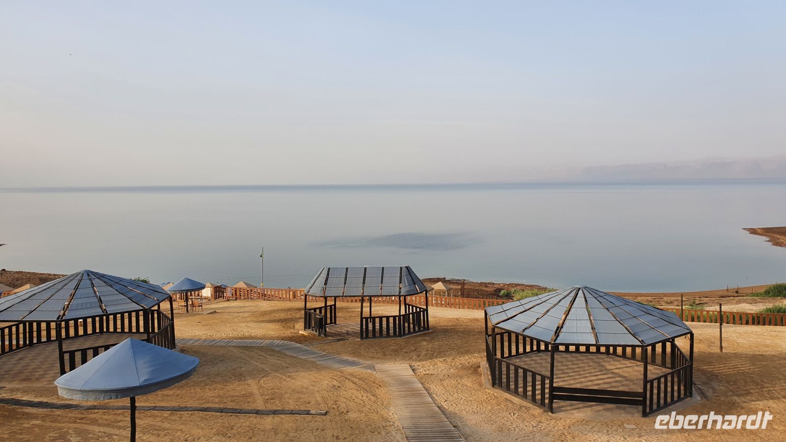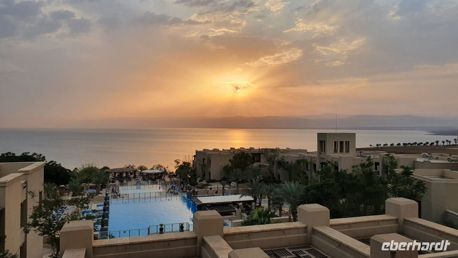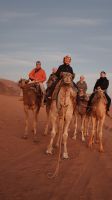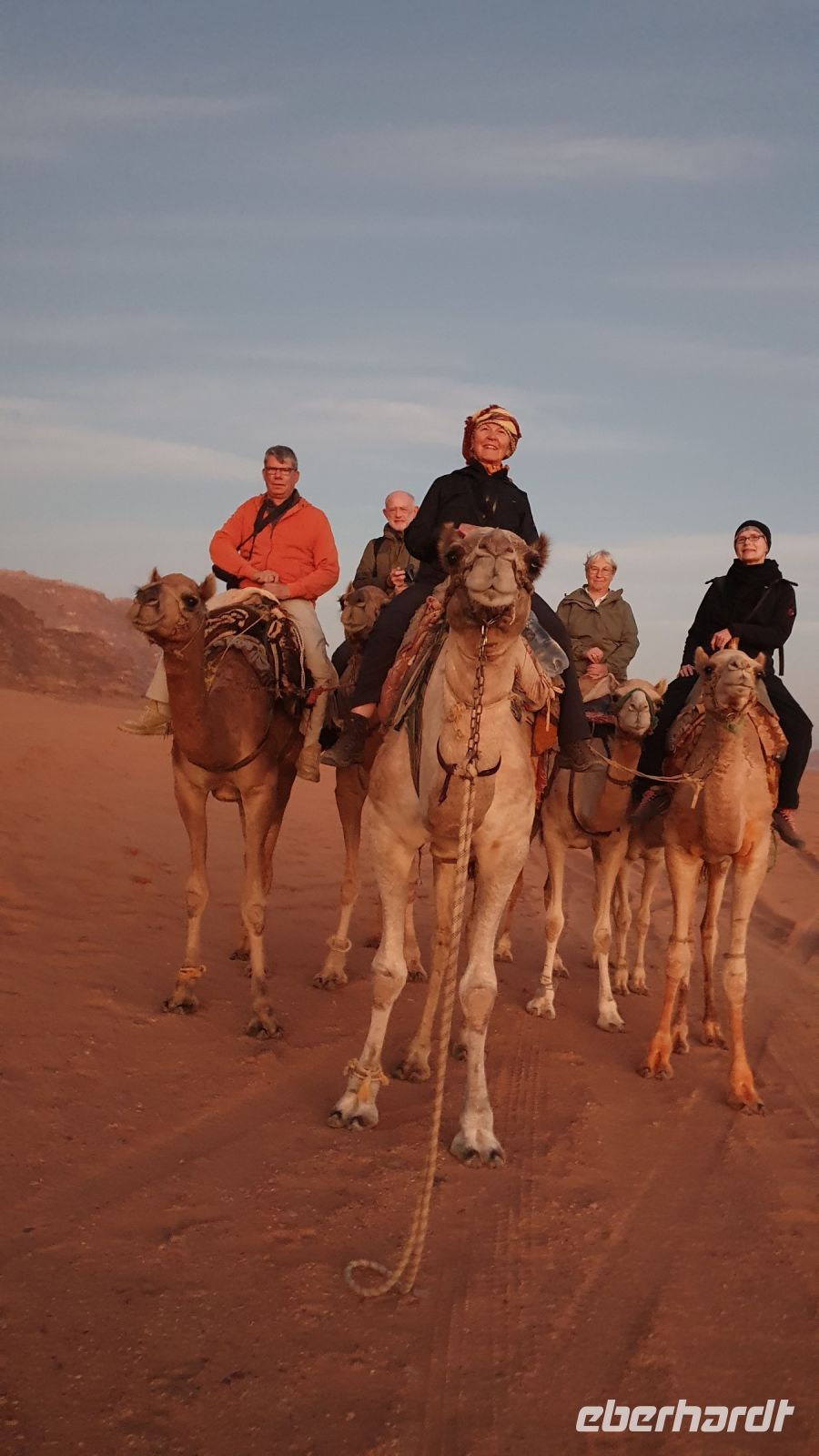 Der Wecker klingelte sehr sehr früh und bereits 6 Uhr trafen wir uns in der Dunkelheit vor dem Camp bei den Kamelen. In Gruppen immer mit einem Kamelführer ritten wir los in die Morgendämmerung. An einer exponierten Stelle stiegen wir ab und warteten auf den Sonnenaufgang. Derweil wurden viele Fotos geschossen und in einer Kamelgruppe war ein 3 Monate altes Babykamel mit dabei - der Star der Fotografen. Wir waren so beschäftigt mit den Tieren, dass der Sonnenaufgang in den Hintergrund trat. Glücklich und zufrieden waren wir alle und der Rückweg in der goldenen Morgensonne unvergesslich. Wir dankten unseren Kamelführern und begaben uns zum Frühstück im Camp. Dann wurden die letzten Sachen eingepackt, die Koffer im Bus verstaut und wir durften noch einmal die 3 Jeeps besteigen und durch die Wüste zum Lawrence House und zur großen Felsbrücke fahren. Dort wurde wieder viel fotografiert und einige aus unserer Gruppe kletterten sogar hinauf auf die Brücke. Dann fuhren wir zurück durch die Wüste und stiegen im Nichts aus. Weiter wanderten wir 2 Stunden durch den Wüstensand bis in die Zivilisation, wo uns der Busfahrer erwartete. Im Bus gab es frische jordanische Orangen und viel Wasser. Damit endete unser Ausflug im Wadi Rum und nun stand eine lange Rückfahrt bis zum Toten Meer an. Unterwegs machten wir einen Fotostopp beim Bahnhof Wadi Rum und eine Gesundheitspause an der Autobahn. Beim Hinabfahren zum Toten Meer konnten wir noch einmal den Sonnenuntergang beobachten und erreichten unser Holiday Inn Resort am Toten Meer bei Dunkelheit. Gleich nach dem Checkin gingen wir zum Abendessen. Es gab ein überaus reichliches Buffet, aber auch einen gewaltigen Schallpegel im Restaurant. Das waren wir nicht mehr gewöhnt, nach der absoluten Ruhe im Wüstencamp.