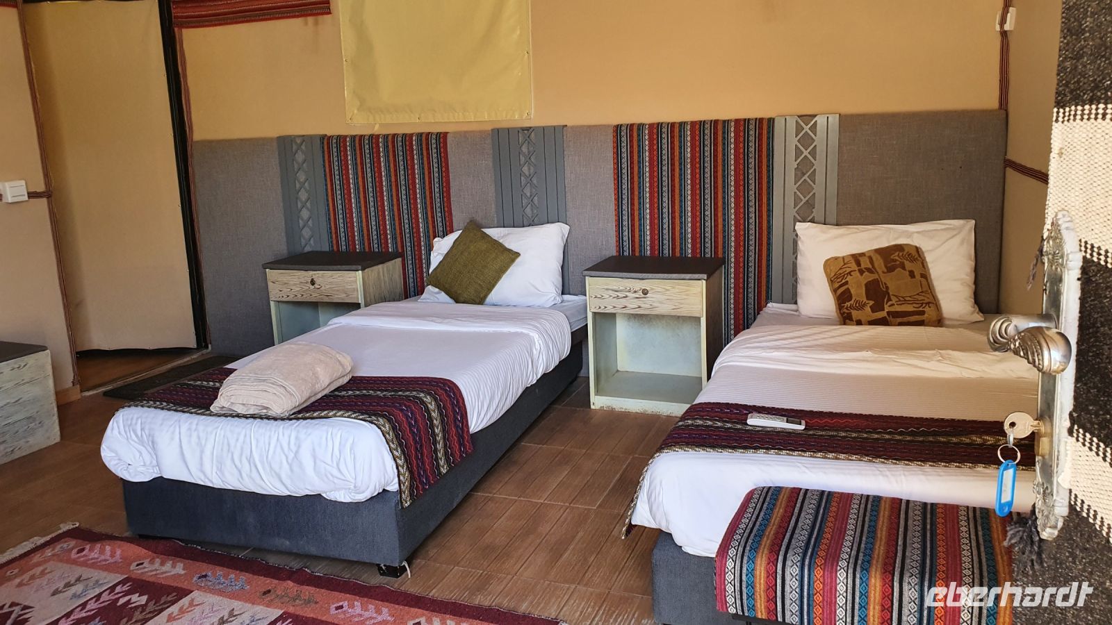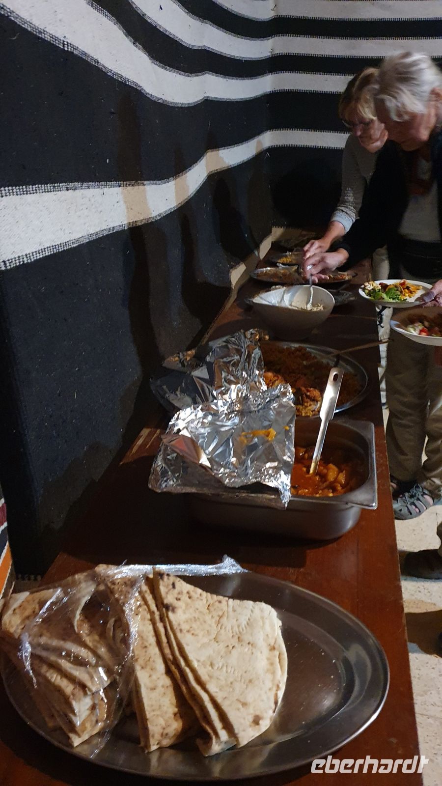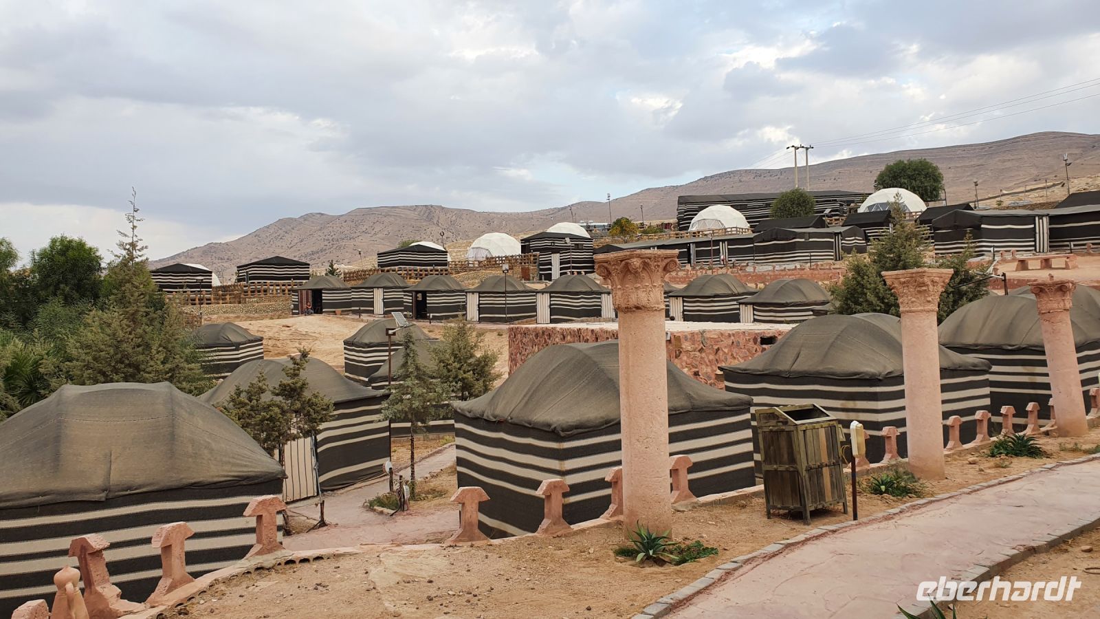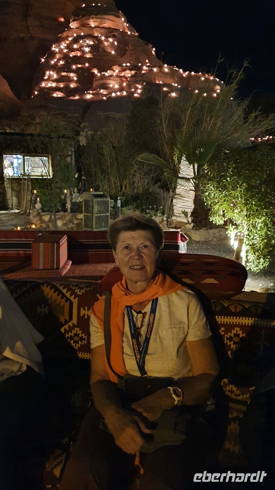 Gegen 16 Uhr erreichten wir unsere nächste Zeltunterkunft im Seven Wonders Beduin Camp in Klein Petra. Hier war es schon etwas komfortabler. Im Zelt standen Betten und es gab immer Strom und auch WLAN. Wir trafen uns noch vor dem Abendessen in gemütlicher Runde am Feuer und konnten zuschauen, wie die vielen Lichter am Felsen zu leuchten begannen. Allerdings leuchteten auch die ersten Blitze am Himmel und es begann zu grollen. So begaben wir uns flink ins Zelt zum Abendessen und genossen das große Angebot an Speisen. Draußen ging derweil Starkregen nieder und so blieben wir etwas länger sitzen beim Abendessen.