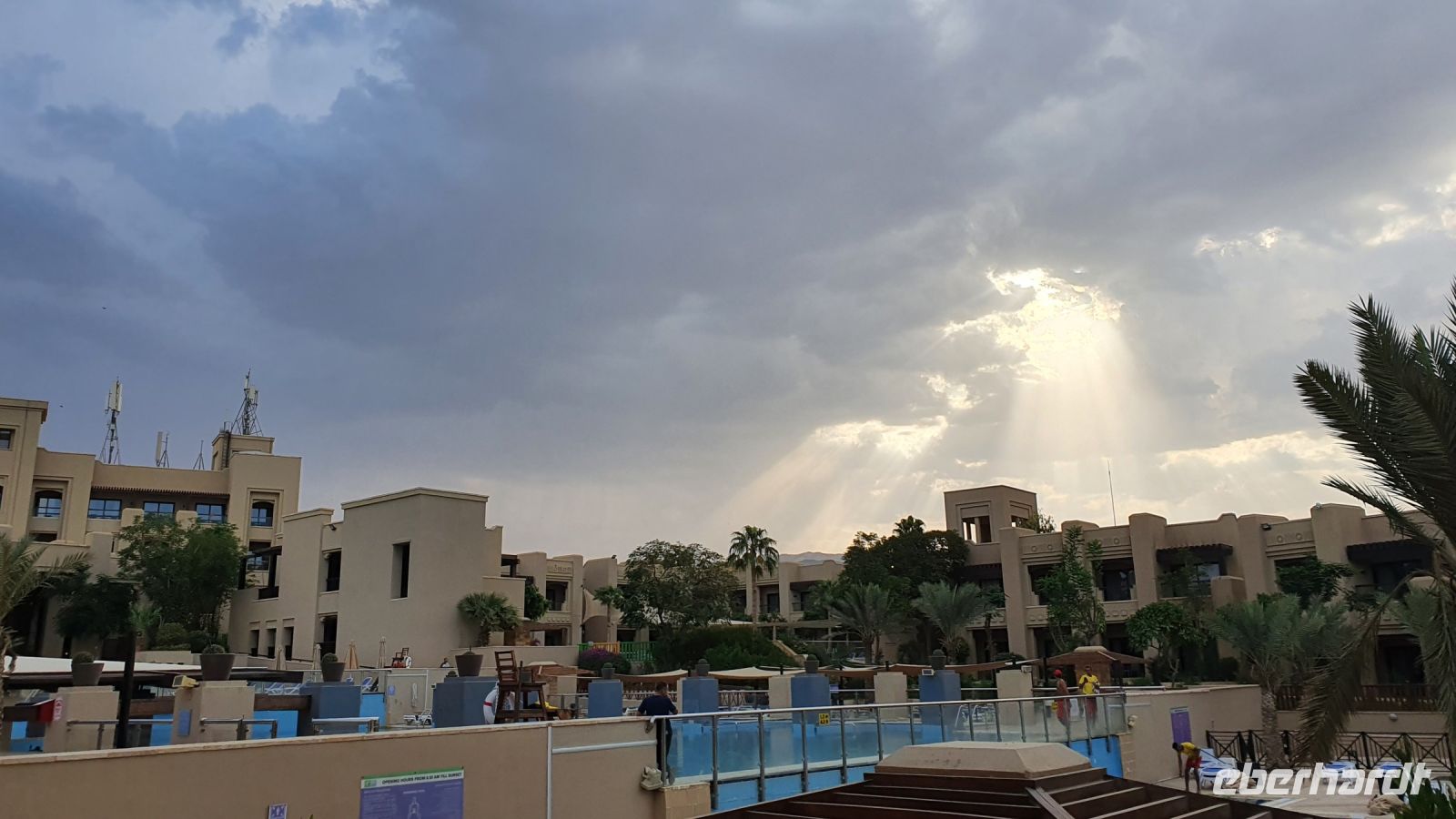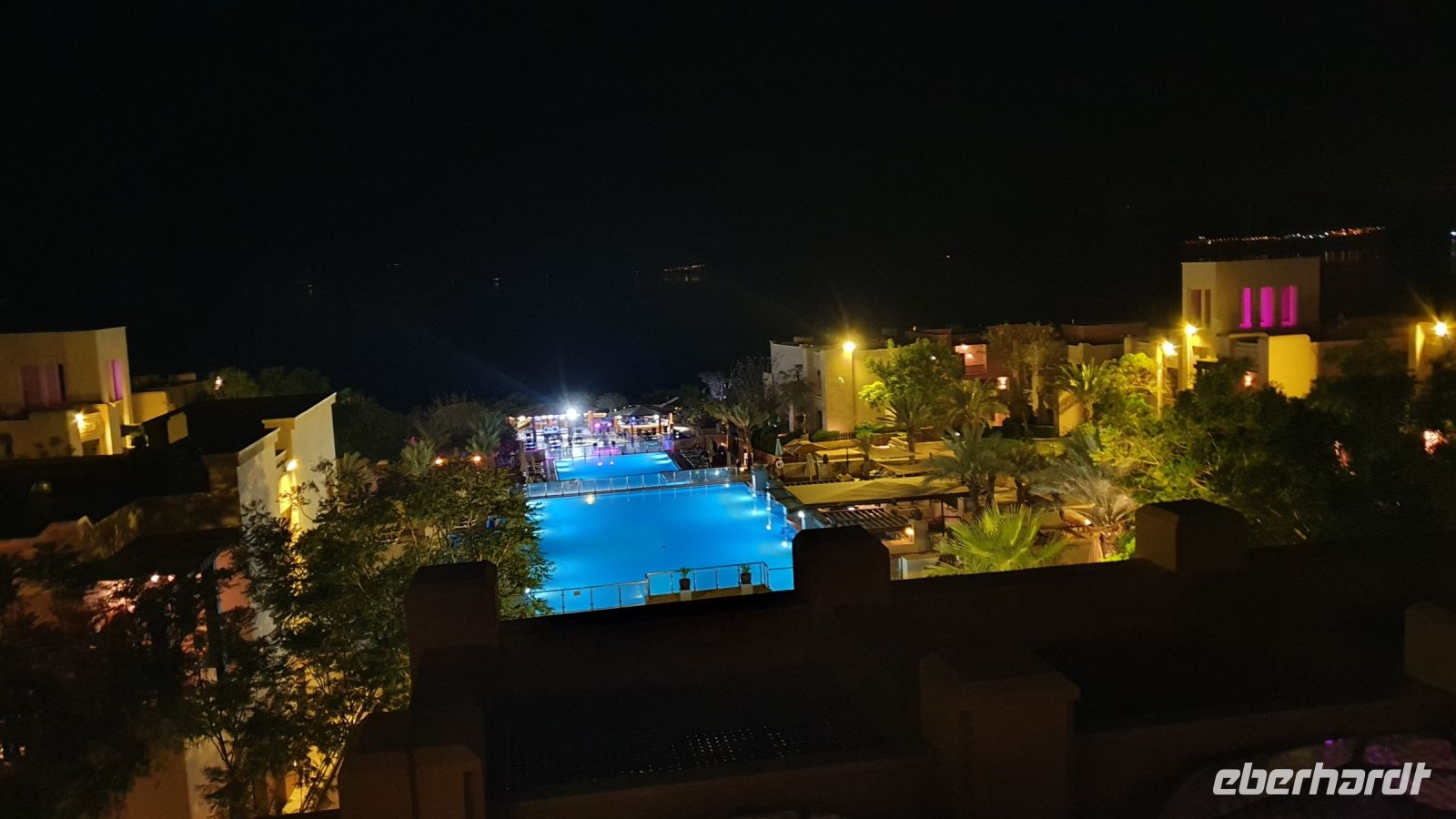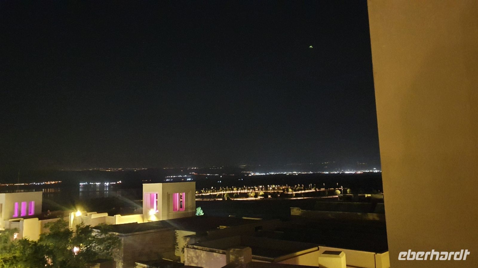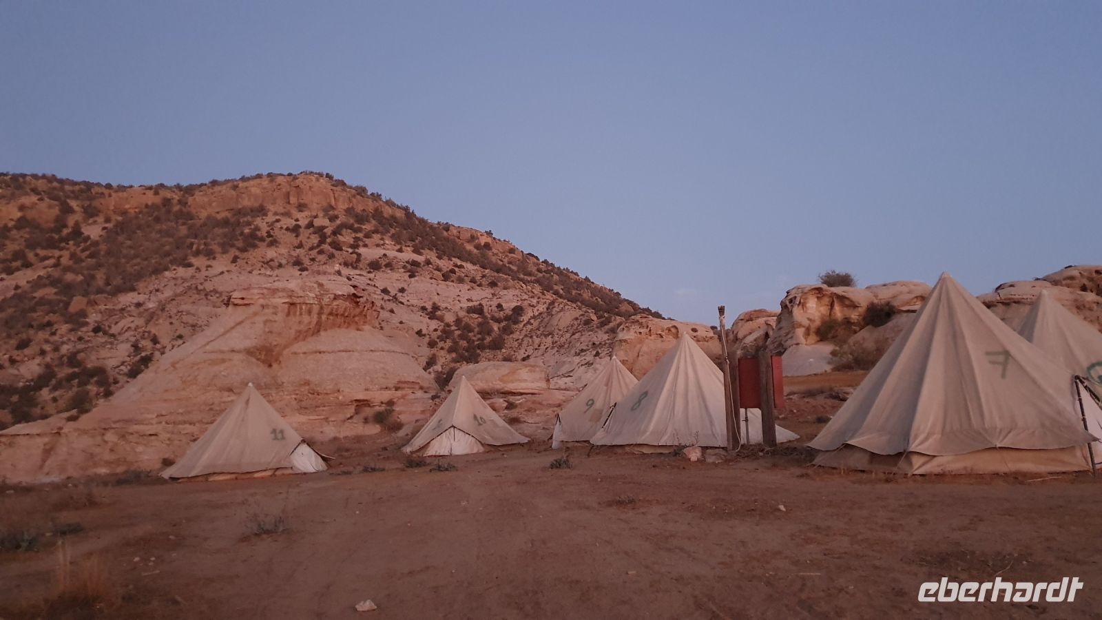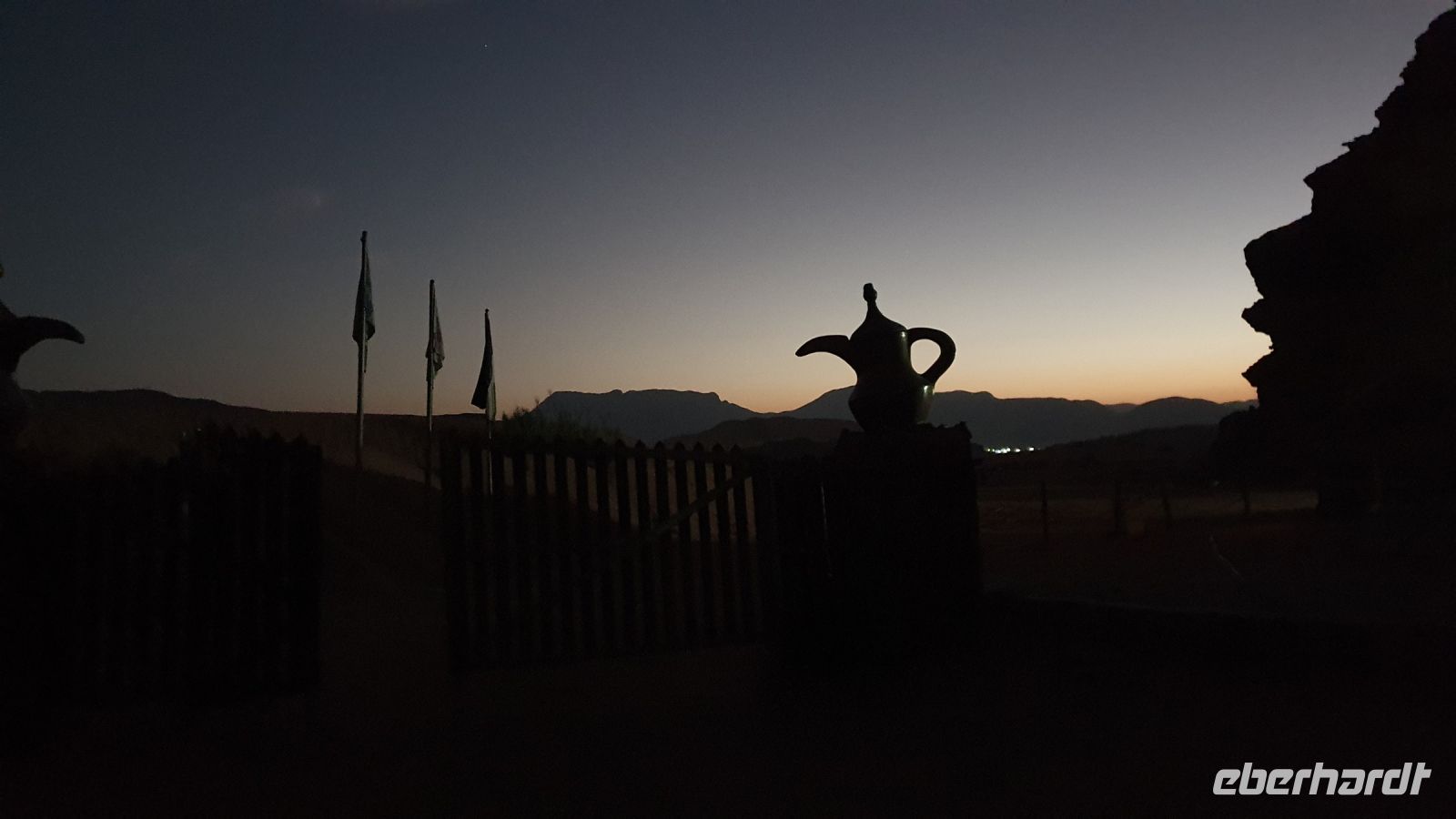 Gegen 16 Uhr erreichten wir unsere nächste Zeltunterkunft im Seven Wonders Beduin Camp in Klein Petra. Hier war es schon etwas komfortabler. Im Zelt standen Betten und es gab immer Strom und auch WLAN. Wir trafen uns noch vor dem Abendessen in gemütlicher Runde am Feuer und konnten zuschauen, wie die vielen Lichter am Felsen zu leuchten begannen. Allerdings leuchteten auch die ersten Blitze am Himmel und es begann zu grollen. So begaben wir uns flink ins Zelt zum Abendessen und genossen das große Angebot an Speisen. Draußen ging derweil Starkregen nieder und so blieben wir etwas länger sitzen beim Abendessen.