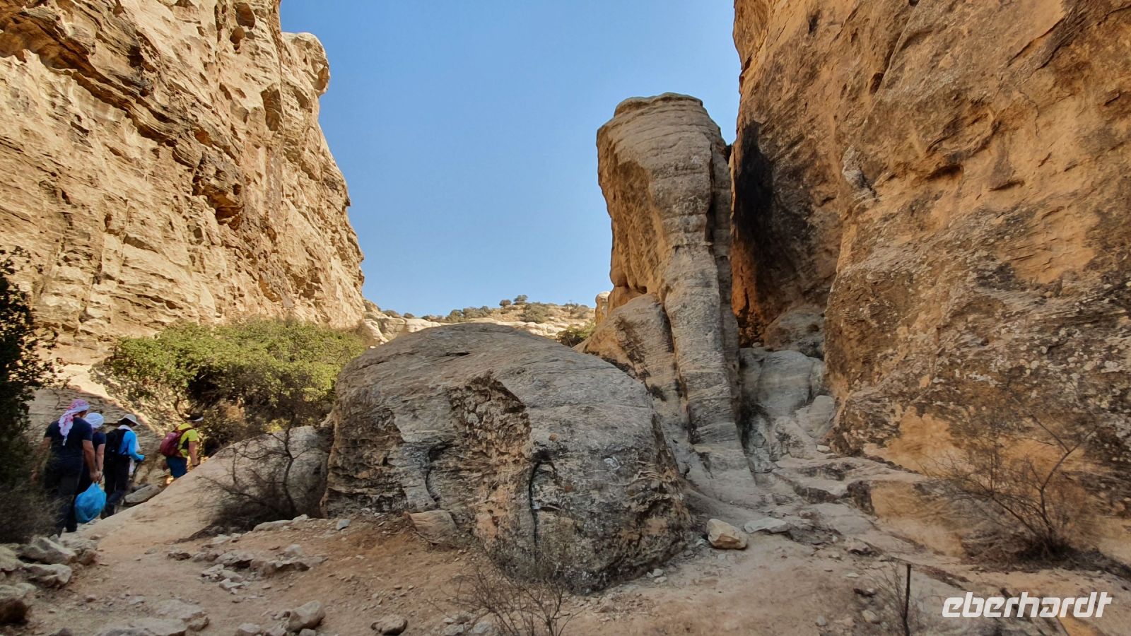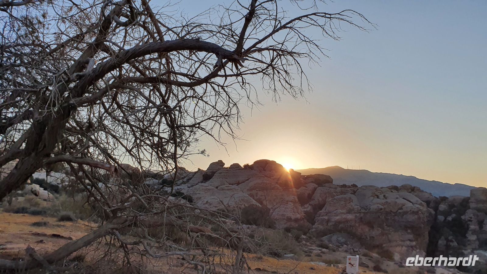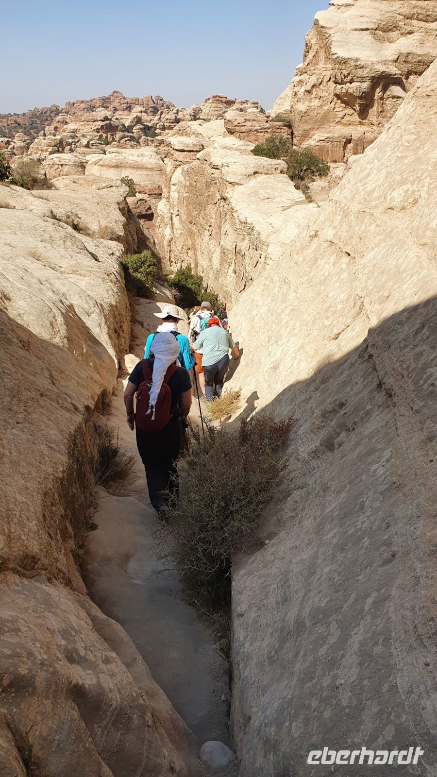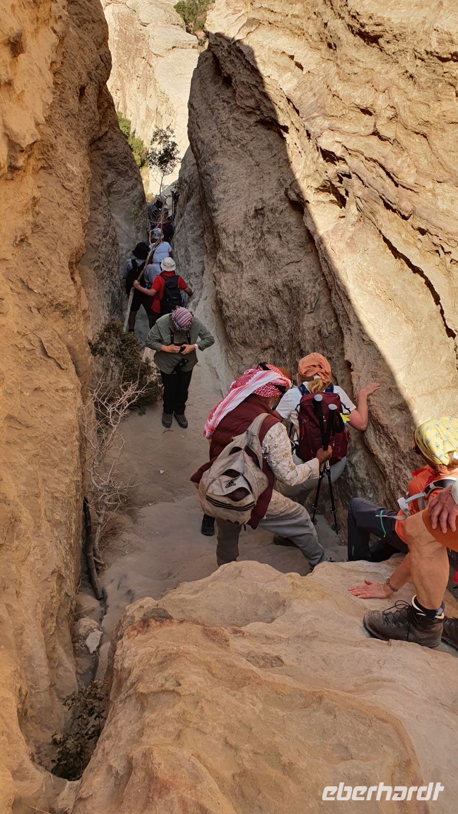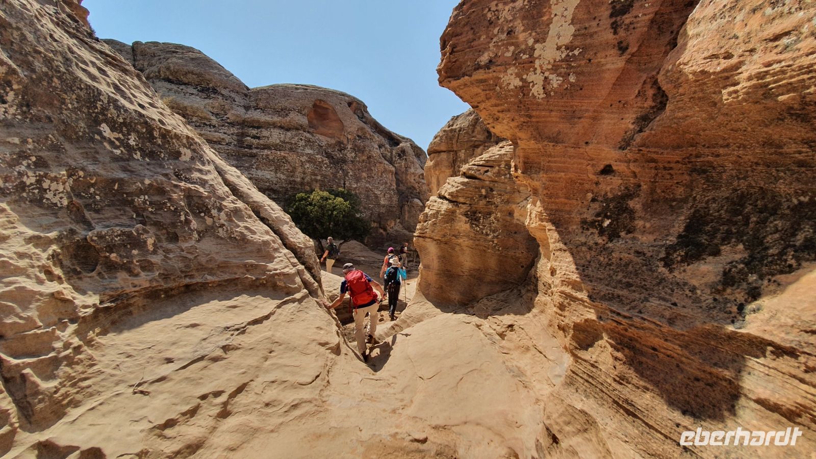 Noch vor Sonnenaufgang krabbelte jeder aus seinem Zelt, um diese wunderbare Morgenstimmung zu genießen. Wir liefen bis zur Kante des Plateaus und sahen in eine zauberhafte Felsenlandschaft, die noch in der Morgendämmerung lag. Wir waren fast die einzigen Gäste im Zelt Camp und konnten diese unglaubliche Stille auf uns wirken lassen. Mit der aufgehenden Sonne wurde die Felsenlandschaft "vergoldet" und immer mehr Details sichtbar. Überglücklich gingen wir zum Frühstück und stärkten uns für die anstehende Wanderung. Wir hatten uns in Absprache mit Hussein für den Shaq Al-Reesh Trail entschieden, der oberhalb des Dorfes Dana begann. Der Shuttle brachte uns hinauf zum Bus und unser Fahrer wieder auf dieser schmalen Strasse bis zur Hauptstrasse und nach Dana. Dort kam ein Beduine als Wanderbegleiter dazu und er berichtete Wissenswertes über die Nutzung der Pflanzen und Kräuter und er fand auch unter einem Stein den gelben, recht giftigen Skorpion für uns zum Anschauen. Der Trail führte bergab durch verschiedene Felsenschluchten auf teils abenteuerlichen Wegen. An den Schlüsselstellen halfen wir uns gegenseitig und hatten viel Spass auf der Wanderung durch diese fantastische Felsenwelt. An einer geschützten Stelle wurde Tee für uns gekocht und dann führte der Weg durch die Felsen wieder nach oben zur Strasse. Am Ende der Wanderung durften wir ein reichliches Picknick genießen mit Blick über die von uns bewanderte Felsenwelt. Auf der Rückfahrt machte Hussein für uns einen kleinen Umweg und zeigte uns das Ein-Zimmer-Hotel in einem Pkw sowie die Kreuzritterburg Shawbak.