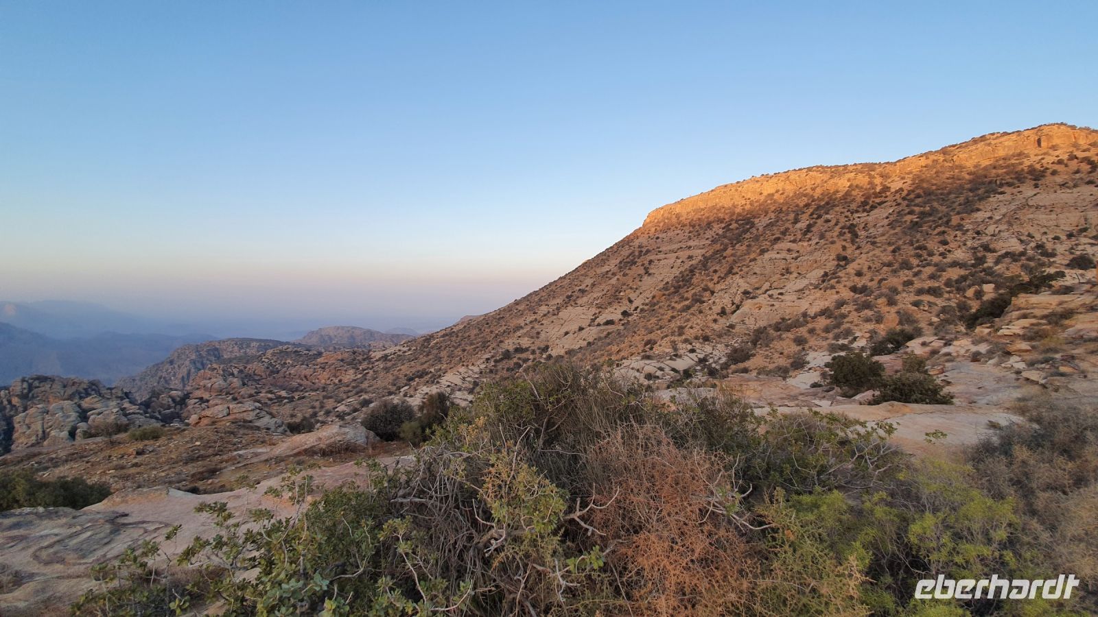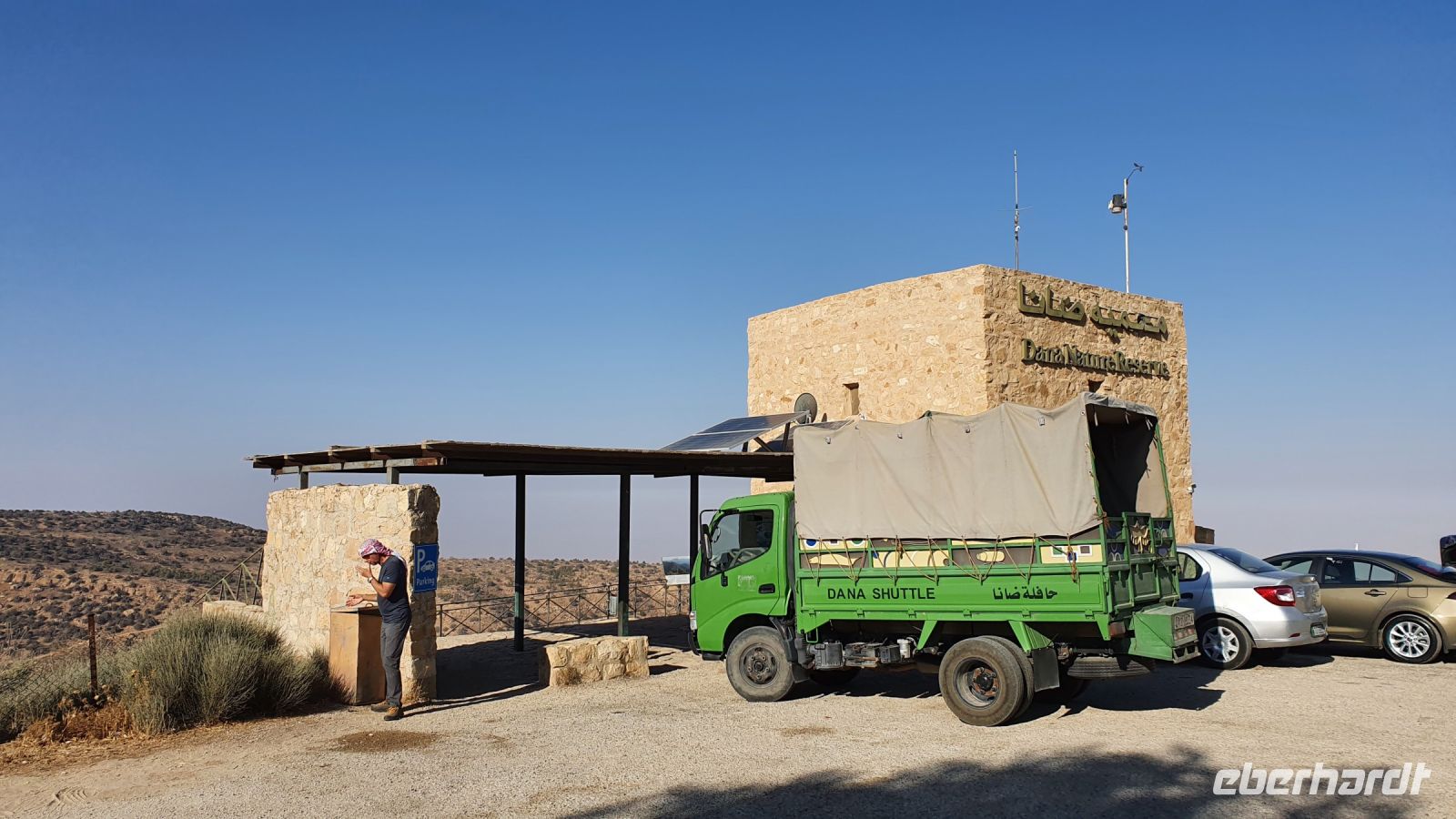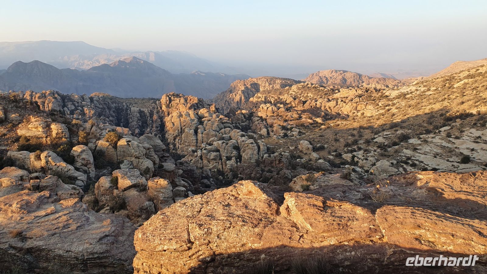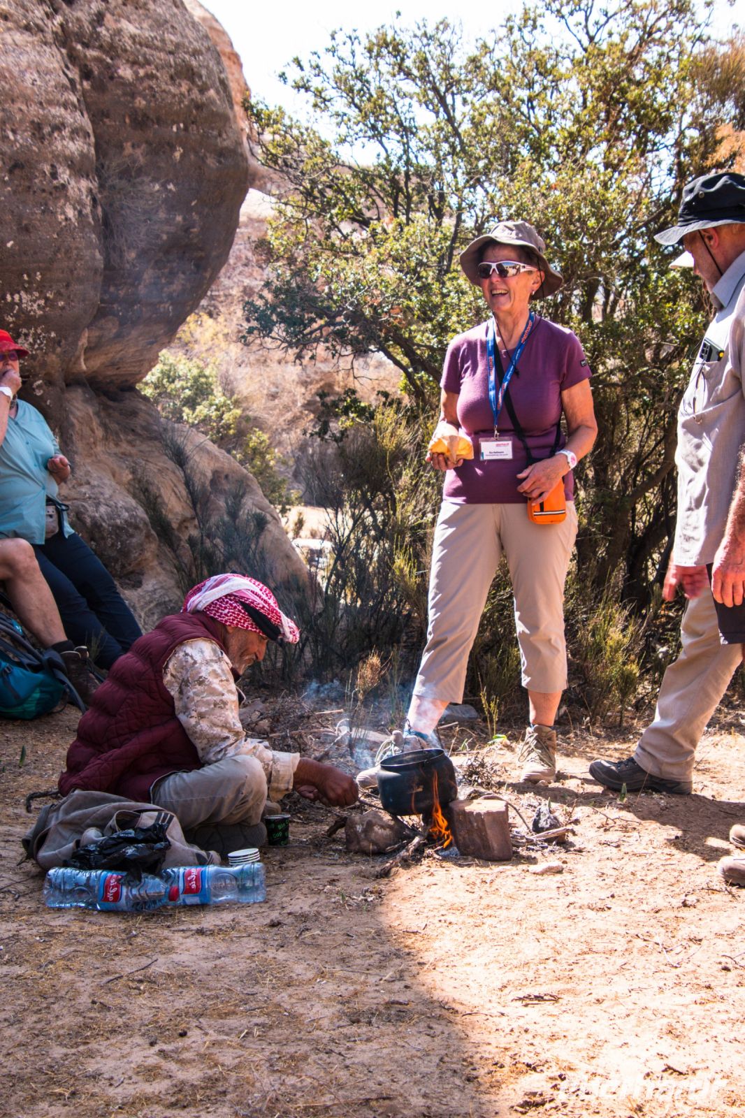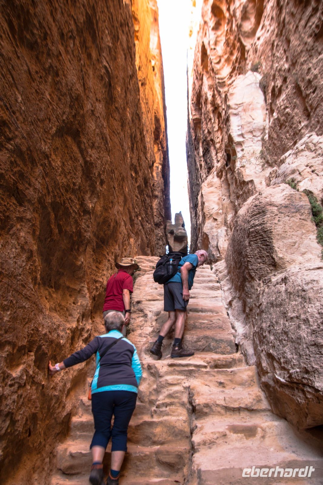Noch vor Sonnenaufgang krabbelte jeder aus seinem Zelt, um diese wunderbare Morgenstimmung zu genießen. Wir liefen bis zur Kante des Plateaus und sahen in eine zauberhafte Felsenlandschaft, die noch in der Morgendämmerung lag. Wir waren fast die einzigen Gäste im Zelt Camp und konnten diese unglaubliche Stille auf uns wirken lassen. Mit der aufgehenden Sonne wurde die Felsenlandschaft "vergoldet" und immer mehr Details sichtbar. Überglücklich gingen wir zum Frühstück und stärkten uns für die anstehende Wanderung. Wir hatten uns in Absprache mit Hussein für den Shaq Al-Reesh Trail entschieden, der oberhalb des Dorfes Dana begann. Der Shuttle brachte uns hinauf zum Bus und unser Fahrer wieder auf dieser schmalen Strasse bis zur Hauptstrasse und nach Dana. Dort kam ein Beduine als Wanderbegleiter dazu und er berichtete Wissenswertes über die Nutzung der Pflanzen und Kräuter und er fand auch unter einem Stein den gelben, recht giftigen Skorpion für uns zum Anschauen. Der Trail führte bergab durch verschiedene Felsenschluchten auf teils abenteuerlichen Wegen. An den Schlüsselstellen halfen wir uns gegenseitig und hatten viel Spass auf der Wanderung durch diese fantastische Felsenwelt. An einer geschützten Stelle wurde Tee für uns gekocht und dann führte der Weg durch die Felsen wieder nach oben zur Strasse. Am Ende der Wanderung durften wir ein reichliches Picknick genießen mit Blick über die von uns bewanderte Felsenwelt. Auf der Rückfahrt machte Hussein für uns einen kleinen Umweg und zeigte uns das Ein-Zimmer-Hotel in einem Pkw sowie die Kreuzritterburg Shawbak.
