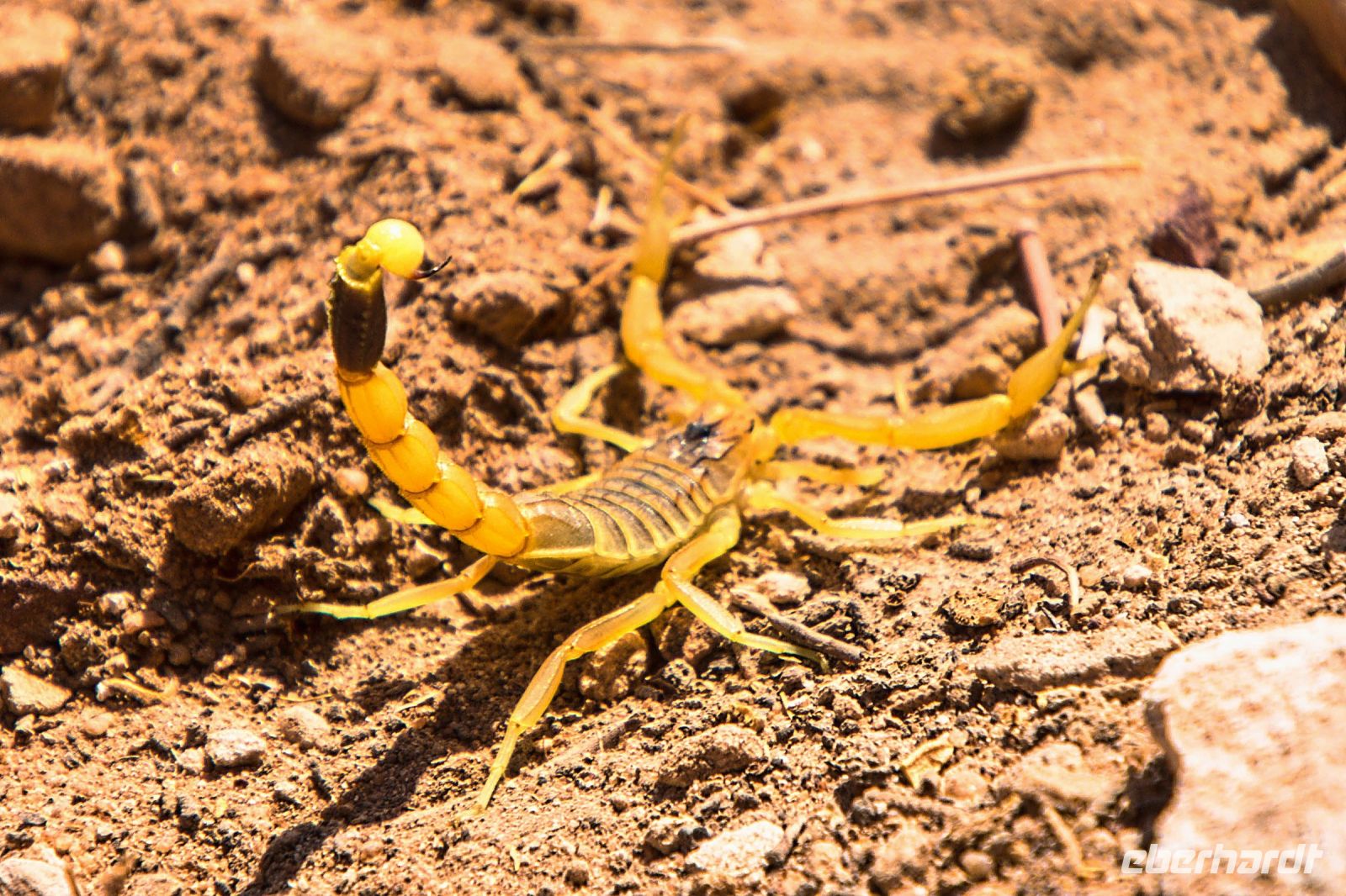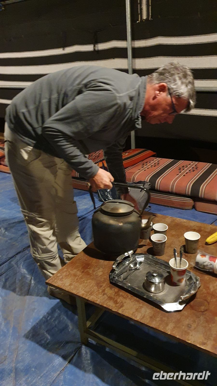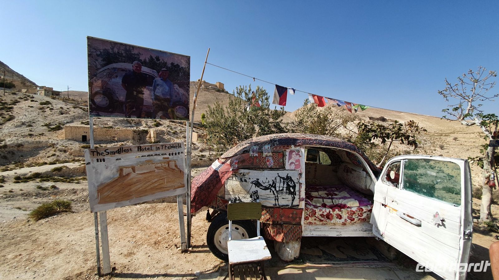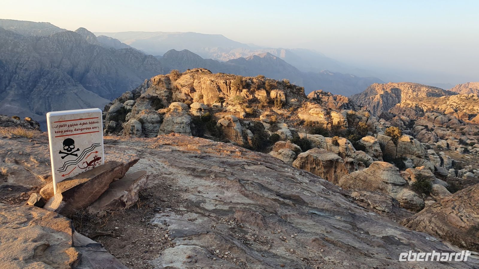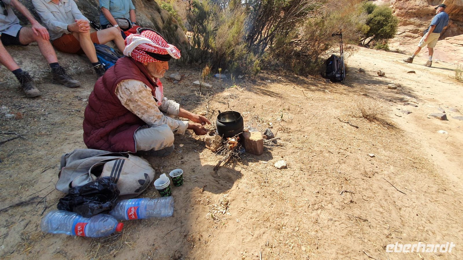 Noch vor Sonnenaufgang krabbelte jeder aus seinem Zelt, um diese wunderbare Morgenstimmung zu genießen. Wir liefen bis zur Kante des Plateaus und sahen in eine zauberhafte Felsenlandschaft, die noch in der Morgendämmerung lag. Wir waren fast die einzigen Gäste im Zelt Camp und konnten diese unglaubliche Stille auf uns wirken lassen. Mit der aufgehenden Sonne wurde die Felsenlandschaft "vergoldet" und immer mehr Details sichtbar. Überglücklich gingen wir zum Frühstück und stärkten uns für die anstehende Wanderung. Wir hatten uns in Absprache mit Hussein für den Shaq Al-Reesh Trail entschieden, der oberhalb des Dorfes Dana begann. Der Shuttle brachte uns hinauf zum Bus und unser Fahrer wieder auf dieser schmalen Strasse bis zur Hauptstrasse und nach Dana. Dort kam ein Beduine als Wanderbegleiter dazu und er berichtete Wissenswertes über die Nutzung der Pflanzen und Kräuter und er fand auch unter einem Stein den gelben, recht giftigen Skorpion für uns zum Anschauen. Der Trail führte bergab durch verschiedene Felsenschluchten auf teils abenteuerlichen Wegen. An den Schlüsselstellen halfen wir uns gegenseitig und hatten viel Spass auf der Wanderung durch diese fantastische Felsenwelt. An einer geschützten Stelle wurde Tee für uns gekocht und dann führte der Weg durch die Felsen wieder nach oben zur Strasse. Am Ende der Wanderung durften wir ein reichliches Picknick genießen mit Blick über die von uns bewanderte Felsenwelt. Auf der Rückfahrt machte Hussein für uns einen kleinen Umweg und zeigte uns das Ein-Zimmer-Hotel in einem Pkw sowie die Kreuzritterburg Shawbak.