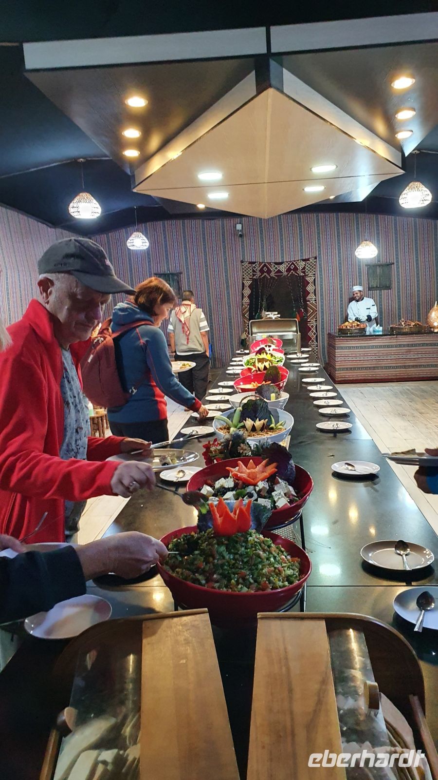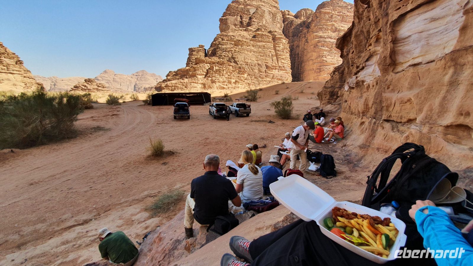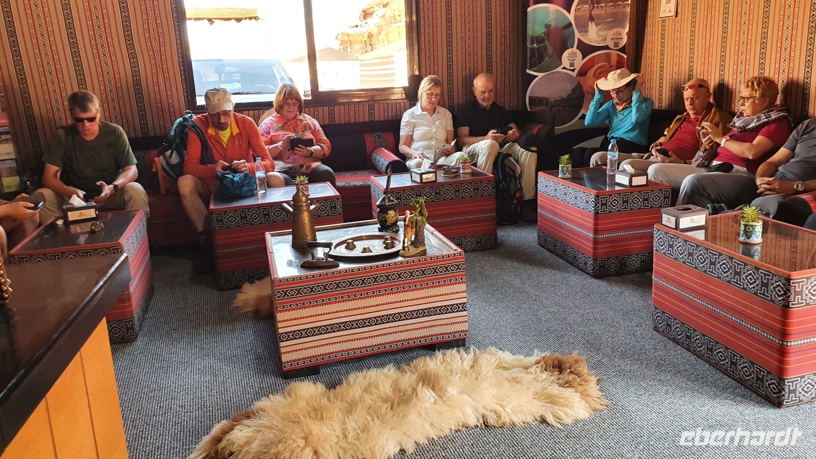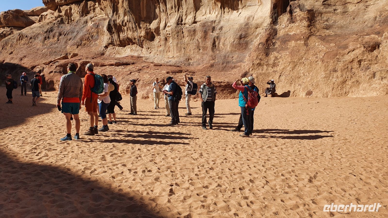 Heute ging es früher los, den wir wollten noch die Besichtigung von Klein Petra nachholen. Wir fuhren durch das Dorf der Beduinen, welches eigens vom Staat für alle die Familien errichete wurde, die bis 1985 in den Gräbern von Petra lebten. Die Sicht war grandios und der Jebel Aron zum Greifen nahe. In Klein Petra war es in den Morgenstunden noch recht ruhig und so konnten wir den Rundgang ausgiebig geniessen. Für die Nabatäer war Klein Petra das wirtschaftliche Zentrum. Hier wurden die Steuern eingenommen und Waren gelagert. Nach der Besichtigung fuhren wir zurück, durch Petra hindurch auf die Königsstrasse und von oben konnten wir bei einem Fotostopp noch einmal das gesamte Gebiet von Petra betrachten. Gegen Mittag erreichten wir das Visitor Center im Wadi Rum und konnten nach einer kurzen Einkaufspause mit unserem großen Bus sogar bis zu unserem Rahayeb Desert Camp fahren. Das sparte uns viel Zeit und so begaben wir uns nach dem checkin und dem Beziehen unserer komfortablen Zelte auf die erste Jeeptour. Beim ersten Stopp bekam jeder eine Lunchbox und auf einem Felsen genossen wir das reichliche Picknick mit Blick in die Wüste. Gut gestärkt fuhren wir mit unseren 3 Jeeps weiter durch die zauberhafte Felsenlandschaft des Wadi Rum. Höhepunkt war das Felsental Burra Canyons. Auf dem Rückweg kehrten wir zu einer Teepause ein. Von unserem Camp begaben wir uns dann zu Fuss durch die Wüste zu einem Felsen, wo wir von oben den Sonnenuntergang erleben durften. Nach 2 stündiger Wanderung kamen wir bei Dunkelheit wieder in unserem Camp an und konnten sogleich beobachten, wie unser Abendessen nach 3stündiger Garzeit aus dem heissen Erdloch gehoben wurde. Im Zelt durften wir dann ein fantastisches Buffet mit verschiedenen Salaten und dem Reis, dem Hühnerfleisch und dem Lammfleisch aus dem Erdloch probieren. Das Fleisch war butterweich und schmeckte hervorragend. Nach dem Abendessen unter dem Sternenhimmel bezahlten wir unseren Kamelritt für den Folgetag und genossen ausserhalb des Camps den Sternenhimmel.