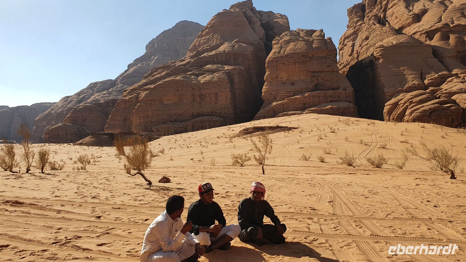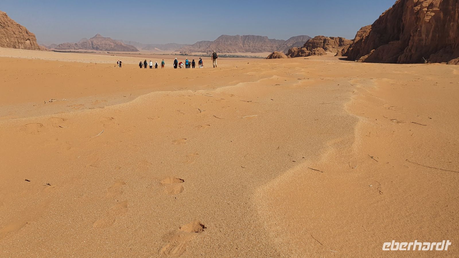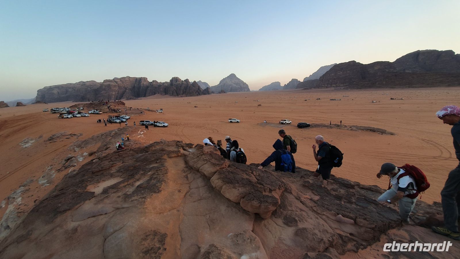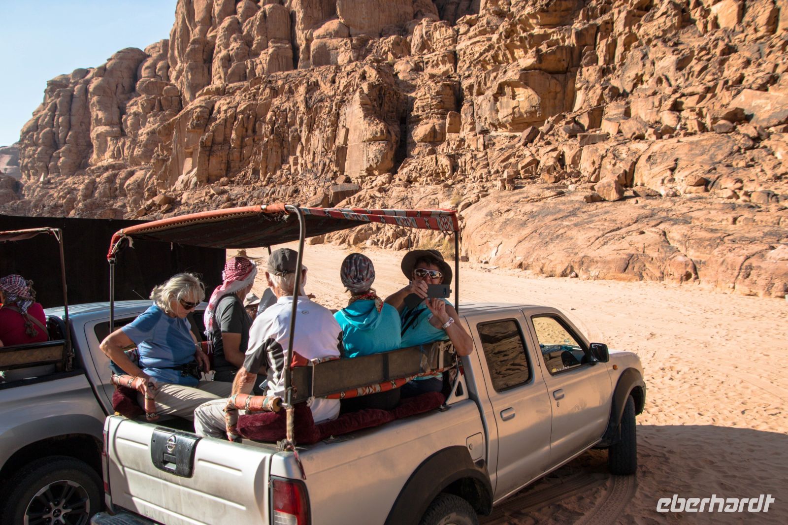 Heute ging es früher los, den wir wollten noch die Besichtigung von Klein Petra nachholen. Wir fuhren durch das Dorf der Beduinen, welches eigens vom Staat für alle die Familien errichete wurde, die bis 1985 in den Gräbern von Petra lebten. Die Sicht war grandios und der Jebel Aron zum Greifen nahe. In Klein Petra war es in den Morgenstunden noch recht ruhig und so konnten wir den Rundgang ausgiebig geniessen. Für die Nabatäer war Klein Petra das wirtschaftliche Zentrum. Hier wurden die Steuern eingenommen und Waren gelagert. Nach der Besichtigung fuhren wir zurück, durch Petra hindurch auf die Königsstrasse und von oben konnten wir bei einem Fotostopp noch einmal das gesamte Gebiet von Petra betrachten. Gegen Mittag erreichten wir das Visitor Center im Wadi Rum und konnten nach einer kurzen Einkaufspause mit unserem großen Bus sogar bis zu unserem Rahayeb Desert Camp fahren. Das sparte uns viel Zeit und so begaben wir uns nach dem checkin und dem Beziehen unserer komfortablen Zelte auf die erste Jeeptour. Beim ersten Stopp bekam jeder eine Lunchbox und auf einem Felsen genossen wir das reichliche Picknick mit Blick in die Wüste. Gut gestärkt fuhren wir mit unseren 3 Jeeps weiter durch die zauberhafte Felsenlandschaft des Wadi Rum. Höhepunkt war das Felsental Burra Canyons. Auf dem Rückweg kehrten wir zu einer Teepause ein. Von unserem Camp begaben wir uns dann zu Fuss durch die Wüste zu einem Felsen, wo wir von oben den Sonnenuntergang erleben durften. Nach 2 stündiger Wanderung kamen wir bei Dunkelheit wieder in unserem Camp an und konnten sogleich beobachten, wie unser Abendessen nach 3stündiger Garzeit aus dem heissen Erdloch gehoben wurde. Im Zelt durften wir dann ein fantastisches Buffet mit verschiedenen Salaten und dem Reis, dem Hühnerfleisch und dem Lammfleisch aus dem Erdloch probieren. Das Fleisch war butterweich und schmeckte hervorragend. Nach dem Abendessen unter dem Sternenhimmel bezahlten wir unseren Kamelritt für den Folgetag und genossen ausserhalb des Camps den Sternenhimmel.