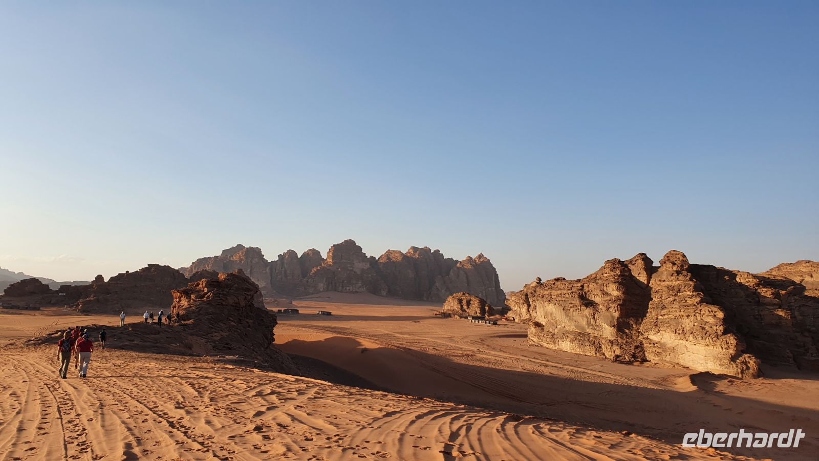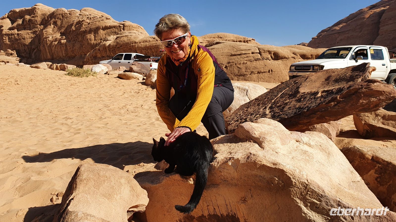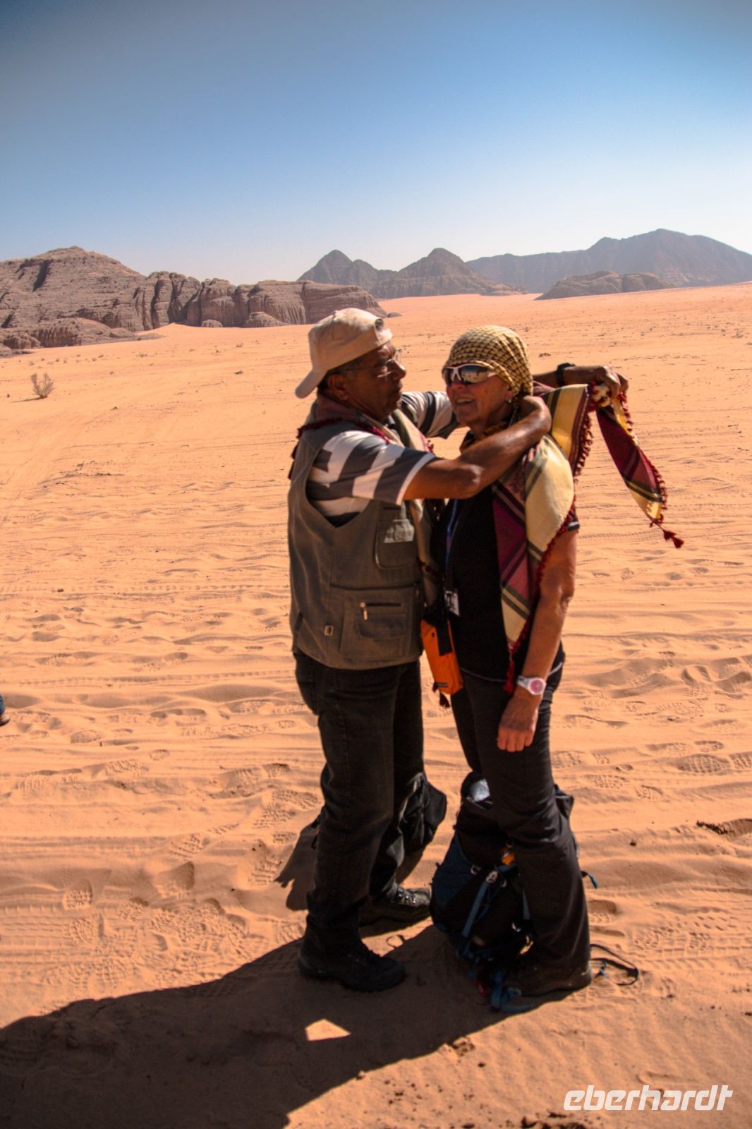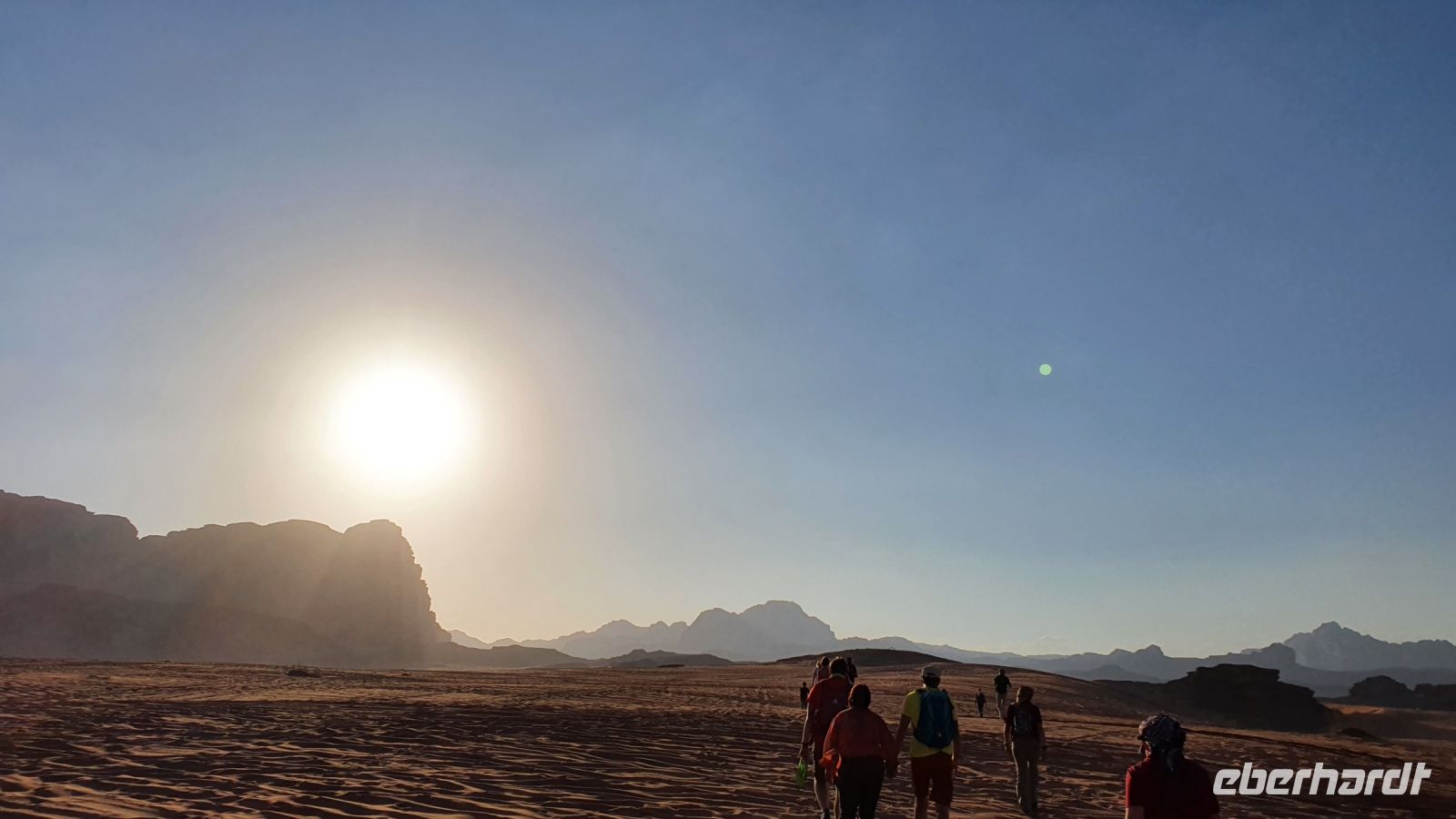 Heute ging es früher los, den wir wollten noch die Besichtigung von Klein Petra nachholen. Wir fuhren durch das Dorf der Beduinen, welches eigens vom Staat für alle die Familien errichete wurde, die bis 1985 in den Gräbern von Petra lebten. Die Sicht war grandios und der Jebel Aron zum Greifen nahe. In Klein Petra war es in den Morgenstunden noch recht ruhig und so konnten wir den Rundgang ausgiebig geniessen. Für die Nabatäer war Klein Petra das wirtschaftliche Zentrum. Hier wurden die Steuern eingenommen und Waren gelagert. Nach der Besichtigung fuhren wir zurück, durch Petra hindurch auf die Königsstrasse und von oben konnten wir bei einem Fotostopp noch einmal das gesamte Gebiet von Petra betrachten. Gegen Mittag erreichten wir das Visitor Center im Wadi Rum und konnten nach einer kurzen Einkaufspause mit unserem großen Bus sogar bis zu unserem Rahayeb Desert Camp fahren. Das sparte uns viel Zeit und so begaben wir uns nach dem checkin und dem Beziehen unserer komfortablen Zelte auf die erste Jeeptour. Beim ersten Stopp bekam jeder eine Lunchbox und auf einem Felsen genossen wir das reichliche Picknick mit Blick in die Wüste. Gut gestärkt fuhren wir mit unseren 3 Jeeps weiter durch die zauberhafte Felsenlandschaft des Wadi Rum. Höhepunkt war das Felsental Burra Canyons. Auf dem Rückweg kehrten wir zu einer Teepause ein. Von unserem Camp begaben wir uns dann zu Fuss durch die Wüste zu einem Felsen, wo wir von oben den Sonnenuntergang erleben durften. Nach 2 stündiger Wanderung kamen wir bei Dunkelheit wieder in unserem Camp an und konnten sogleich beobachten, wie unser Abendessen nach 3stündiger Garzeit aus dem heissen Erdloch gehoben wurde. Im Zelt durften wir dann ein fantastisches Buffet mit verschiedenen Salaten und dem Reis, dem Hühnerfleisch und dem Lammfleisch aus dem Erdloch probieren. Das Fleisch war butterweich und schmeckte hervorragend. Nach dem Abendessen unter dem Sternenhimmel bezahlten wir unseren Kamelritt für den Folgetag und genossen ausserhalb des Camps den Sternenhimmel.