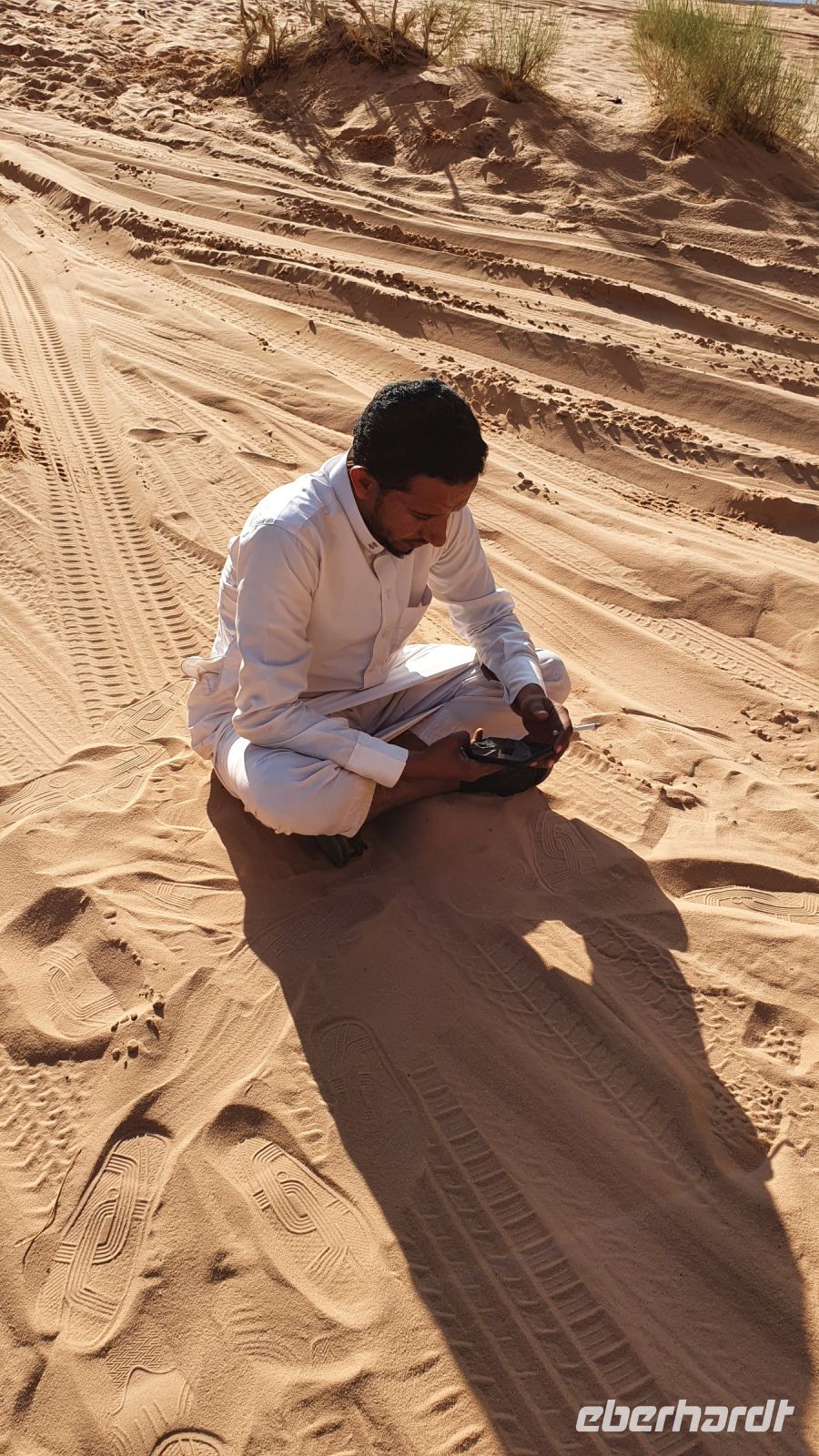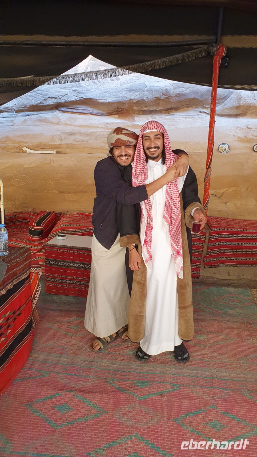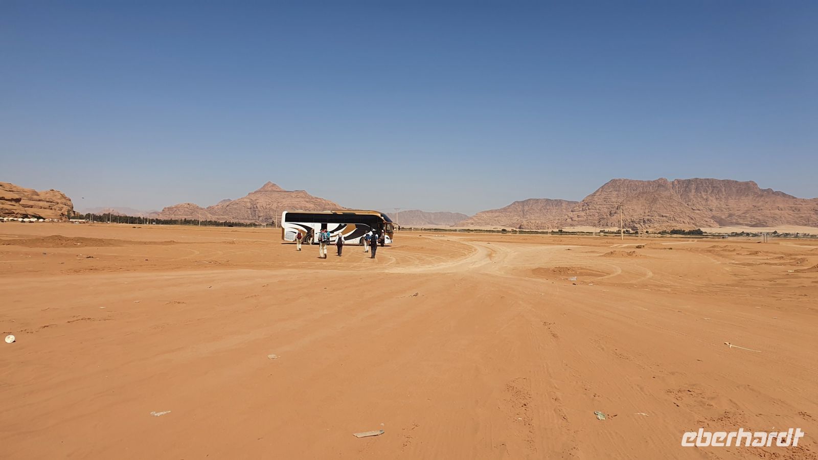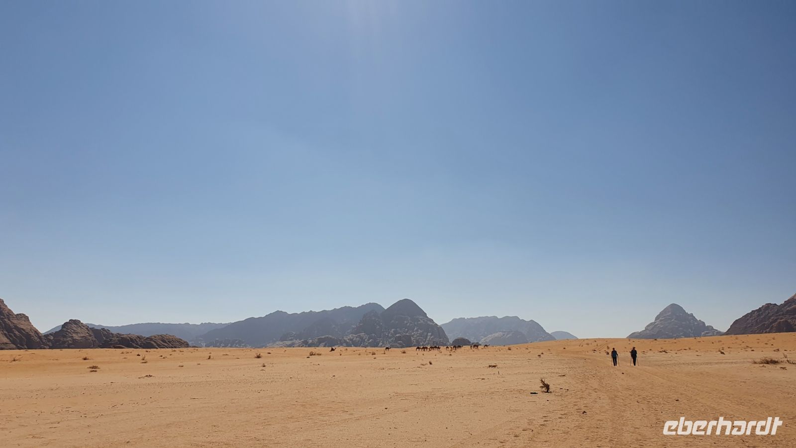 Heute ging es früher los, den wir wollten noch die Besichtigung von Klein Petra nachholen. Wir fuhren durch das Dorf der Beduinen, welches eigens vom Staat für alle die Familien errichete wurde, die bis 1985 in den Gräbern von Petra lebten. Die Sicht war grandios und der Jebel Aron zum Greifen nahe. In Klein Petra war es in den Morgenstunden noch recht ruhig und so konnten wir den Rundgang ausgiebig geniessen. Für die Nabatäer war Klein Petra das wirtschaftliche Zentrum. Hier wurden die Steuern eingenommen und Waren gelagert. Nach der Besichtigung fuhren wir zurück, durch Petra hindurch auf die Königsstrasse und von oben konnten wir bei einem Fotostopp noch einmal das gesamte Gebiet von Petra betrachten. Gegen Mittag erreichten wir das Visitor Center im Wadi Rum und konnten nach einer kurzen Einkaufspause mit unserem großen Bus sogar bis zu unserem Rahayeb Desert Camp fahren. Das sparte uns viel Zeit und so begaben wir uns nach dem checkin und dem Beziehen unserer komfortablen Zelte auf die erste Jeeptour. Beim ersten Stopp bekam jeder eine Lunchbox und auf einem Felsen genossen wir das reichliche Picknick mit Blick in die Wüste. Gut gestärkt fuhren wir mit unseren 3 Jeeps weiter durch die zauberhafte Felsenlandschaft des Wadi Rum. Höhepunkt war das Felsental Burra Canyons. Auf dem Rückweg kehrten wir zu einer Teepause ein. Von unserem Camp begaben wir uns dann zu Fuss durch die Wüste zu einem Felsen, wo wir von oben den Sonnenuntergang erleben durften. Nach 2 stündiger Wanderung kamen wir bei Dunkelheit wieder in unserem Camp an und konnten sogleich beobachten, wie unser Abendessen nach 3stündiger Garzeit aus dem heissen Erdloch gehoben wurde. Im Zelt durften wir dann ein fantastisches Buffet mit verschiedenen Salaten und dem Reis, dem Hühnerfleisch und dem Lammfleisch aus dem Erdloch probieren. Das Fleisch war butterweich und schmeckte hervorragend. Nach dem Abendessen unter dem Sternenhimmel bezahlten wir unseren Kamelritt für den Folgetag und genossen ausserhalb des Camps den Sternenhimmel.