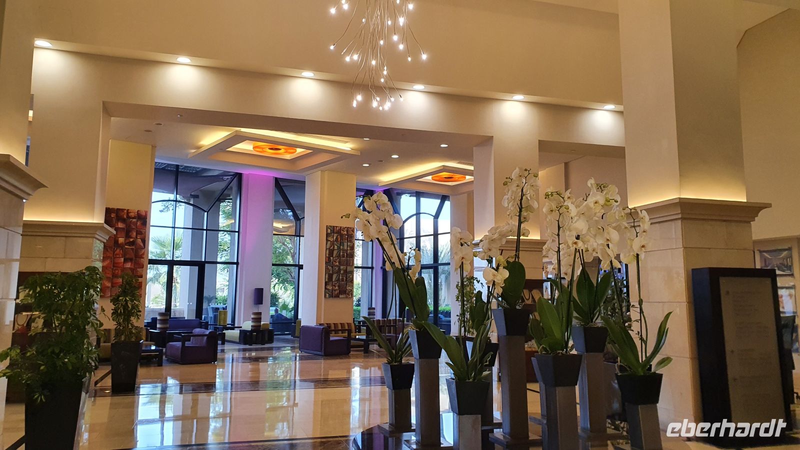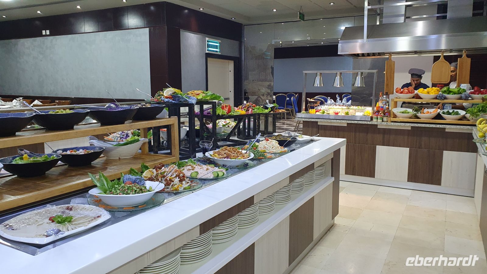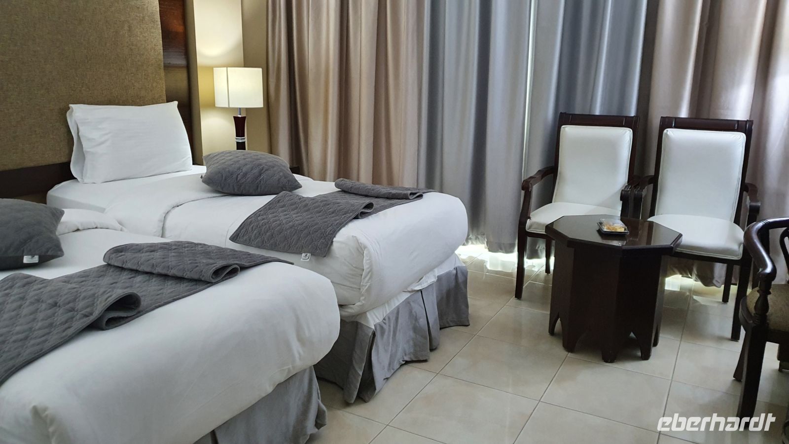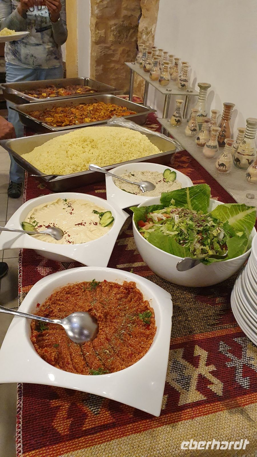 Für die Anreise nach Jordanien waren für unsere Wandergruppe Flüge mit Royal Jordanian von Berlin und Frankfurt gebucht und unsere beiden Flugzeuge sollten auch fast gleichzeitig landen. Wir von Berlin waren 30 Minuten früher da und die 4 Gäste aus Frankfurt 45 Minuten später. Also hieß es warten und sich schon mal miteinander bekannt machen. Am Flughafen in Amman wurden wir von einem Assistenten der Agentur La Beduina empfangen und er erledigte für uns alle Einreiseformularitäten. Dann endlich war unsere Gruppe komplett und wir trafen draussen unseren Reiseleiter Hussein und den Fahrer Hamad mit einem großen, geräumigen Bus. Die Fahrt ins Hotel dauerte ca. eine Stunde und dort bekamen wir sogar noch zu später Stunde ein Abendessen von einem reichhaltigen Buffet. Danach fielen wir todmüde in unsere Betten.