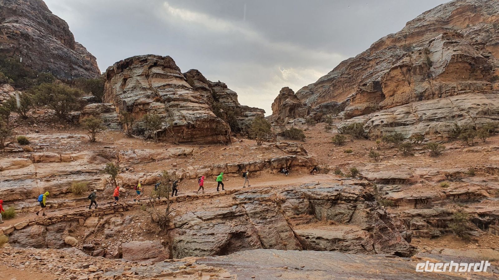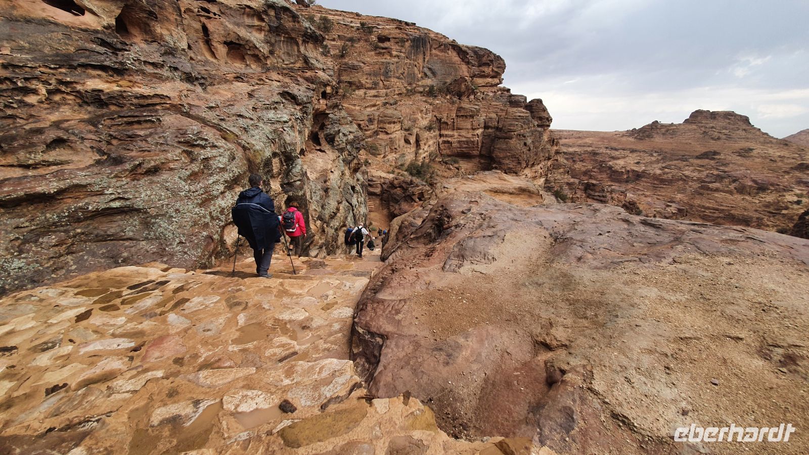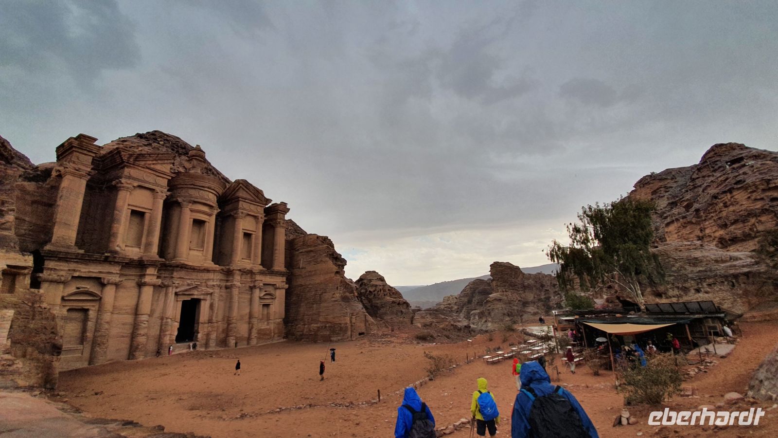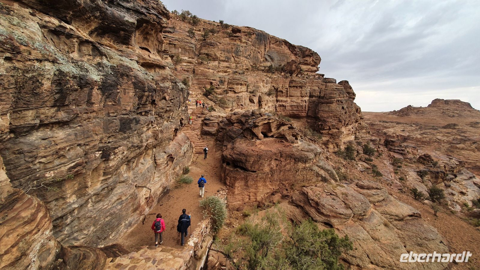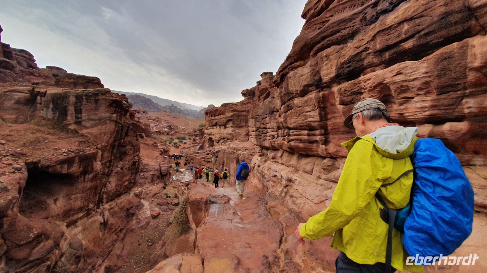 Nach dem Frühstück holten uns Hussein und Hamad im Camp ab und wir fuhren ein kurzes Stück mit dem Bus bis zum Eingang der Felsenschlucht von Klein Petra. Über Nacht hatte es immer wieder geregnet und auch am Morgen war der Himmel Wolken verhangen. Die Jordanier freuten sich über den ersten Regen des Jahres 2022 und wir hatten vorsichtshalber unsere Regenkleidung dabei. Unsere Wanderung begann ausserhalb von Klein Petra und führte zur Ausgrabungsstätte El Beidha. Nach einem kurzen Rundgang durch diese neolithische Siedlung, die vor ca. 7000 Jahren bewohnt war, wanderten wir auf einer breiten Piste um Klein Petra herum und kamen dann zu einem "Felsentor", wo der eigentliche Felsenweg begann. Bis dahin kann man neuerdings auch mit einem Shuttle gelangen und das hatte zur Folge, dass auf diesem neu hergerichteten Weg auch Wanderer unterwegs waren mit unzureichender Ausrüstung. Der Weg über viele Stufen treppauf und treppab ist einfach zauberhaft und bietet ganz tolle Ausblicke. Unterwegs gab es immer wieder Gewitter und Regengüsse und so nutzten wir gern die Möglichkeiten zum Unterstellen bei den Beduinen. Schliesslich aber erreichten wir Petra durch die "Hintertür" beim Kloster Ad Deir. Auch dort gab es die Möglichkeit sich zu verpflegen und unterzustellen vor dem Regen. Wir warteten mehrer Schauer ab und begaben uns dann auf den Weg hinunter nach Petra mit reichlich 800 Stufen. Auf dem schmalen Weg waren ausser uns Wanderern die Eseltreiber unterwegs, die die müden Wanderer nach unten brachten. Der Weg war dadurch stark verschmutzt und der Regen tat sein übriges. Schliesslich kamen wir unten an im Getümmel der anderen vielen Touristen. Nach einer kurzen Pause liefen wir durch das Wadi Musa zum Schatzhaus und von dort durch den Siq zurück nach Petra. Die nächsten 2 Nächte verbrachten wir im Petra Moon Hotel und waren nach 2 Zeltübernachtungen zurück im Luxus. Zum Abendessen gingen wir ins touristische Zentrum von Petra und speisten ganz vorzüglich im Red Cave.