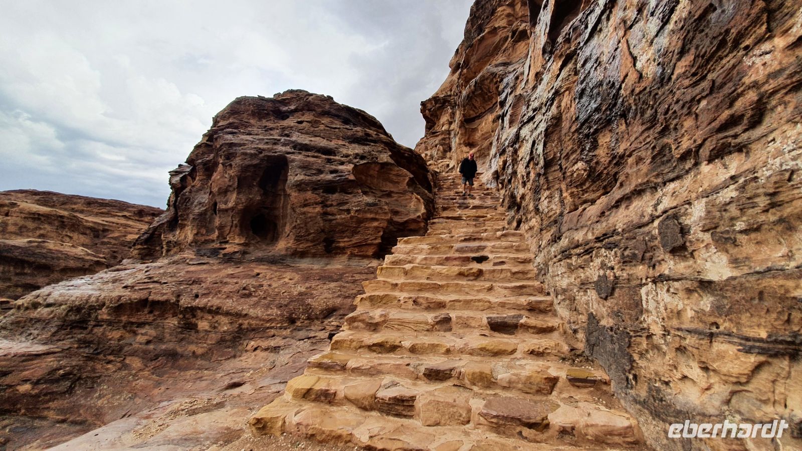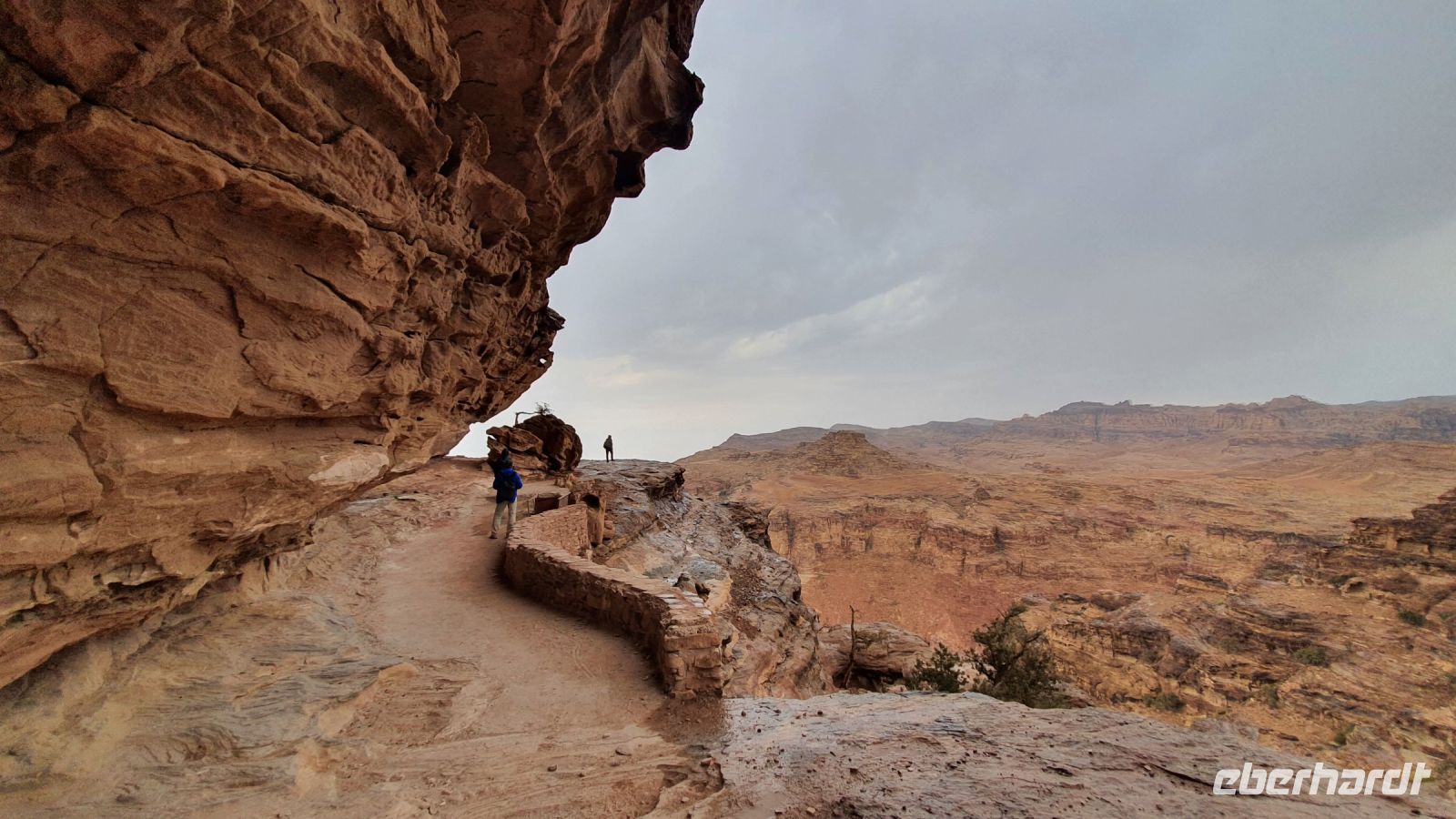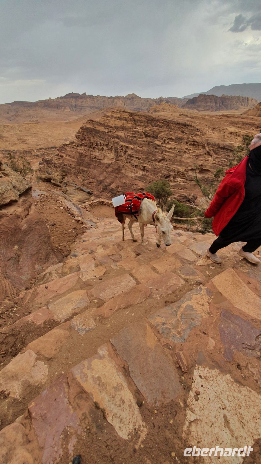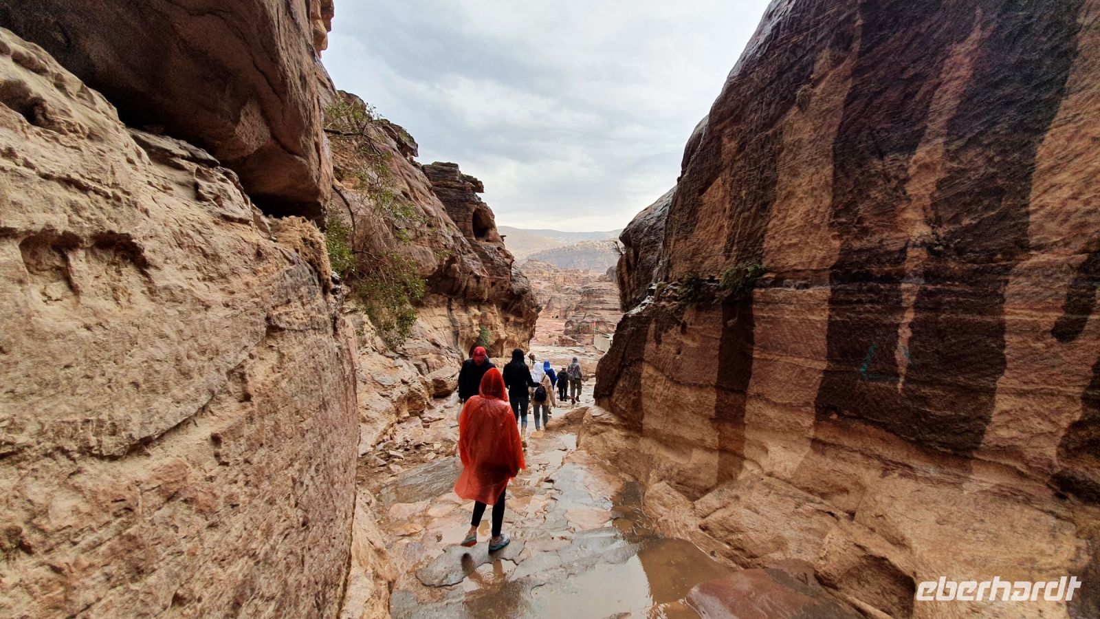Nach dem Frühstück holten uns Hussein und Hamad im Camp ab und wir fuhren ein kurzes Stück mit dem Bus bis zum Eingang der Felsenschlucht von Klein Petra. Über Nacht hatte es immer wieder geregnet und auch am Morgen war der Himmel Wolken verhangen. Die Jordanier freuten sich über den ersten Regen des Jahres 2022 und wir hatten vorsichtshalber unsere Regenkleidung dabei. Unsere Wanderung begann ausserhalb von Klein Petra und führte zur Ausgrabungsstätte El Beidha. Nach einem kurzen Rundgang durch diese neolithische Siedlung, die vor ca. 7000 Jahren bewohnt war, wanderten wir auf einer breiten Piste um Klein Petra herum und kamen dann zu einem "Felsentor", wo der eigentliche Felsenweg begann. Bis dahin kann man neuerdings auch mit einem Shuttle gelangen und das hatte zur Folge, dass auf diesem neu hergerichteten Weg auch Wanderer unterwegs waren mit unzureichender Ausrüstung. Der Weg über viele Stufen treppauf und treppab ist einfach zauberhaft und bietet ganz tolle Ausblicke. Unterwegs gab es immer wieder Gewitter und Regengüsse und so nutzten wir gern die Möglichkeiten zum Unterstellen bei den Beduinen. Schliesslich aber erreichten wir Petra durch die "Hintertür" beim Kloster Ad Deir. Auch dort gab es die Möglichkeit sich zu verpflegen und unterzustellen vor dem Regen. Wir warteten mehrer Schauer ab und begaben uns dann auf den Weg hinunter nach Petra mit reichlich 800 Stufen. Auf dem schmalen Weg waren ausser uns Wanderern die Eseltreiber unterwegs, die die müden Wanderer nach unten brachten. Der Weg war dadurch stark verschmutzt und der Regen tat sein übriges. Schliesslich kamen wir unten an im Getümmel der anderen vielen Touristen. Nach einer kurzen Pause liefen wir durch das Wadi Musa zum Schatzhaus und von dort durch den Siq zurück nach Petra. Die nächsten 2 Nächte verbrachten wir im Petra Moon Hotel und waren nach 2 Zeltübernachtungen zurück im Luxus. Zum Abendessen gingen wir ins touristische Zentrum von Petra und speisten ganz vorzüglich im Red Cave.