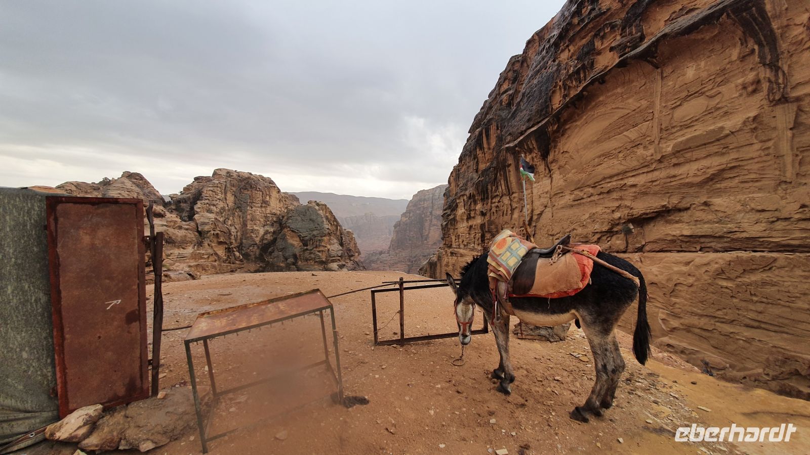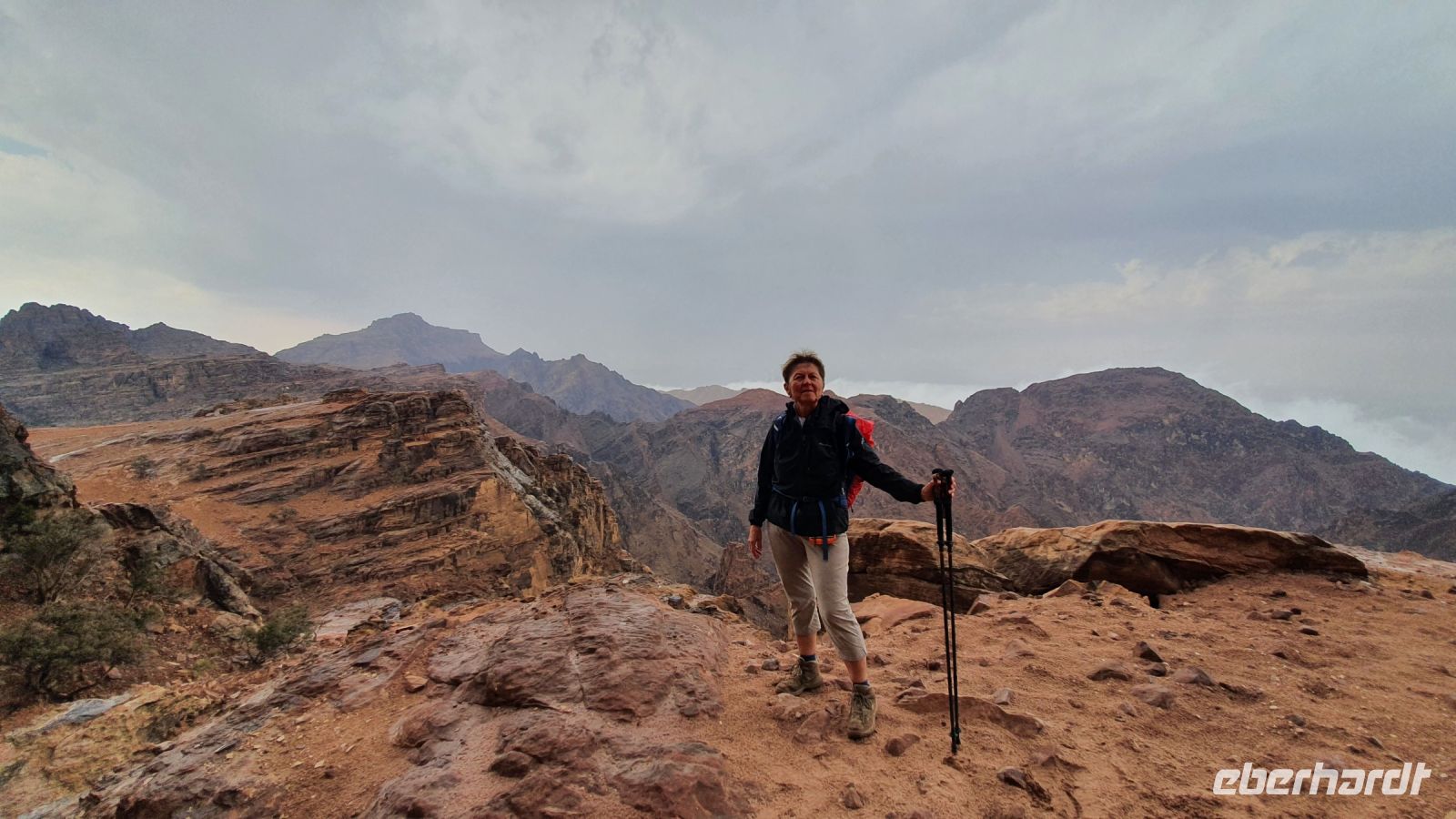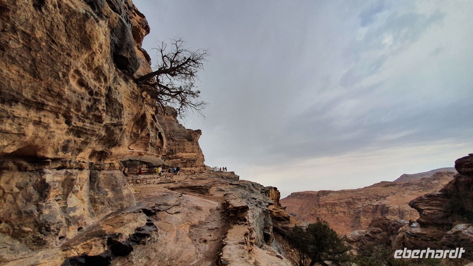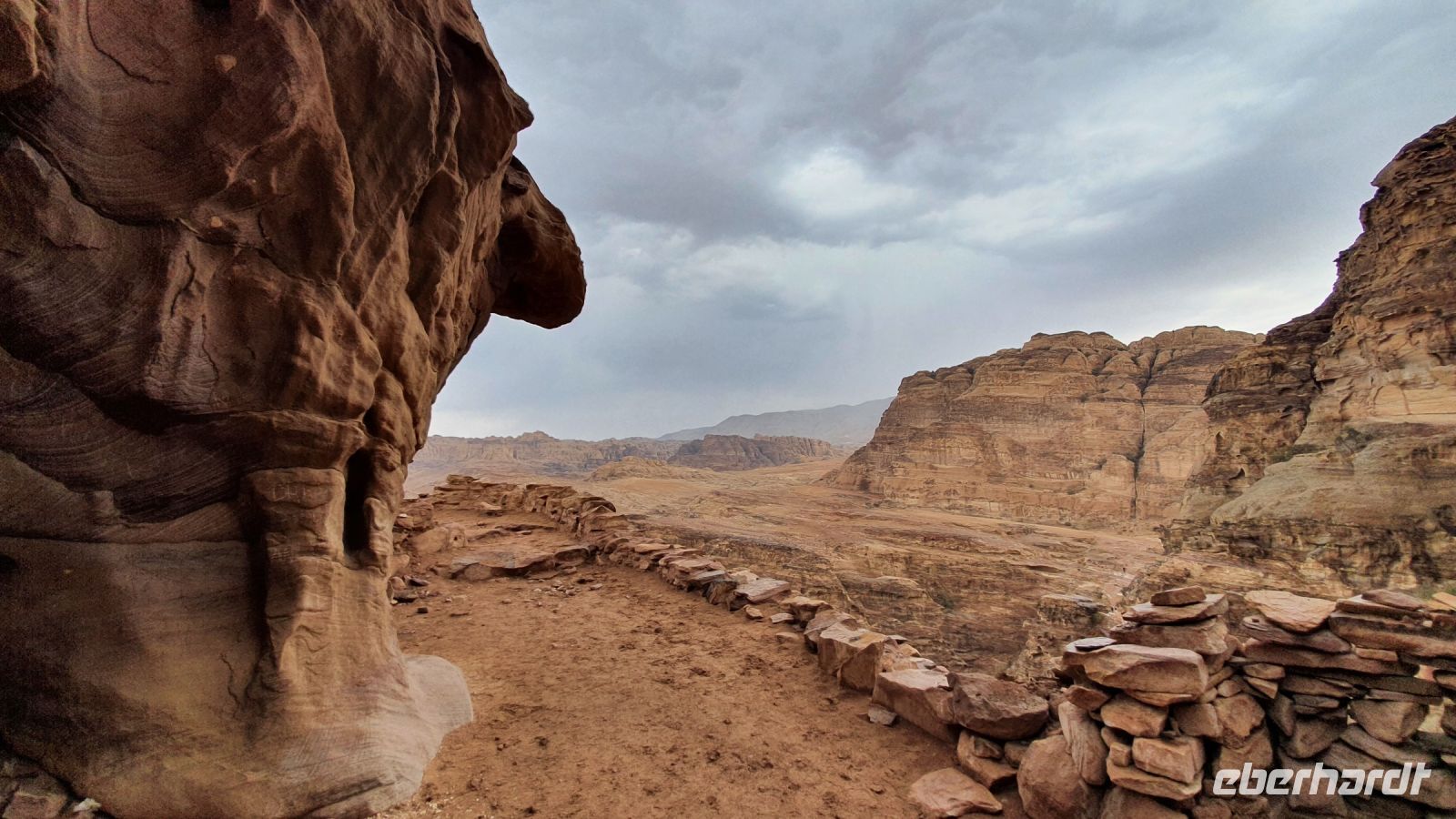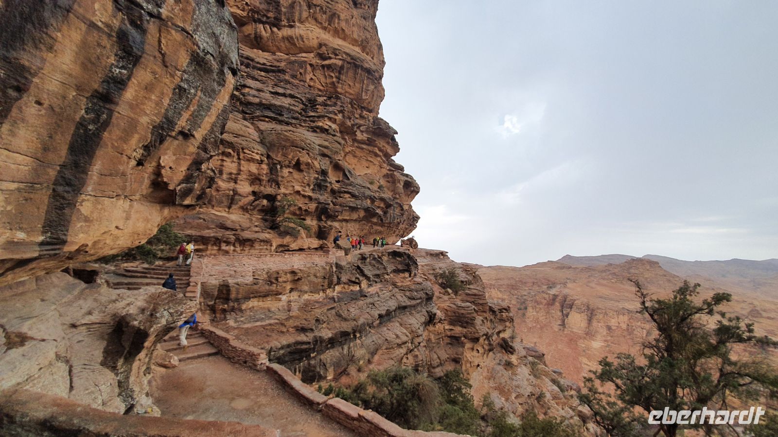 Nach dem Frühstück holten uns Hussein und Hamad im Camp ab und wir fuhren ein kurzes Stück mit dem Bus bis zum Eingang der Felsenschlucht von Klein Petra. Über Nacht hatte es immer wieder geregnet und auch am Morgen war der Himmel Wolken verhangen. Die Jordanier freuten sich über den ersten Regen des Jahres 2022 und wir hatten vorsichtshalber unsere Regenkleidung dabei. Unsere Wanderung begann ausserhalb von Klein Petra und führte zur Ausgrabungsstätte El Beidha. Nach einem kurzen Rundgang durch diese neolithische Siedlung, die vor ca. 7000 Jahren bewohnt war, wanderten wir auf einer breiten Piste um Klein Petra herum und kamen dann zu einem "Felsentor", wo der eigentliche Felsenweg begann. Bis dahin kann man neuerdings auch mit einem Shuttle gelangen und das hatte zur Folge, dass auf diesem neu hergerichteten Weg auch Wanderer unterwegs waren mit unzureichender Ausrüstung. Der Weg über viele Stufen treppauf und treppab ist einfach zauberhaft und bietet ganz tolle Ausblicke. Unterwegs gab es immer wieder Gewitter und Regengüsse und so nutzten wir gern die Möglichkeiten zum Unterstellen bei den Beduinen. Schliesslich aber erreichten wir Petra durch die "Hintertür" beim Kloster Ad Deir. Auch dort gab es die Möglichkeit sich zu verpflegen und unterzustellen vor dem Regen. Wir warteten mehrer Schauer ab und begaben uns dann auf den Weg hinunter nach Petra mit reichlich 800 Stufen. Auf dem schmalen Weg waren ausser uns Wanderern die Eseltreiber unterwegs, die die müden Wanderer nach unten brachten. Der Weg war dadurch stark verschmutzt und der Regen tat sein übriges. Schliesslich kamen wir unten an im Getümmel der anderen vielen Touristen. Nach einer kurzen Pause liefen wir durch das Wadi Musa zum Schatzhaus und von dort durch den Siq zurück nach Petra. Die nächsten 2 Nächte verbrachten wir im Petra Moon Hotel und waren nach 2 Zeltübernachtungen zurück im Luxus. Zum Abendessen gingen wir ins touristische Zentrum von Petra und speisten ganz vorzüglich im Red Cave.