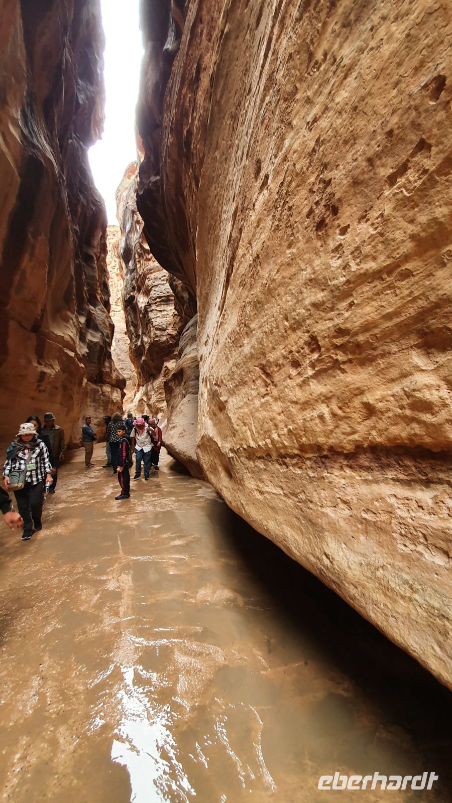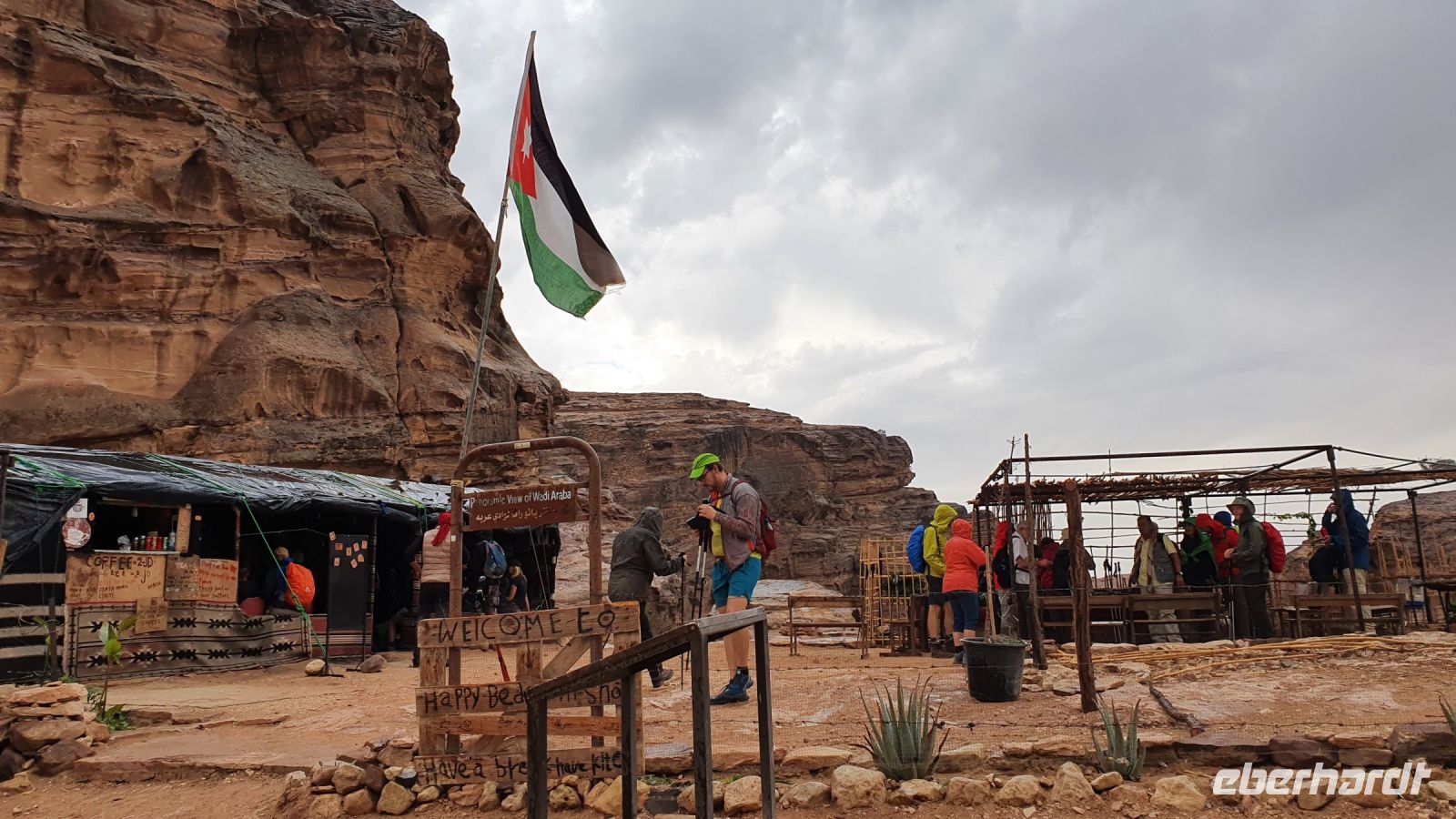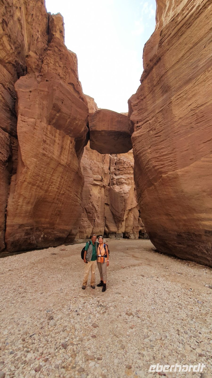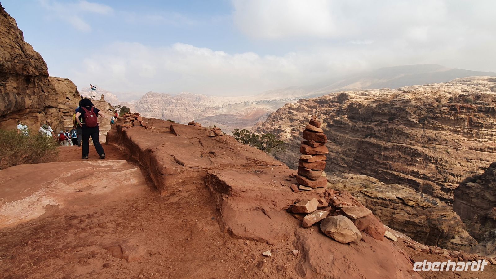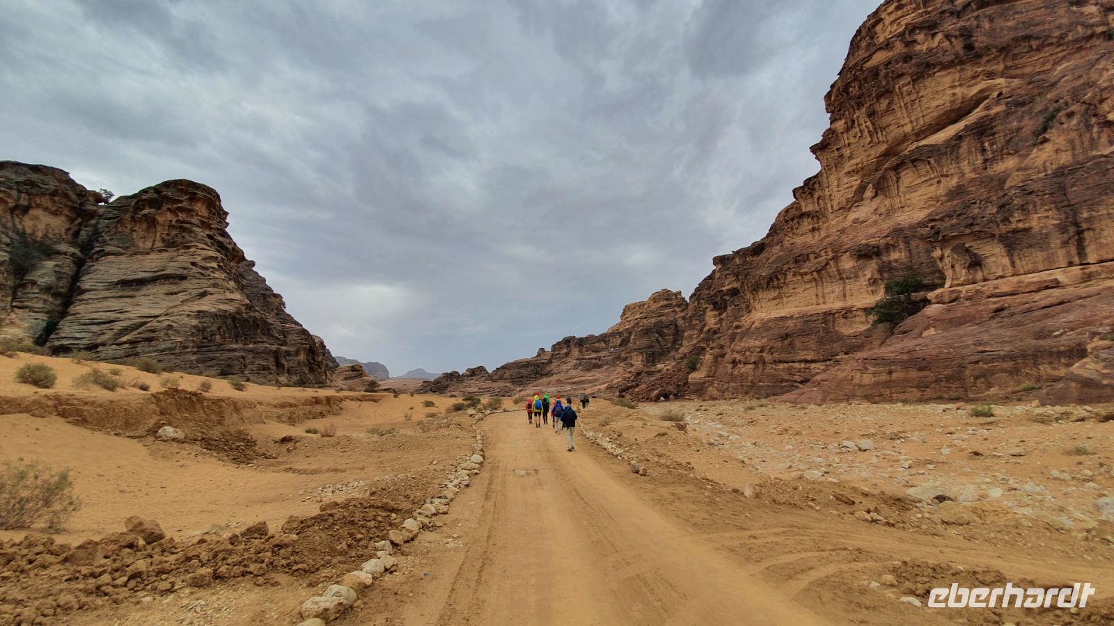 Nach dem Frühstück holten uns Hussein und Hamad im Camp ab und wir fuhren ein kurzes Stück mit dem Bus bis zum Eingang der Felsenschlucht von Klein Petra. Über Nacht hatte es immer wieder geregnet und auch am Morgen war der Himmel Wolken verhangen. Die Jordanier freuten sich über den ersten Regen des Jahres 2022 und wir hatten vorsichtshalber unsere Regenkleidung dabei. Unsere Wanderung begann ausserhalb von Klein Petra und führte zur Ausgrabungsstätte El Beidha. Nach einem kurzen Rundgang durch diese neolithische Siedlung, die vor ca. 7000 Jahren bewohnt war, wanderten wir auf einer breiten Piste um Klein Petra herum und kamen dann zu einem "Felsentor", wo der eigentliche Felsenweg begann. Bis dahin kann man neuerdings auch mit einem Shuttle gelangen und das hatte zur Folge, dass auf diesem neu hergerichteten Weg auch Wanderer unterwegs waren mit unzureichender Ausrüstung. Der Weg über viele Stufen treppauf und treppab ist einfach zauberhaft und bietet ganz tolle Ausblicke. Unterwegs gab es immer wieder Gewitter und Regengüsse und so nutzten wir gern die Möglichkeiten zum Unterstellen bei den Beduinen. Schliesslich aber erreichten wir Petra durch die "Hintertür" beim Kloster Ad Deir. Auch dort gab es die Möglichkeit sich zu verpflegen und unterzustellen vor dem Regen. Wir warteten mehrer Schauer ab und begaben uns dann auf den Weg hinunter nach Petra mit reichlich 800 Stufen. Auf dem schmalen Weg waren ausser uns Wanderern die Eseltreiber unterwegs, die die müden Wanderer nach unten brachten. Der Weg war dadurch stark verschmutzt und der Regen tat sein übriges. Schliesslich kamen wir unten an im Getümmel der anderen vielen Touristen. Nach einer kurzen Pause liefen wir durch das Wadi Musa zum Schatzhaus und von dort durch den Siq zurück nach Petra. Die nächsten 2 Nächte verbrachten wir im Petra Moon Hotel und waren nach 2 Zeltübernachtungen zurück im Luxus. Zum Abendessen gingen wir ins touristische Zentrum von Petra und speisten ganz vorzüglich im Red Cave.