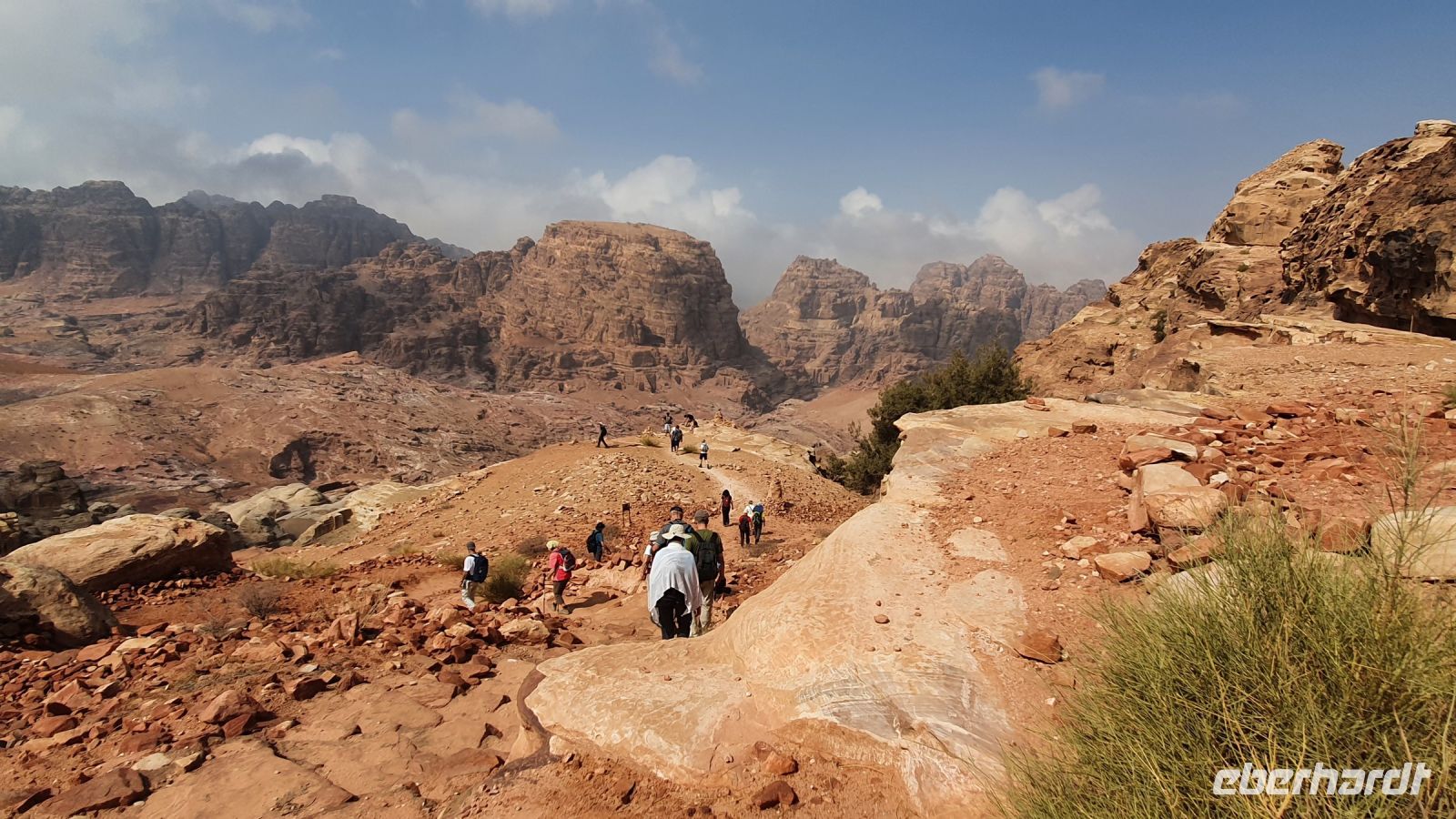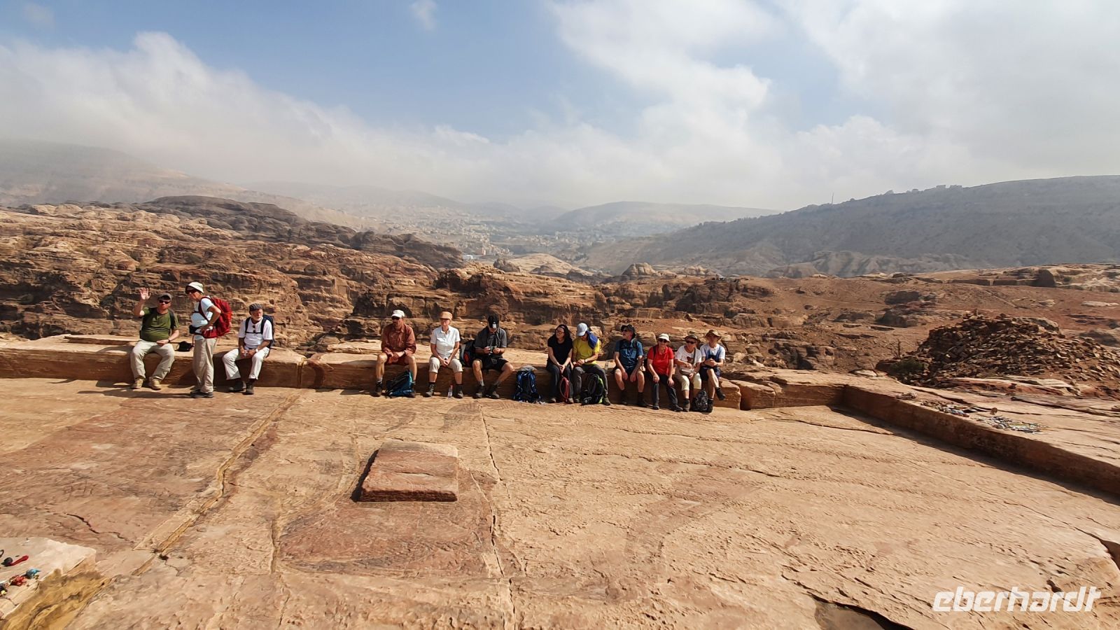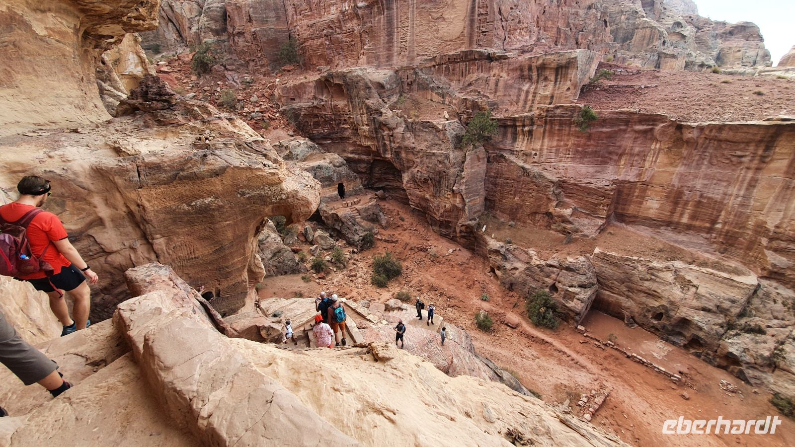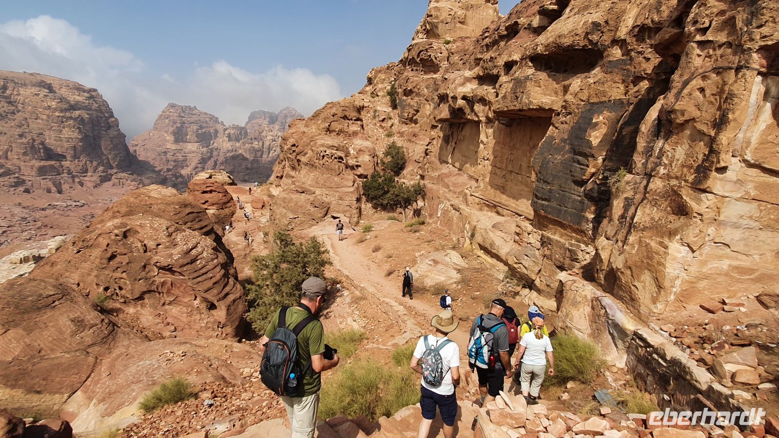 Das Wetter hatte sich wieder beruhigt. Der Himmel war blank geputzt nach dem Regen am Vortag und die Sonne schien. So machten wir uns nach dem Frühstück auf den Weg in die Felsenstadt Petra zu einer ausführlichen Besichtigung. Nach der Ticket/Pass Kontrolle am Visitor Center wanderten wir zunächst durch das breite Wadi Musa. Seit den 90er Jahren ist der Weg abgetrennt für Fussgänger und Reiter sowie die neuerdings verkehrerenden E Mobile. Unseren ersten Stop mit Erklärungen durch Hussein machten wir bei den Blockgräbern und von dort waren auch das gegenüber liegende Obeliskengrab mit dem Barock Triklinium gut zu sehen. Vor dem Siq wurde schon von den Nabatäern ein Damm aufgeschüttet und ein Tunnel angelegt, um bei Starkregen das Wasser vom Siq, dem wichtigsten Zugang ins Reich der Nabatäer, abzuleiten. Den Siq hatten wir gestern am Nachmittag ja schon durchquert, aber in der Morgensonne waren noch mehrere Details auszumachen. Mit uns waren sehr viele Touristen unterwegs und so herrschte vor dem Schatzhaus schon am Morgen Jahrmarktstimmung. Wir machten deshalb an dem wohl berühmtesten Bauwerk der Nabatäer nur kurz Halt und begaben uns dann weiter im Tal bis zu den Treppen hinauf auf den Hohen Opferplatz. Der Weg führte durch eine enge Schlucht steil bergan und bot immer wieder fantastische Ausblicke auf Petra mit dem römischen Theater und der Königsgräberwand. Oben auf dem Plateau zweigte unser Weg nach rechts ab auf einen Felsvorsprung und von dort steil hinauf auf den Hohen Opferplatz. Wir verschnauften ein wenig und genossen dann die tolle Aussicht auf das neue Petra mit unserem Hotel, auf das Petra der Nabatäer und schliesslich hinüber zum Jebel Aron, mit 1350 m Höhe der höchste Berg in der Umgebung von Petra und durch das weithin sichtbare weisse Grabmahl auch immer gut zu erkennen. Eine Beduinin wies uns für den Abstieg einen kürzeren Weg und so erreichten wir bald wieder unseren Weg. Der führte nun durch das Farasatal immer steil bergab und unterwegs gab es noch weitere Felsengräber zu bestaunen. Am Löwenbrunnen und Gartentempel vorbei gelangten wir zum Soldatengrab und dem gegenüber liegenden Triklinium mit dem Bunten Saal innen. Unterwegs kamen uns zwei berittene Polizisten entgegen und nach der Amoud Farion Säule erreichten wir bald einen breiten Weg, von dem aus wir eine sehr gute Sicht auf den großen Tempel hatten. Eine kurze Mittagseinkehr liess uns ein wenig verschnaufen und danach gingen wir steil bergan zum Urnengrab, das einst als christliche Kirche genutzt wurde. Danach folgten weitere Königsgräber, wie das Treppengrab, das Korinthische Grab und das Palastgrab mit der breitesten Fassade aller Gräber. Am gegenüberliegenden Hang liefen wir zu den Ausgrabungen der Byzantinischen Kirche und bestaunten den wunderschönen Mosaikfussboden. Wir hatten auf unserer großen Runde durch Petra schon sehr viel gesehen, aber noch längst nicht alles. Über den Cardo Maximus spazierten wir langsam zurück zum Schatzhaus, machten noch einmal Fotos in der Nachmittagssonne und begaben uns durch den Siq zurück in das neue Petra zu unserem Hotel.