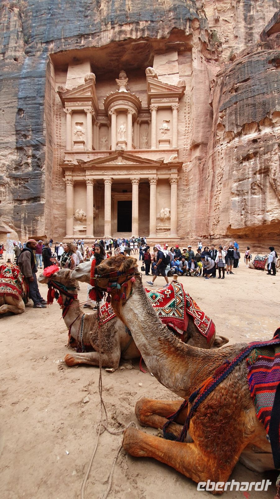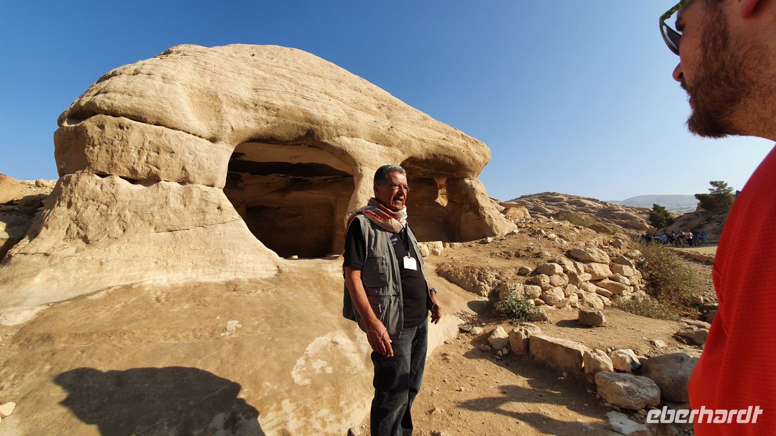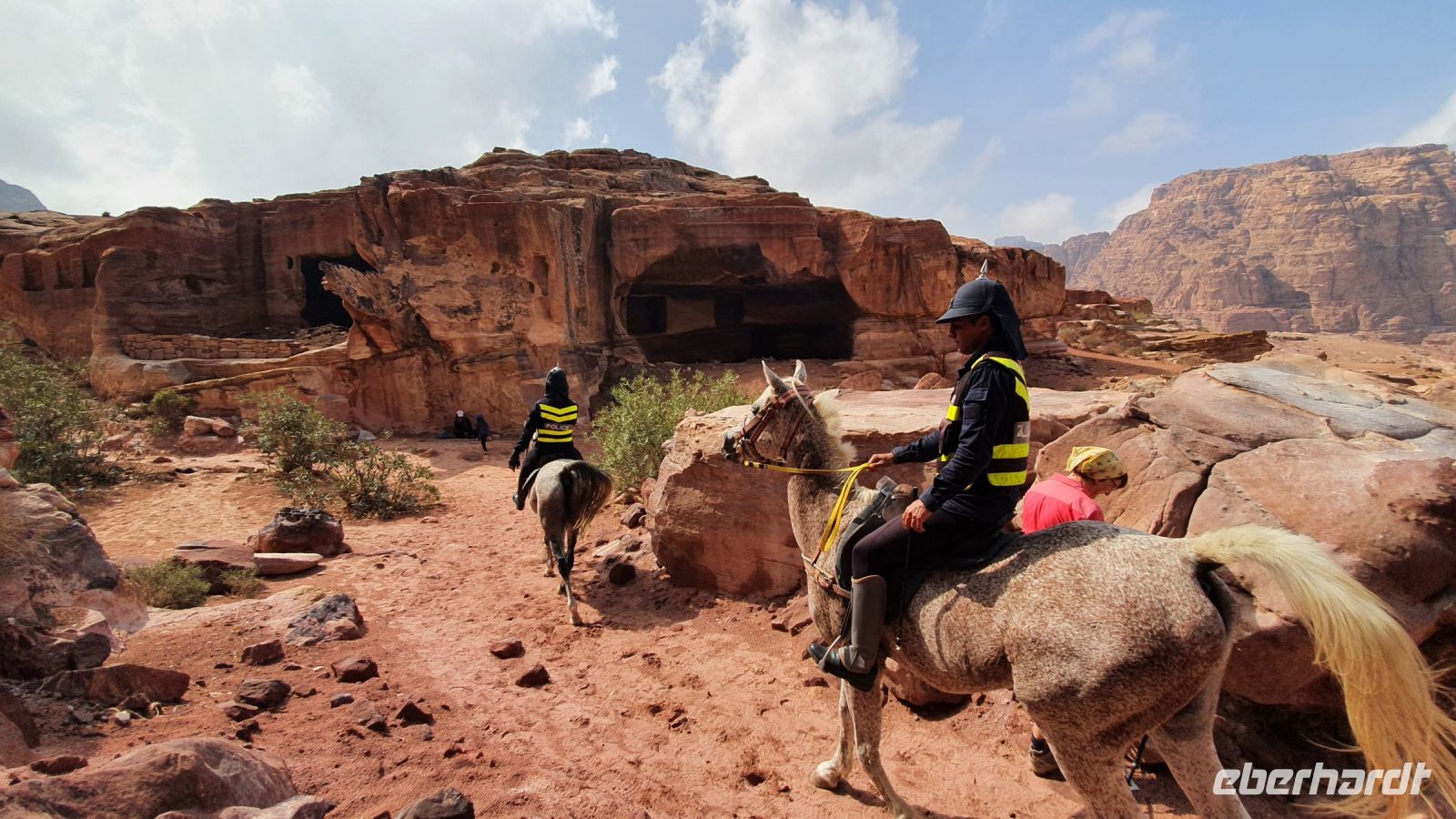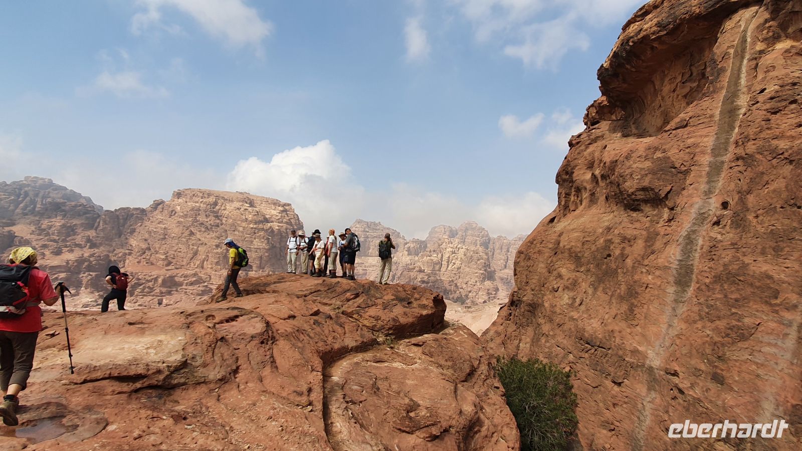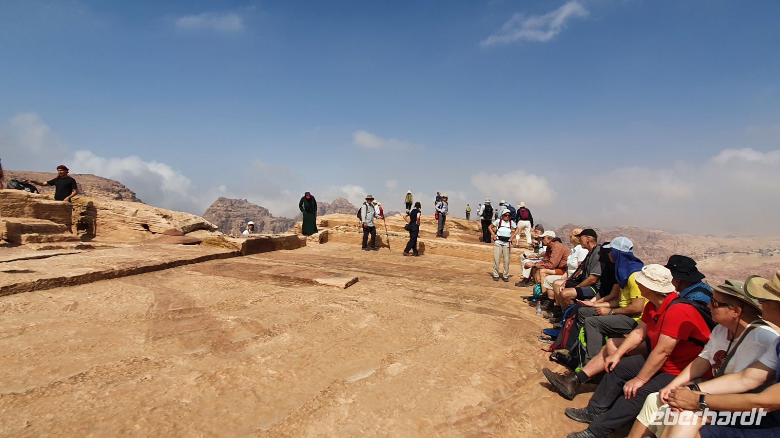 Das Wetter hatte sich wieder beruhigt. Der Himmel war blank geputzt nach dem Regen am Vortag und die Sonne schien. So machten wir uns nach dem Frühstück auf den Weg in die Felsenstadt Petra zu einer ausführlichen Besichtigung. Nach der Ticket/Pass Kontrolle am Visitor Center wanderten wir zunächst durch das breite Wadi Musa. Seit den 90er Jahren ist der Weg abgetrennt für Fussgänger und Reiter sowie die neuerdings verkehrerenden E Mobile. Unseren ersten Stop mit Erklärungen durch Hussein machten wir bei den Blockgräbern und von dort waren auch das gegenüber liegende Obeliskengrab mit dem Barock Triklinium gut zu sehen. Vor dem Siq wurde schon von den Nabatäern ein Damm aufgeschüttet und ein Tunnel angelegt, um bei Starkregen das Wasser vom Siq, dem wichtigsten Zugang ins Reich der Nabatäer, abzuleiten. Den Siq hatten wir gestern am Nachmittag ja schon durchquert, aber in der Morgensonne waren noch mehrere Details auszumachen. Mit uns waren sehr viele Touristen unterwegs und so herrschte vor dem Schatzhaus schon am Morgen Jahrmarktstimmung. Wir machten deshalb an dem wohl berühmtesten Bauwerk der Nabatäer nur kurz Halt und begaben uns dann weiter im Tal bis zu den Treppen hinauf auf den Hohen Opferplatz. Der Weg führte durch eine enge Schlucht steil bergan und bot immer wieder fantastische Ausblicke auf Petra mit dem römischen Theater und der Königsgräberwand. Oben auf dem Plateau zweigte unser Weg nach rechts ab auf einen Felsvorsprung und von dort steil hinauf auf den Hohen Opferplatz. Wir verschnauften ein wenig und genossen dann die tolle Aussicht auf das neue Petra mit unserem Hotel, auf das Petra der Nabatäer und schliesslich hinüber zum Jebel Aron, mit 1350 m Höhe der höchste Berg in der Umgebung von Petra und durch das weithin sichtbare weisse Grabmahl auch immer gut zu erkennen. Eine Beduinin wies uns für den Abstieg einen kürzeren Weg und so erreichten wir bald wieder unseren Weg. Der führte nun durch das Farasatal immer steil bergab und unterwegs gab es noch weitere Felsengräber zu bestaunen. Am Löwenbrunnen und Gartentempel vorbei gelangten wir zum Soldatengrab und dem gegenüber liegenden Triklinium mit dem Bunten Saal innen. Unterwegs kamen uns zwei berittene Polizisten entgegen und nach der Amoud Farion Säule erreichten wir bald einen breiten Weg, von dem aus wir eine sehr gute Sicht auf den großen Tempel hatten. Eine kurze Mittagseinkehr liess uns ein wenig verschnaufen und danach gingen wir steil bergan zum Urnengrab, das einst als christliche Kirche genutzt wurde. Danach folgten weitere Königsgräber, wie das Treppengrab, das Korinthische Grab und das Palastgrab mit der breitesten Fassade aller Gräber. Am gegenüberliegenden Hang liefen wir zu den Ausgrabungen der Byzantinischen Kirche und bestaunten den wunderschönen Mosaikfussboden. Wir hatten auf unserer großen Runde durch Petra schon sehr viel gesehen, aber noch längst nicht alles. Über den Cardo Maximus spazierten wir langsam zurück zum Schatzhaus, machten noch einmal Fotos in der Nachmittagssonne und begaben uns durch den Siq zurück in das neue Petra zu unserem Hotel.