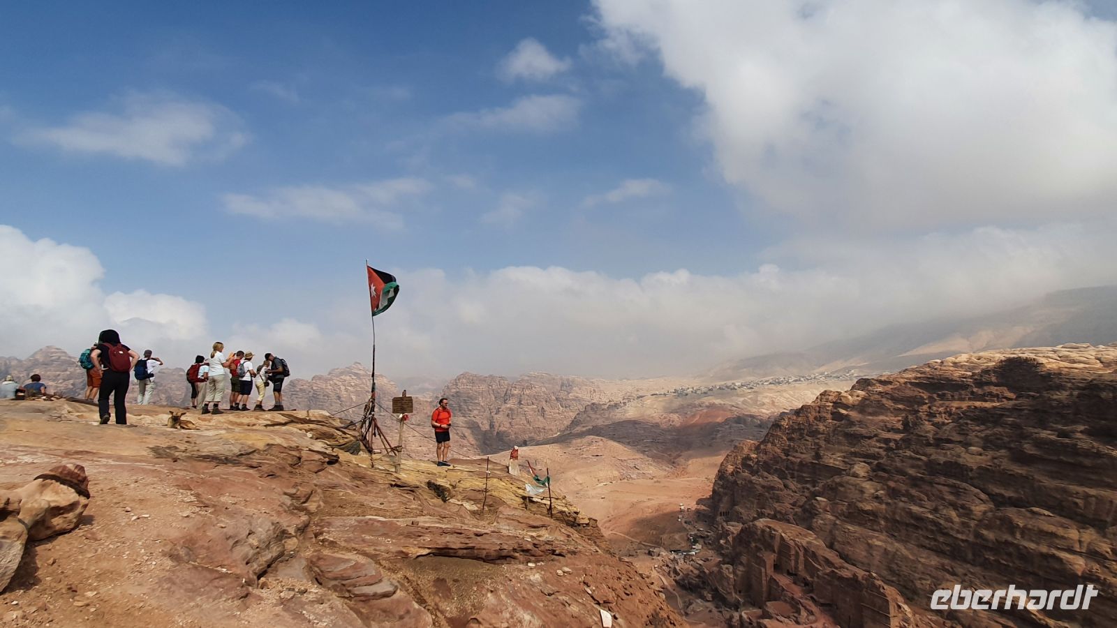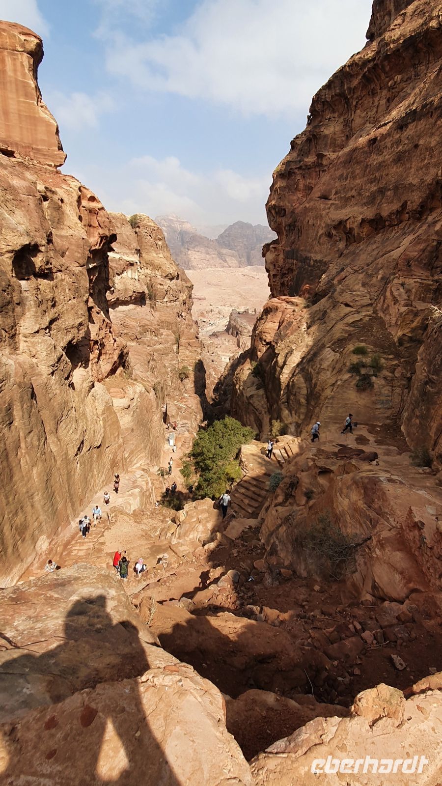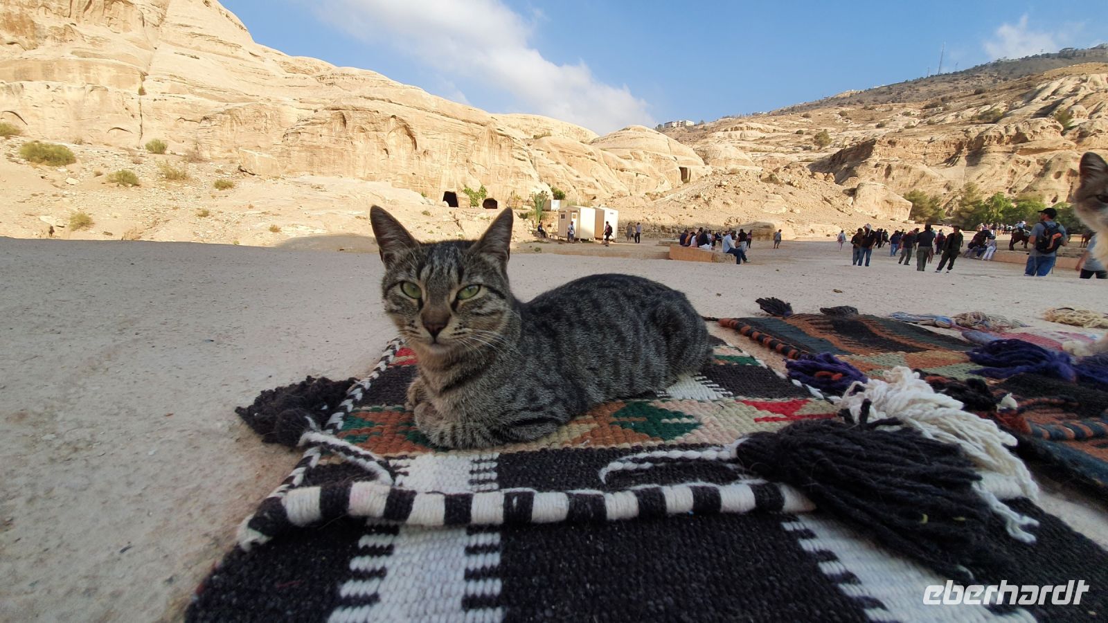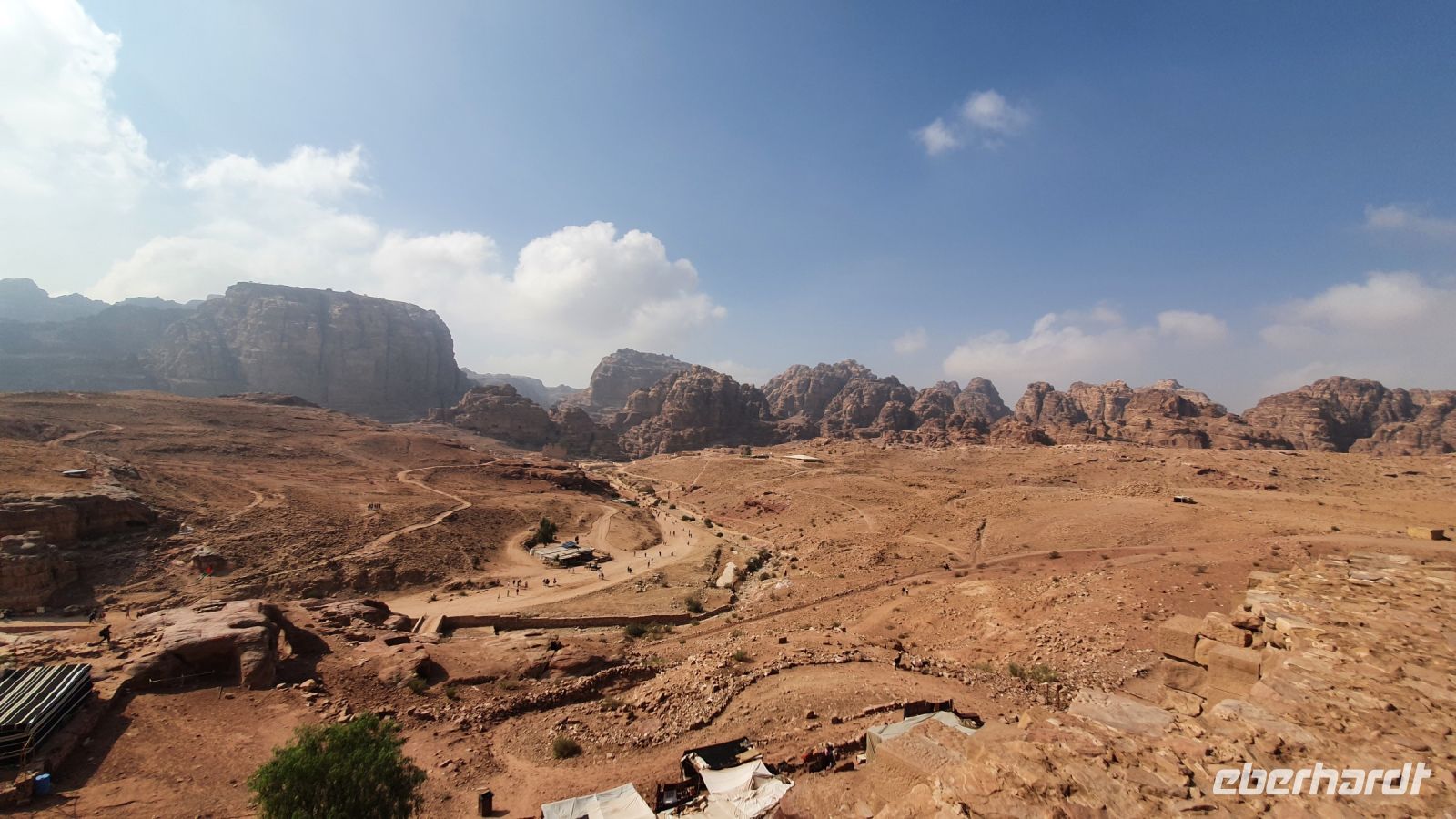 Das Wetter hatte sich wieder beruhigt. Der Himmel war blank geputzt nach dem Regen am Vortag und die Sonne schien. So machten wir uns nach dem Frühstück auf den Weg in die Felsenstadt Petra zu einer ausführlichen Besichtigung. Nach der Ticket/Pass Kontrolle am Visitor Center wanderten wir zunächst durch das breite Wadi Musa. Seit den 90er Jahren ist der Weg abgetrennt für Fussgänger und Reiter sowie die neuerdings verkehrerenden E Mobile. Unseren ersten Stop mit Erklärungen durch Hussein machten wir bei den Blockgräbern und von dort waren auch das gegenüber liegende Obeliskengrab mit dem Barock Triklinium gut zu sehen. Vor dem Siq wurde schon von den Nabatäern ein Damm aufgeschüttet und ein Tunnel angelegt, um bei Starkregen das Wasser vom Siq, dem wichtigsten Zugang ins Reich der Nabatäer, abzuleiten. Den Siq hatten wir gestern am Nachmittag ja schon durchquert, aber in der Morgensonne waren noch mehrere Details auszumachen. Mit uns waren sehr viele Touristen unterwegs und so herrschte vor dem Schatzhaus schon am Morgen Jahrmarktstimmung. Wir machten deshalb an dem wohl berühmtesten Bauwerk der Nabatäer nur kurz Halt und begaben uns dann weiter im Tal bis zu den Treppen hinauf auf den Hohen Opferplatz. Der Weg führte durch eine enge Schlucht steil bergan und bot immer wieder fantastische Ausblicke auf Petra mit dem römischen Theater und der Königsgräberwand. Oben auf dem Plateau zweigte unser Weg nach rechts ab auf einen Felsvorsprung und von dort steil hinauf auf den Hohen Opferplatz. Wir verschnauften ein wenig und genossen dann die tolle Aussicht auf das neue Petra mit unserem Hotel, auf das Petra der Nabatäer und schliesslich hinüber zum Jebel Aron, mit 1350 m Höhe der höchste Berg in der Umgebung von Petra und durch das weithin sichtbare weisse Grabmahl auch immer gut zu erkennen. Eine Beduinin wies uns für den Abstieg einen kürzeren Weg und so erreichten wir bald wieder unseren Weg. Der führte nun durch das Farasatal immer steil bergab und unterwegs gab es noch weitere Felsengräber zu bestaunen. Am Löwenbrunnen und Gartentempel vorbei gelangten wir zum Soldatengrab und dem gegenüber liegenden Triklinium mit dem Bunten Saal innen. Unterwegs kamen uns zwei berittene Polizisten entgegen und nach der Amoud Farion Säule erreichten wir bald einen breiten Weg, von dem aus wir eine sehr gute Sicht auf den großen Tempel hatten. Eine kurze Mittagseinkehr liess uns ein wenig verschnaufen und danach gingen wir steil bergan zum Urnengrab, das einst als christliche Kirche genutzt wurde. Danach folgten weitere Königsgräber, wie das Treppengrab, das Korinthische Grab und das Palastgrab mit der breitesten Fassade aller Gräber. Am gegenüberliegenden Hang liefen wir zu den Ausgrabungen der Byzantinischen Kirche und bestaunten den wunderschönen Mosaikfussboden. Wir hatten auf unserer großen Runde durch Petra schon sehr viel gesehen, aber noch längst nicht alles. Über den Cardo Maximus spazierten wir langsam zurück zum Schatzhaus, machten noch einmal Fotos in der Nachmittagssonne und begaben uns durch den Siq zurück in das neue Petra zu unserem Hotel.