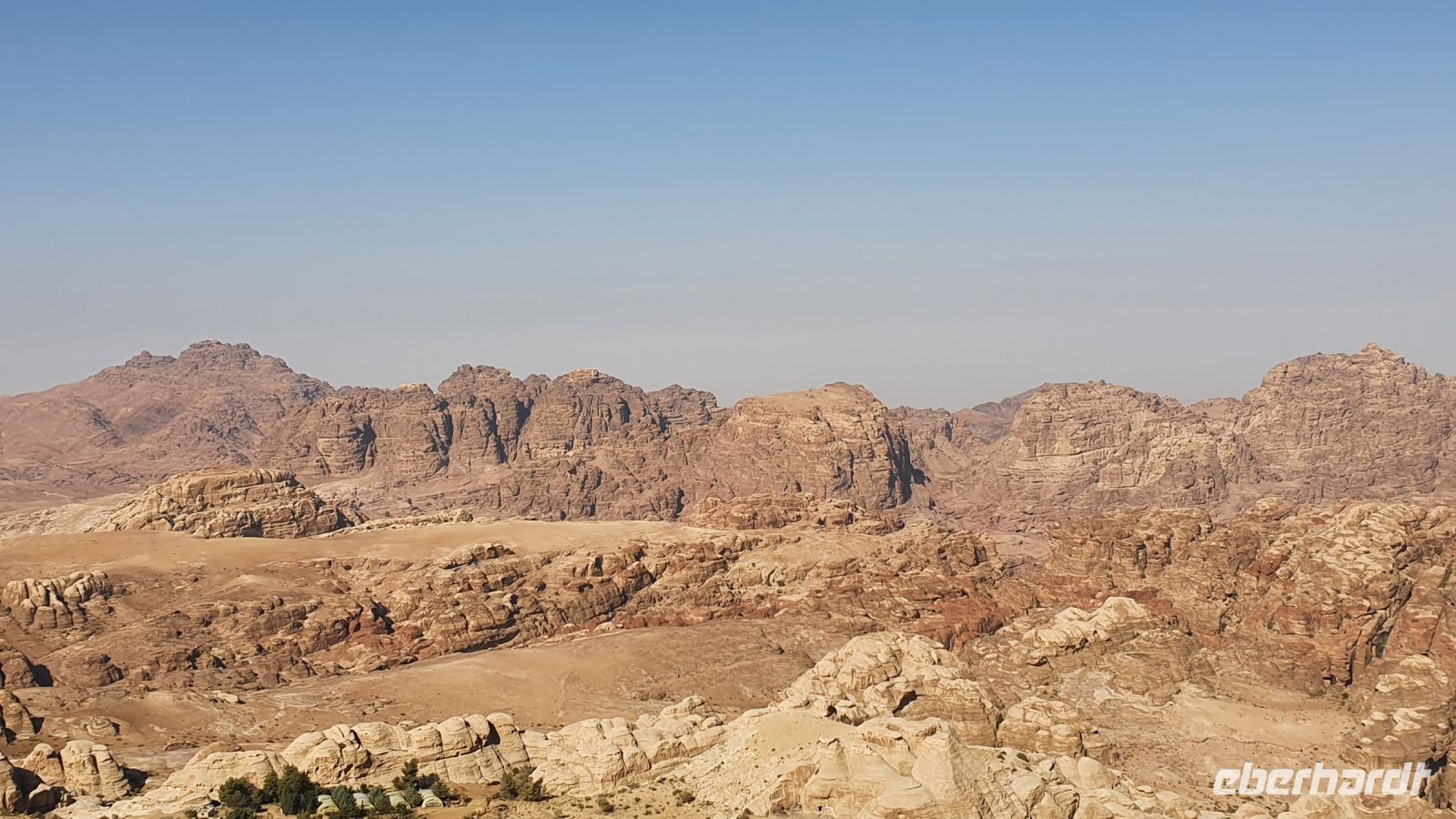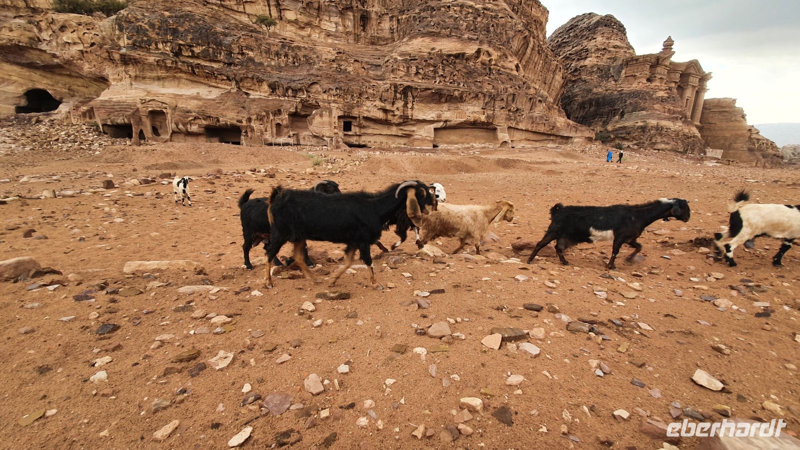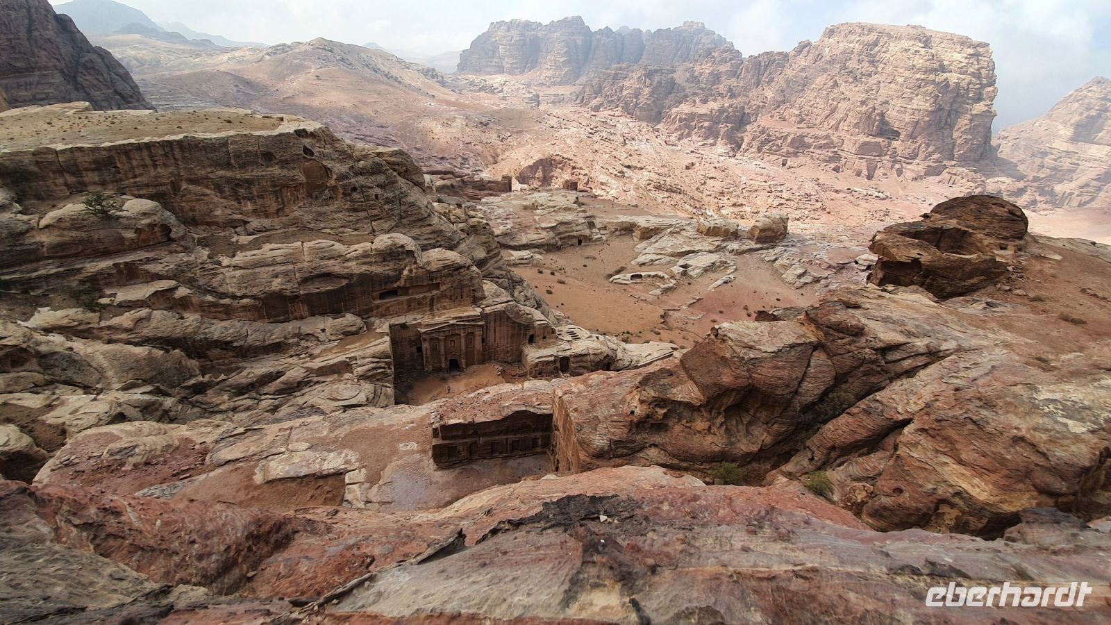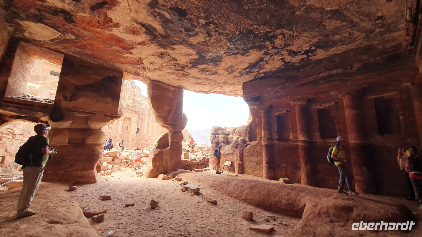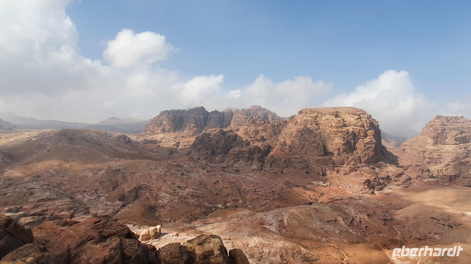 Das Wetter hatte sich wieder beruhigt. Der Himmel war blank geputzt nach dem Regen am Vortag und die Sonne schien. So machten wir uns nach dem Frühstück auf den Weg in die Felsenstadt Petra zu einer ausführlichen Besichtigung. Nach der Ticket/Pass Kontrolle am Visitor Center wanderten wir zunächst durch das breite Wadi Musa. Seit den 90er Jahren ist der Weg abgetrennt für Fussgänger und Reiter sowie die neuerdings verkehrerenden E Mobile. Unseren ersten Stop mit Erklärungen durch Hussein machten wir bei den Blockgräbern und von dort waren auch das gegenüber liegende Obeliskengrab mit dem Barock Triklinium gut zu sehen. Vor dem Siq wurde schon von den Nabatäern ein Damm aufgeschüttet und ein Tunnel angelegt, um bei Starkregen das Wasser vom Siq, dem wichtigsten Zugang ins Reich der Nabatäer, abzuleiten. Den Siq hatten wir gestern am Nachmittag ja schon durchquert, aber in der Morgensonne waren noch mehrere Details auszumachen. Mit uns waren sehr viele Touristen unterwegs und so herrschte vor dem Schatzhaus schon am Morgen Jahrmarktstimmung. Wir machten deshalb an dem wohl berühmtesten Bauwerk der Nabatäer nur kurz Halt und begaben uns dann weiter im Tal bis zu den Treppen hinauf auf den Hohen Opferplatz. Der Weg führte durch eine enge Schlucht steil bergan und bot immer wieder fantastische Ausblicke auf Petra mit dem römischen Theater und der Königsgräberwand. Oben auf dem Plateau zweigte unser Weg nach rechts ab auf einen Felsvorsprung und von dort steil hinauf auf den Hohen Opferplatz. Wir verschnauften ein wenig und genossen dann die tolle Aussicht auf das neue Petra mit unserem Hotel, auf das Petra der Nabatäer und schliesslich hinüber zum Jebel Aron, mit 1350 m Höhe der höchste Berg in der Umgebung von Petra und durch das weithin sichtbare weisse Grabmahl auch immer gut zu erkennen. Eine Beduinin wies uns für den Abstieg einen kürzeren Weg und so erreichten wir bald wieder unseren Weg. Der führte nun durch das Farasatal immer steil bergab und unterwegs gab es noch weitere Felsengräber zu bestaunen. Am Löwenbrunnen und Gartentempel vorbei gelangten wir zum Soldatengrab und dem gegenüber liegenden Triklinium mit dem Bunten Saal innen. Unterwegs kamen uns zwei berittene Polizisten entgegen und nach der Amoud Farion Säule erreichten wir bald einen breiten Weg, von dem aus wir eine sehr gute Sicht auf den großen Tempel hatten. Eine kurze Mittagseinkehr liess uns ein wenig verschnaufen und danach gingen wir steil bergan zum Urnengrab, das einst als christliche Kirche genutzt wurde. Danach folgten weitere Königsgräber, wie das Treppengrab, das Korinthische Grab und das Palastgrab mit der breitesten Fassade aller Gräber. Am gegenüberliegenden Hang liefen wir zu den Ausgrabungen der Byzantinischen Kirche und bestaunten den wunderschönen Mosaikfussboden. Wir hatten auf unserer großen Runde durch Petra schon sehr viel gesehen, aber noch längst nicht alles. Über den Cardo Maximus spazierten wir langsam zurück zum Schatzhaus, machten noch einmal Fotos in der Nachmittagssonne und begaben uns durch den Siq zurück in das neue Petra zu unserem Hotel.