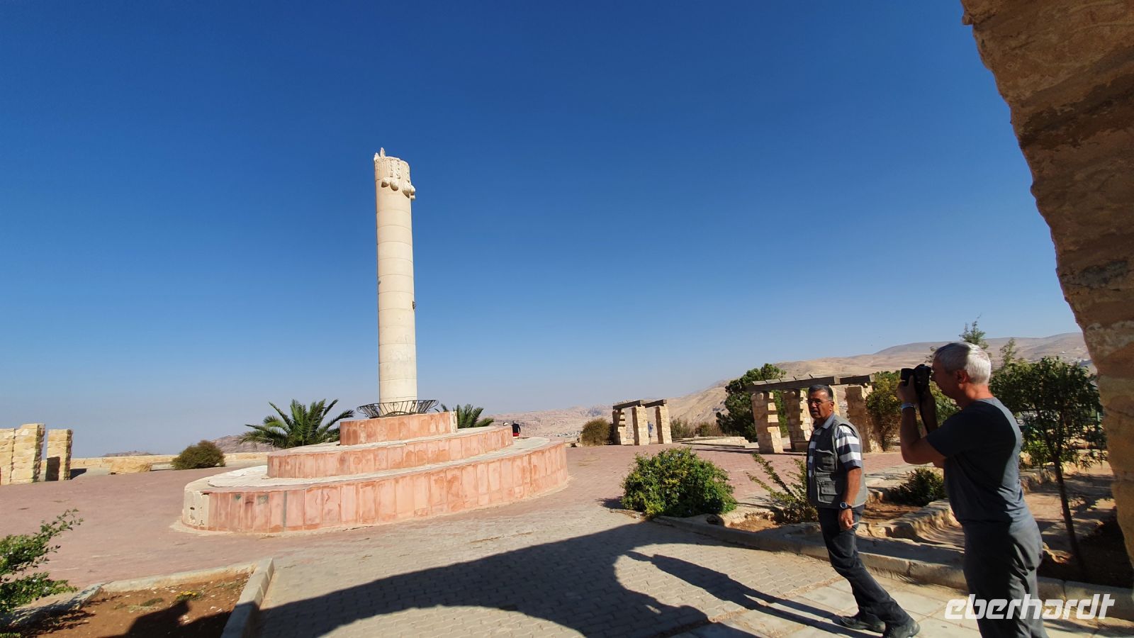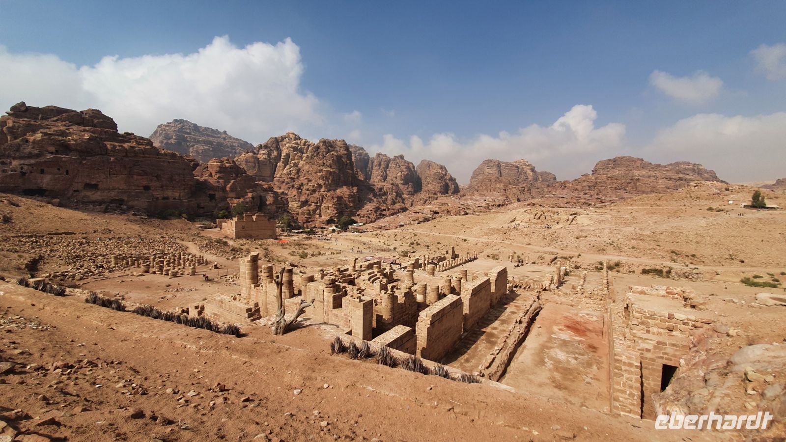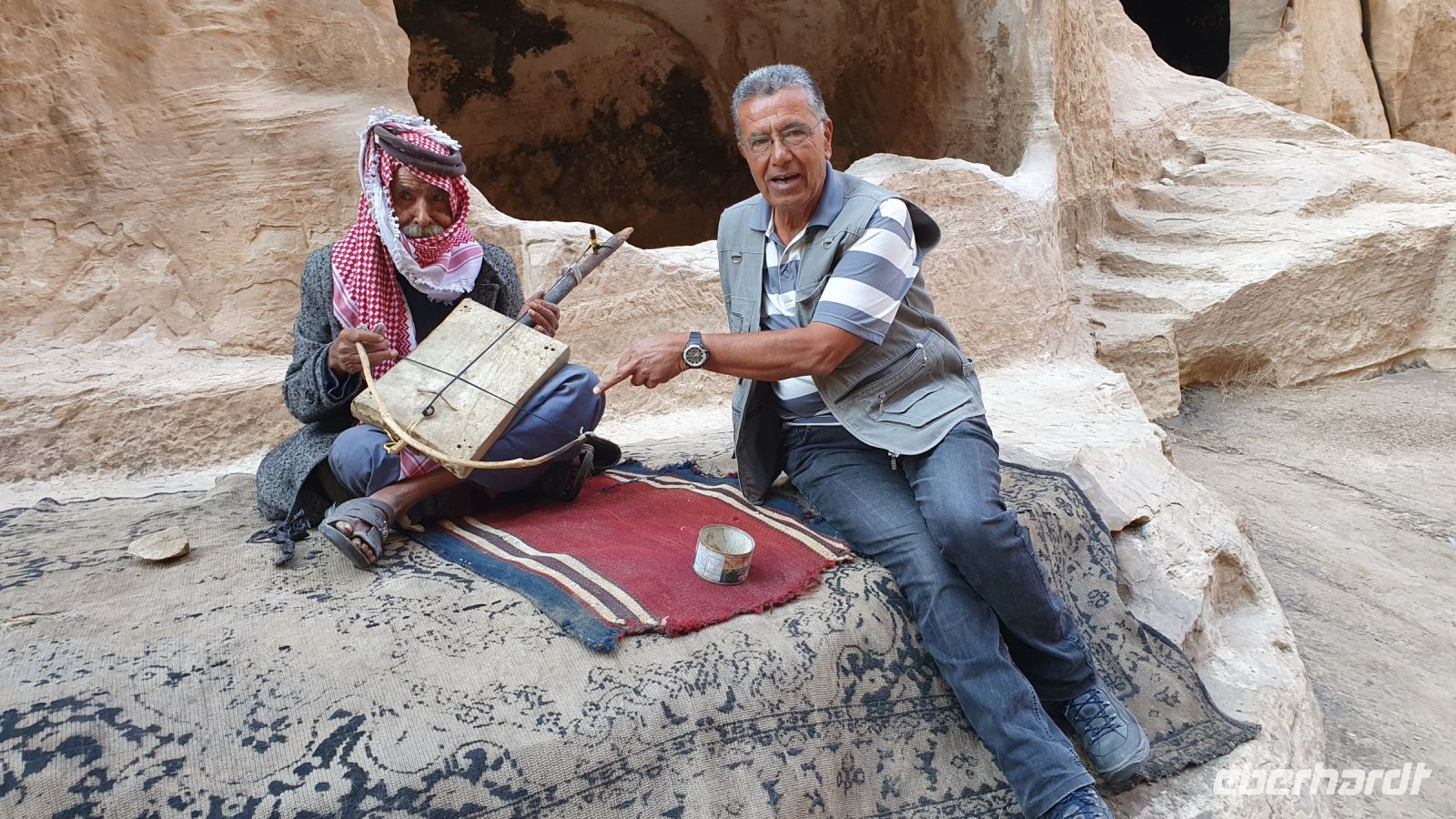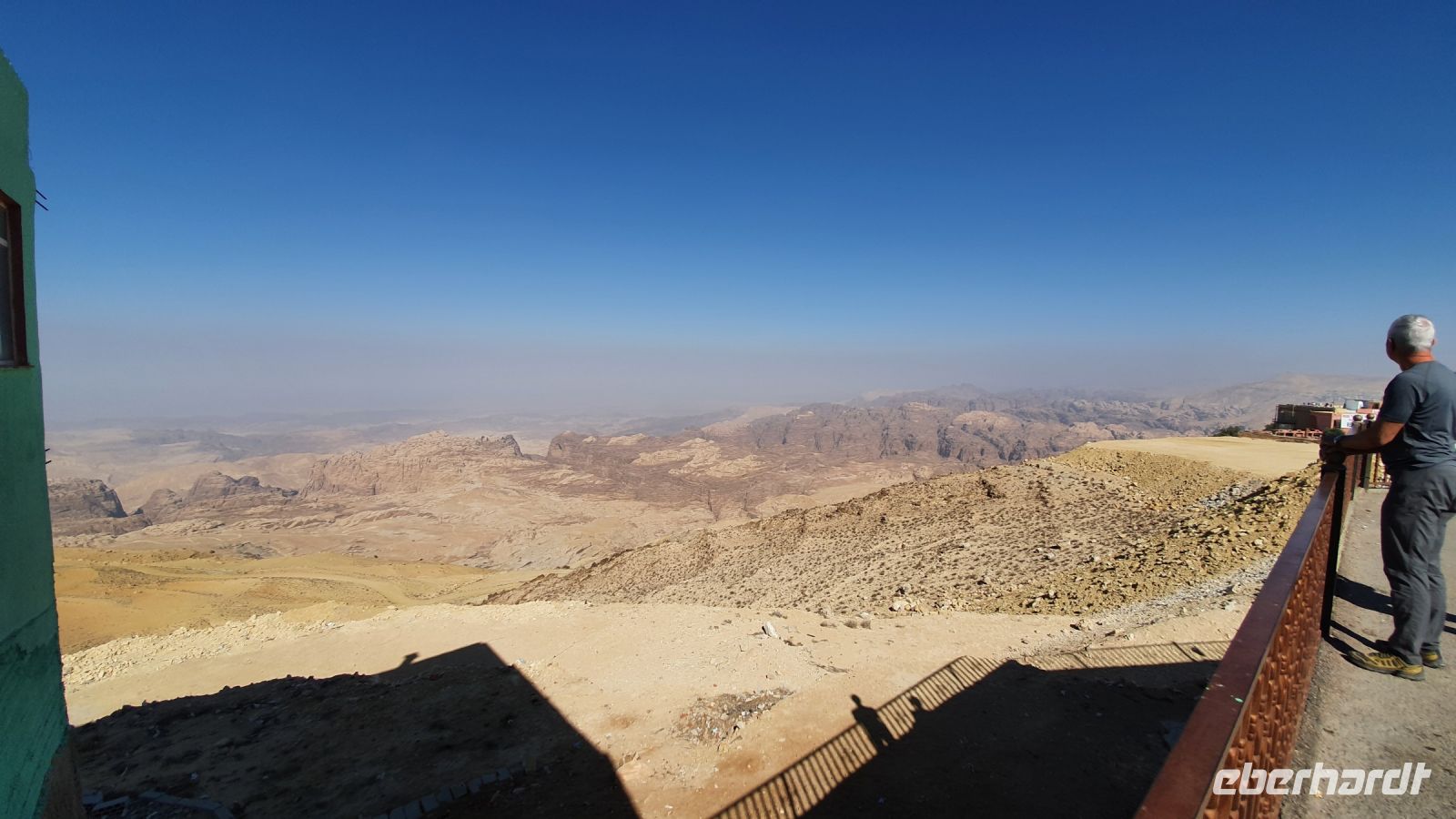 Das Wetter hatte sich wieder beruhigt. Der Himmel war blank geputzt nach dem Regen am Vortag und die Sonne schien. So machten wir uns nach dem Frühstück auf den Weg in die Felsenstadt Petra zu einer ausführlichen Besichtigung. Nach der Ticket/Pass Kontrolle am Visitor Center wanderten wir zunächst durch das breite Wadi Musa. Seit den 90er Jahren ist der Weg abgetrennt für Fussgänger und Reiter sowie die neuerdings verkehrerenden E Mobile. Unseren ersten Stop mit Erklärungen durch Hussein machten wir bei den Blockgräbern und von dort waren auch das gegenüber liegende Obeliskengrab mit dem Barock Triklinium gut zu sehen. Vor dem Siq wurde schon von den Nabatäern ein Damm aufgeschüttet und ein Tunnel angelegt, um bei Starkregen das Wasser vom Siq, dem wichtigsten Zugang ins Reich der Nabatäer, abzuleiten. Den Siq hatten wir gestern am Nachmittag ja schon durchquert, aber in der Morgensonne waren noch mehrere Details auszumachen. Mit uns waren sehr viele Touristen unterwegs und so herrschte vor dem Schatzhaus schon am Morgen Jahrmarktstimmung. Wir machten deshalb an dem wohl berühmtesten Bauwerk der Nabatäer nur kurz Halt und begaben uns dann weiter im Tal bis zu den Treppen hinauf auf den Hohen Opferplatz. Der Weg führte durch eine enge Schlucht steil bergan und bot immer wieder fantastische Ausblicke auf Petra mit dem römischen Theater und der Königsgräberwand. Oben auf dem Plateau zweigte unser Weg nach rechts ab auf einen Felsvorsprung und von dort steil hinauf auf den Hohen Opferplatz. Wir verschnauften ein wenig und genossen dann die tolle Aussicht auf das neue Petra mit unserem Hotel, auf das Petra der Nabatäer und schliesslich hinüber zum Jebel Aron, mit 1350 m Höhe der höchste Berg in der Umgebung von Petra und durch das weithin sichtbare weisse Grabmahl auch immer gut zu erkennen. Eine Beduinin wies uns für den Abstieg einen kürzeren Weg und so erreichten wir bald wieder unseren Weg. Der führte nun durch das Farasatal immer steil bergab und unterwegs gab es noch weitere Felsengräber zu bestaunen. Am Löwenbrunnen und Gartentempel vorbei gelangten wir zum Soldatengrab und dem gegenüber liegenden Triklinium mit dem Bunten Saal innen. Unterwegs kamen uns zwei berittene Polizisten entgegen und nach der Amoud Farion Säule erreichten wir bald einen breiten Weg, von dem aus wir eine sehr gute Sicht auf den großen Tempel hatten. Eine kurze Mittagseinkehr liess uns ein wenig verschnaufen und danach gingen wir steil bergan zum Urnengrab, das einst als christliche Kirche genutzt wurde. Danach folgten weitere Königsgräber, wie das Treppengrab, das Korinthische Grab und das Palastgrab mit der breitesten Fassade aller Gräber. Am gegenüberliegenden Hang liefen wir zu den Ausgrabungen der Byzantinischen Kirche und bestaunten den wunderschönen Mosaikfussboden. Wir hatten auf unserer großen Runde durch Petra schon sehr viel gesehen, aber noch längst nicht alles. Über den Cardo Maximus spazierten wir langsam zurück zum Schatzhaus, machten noch einmal Fotos in der Nachmittagssonne und begaben uns durch den Siq zurück in das neue Petra zu unserem Hotel.