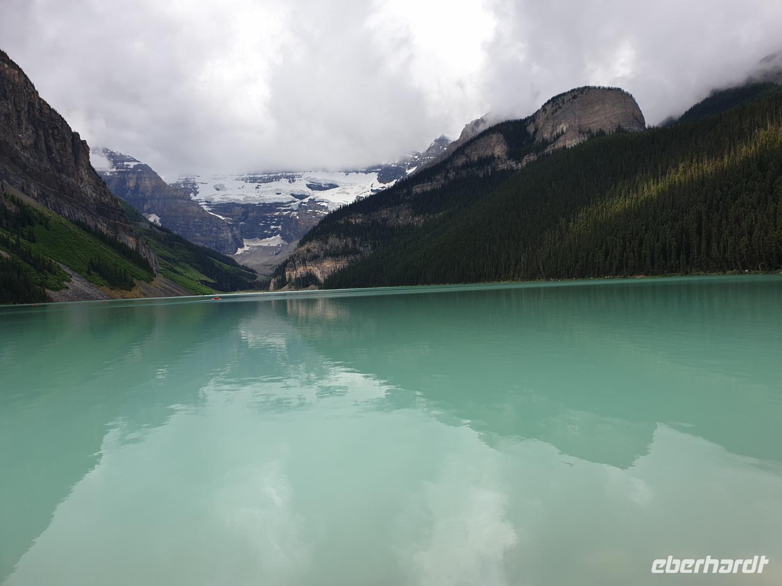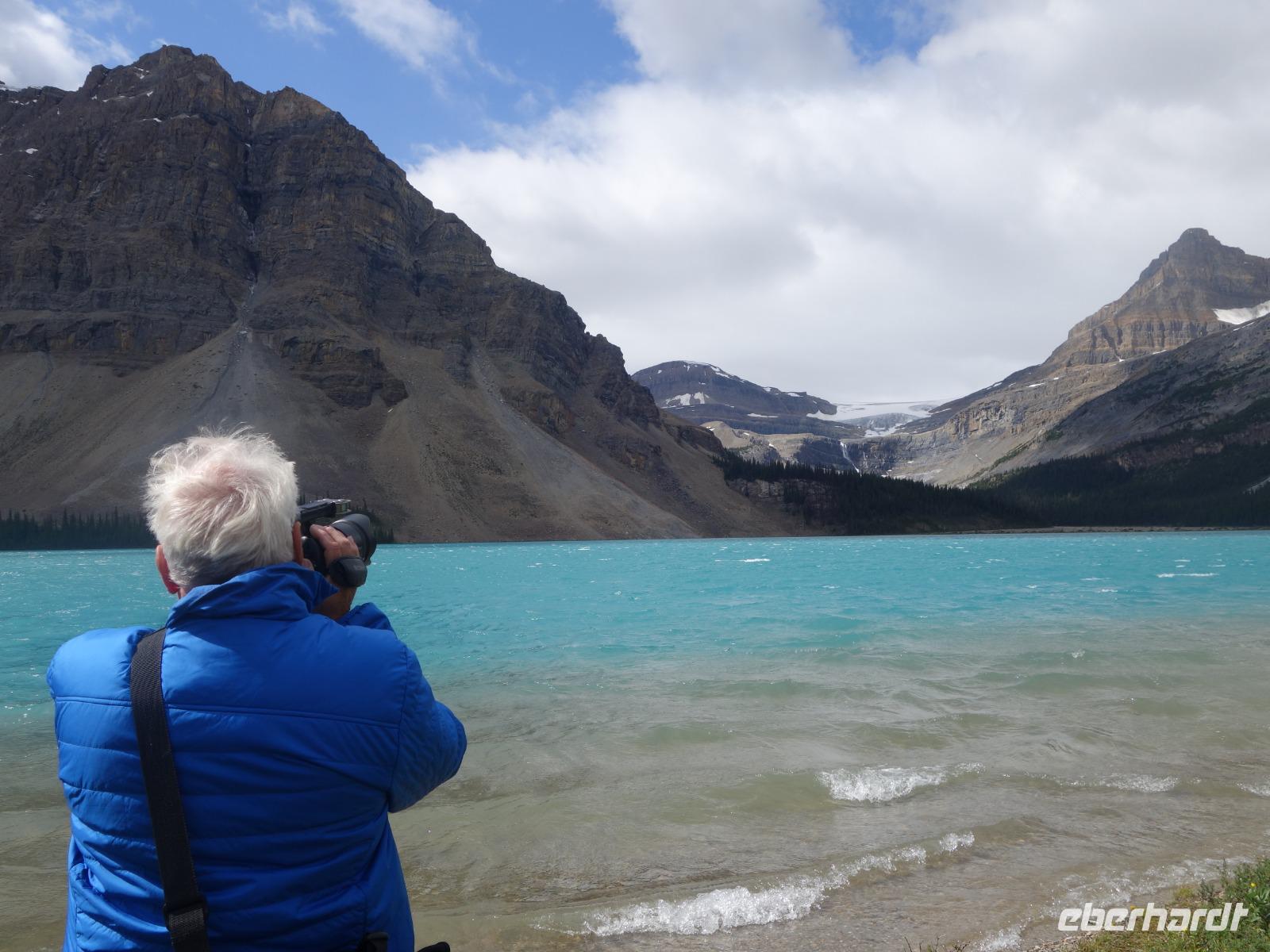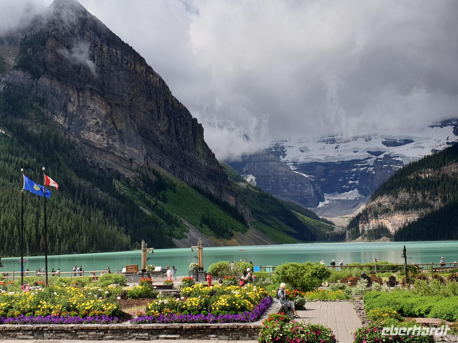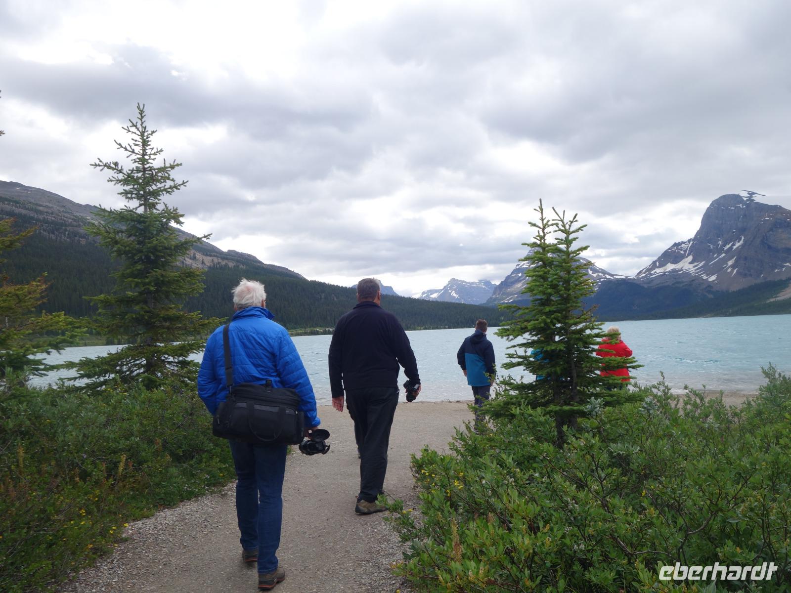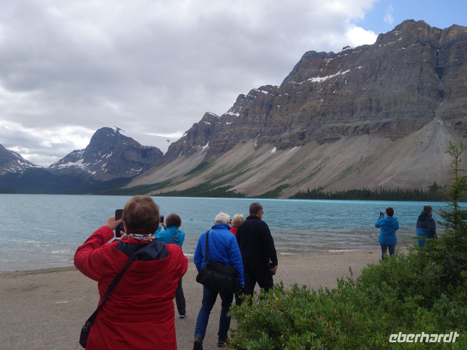 Unser Verkehrsmittel ist heute aber der Bus und der bringt uns direkt in den Banff Nationalpark. Hier führt uns der Icefield Parkway Richtung Norden bis wir unser erstes Highlight des Tages erreichen, den Lake Louise. Diesen wunderschönen Bergsee erreichen wir zu Fuß und genießen das klar blaue Wasser inmitten einer Bergkulisse - allerdings bei kühlen Temperaturen. Wir spazieren am See entlang, vorbei am Nobelhotel „The Fairmount Chateau Lake Louise" und atmen die klare, frische Luft ein. Nicht weit vom Lake Louise und vielleicht farblich noch ein bisschen reizvoller befindet sich der Morraine Lake (14km entfernt und 150m höher). Das Umfeld hier ist noch ursprünglicher als beim Lake Louise.