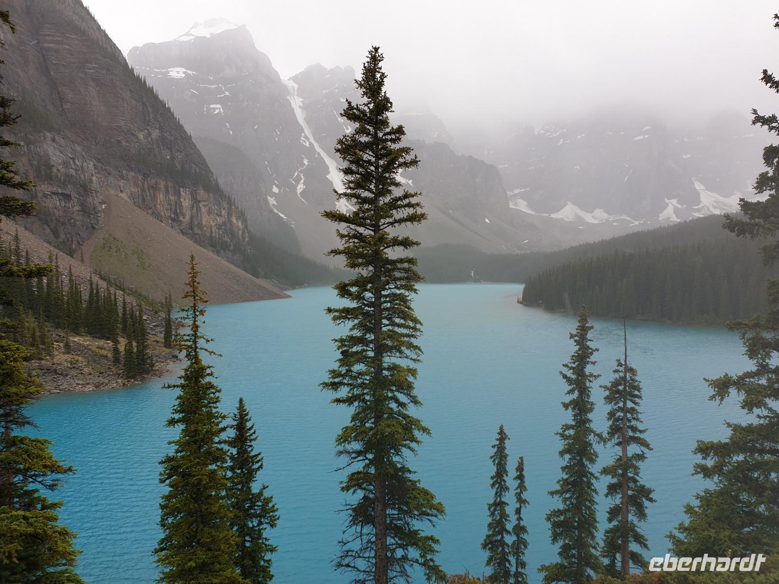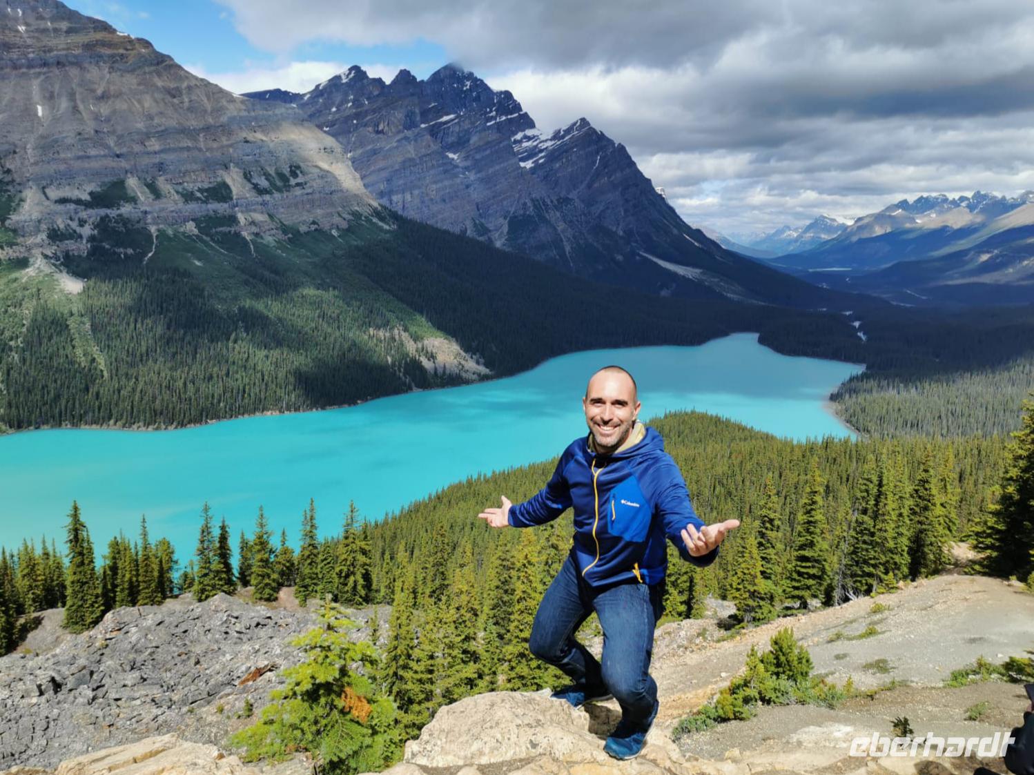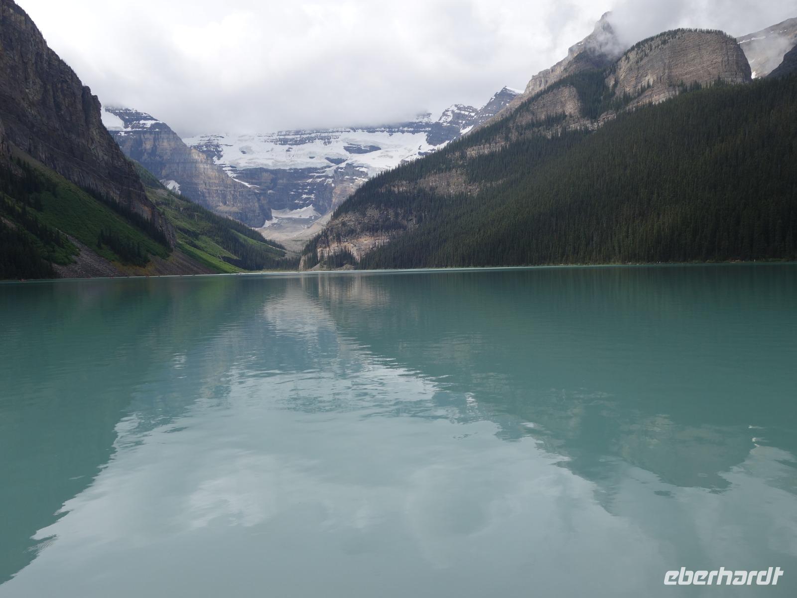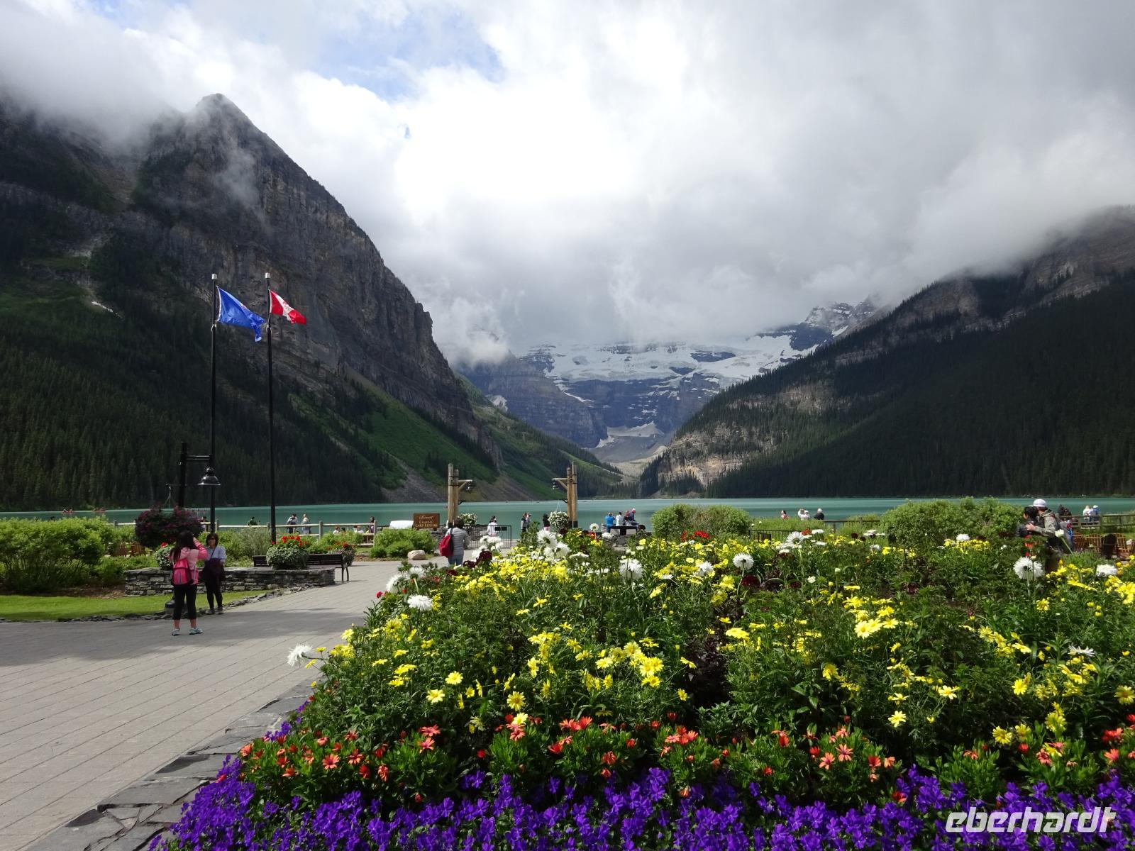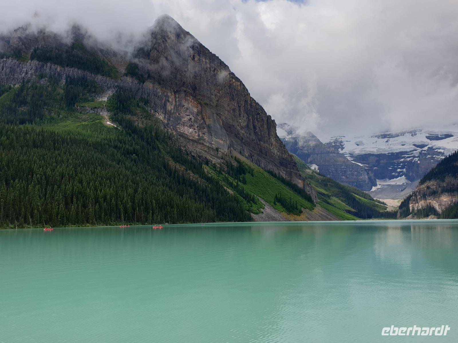 Unser Verkehrsmittel ist heute aber der Bus und der bringt uns direkt in den Banff Nationalpark. Hier führt uns der Icefield Parkway Richtung Norden bis wir unser erstes Highlight des Tages erreichen, den Lake Louise. Diesen wunderschönen Bergsee erreichen wir zu Fuß und genießen das klar blaue Wasser inmitten einer Bergkulisse - allerdings bei kühlen Temperaturen. Wir spazieren am See entlang, vorbei am Nobelhotel „The Fairmount Chateau Lake Louise" und atmen die klare, frische Luft ein. Nicht weit vom Lake Louise und vielleicht farblich noch ein bisschen reizvoller befindet sich der Morraine Lake (14km entfernt und 150m höher). Das Umfeld hier ist noch ursprünglicher als beim Lake Louise.