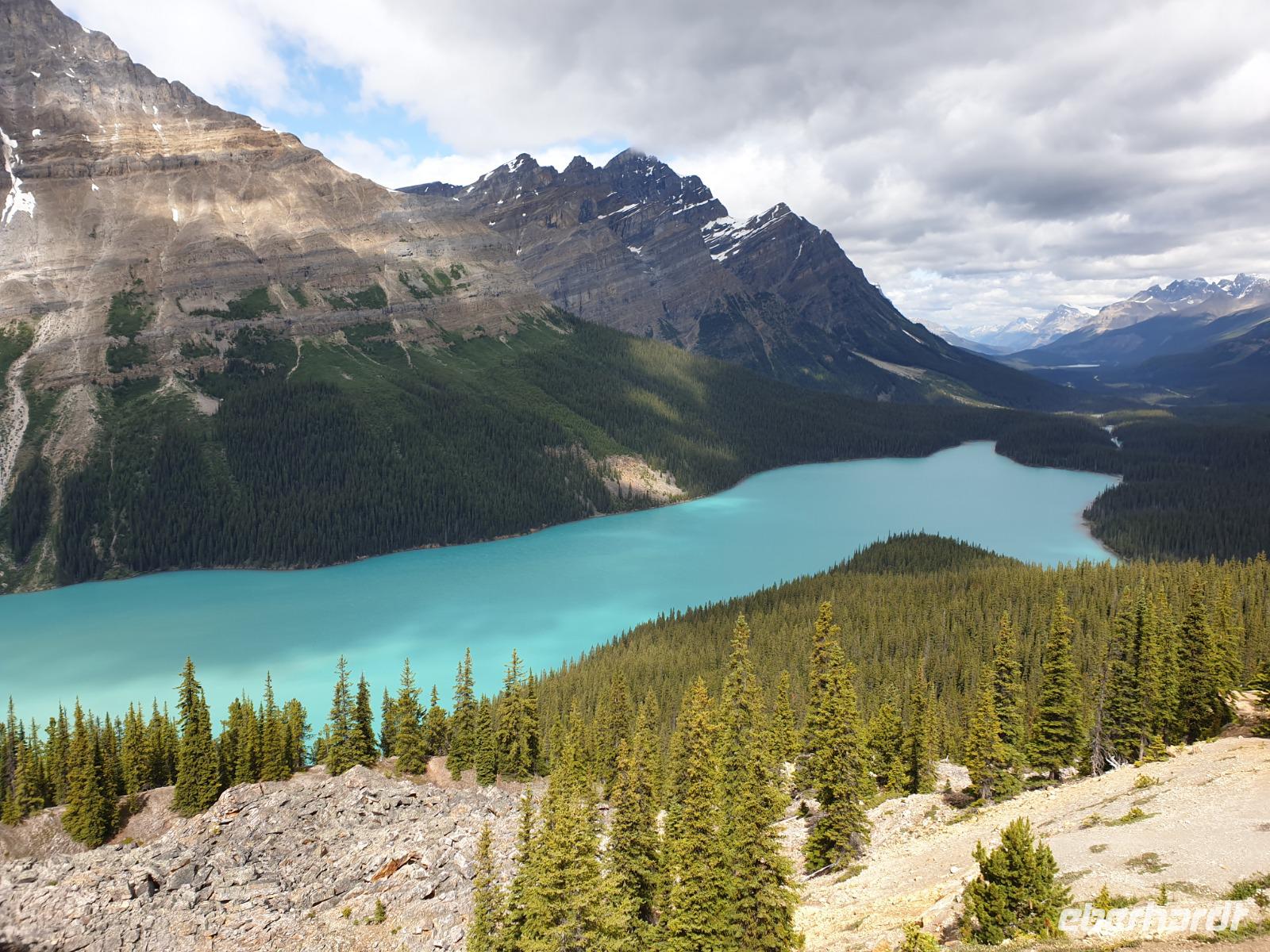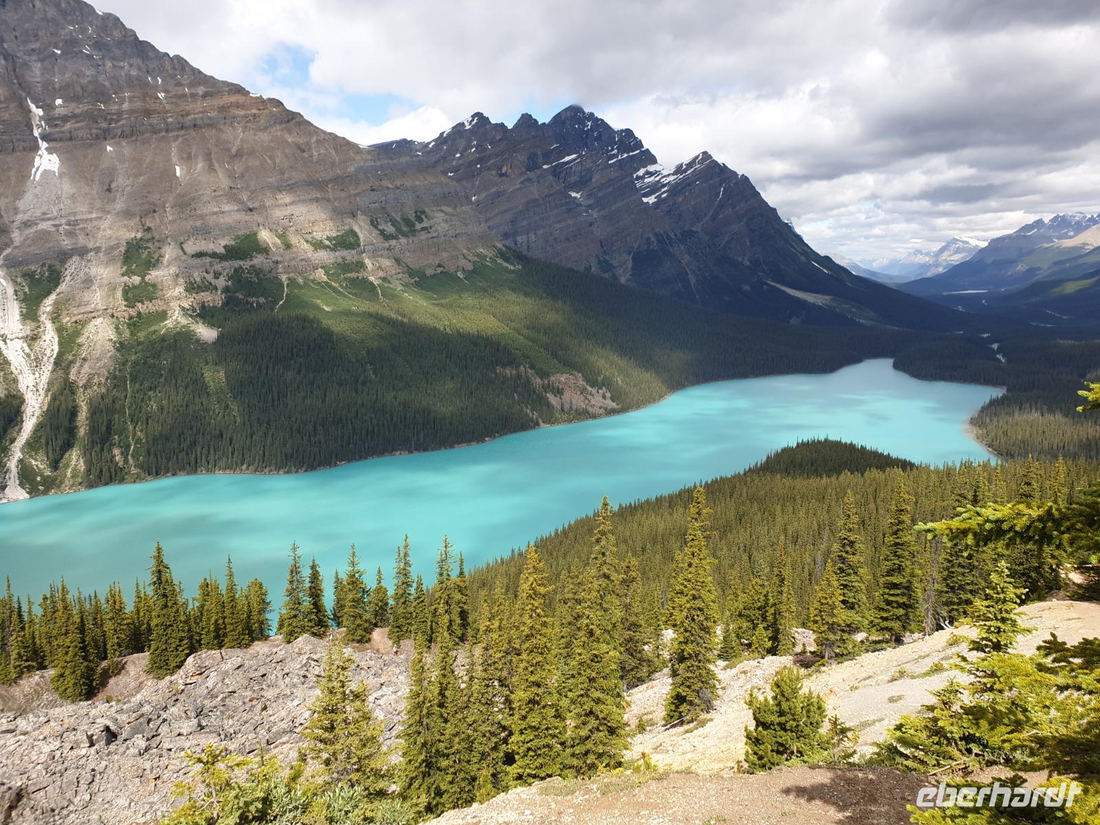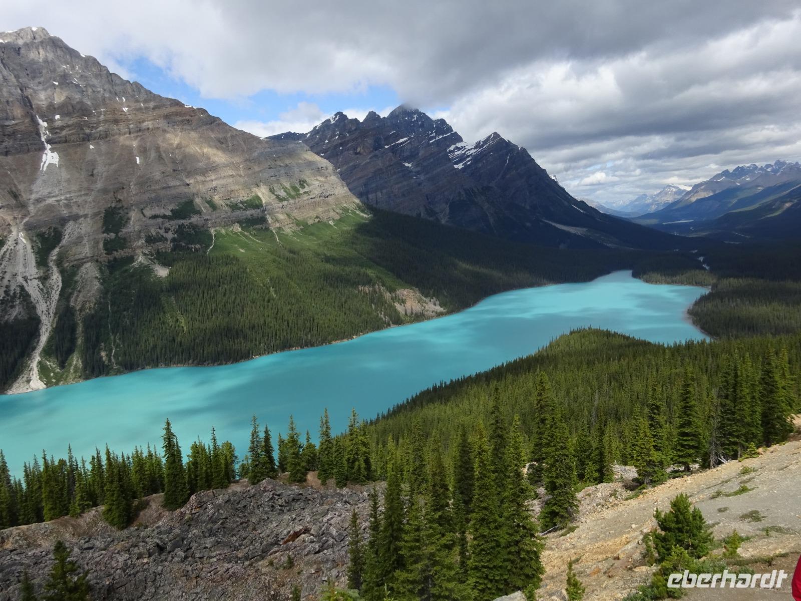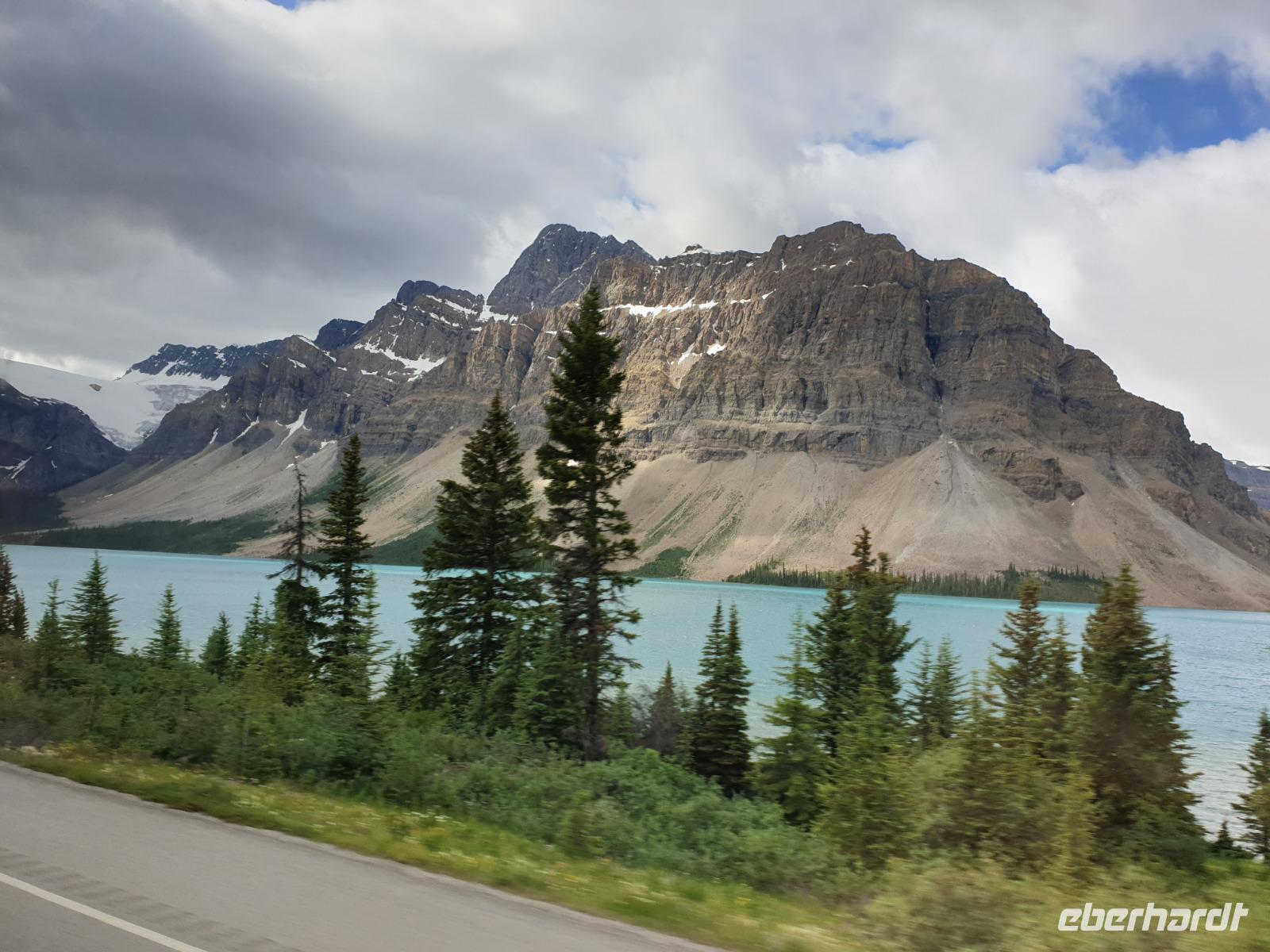 Wir starten den Tag und durchqueren erstmal den Banff National Park Richtung Lake Louise, um dann weiter in den Jasper National Park zu kommen. Unser erster Stopp auf dem Icefield Parkway ist der Bow Summit auf 2.135m am Fuße des Peyto Gletscher. Der Peyto Gletscher füllte einst das gesamte Tal aus, aber heute ist nur noch die Gletscher Zunge samt Peyto Lake zu sehen. Kürzlich hat man en 3.000 Jahre altes Holz unter dem Eis gefunden, was darauf schließen lässt, dass hier früher alles einmal bewaldet gewesen sein muss. Der Lake Peyto fasziniert mit seinem blauen Wasser. Warum der See so blau ist? Das Gletscher Wasser ist für sich genommen ziemlich matschig und voll mit kleinen Steinen und Sedimenten. Wenn der Strom langsamer wird setzen sich aber die Sedimente mehr und mehr im Delta ab und das Gletschermehl (ein feiner Staub) bleibt zurück im Wasser und absorbiert die blauen und grünen Lichtstrahlen der Sonne - des führt zu der speziellen blauen Farbe des Wassers in vielen Gletscherseen.