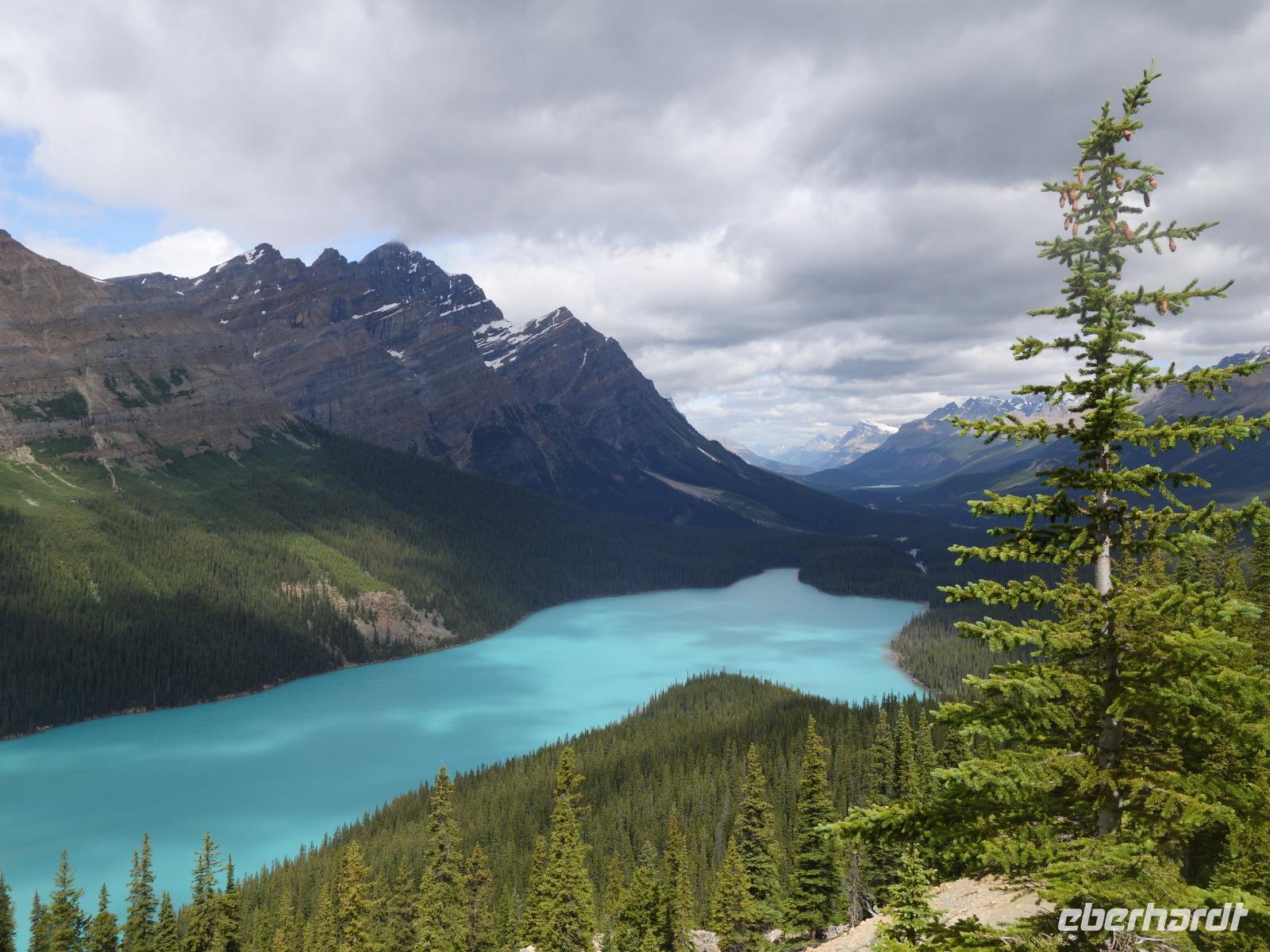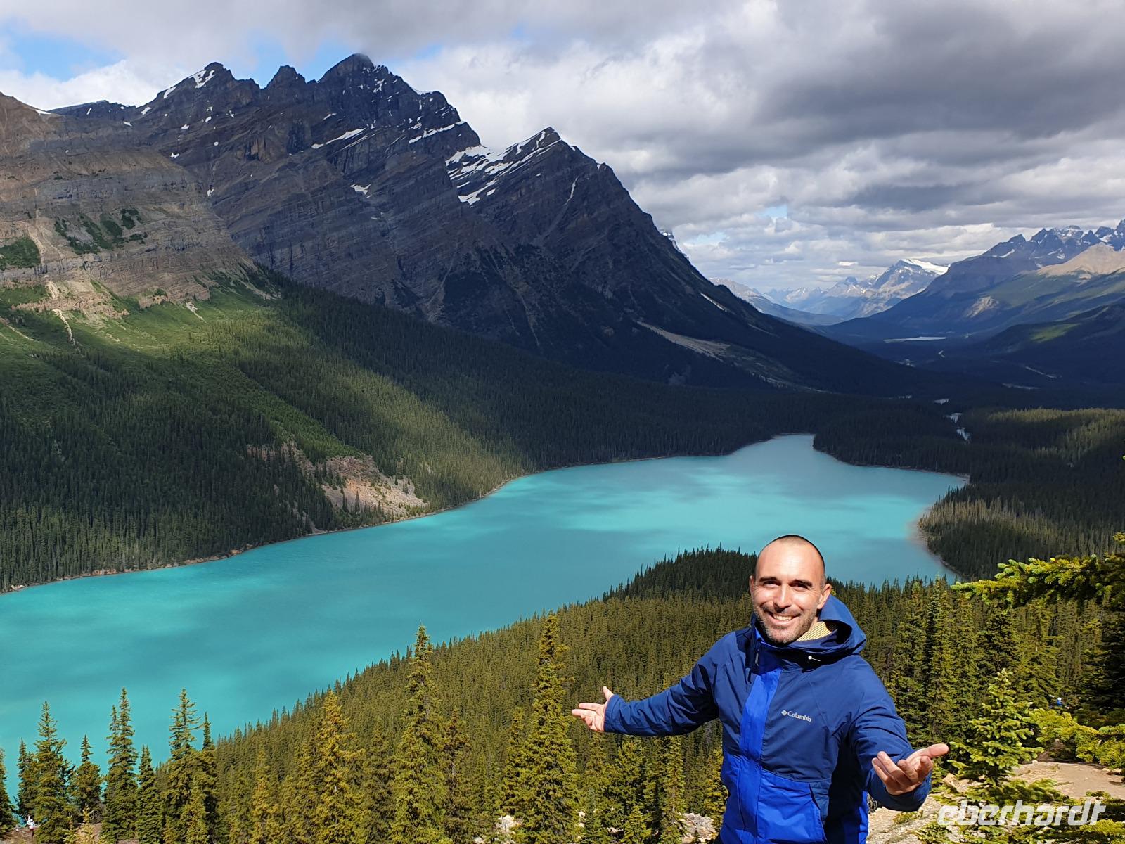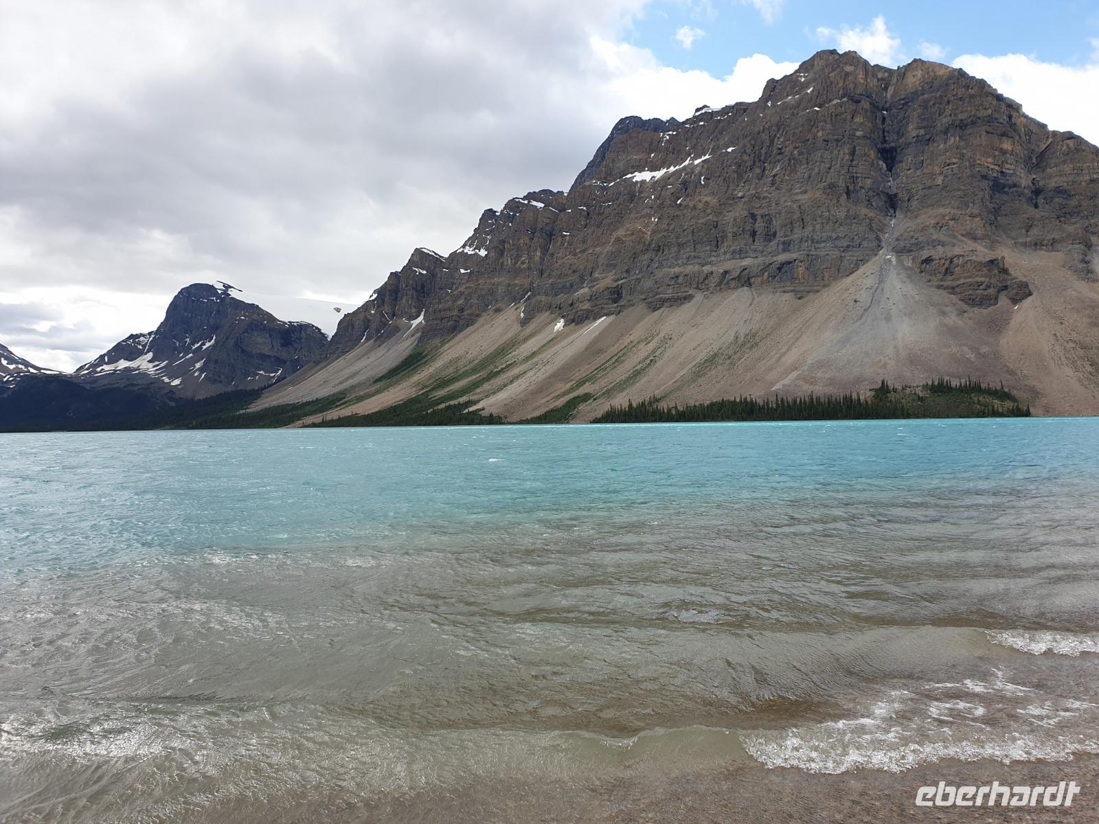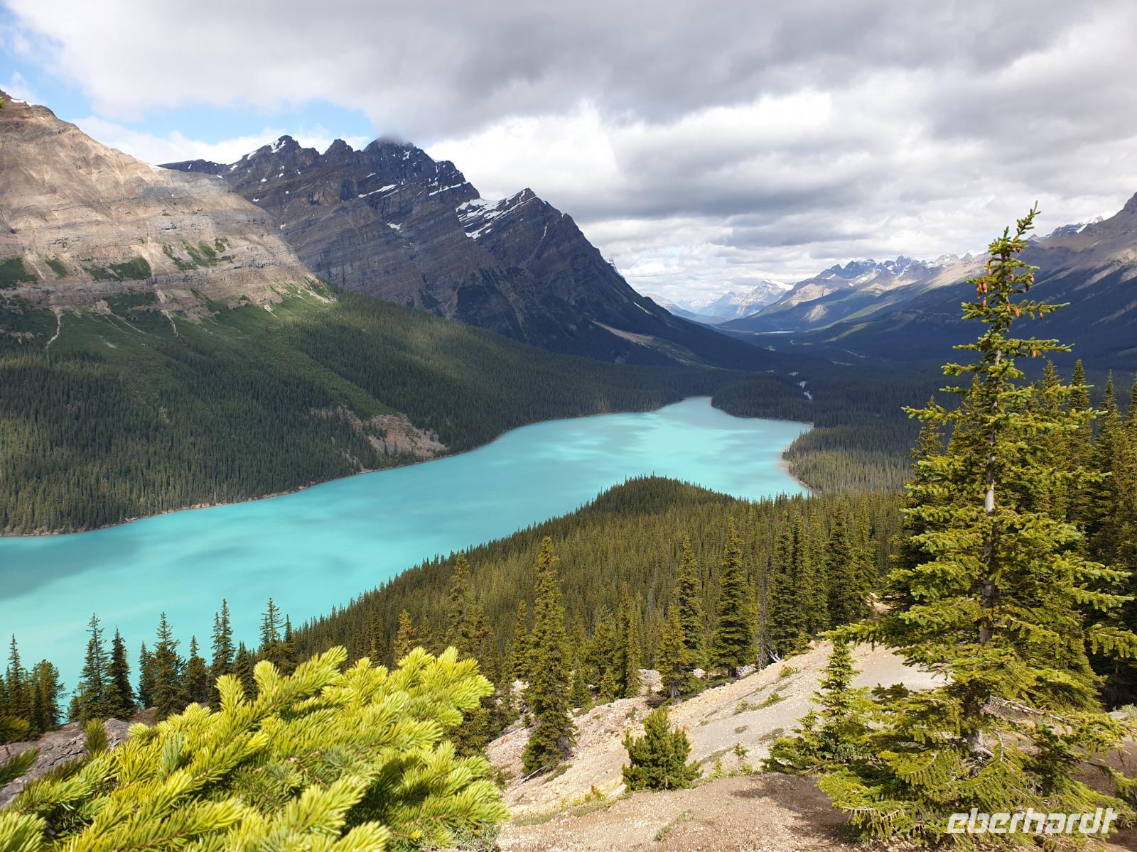 Wir starten den Tag und durchqueren erstmal den Banff National Park Richtung Lake Louise, um dann weiter in den Jasper National Park zu kommen. Unser erster Stopp auf dem Icefield Parkway ist der Bow Summit auf 2.135m am Fuße des Peyto Gletscher. Der Peyto Gletscher füllte einst das gesamte Tal aus, aber heute ist nur noch die Gletscher Zunge samt Peyto Lake zu sehen. Kürzlich hat man en 3.000 Jahre altes Holz unter dem Eis gefunden, was darauf schließen lässt, dass hier früher alles einmal bewaldet gewesen sein muss. Der Lake Peyto fasziniert mit seinem blauen Wasser. Warum der See so blau ist? Das Gletscher Wasser ist für sich genommen ziemlich matschig und voll mit kleinen Steinen und Sedimenten. Wenn der Strom langsamer wird setzen sich aber die Sedimente mehr und mehr im Delta ab und das Gletschermehl (ein feiner Staub) bleibt zurück im Wasser und absorbiert die blauen und grünen Lichtstrahlen der Sonne - des führt zu der speziellen blauen Farbe des Wassers in vielen Gletscherseen.