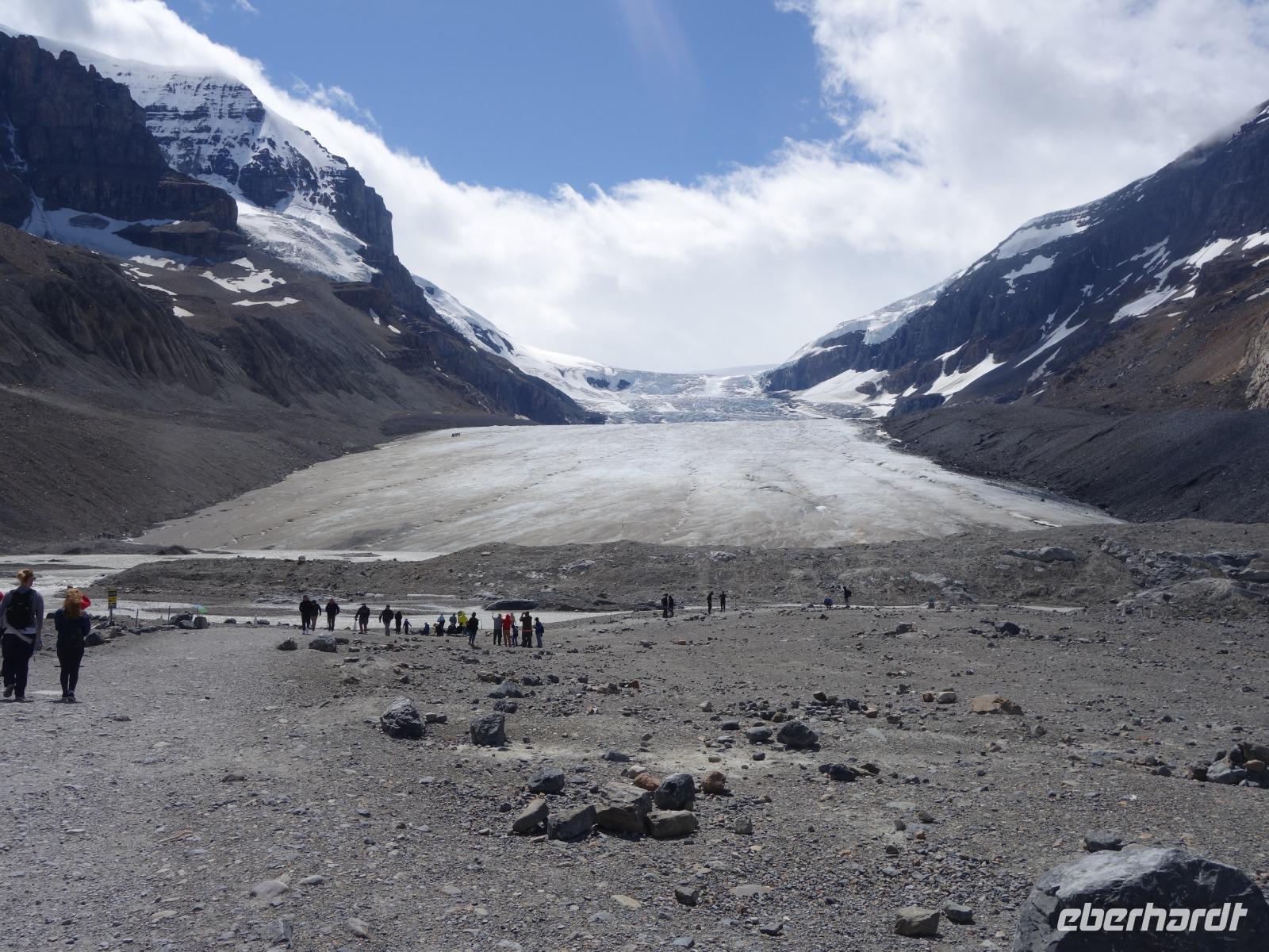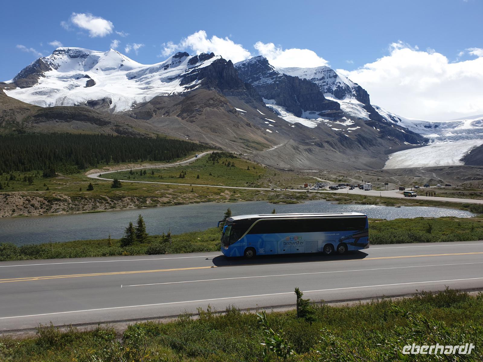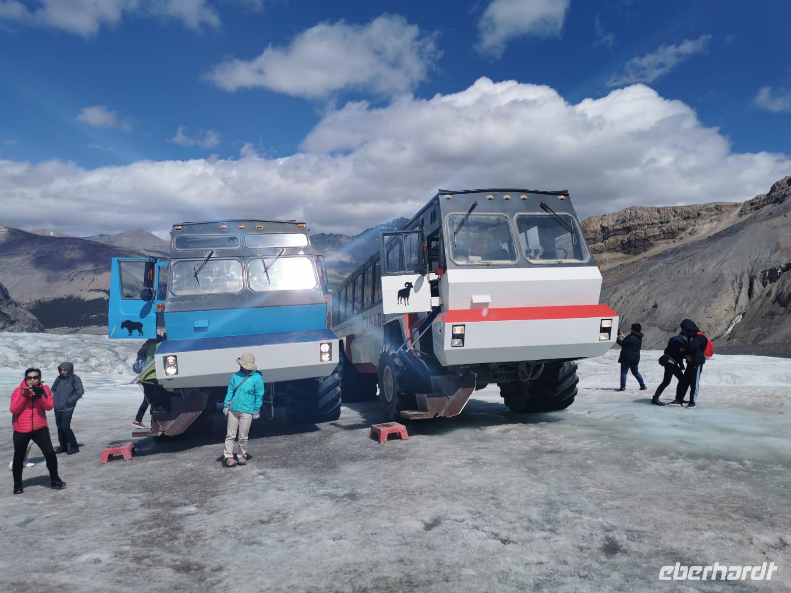 Das Eisfeld selbst liegt verborgen vor unseren Augen in der Höhe der Berge. Der Athabasca Gletscher ist hingegen von der Straße und dem Besucherzentrum gut sichtbar. Ein Teil der Gruppe fährt in großen Spezialbussen mit überdimensional großen Reifen über die südöstliche Gletschermoräne auf die Gletscherzunge. Eine echte Abenteuerfahrt und ein einmaliges Gefühl den Gletscher in einer sicheren Zone betreten zu können. Die andere Gruppe kann individuell den Fuß des Gletschers erreichen.
