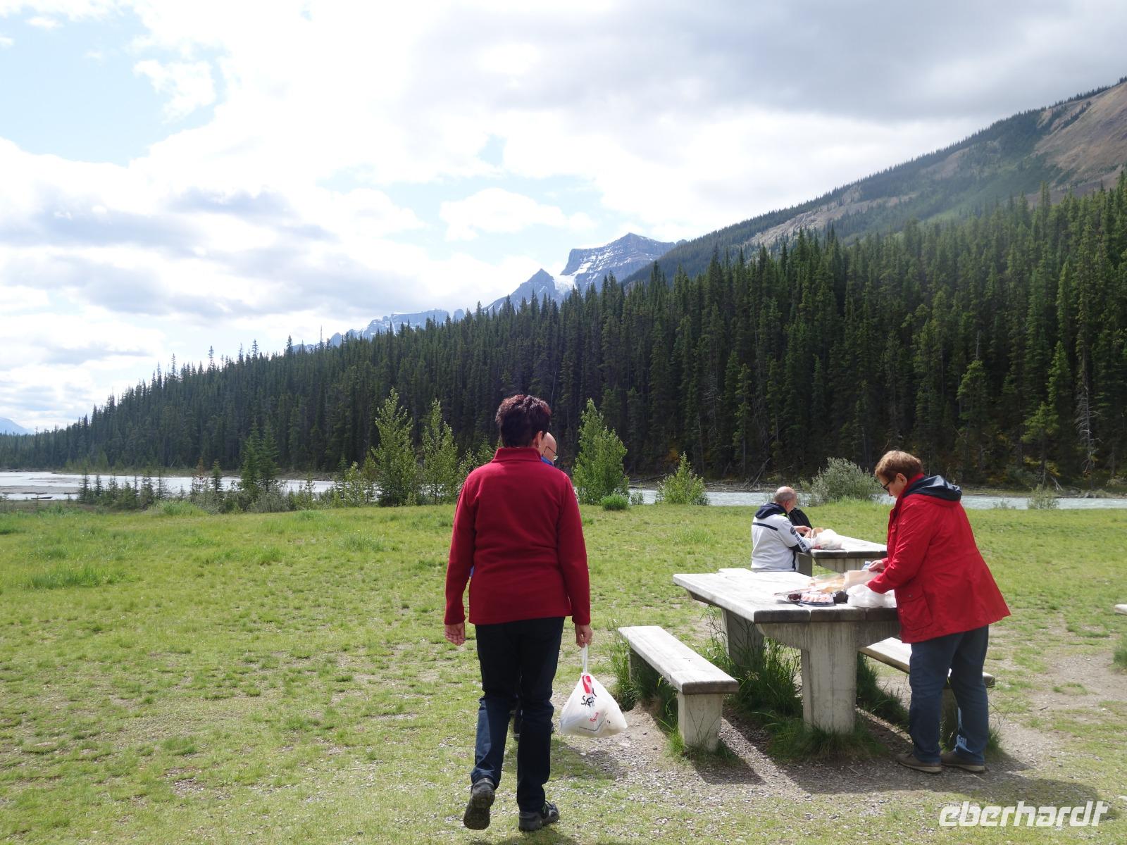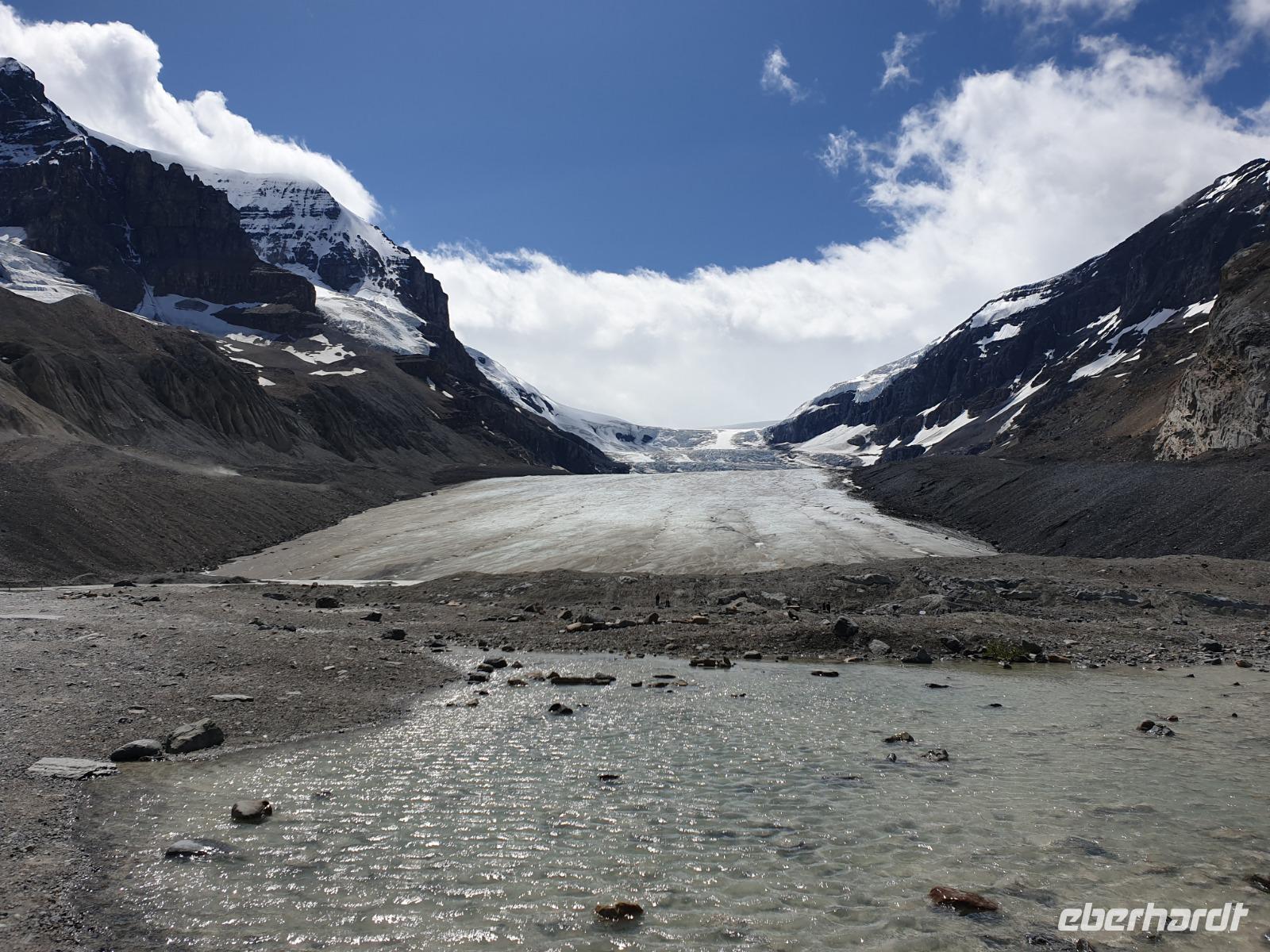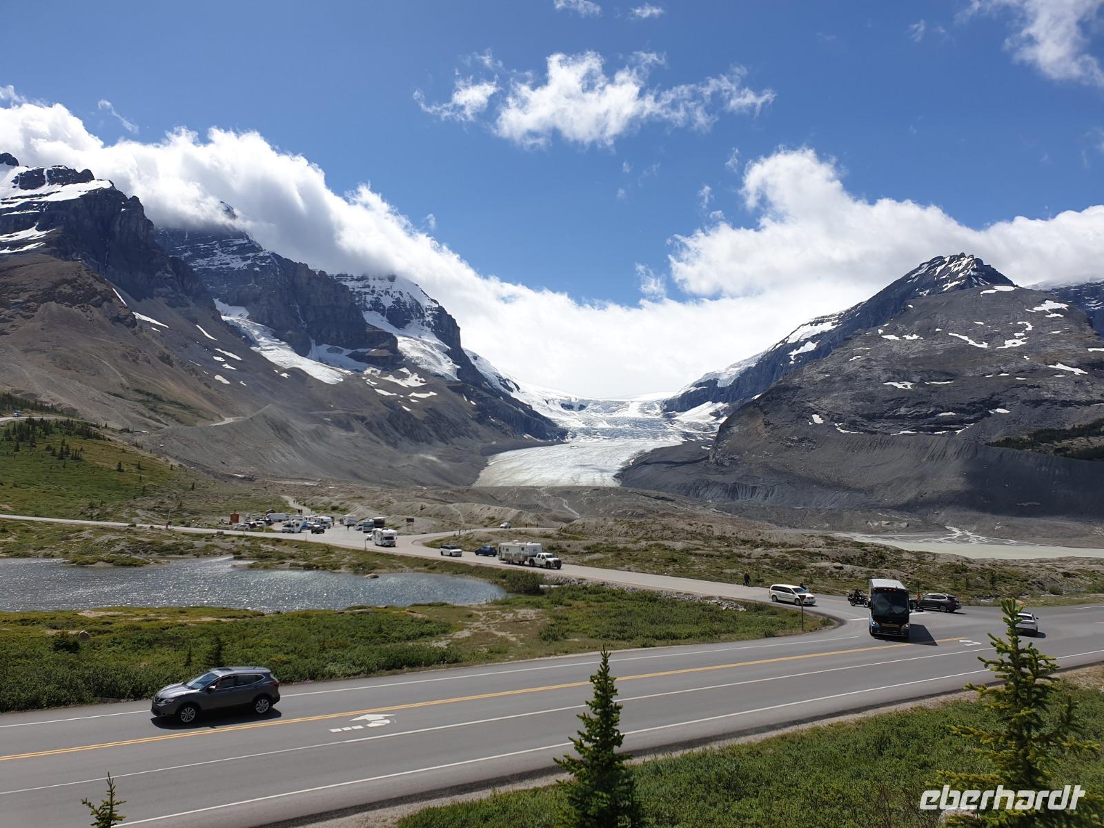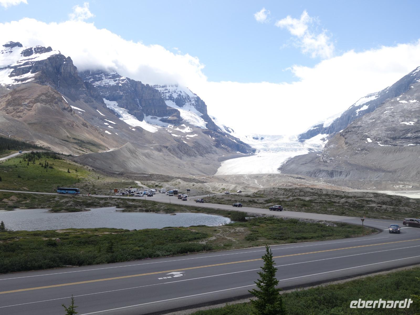 Das Eisfeld selbst liegt verborgen vor unseren Augen in der Höhe der Berge. Der Athabasca Gletscher ist hingegen von der Straße und dem Besucherzentrum gut sichtbar. Ein Teil der Gruppe fährt in großen Spezialbussen mit überdimensional großen Reifen über die südöstliche Gletschermoräne auf die Gletscherzunge. Eine echte Abenteuerfahrt und ein einmaliges Gefühl den Gletscher in einer sicheren Zone betreten zu können. Die andere Gruppe kann individuell den Fuß des Gletschers erreichen.