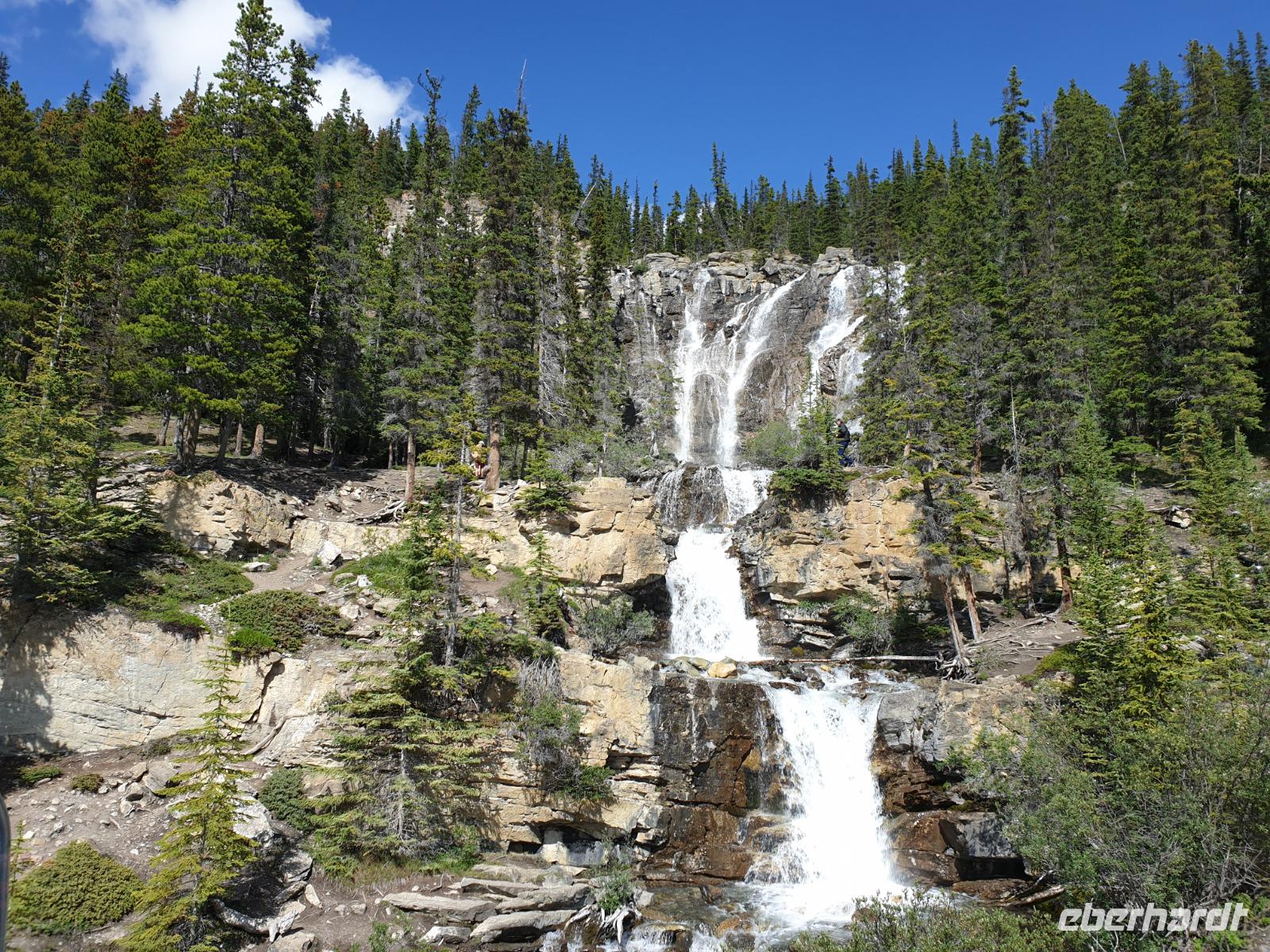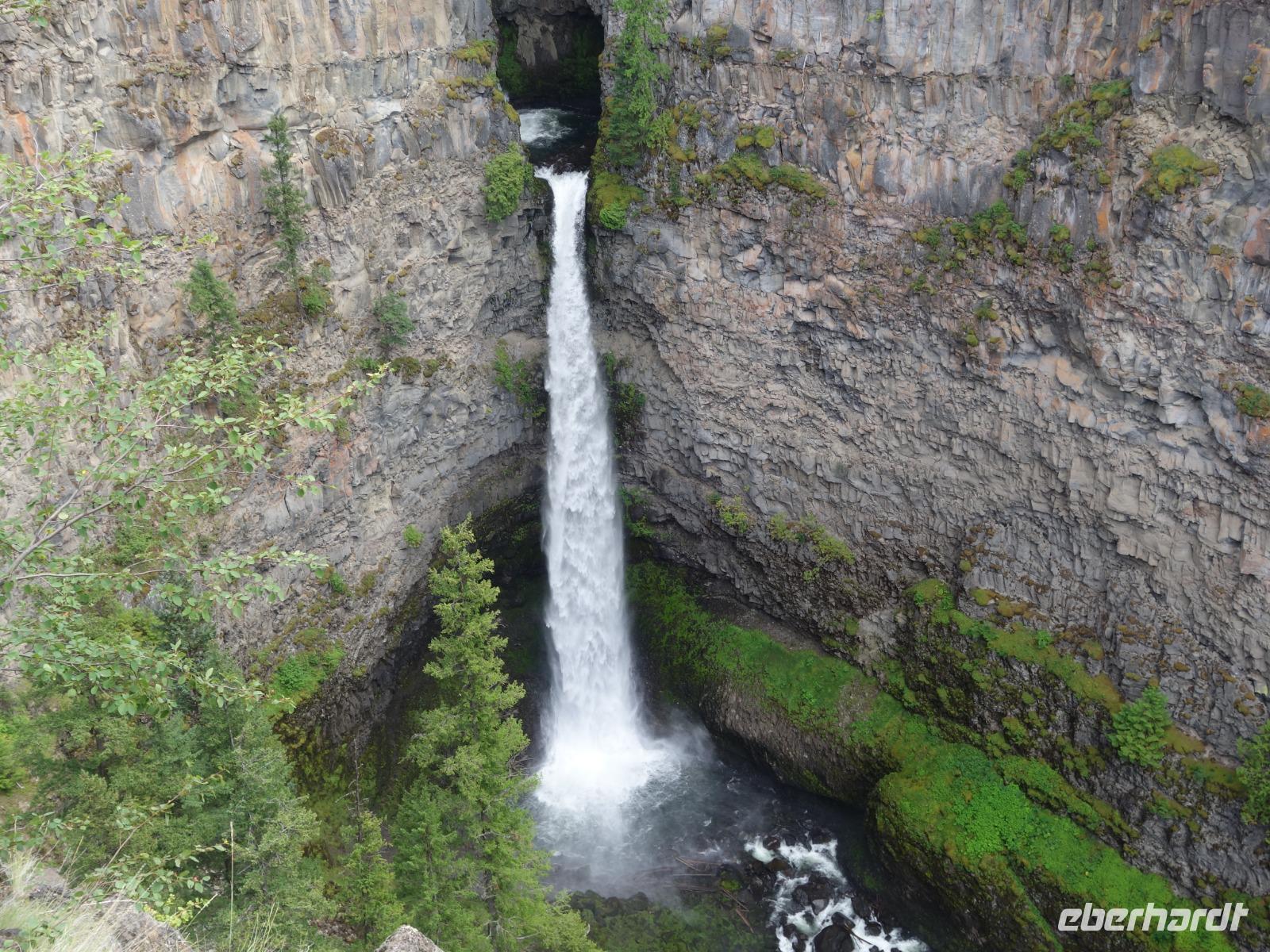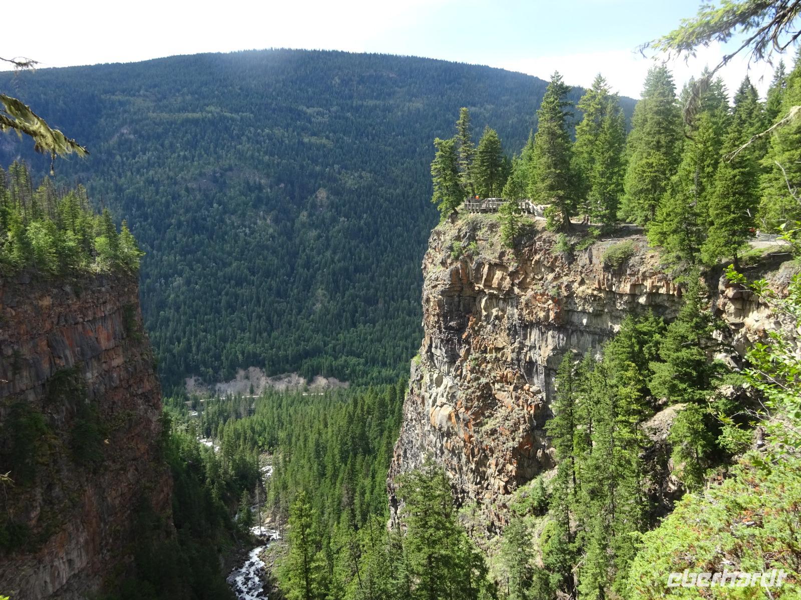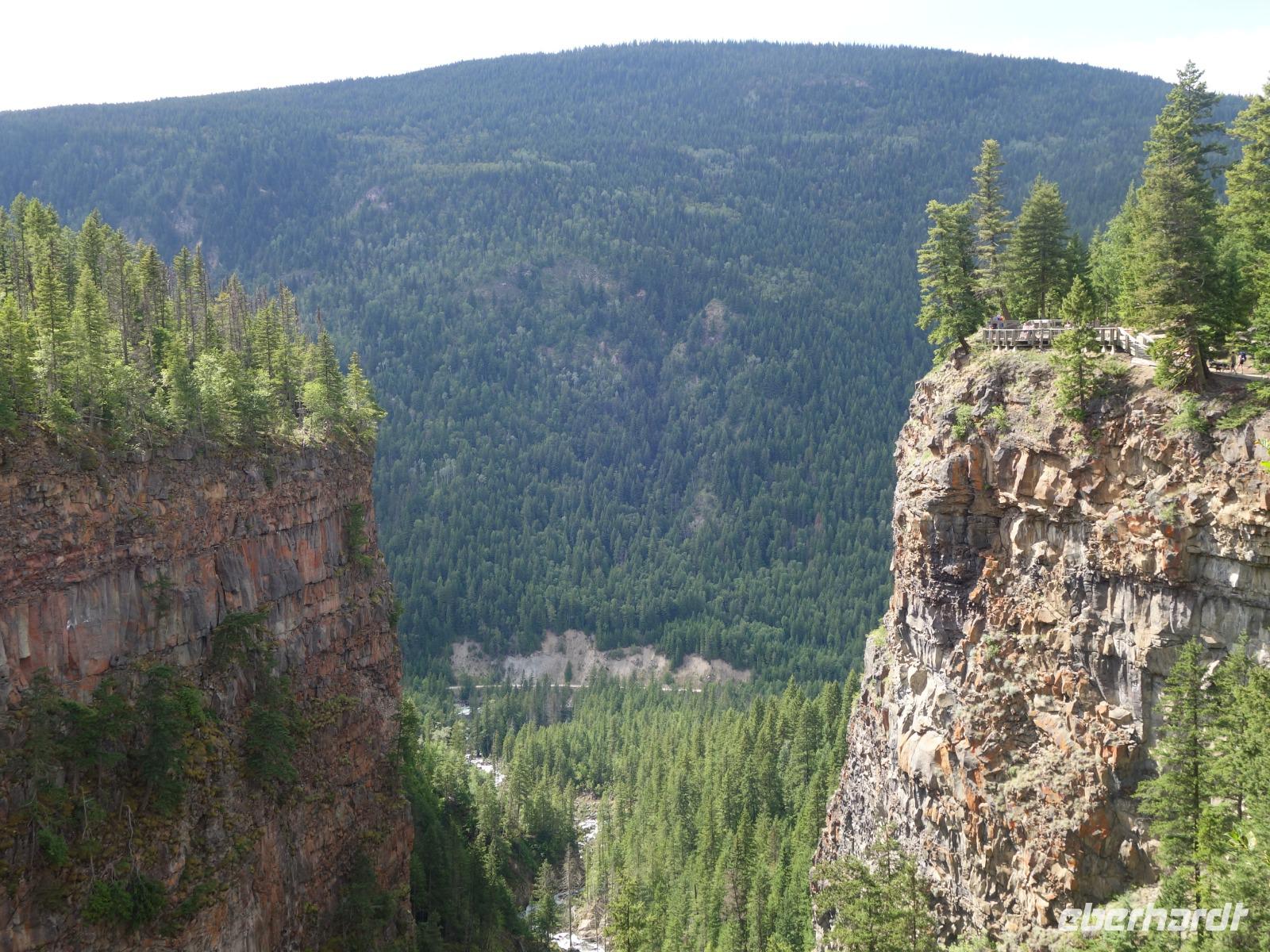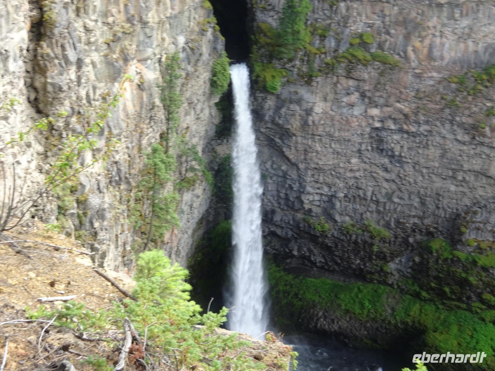 Unseren letzten Stopp und Spaziergang legen wir an den Helmcken Wasserfällen ein. Einer der schönsten Attraktionen des Wells Gray Provincial Park sind eben diese Helmcken Wasserfälle, deren Wassermassen 137m über senkrecht abfallende Klippen hinunter in einen Kessel donnern. Ein 2km lange Weg führt uns nordseitig am Wasserfall vorbei und an den Rand der steilen Schlucht bis wir von unserem Bus wieder eingesammelt werden und unsere Fahrt fortsetzen können.