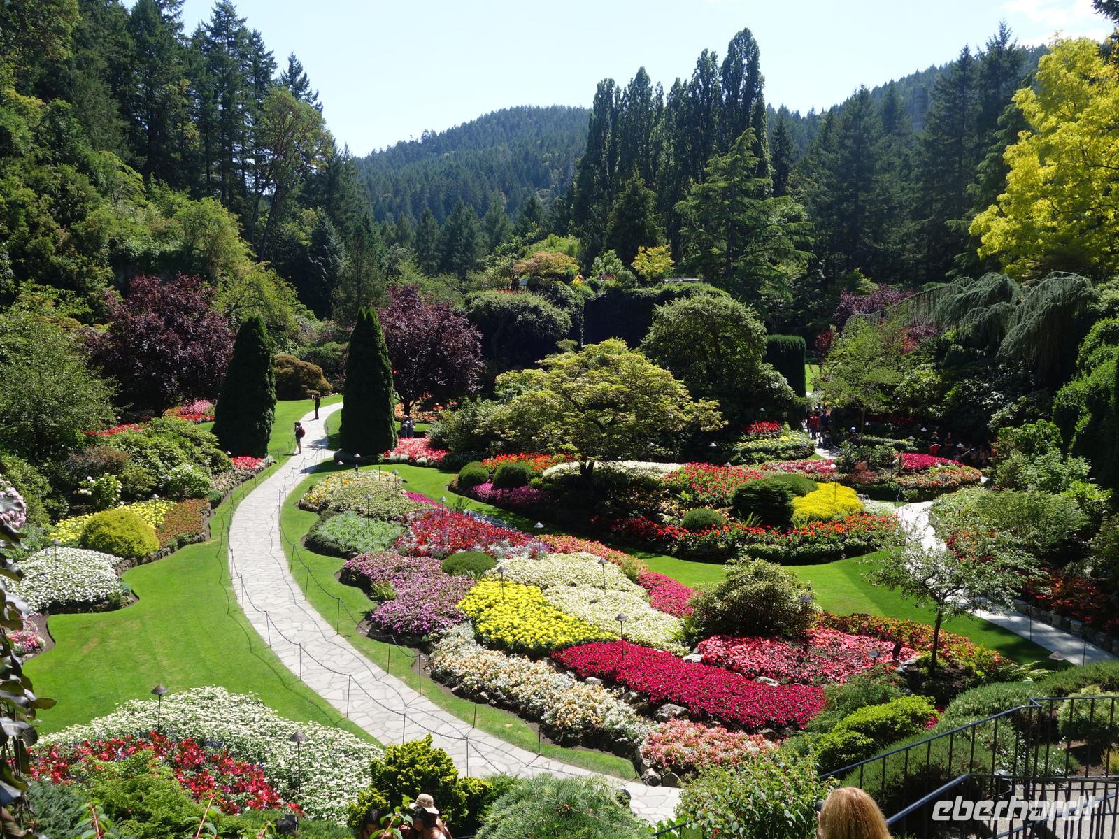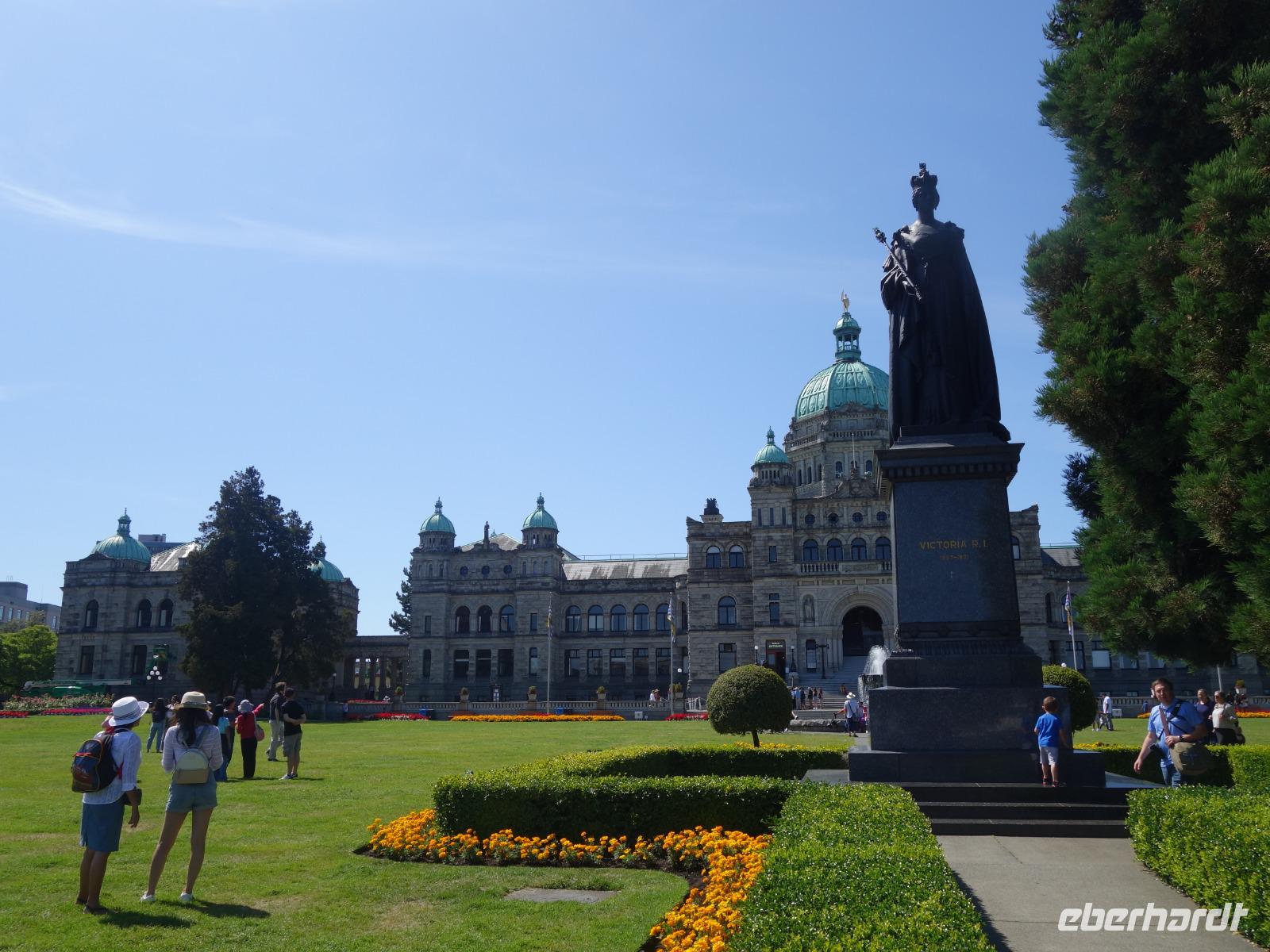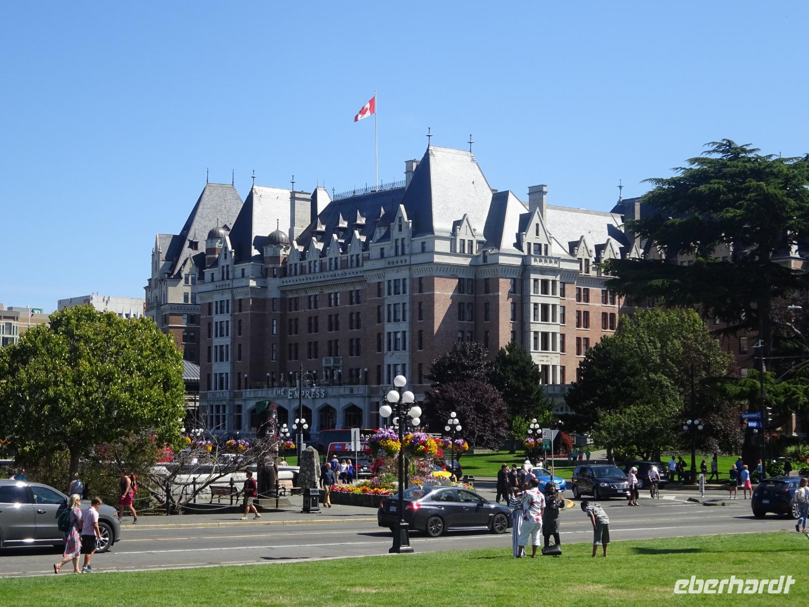 Der Tag beginnt für die Ausflügler sehr früh - um 6.30 Uhr frühstücken und um 7.30 Uhr gemeinsam mit Gudrun und Benjamin loszufahren, da um 9 Uhr die Fähre Richtung Swartz Bay erreicht werden muss. Wir setzen mit der Fähre auf die Insel Vancouver Island über. Während die Fahrt kann man draußen an die Sonne sitzen und die Landschaft genießen. In Swartz Bay sind wir um 10.30 Uhr. Nach der Überfahrt auf Vancouver Island erkunden wir erstmal die Provinzhauptstadt Victoria mit seinen prächtigen Gebäuden und herrlichen Grünanlagen. An der äußersten Südspitze von Vancouver Island befindet sich die Hauptstadt Victoria der Provinz British Columbia. Am Inner Harbour präsentiert sich das prächtige Parlamentsgebäude inmitten gepflegter Grünanlagen. Von der Spitze der Kuppel glänzt die Statue von Captain George Vancouver, der die nach ihm benannte Insel als Erster umrundete. Wichtig hier ist das Parlament-Regierungsgebäude und die Hauptstraße mit Hafen zum Bummeln. Wir haben dafür genug Freizeit, um alles in Ruhe zu erleben bis wir uns wieder treffen, um gemeinsam zum Butchart Gardens zu fahren.