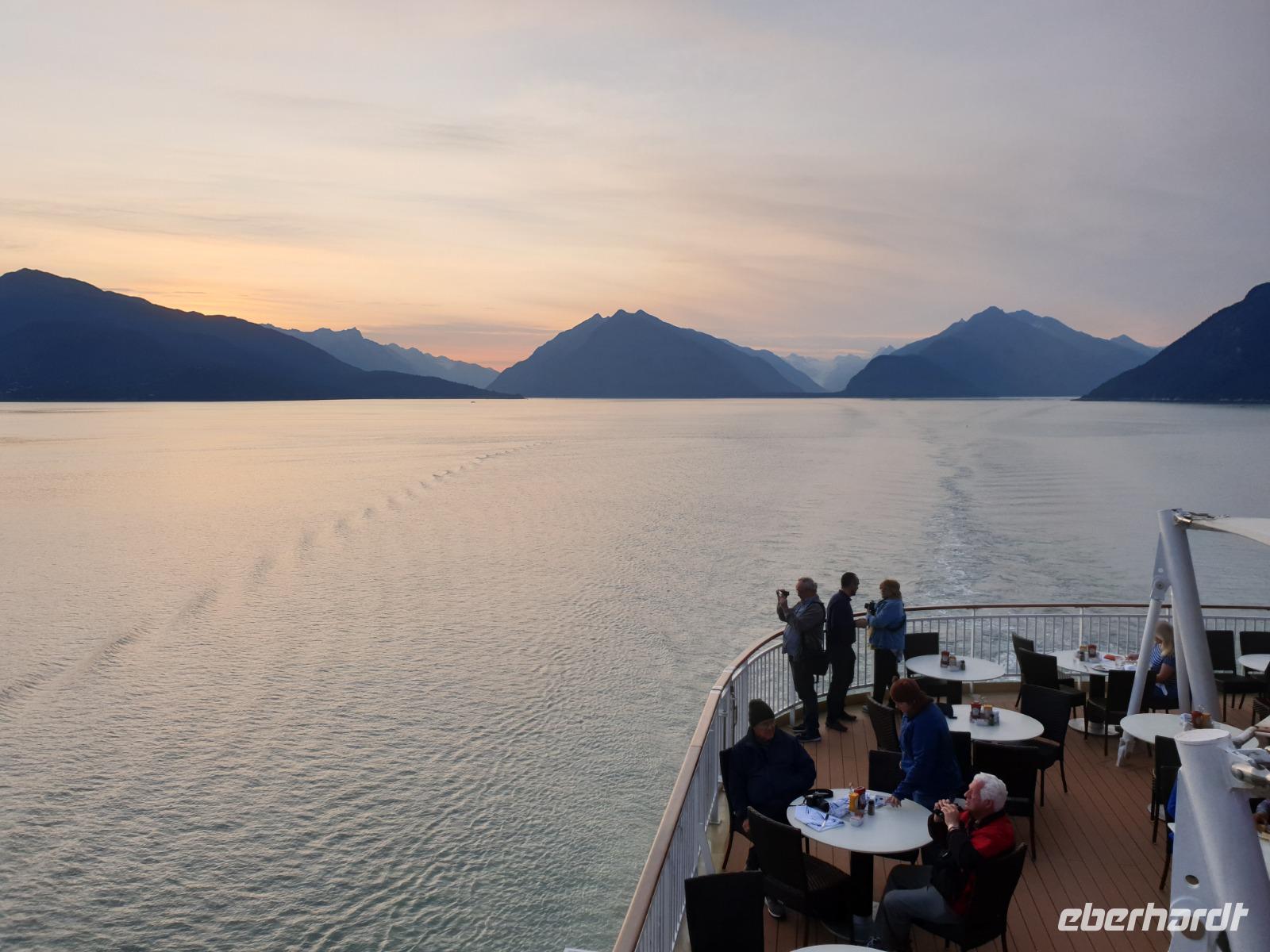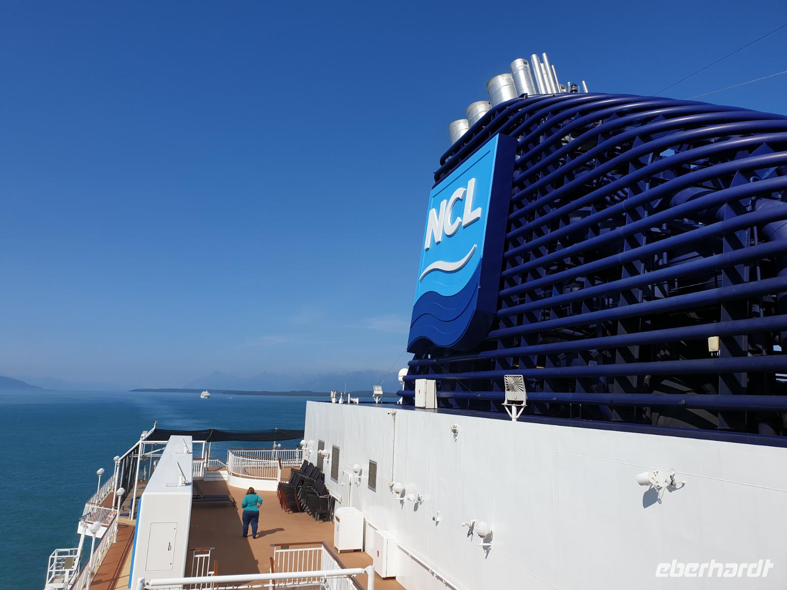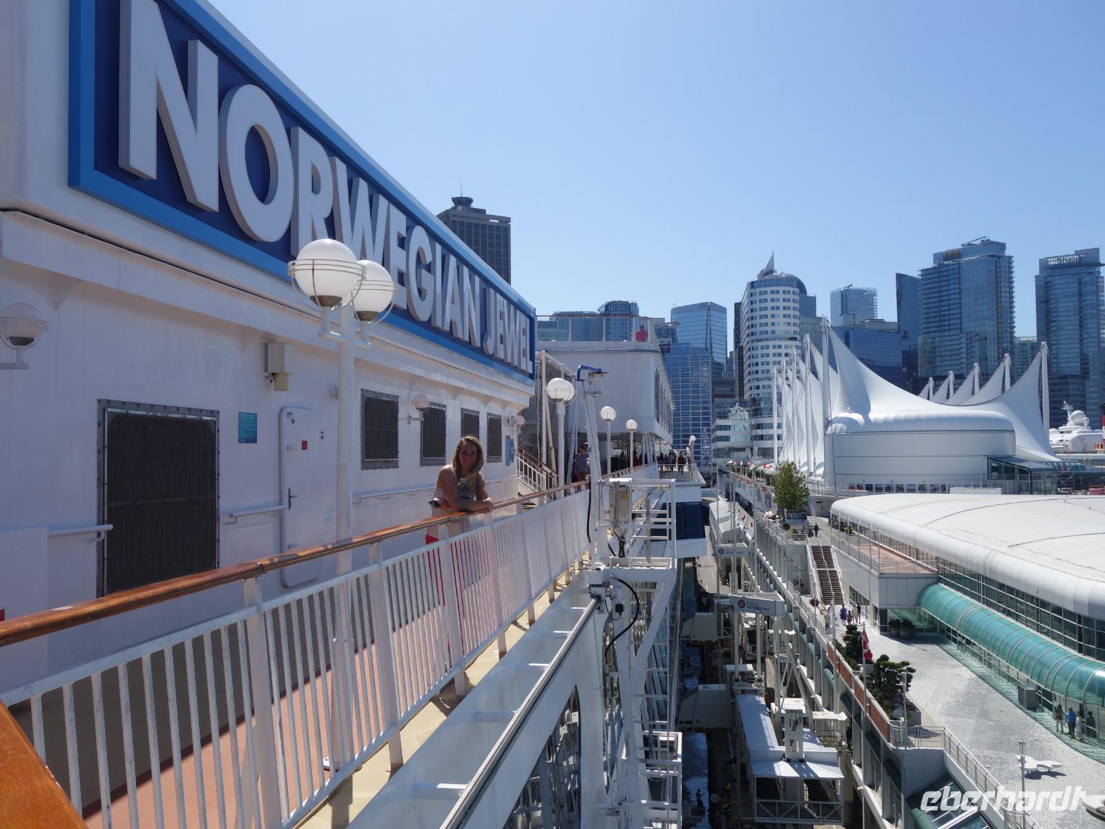 Heute beginnt der zweite Teil unsere große Rundreise - die Alaska Kreuzfahrt mit der „Norwegian Jewel" über Ketchikan, Juneau und Skagway bis Seward auf der sogenannten Inside Passage. Atemberaubende werden vor uns Tage liegen - aber erstmal müssen wir uns mit dem Schiff vertraut machen. Wir genießen auf Deck die letzten warmen Sonnenstrahlen in Vancouver bevor es weiter in den Norden geht und kälter werden wird.