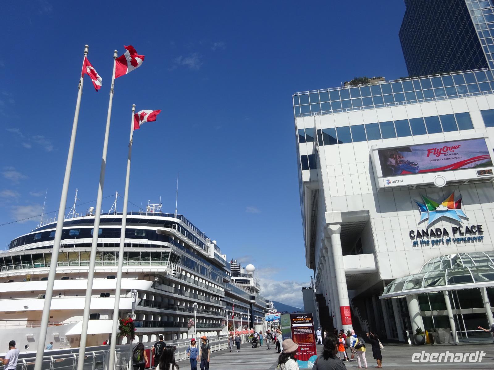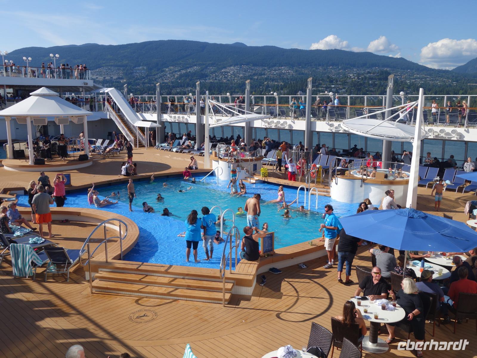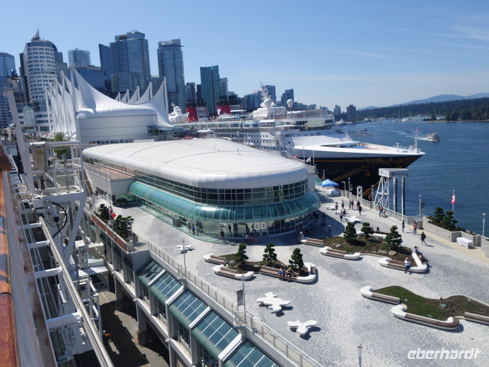 Heute beginnt der zweite Teil unsere große Rundreise - die Alaska Kreuzfahrt mit der „Norwegian Jewel" über Ketchikan, Juneau und Skagway bis Seward auf der sogenannten Inside Passage. Atemberaubende werden vor uns Tage liegen - aber erstmal müssen wir uns mit dem Schiff vertraut machen. Wir genießen auf Deck die letzten warmen Sonnenstrahlen in Vancouver bevor es weiter in den Norden geht und kälter werden wird.