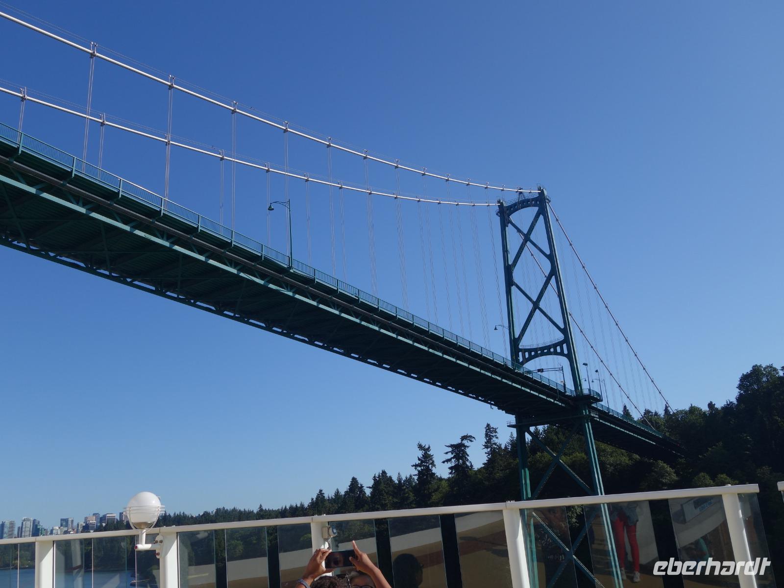 Weiter geht unsere Stadtrundfahrt Richtung Hafen, an dem uns dann auch bald unser Schiff die „Norwegian Jewel" für sieben Tage auf große Alaska Fahrt mitnehmen wird. Abgerundet wird der Tag mit einem Besuch im riesigen Stanley Park, der grünen Lunge Vancouvers. Wer hier sportlich ist, kann den Park auf einer 10 km langen Strecke entlang der Waterfront Promenade umlaufen oder mit dem Rad umrunden. Der Blick auf die Lions Bridge ist definitiv ein Muss. Wir haben ein großartiges Hotel, super zentral gelegen in Downtown und direktem Zugang in die Haupteinkaufstraße, der Robson Street von Vancouver. Von hier aus, kann man fast alle Sehenswürdigkeiten zu Fuß erlaufen und natürlich ausgiebig shoppen gehen. Unser Restaurant für den Abend ist ziemlich hipp. Um hier reinzukommen stehen die Gäste gerne Schlange. Nun ist auch schließlich auch Samstagabend, was den Andrang erhöht. Gut, dass wir für unsere Gruppe reserviert haben! Später startet noch ein Feuerwerk an der English Bay. So bietet die Stadt für jeden etwas und lädt nicht nur zum Erkunden ein, denn hier kann man definitiv auch mehr Zeit verbringen.