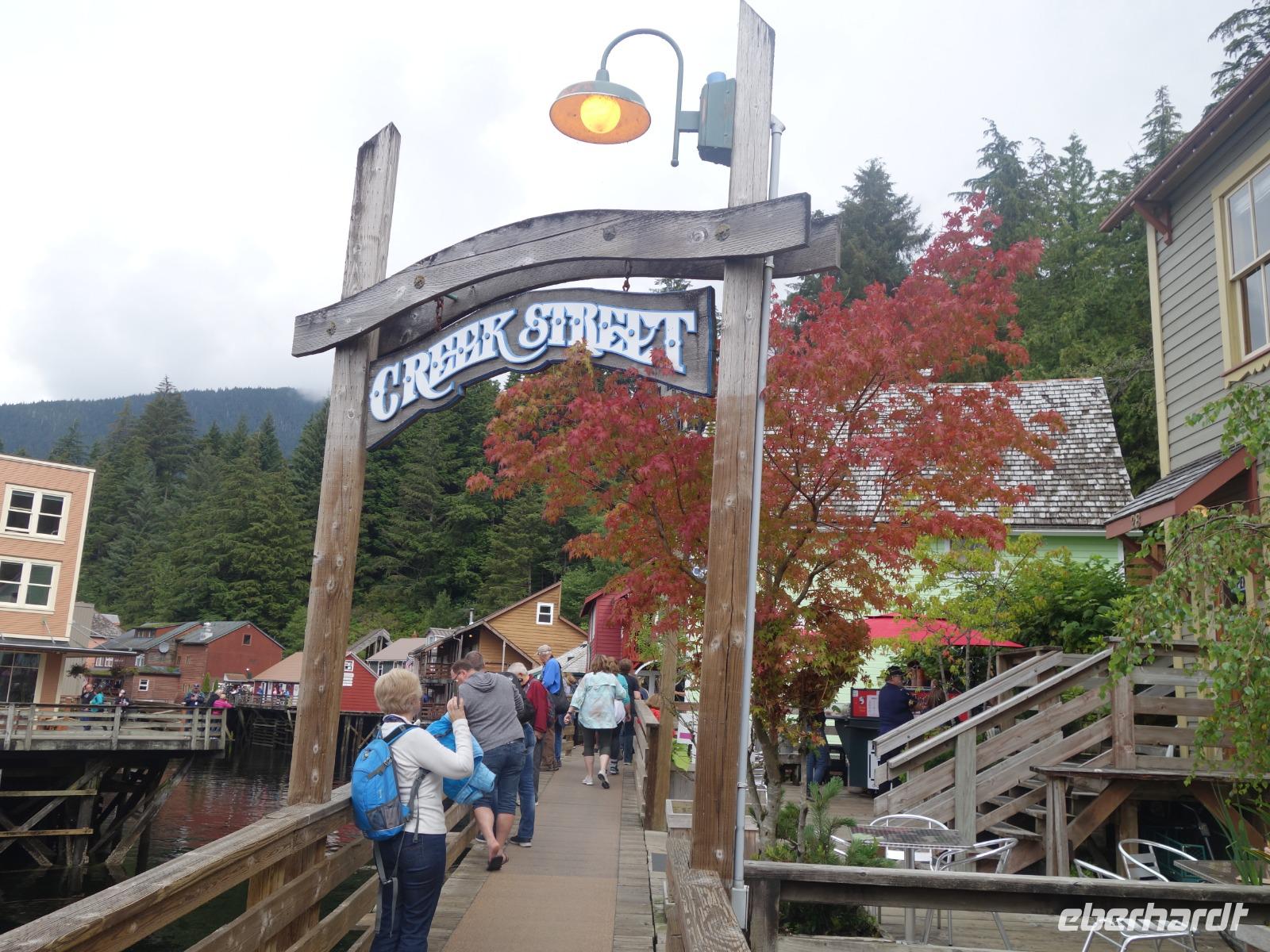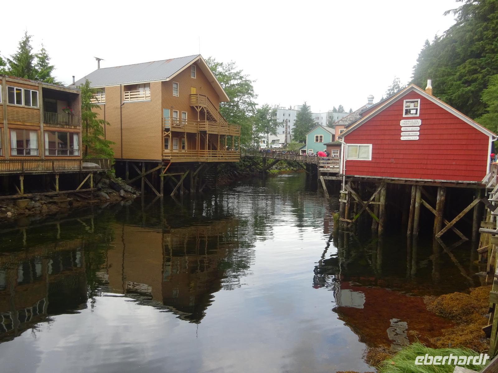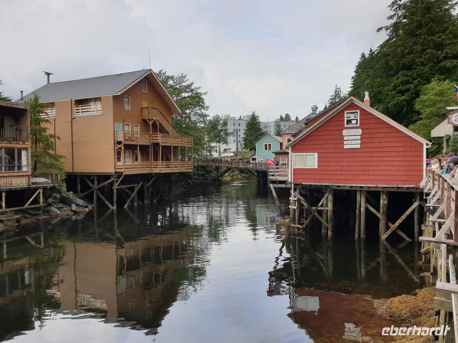 Auf unserem Spaziergang durch Ketchikan passieren wir auch die „Creek Street". Das ehemalige Rotlichtviertel von Ketchikan ist eine Reihe von Holzhäusern an einem auf Pfählen gebauten Plankenweg. Hier wurden 1900 die Bars und Freudenhäuser verbannt und es wurde zu einem feucht- fröhlichen Treffpunkt für Goldgräber, Holzfäller und Seeleuten. Wir setzen unseren Rundgang fort vorbei am Zentrum für Totempfähle und einer kleinen Lachsaufzuchtstation. Viel interessanter und schöner ist es allerdings die Lachse in ihrer natürlichen Umgebung zu beobachten, wie bspw. an einer der zahlreichen Brücken oder der sogenannten Lachsleiter, wo die Tiere versuchen die Stromschnellen zu überqueren.