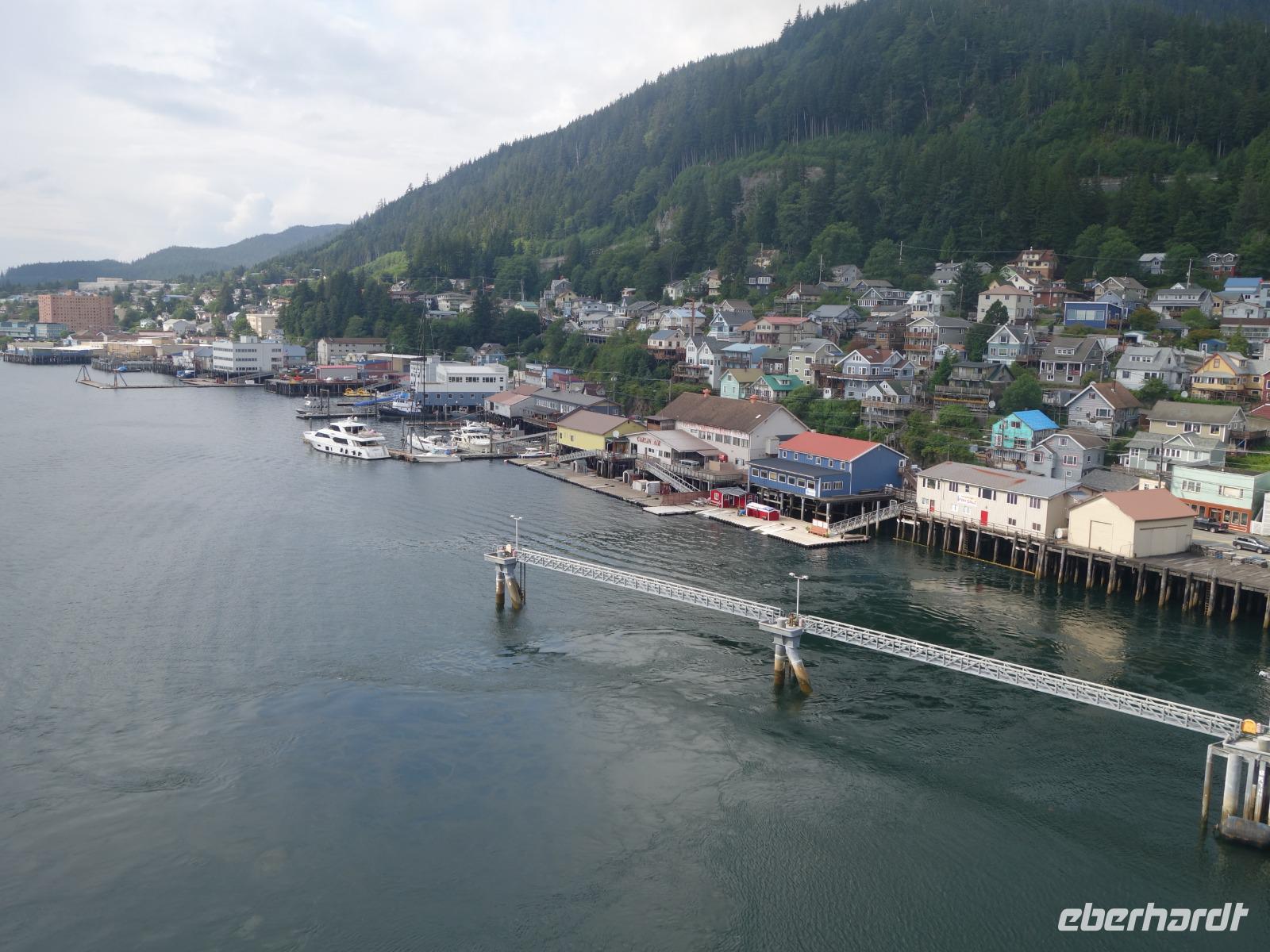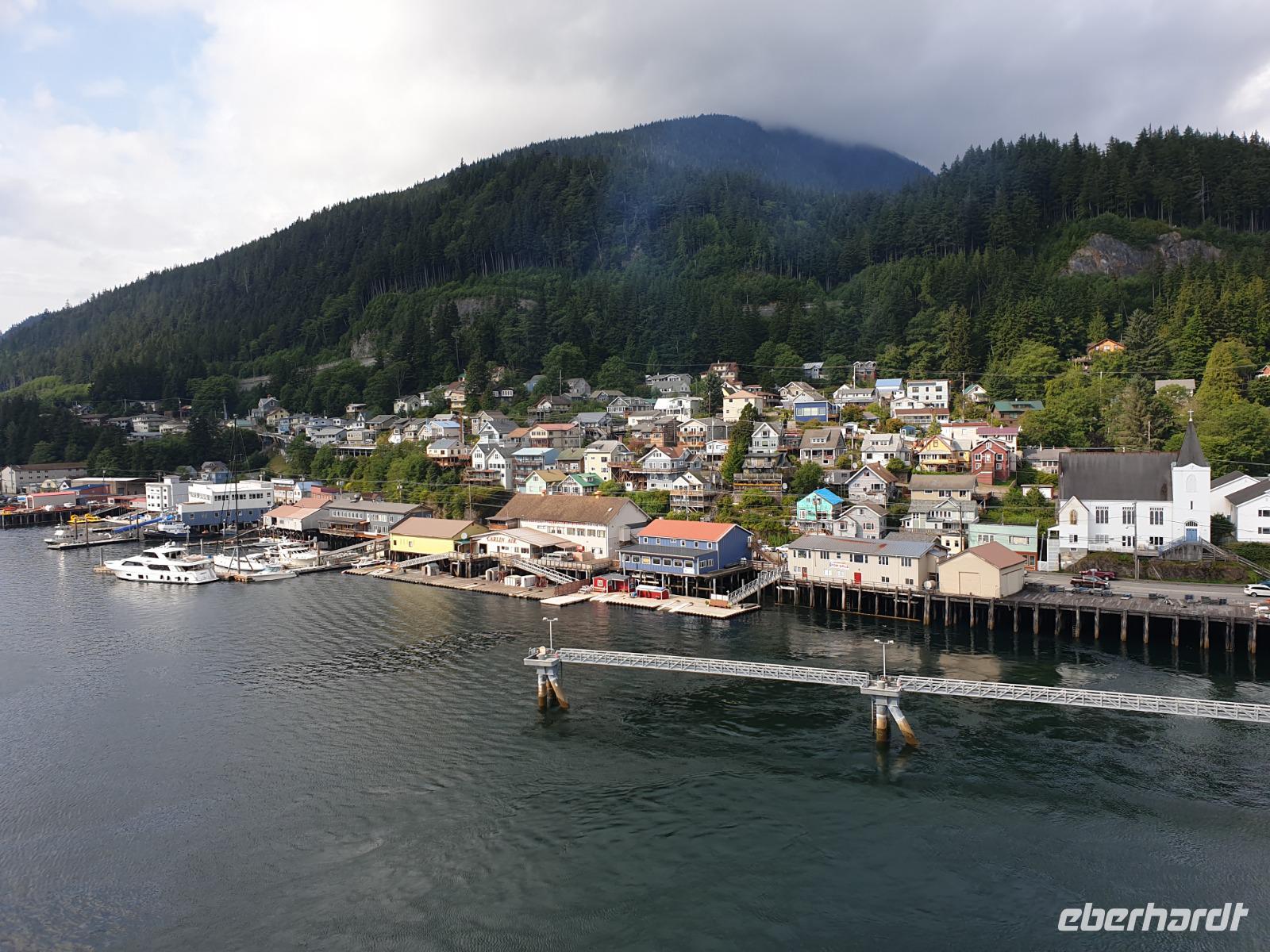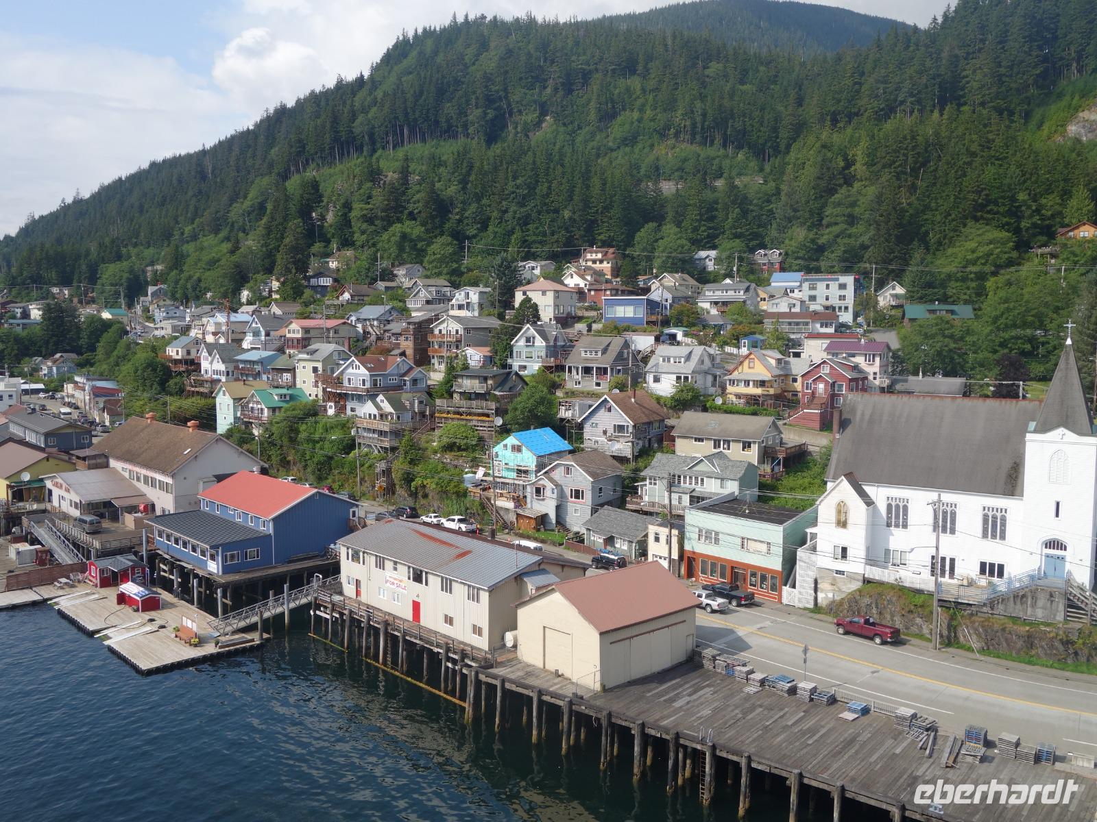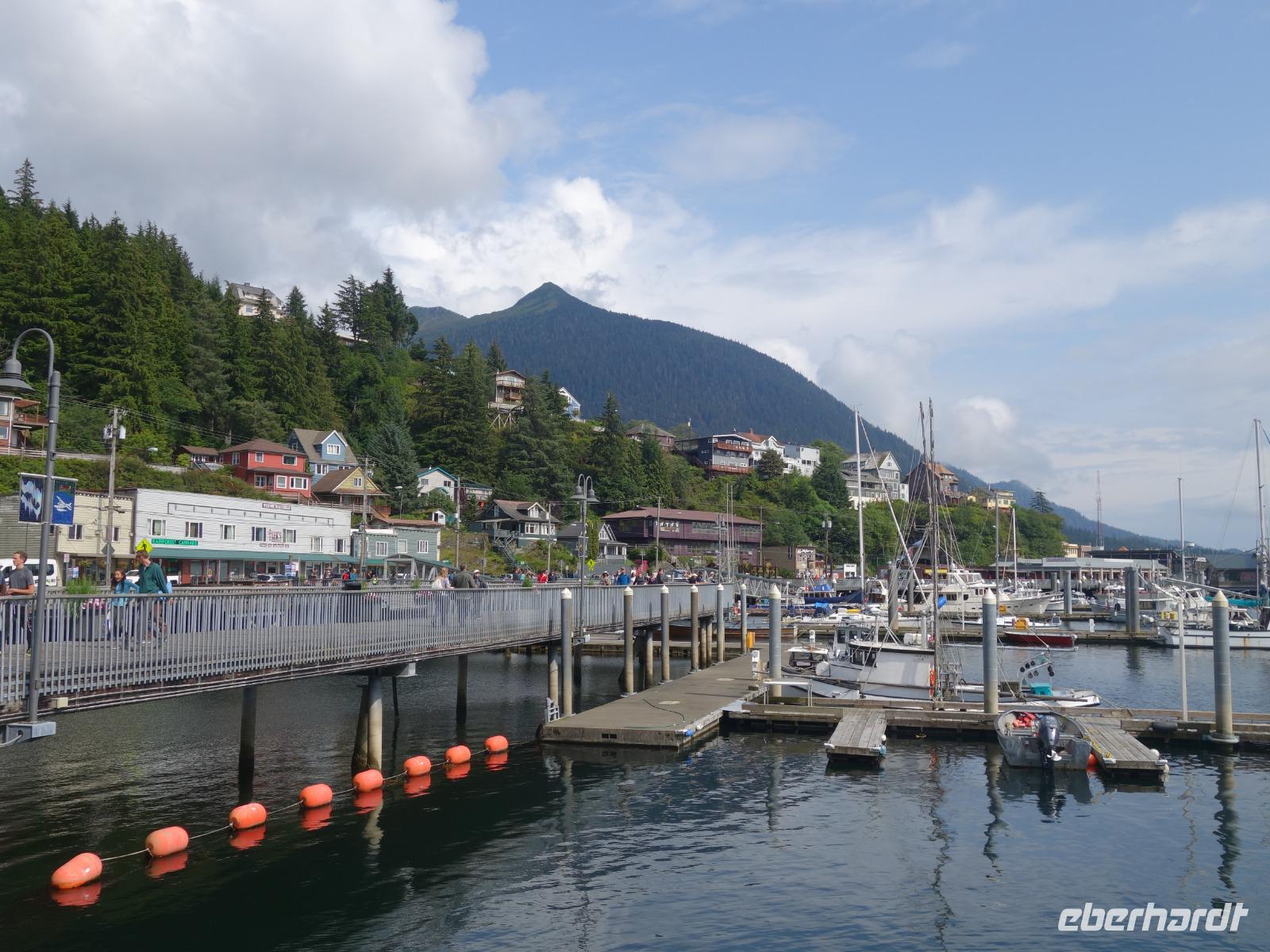 Auf unserem Spaziergang durch Ketchikan passieren wir auch die „Creek Street". Das ehemalige Rotlichtviertel von Ketchikan ist eine Reihe von Holzhäusern an einem auf Pfählen gebauten Plankenweg. Hier wurden 1900 die Bars und Freudenhäuser verbannt und es wurde zu einem feucht- fröhlichen Treffpunkt für Goldgräber, Holzfäller und Seeleuten. Wir setzen unseren Rundgang fort vorbei am Zentrum für Totempfähle und einer kleinen Lachsaufzuchtstation. Viel interessanter und schöner ist es allerdings die Lachse in ihrer natürlichen Umgebung zu beobachten, wie bspw. an einer der zahlreichen Brücken oder der sogenannten Lachsleiter, wo die Tiere versuchen die Stromschnellen zu überqueren.